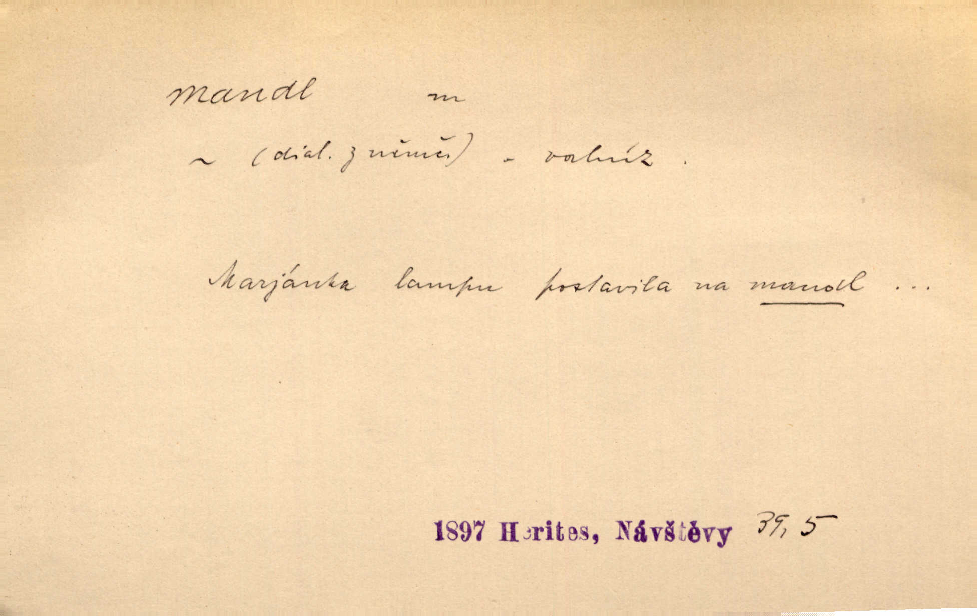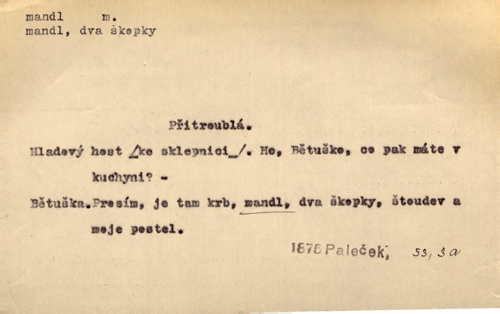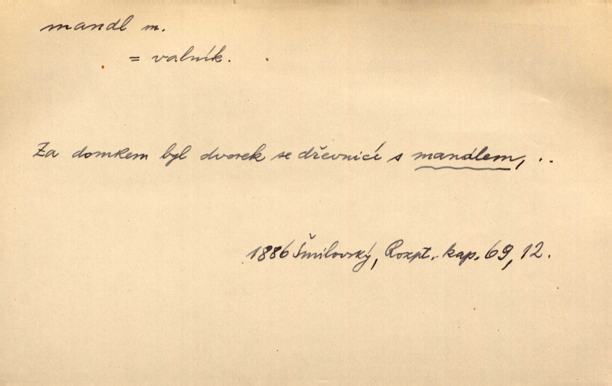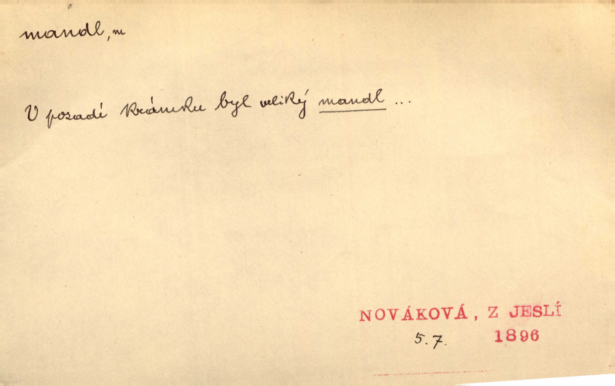 - †mandl, -u m. 2. mandle. Z pytlíku vysypal pan Ondřej několik liber kaštanů a „mandlů“. Win. Kaše z mandlův také není. Jir.