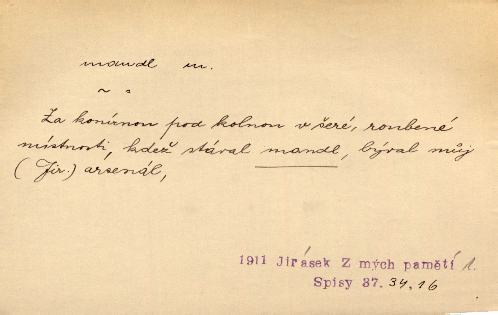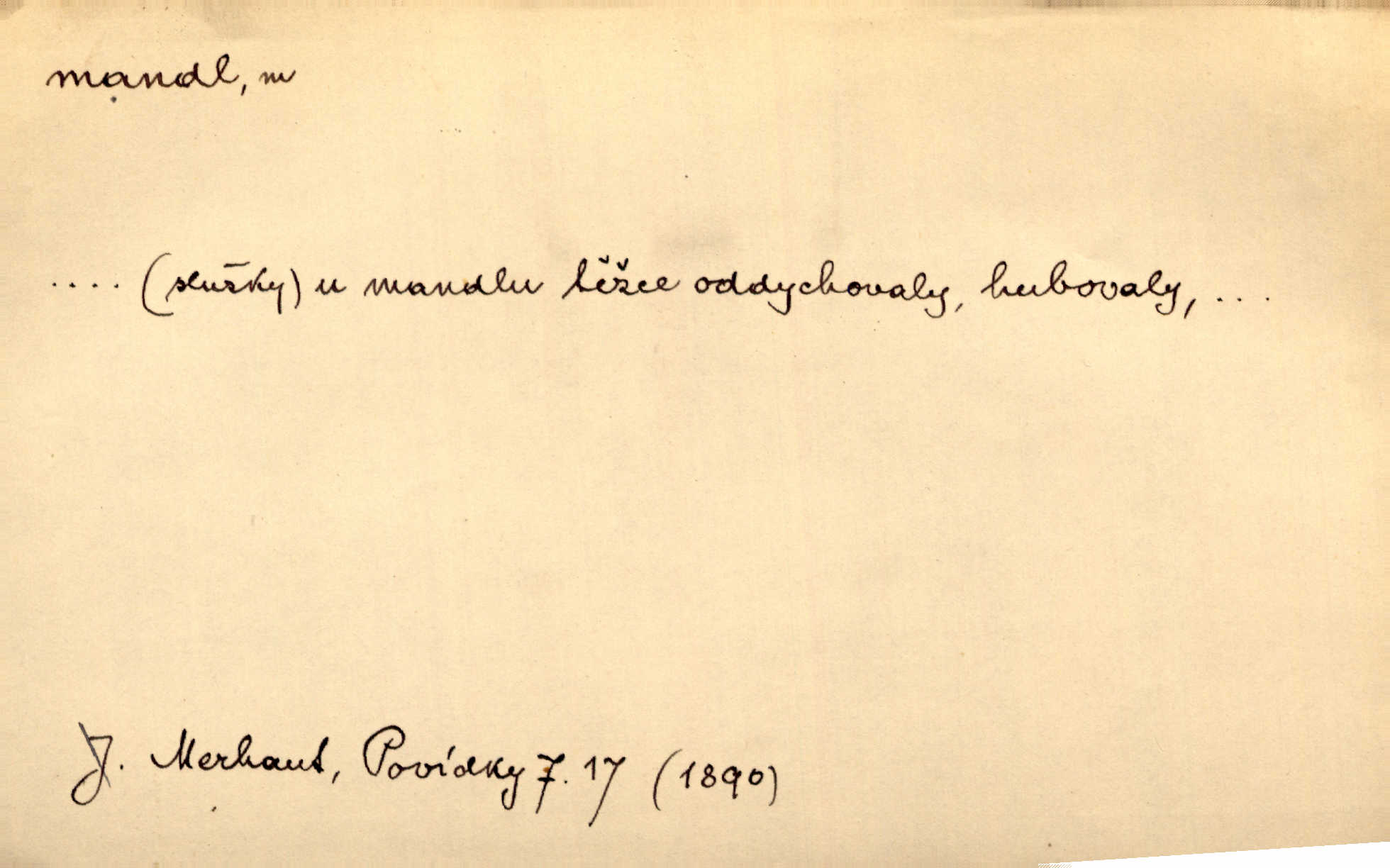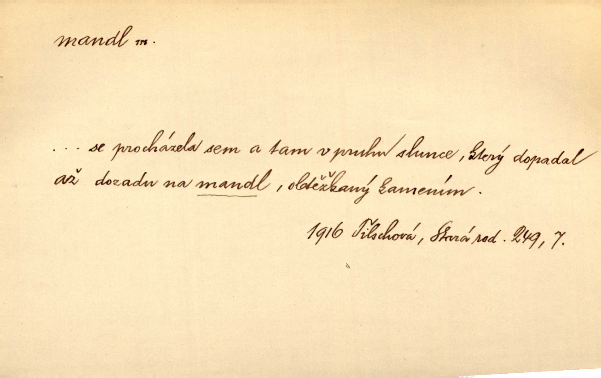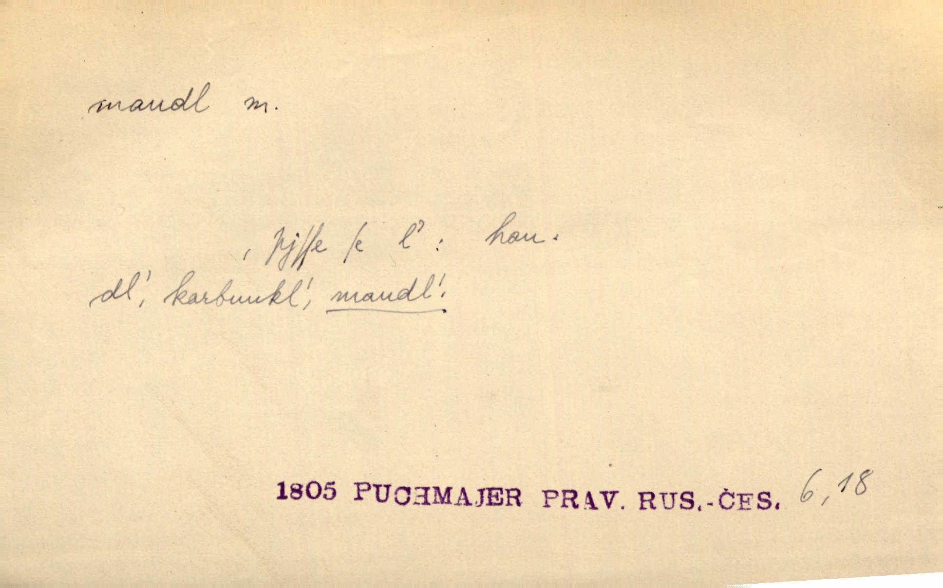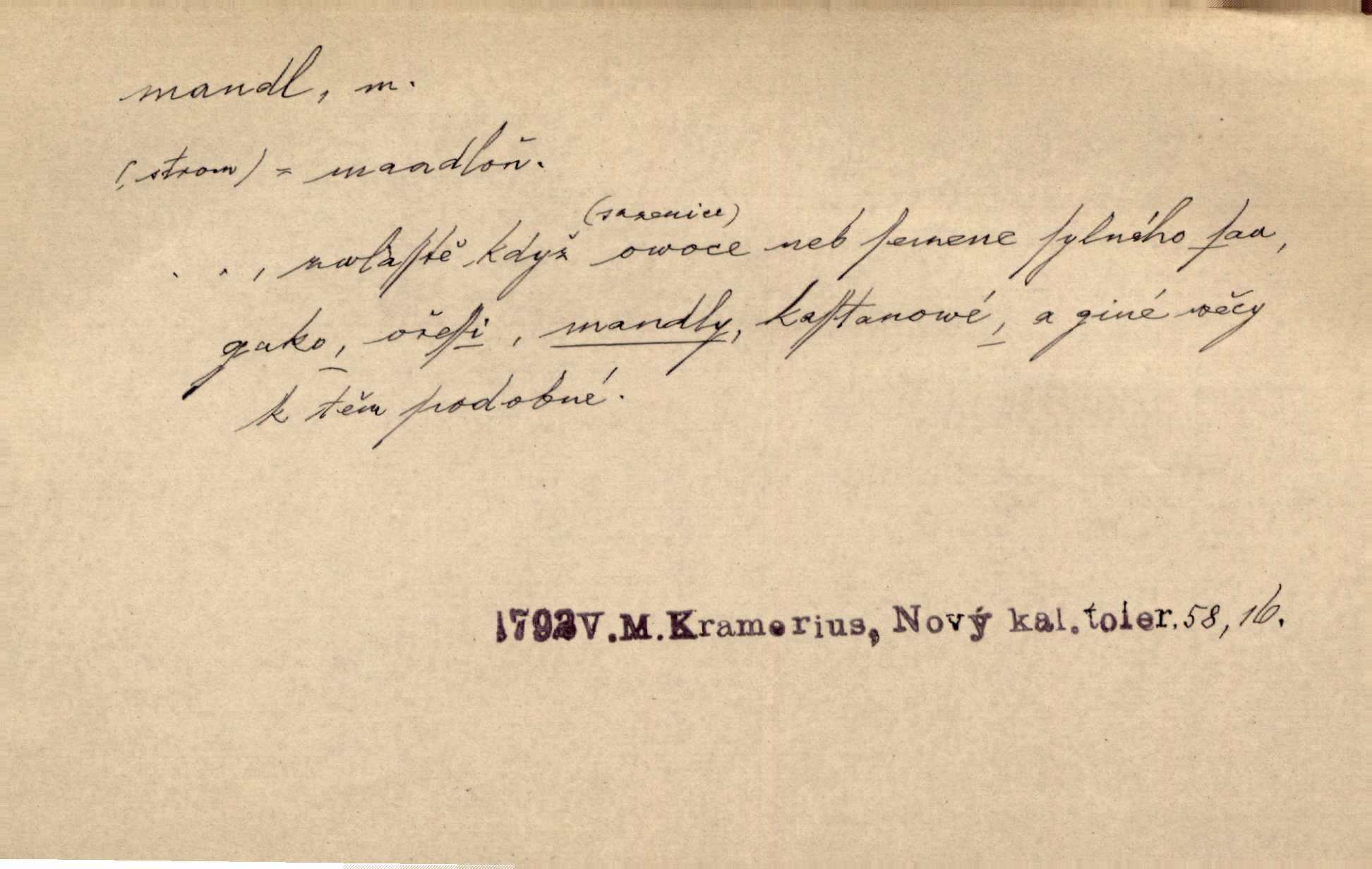 - †mandl, -u m. 2. mandle. Z pytlíku vysypal pan Ondřej několik liber kaštanů a „mandlů“. Win. Kaše z mandlův také není. Jir.