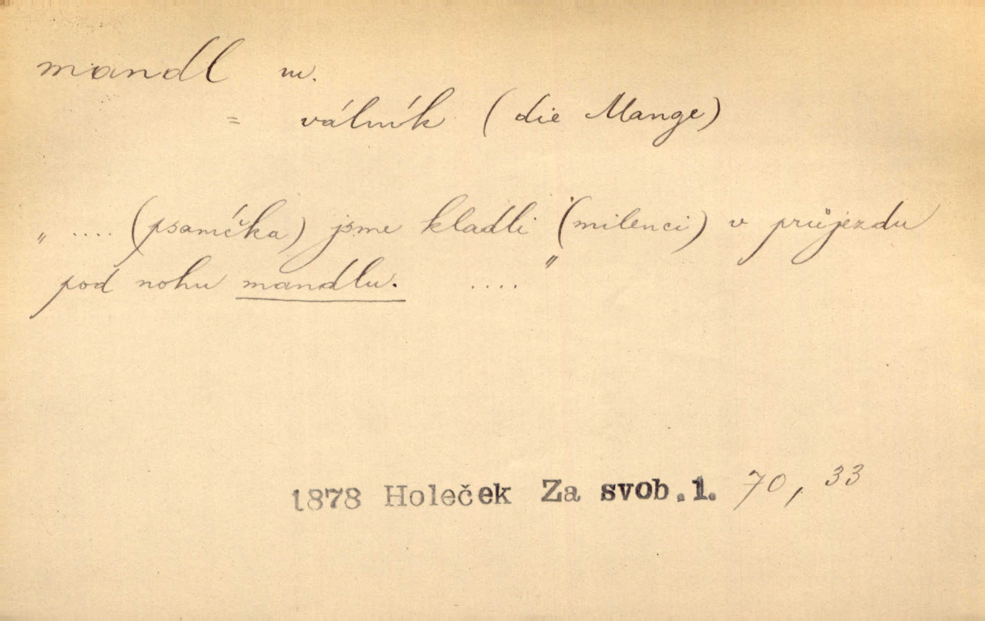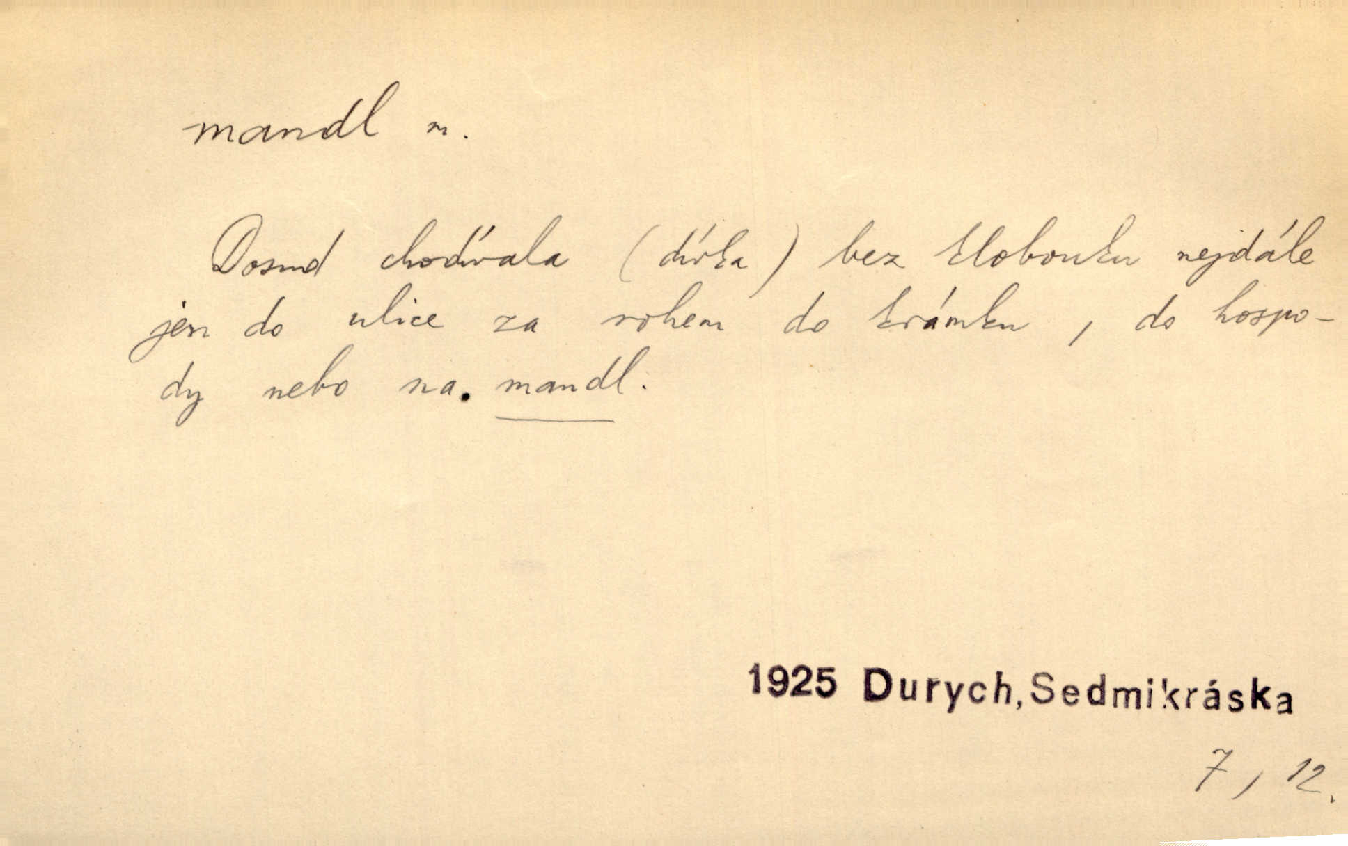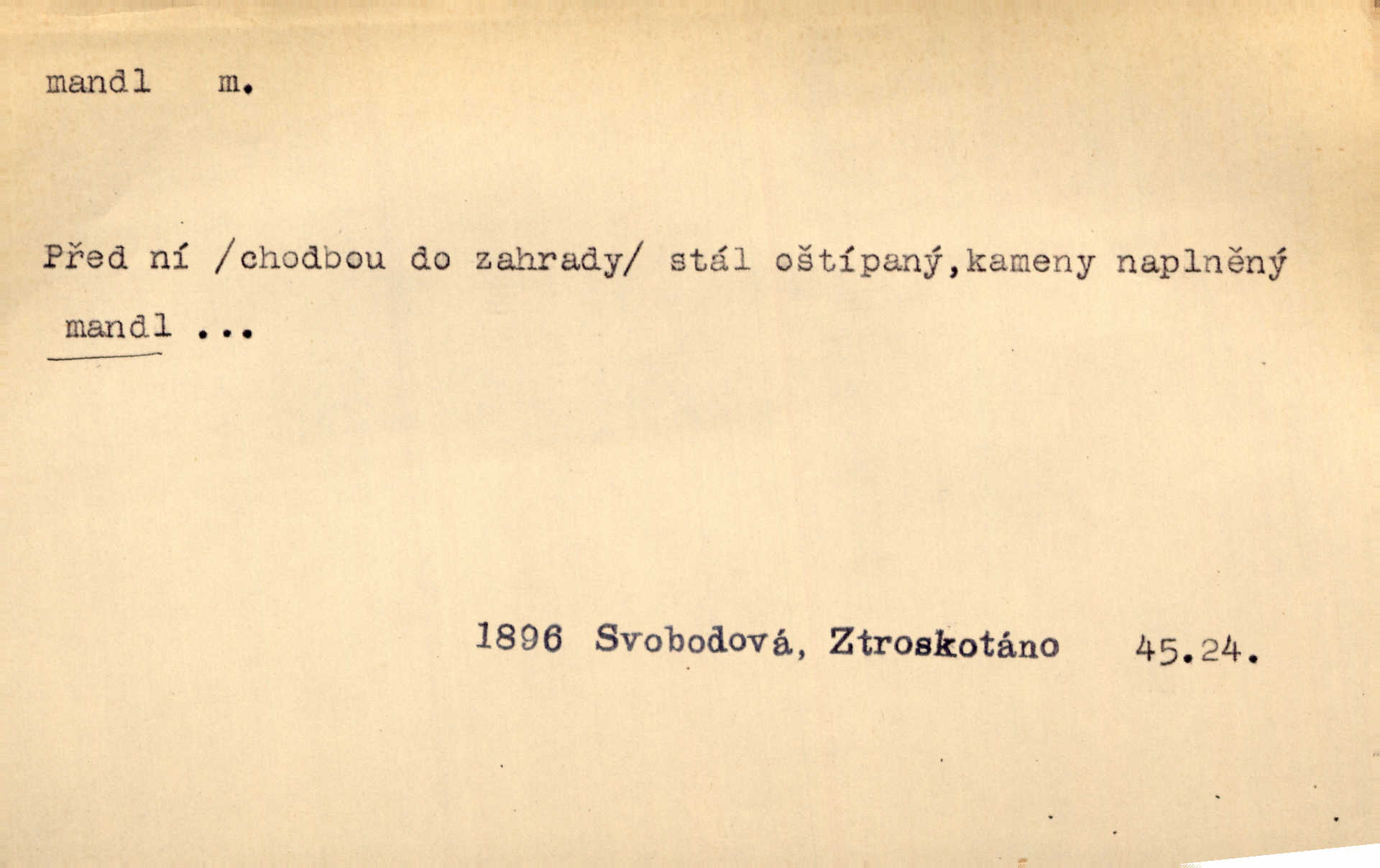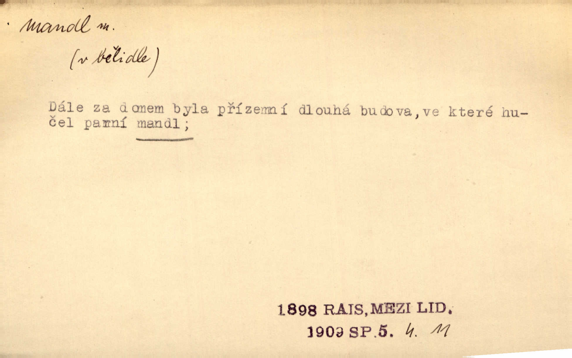 - †mandl, -u m. 2. mandle. Z pytlíku vysypal pan Ondřej několik liber kaštanů a „mandlů“. Win. Kaše z mandlův také není. Jir.