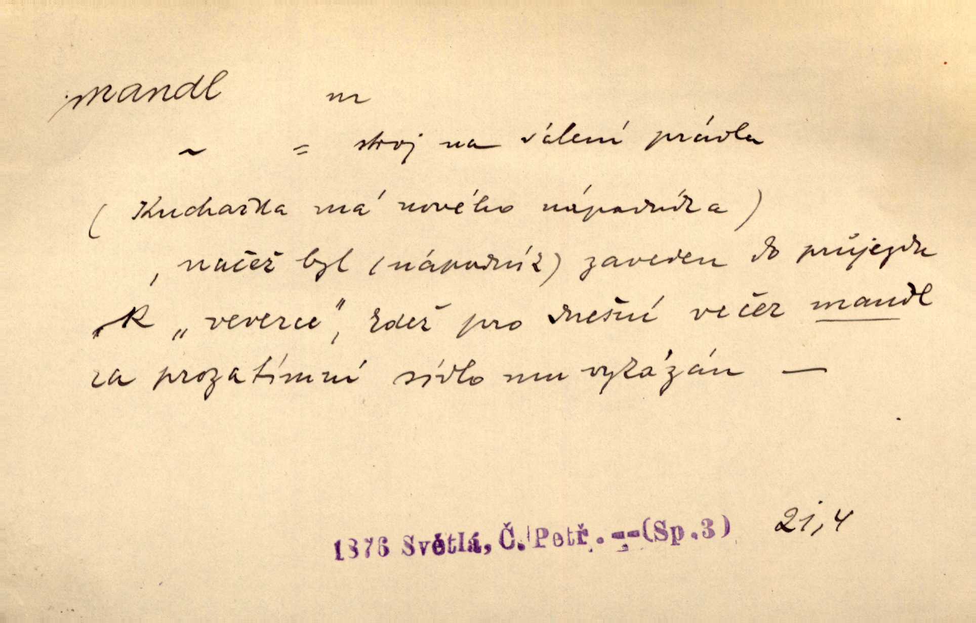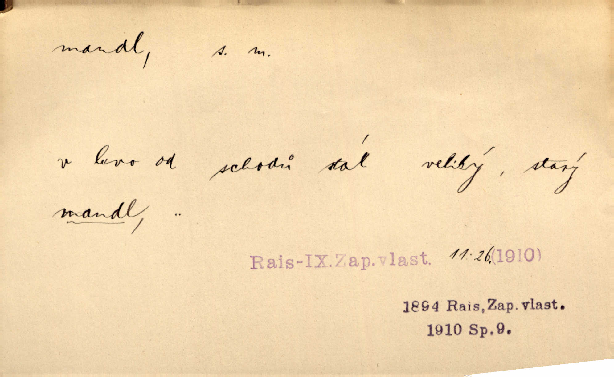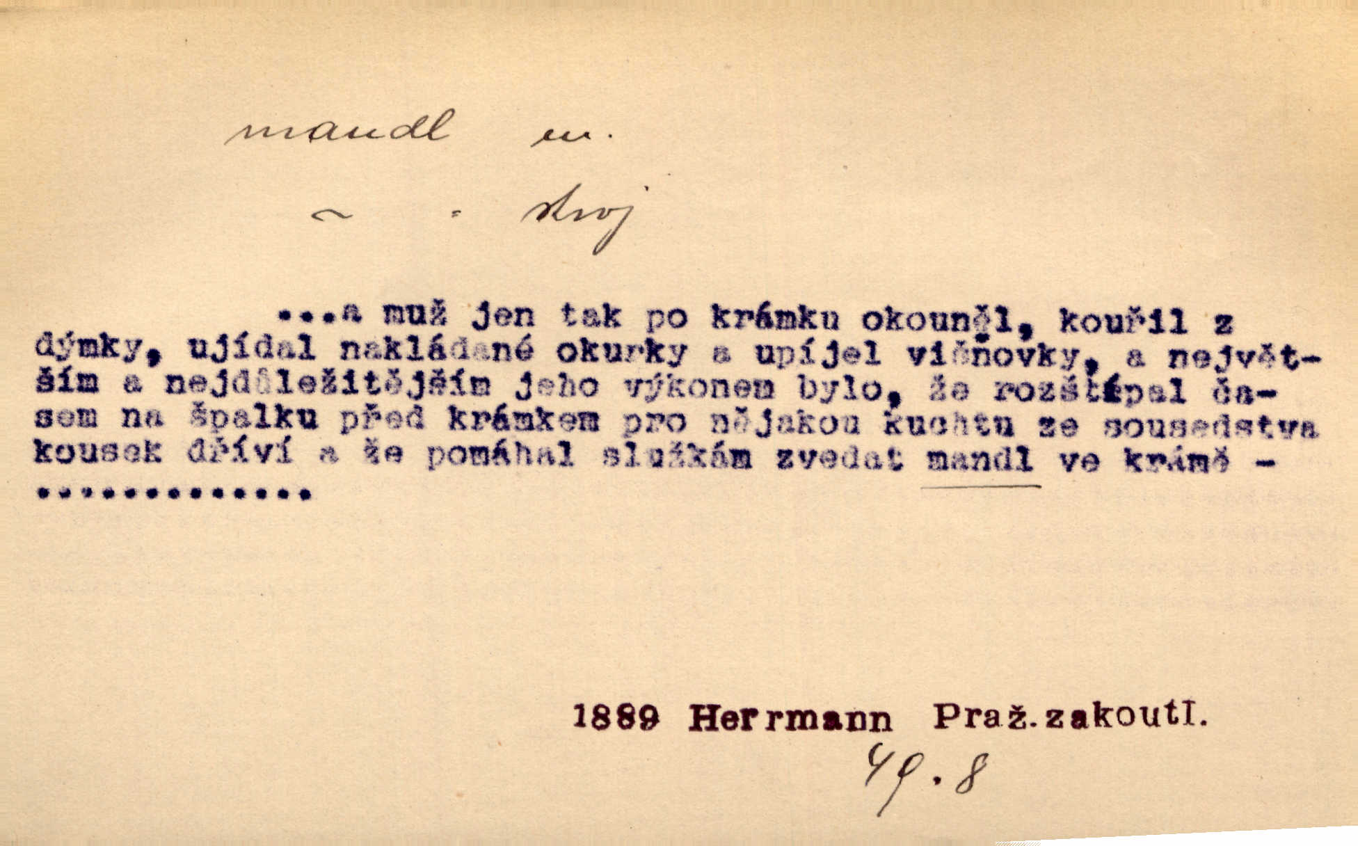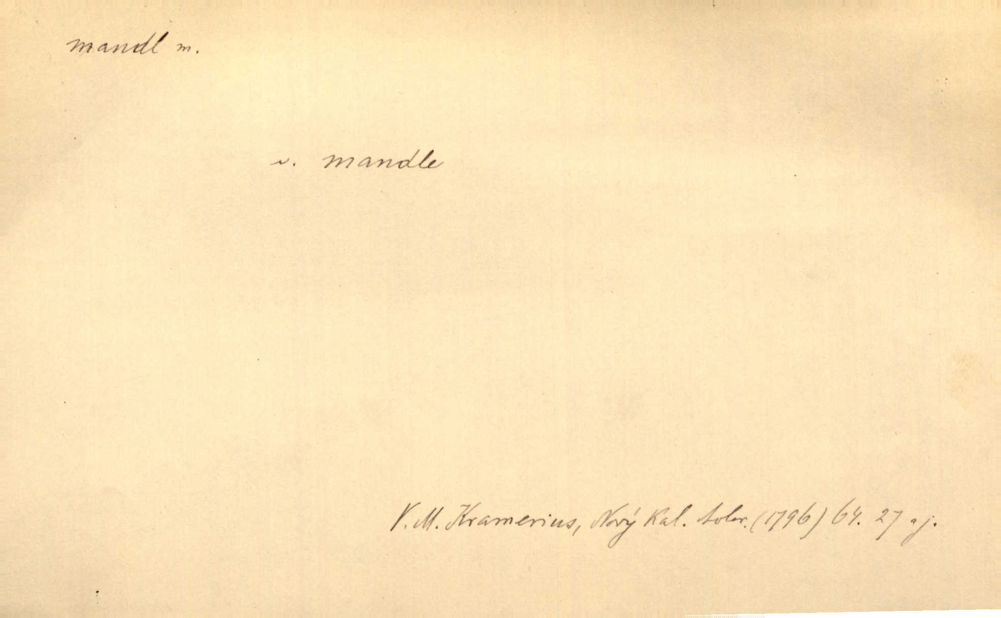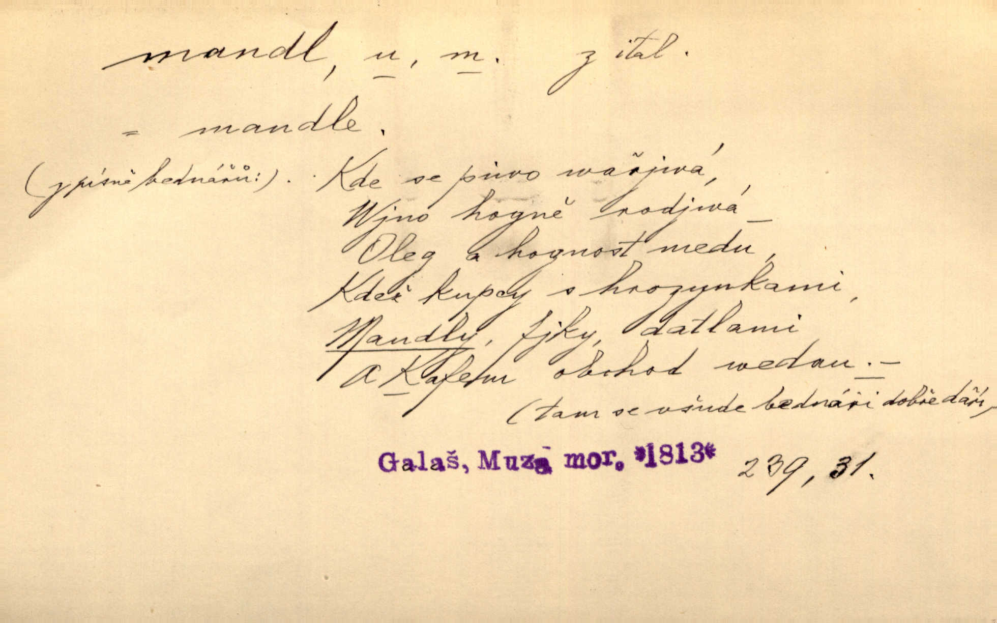 - †mandl, -u m. 2. mandle. Z pytlíku vysypal pan Ondřej několik liber kaštanů a „mandlů“. Win. Kaše z mandlův také není. Jir.