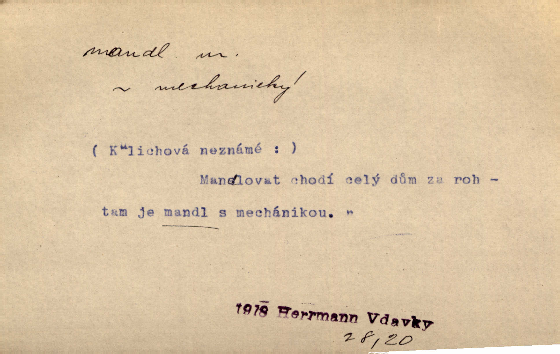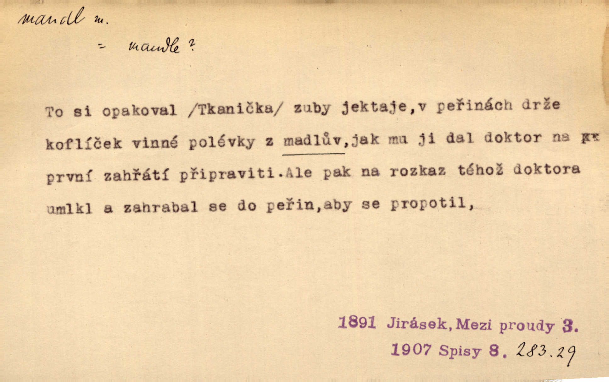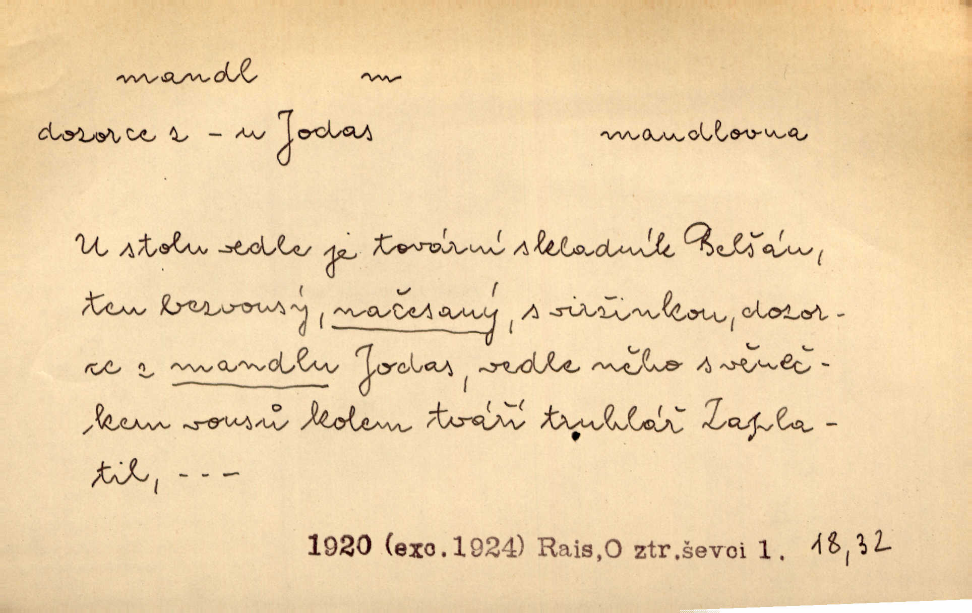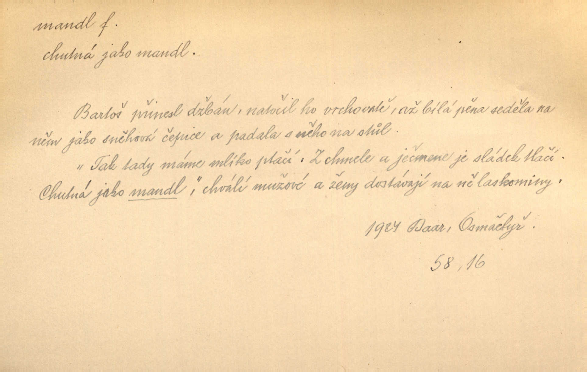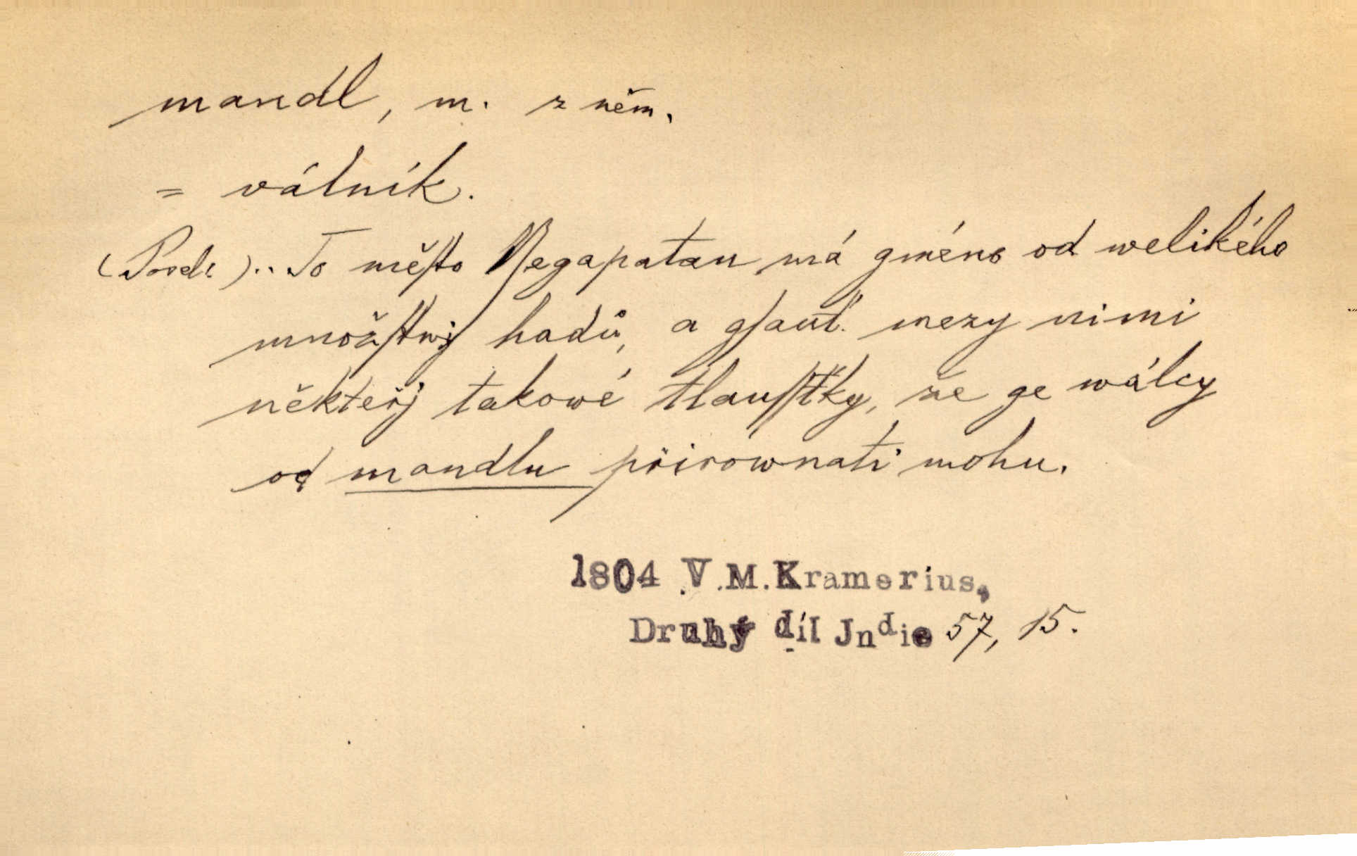 - †mandl, -u m. 2. mandle. Z pytlíku vysypal pan Ondřej několik liber kaštanů a „mandlů“. Win. Kaše z mandlův také není. Jir.