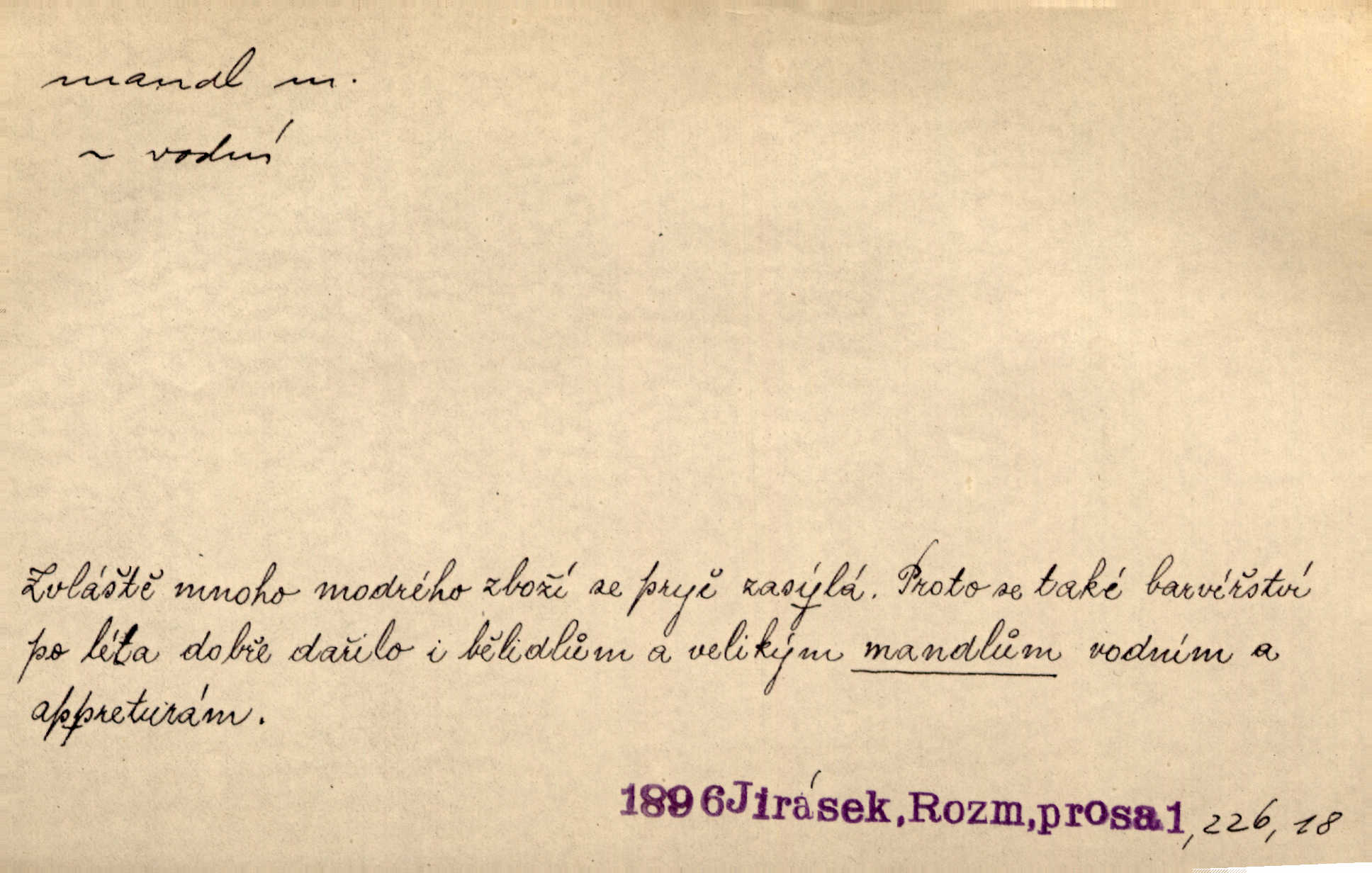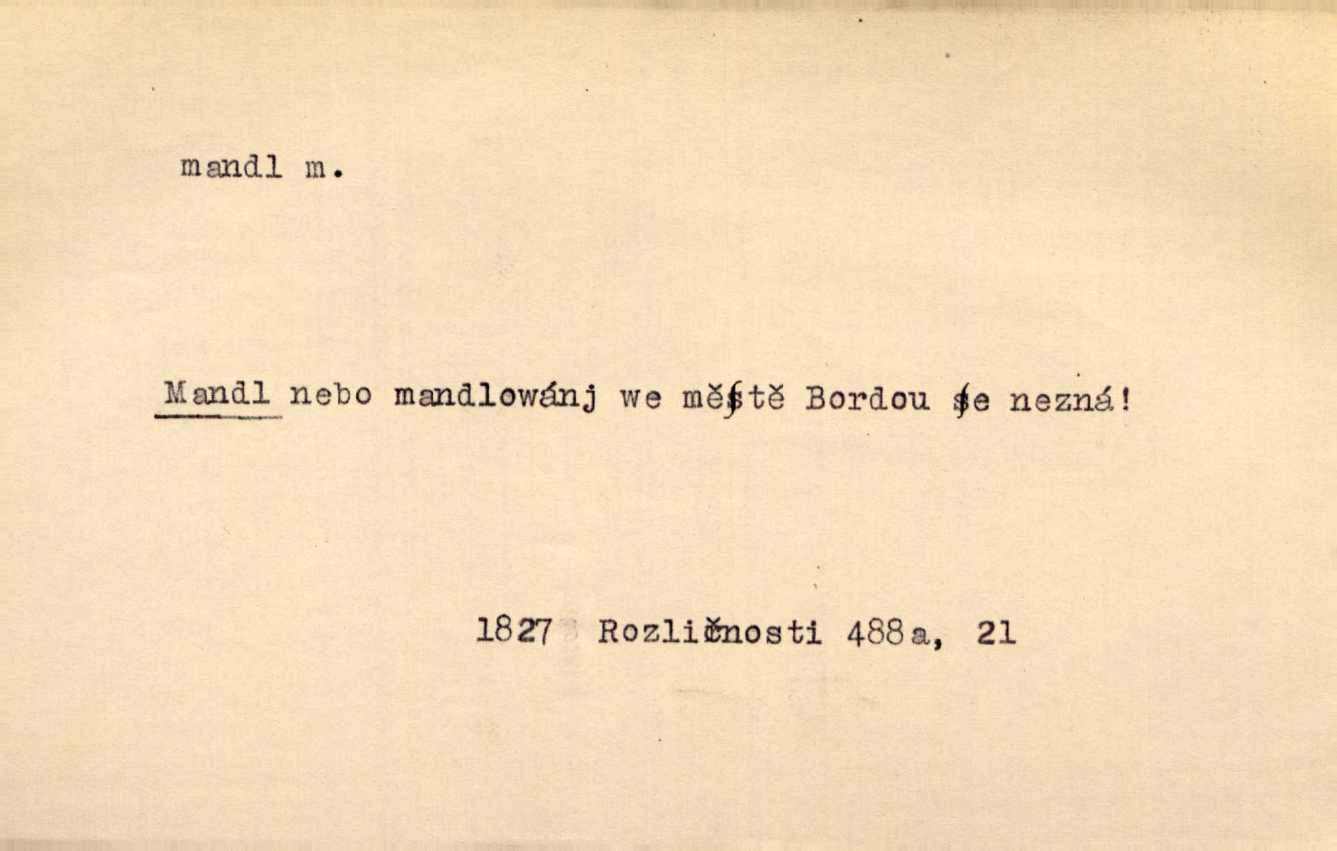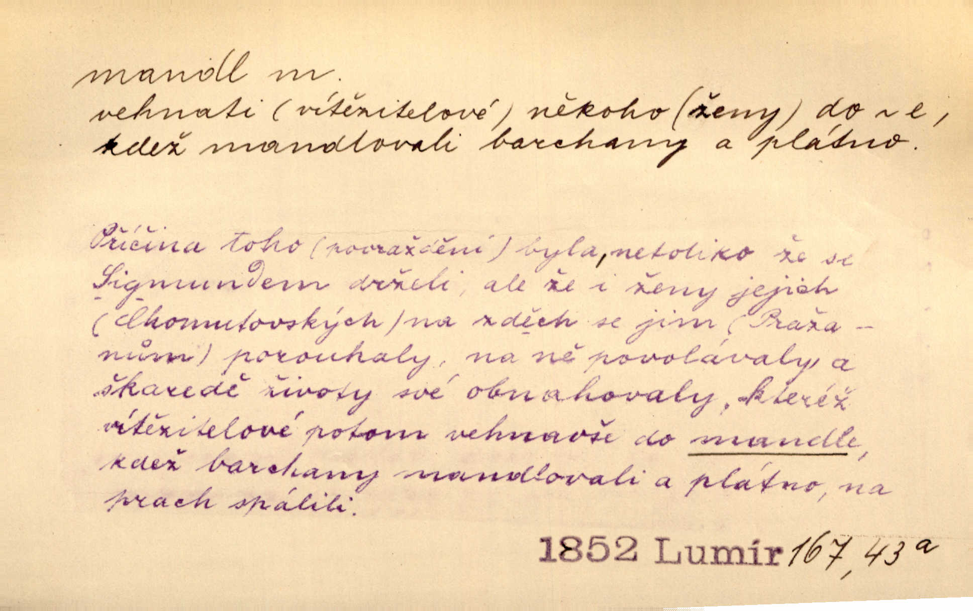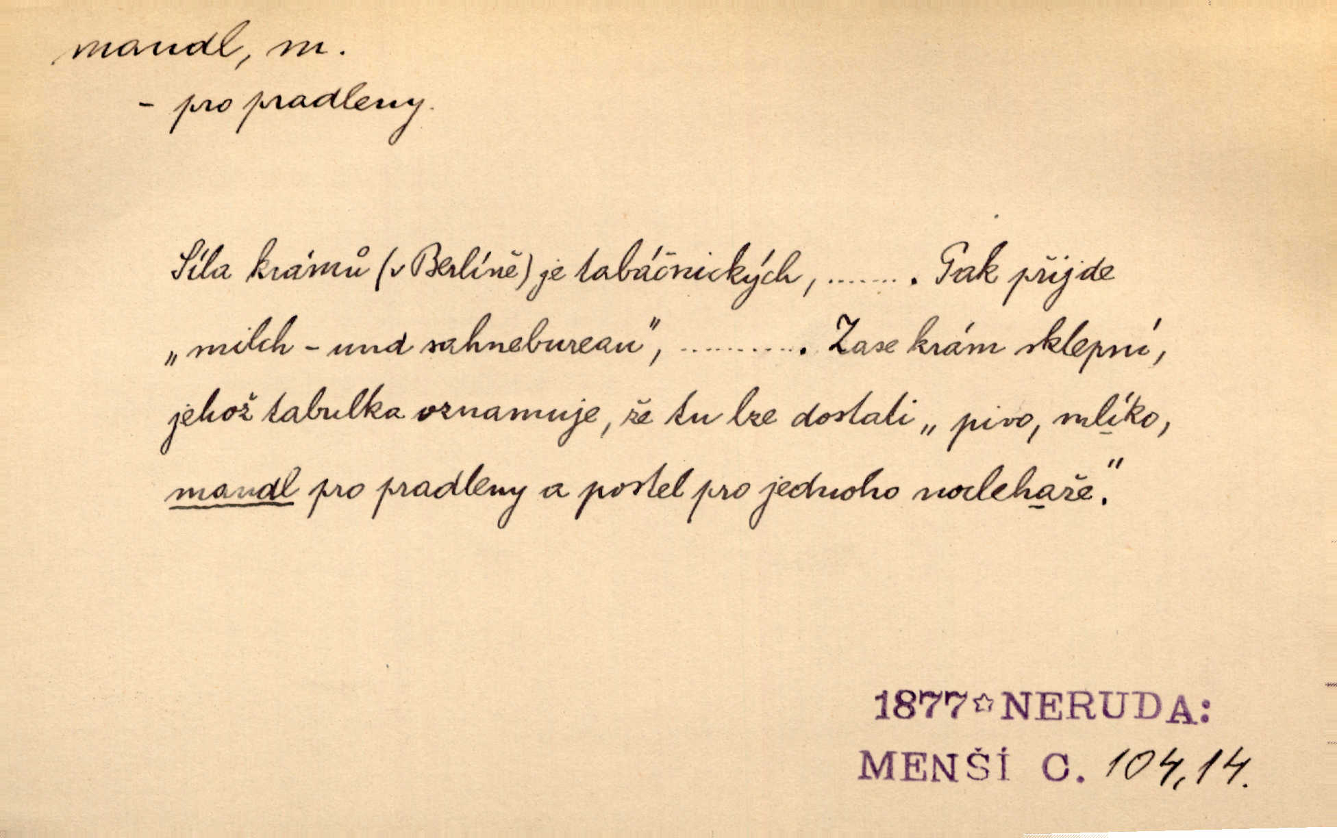 - †mandl, -u m. 2. mandle. Z pytlíku vysypal pan Ondřej několik liber kaštanů a „mandlů“. Win. Kaše z mandlův také není. Jir.