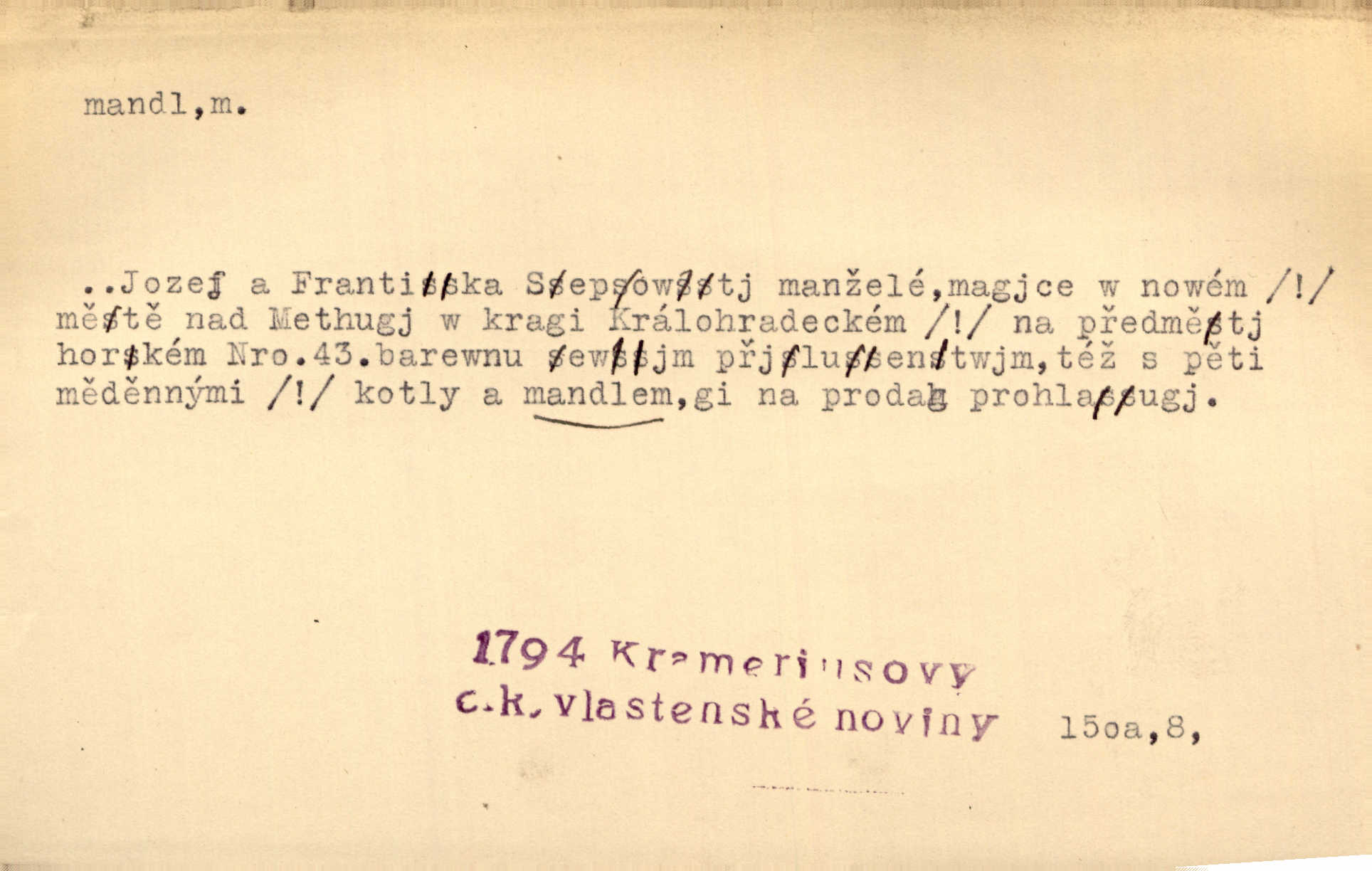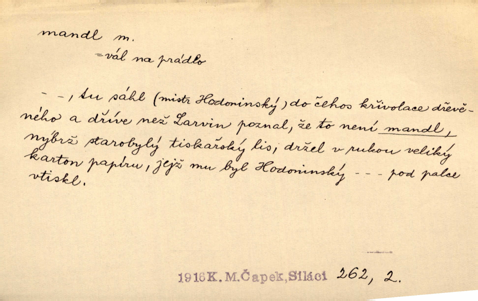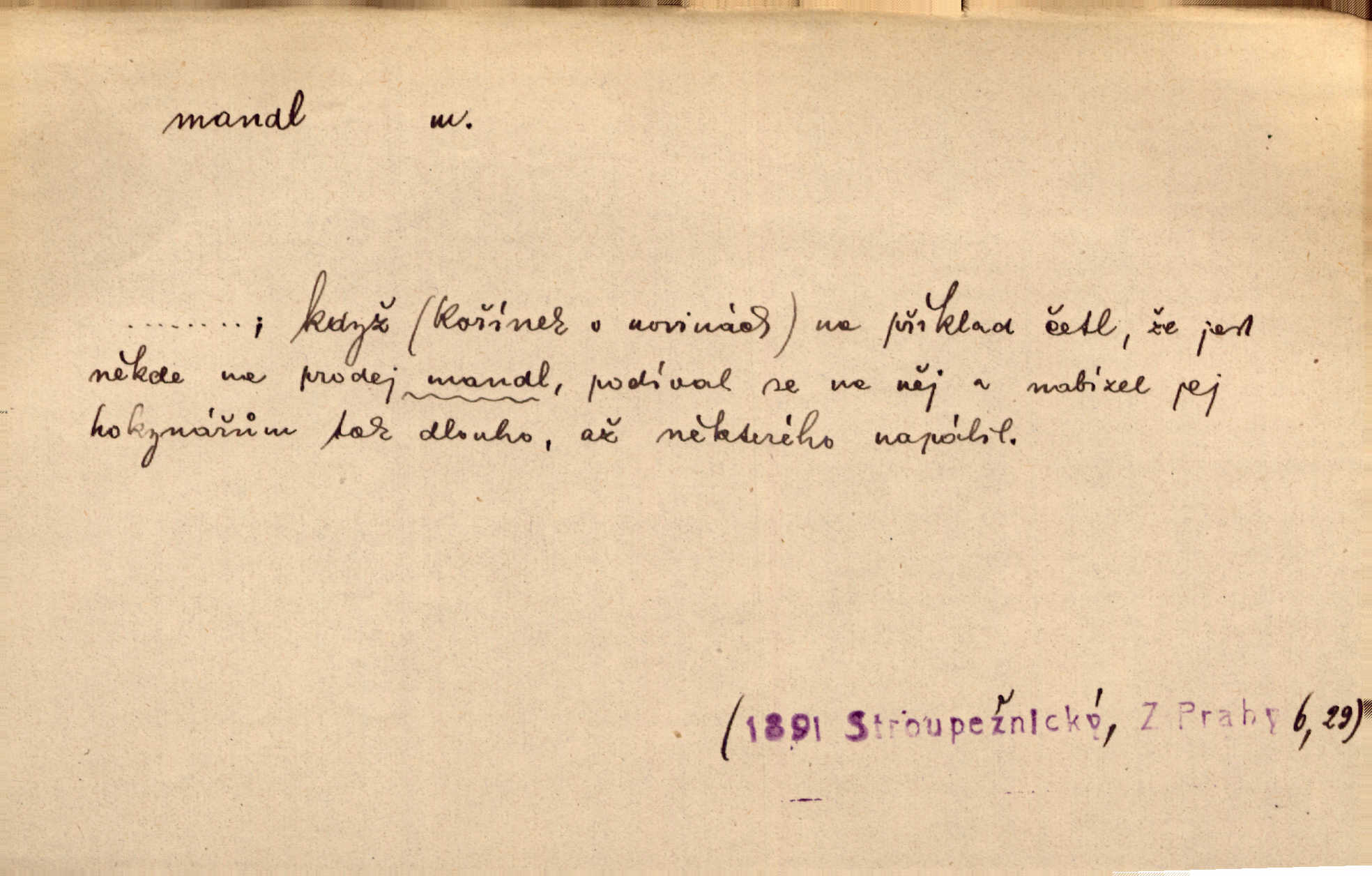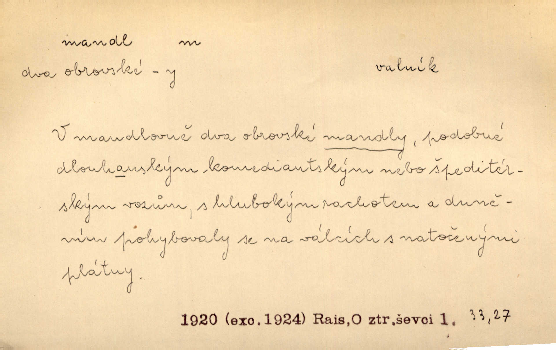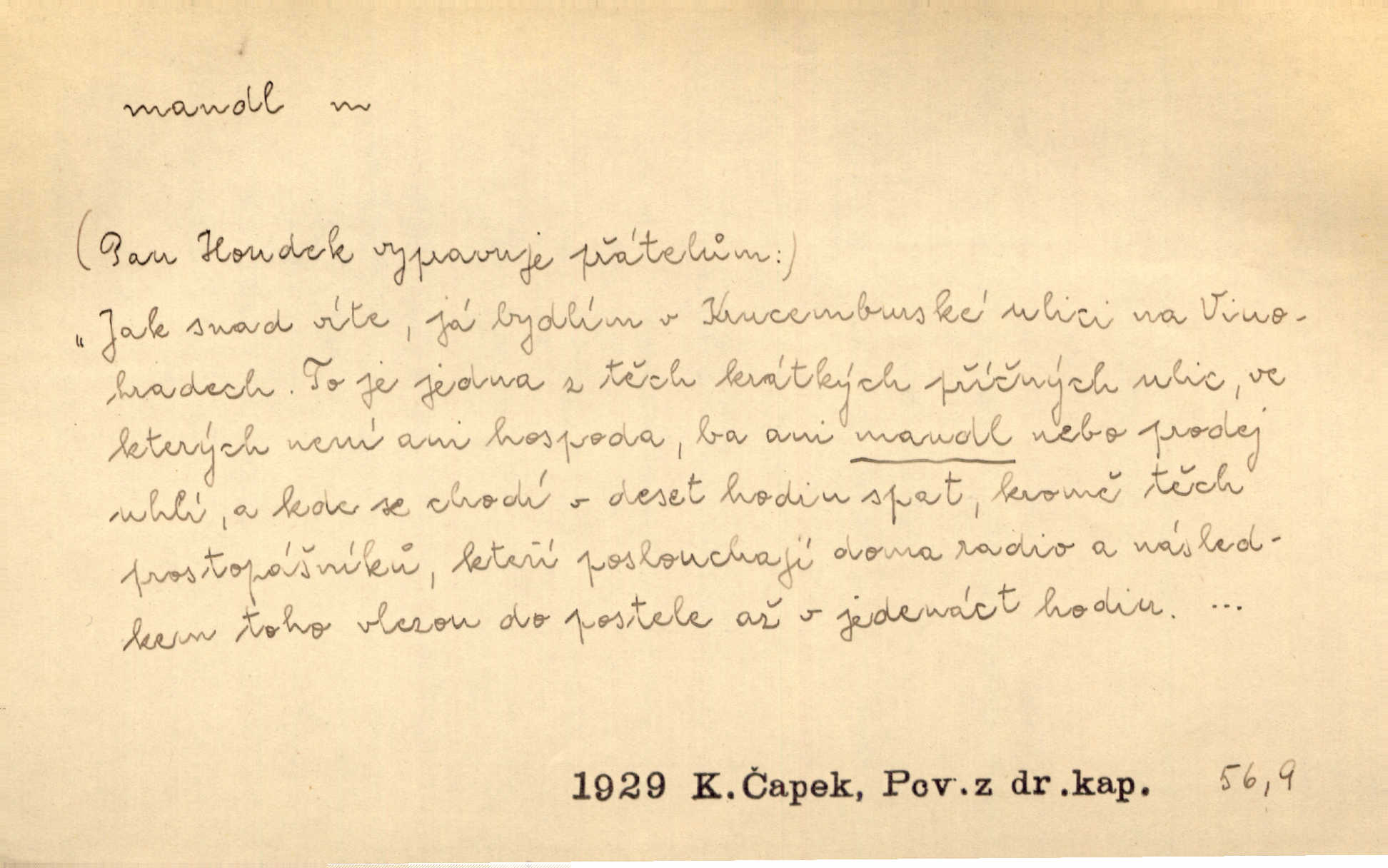 - †mandl, -u m. 2. mandle. Z pytlíku vysypal pan Ondřej několik liber kaštanů a „mandlů“. Win. Kaše z mandlův také není. Jir.