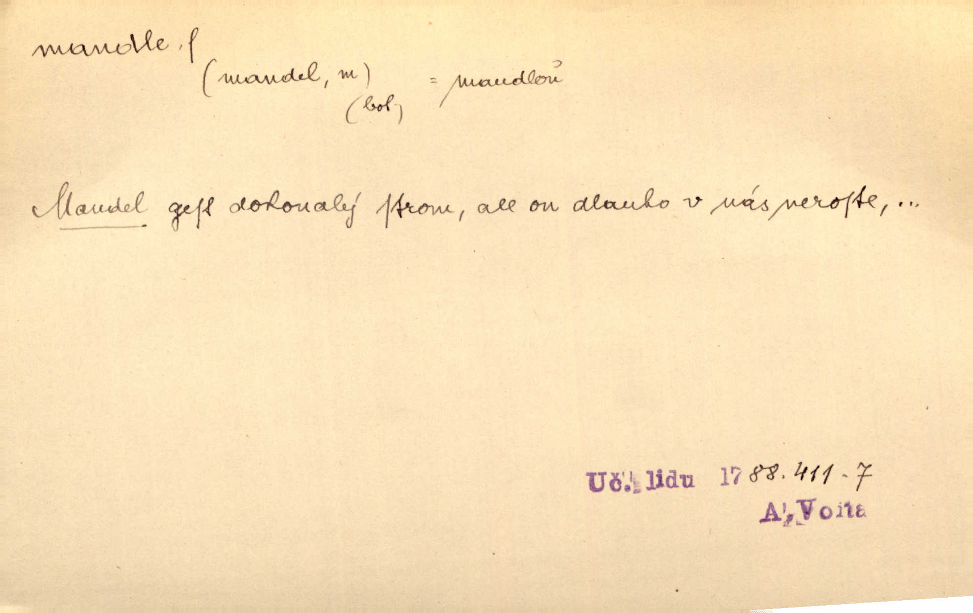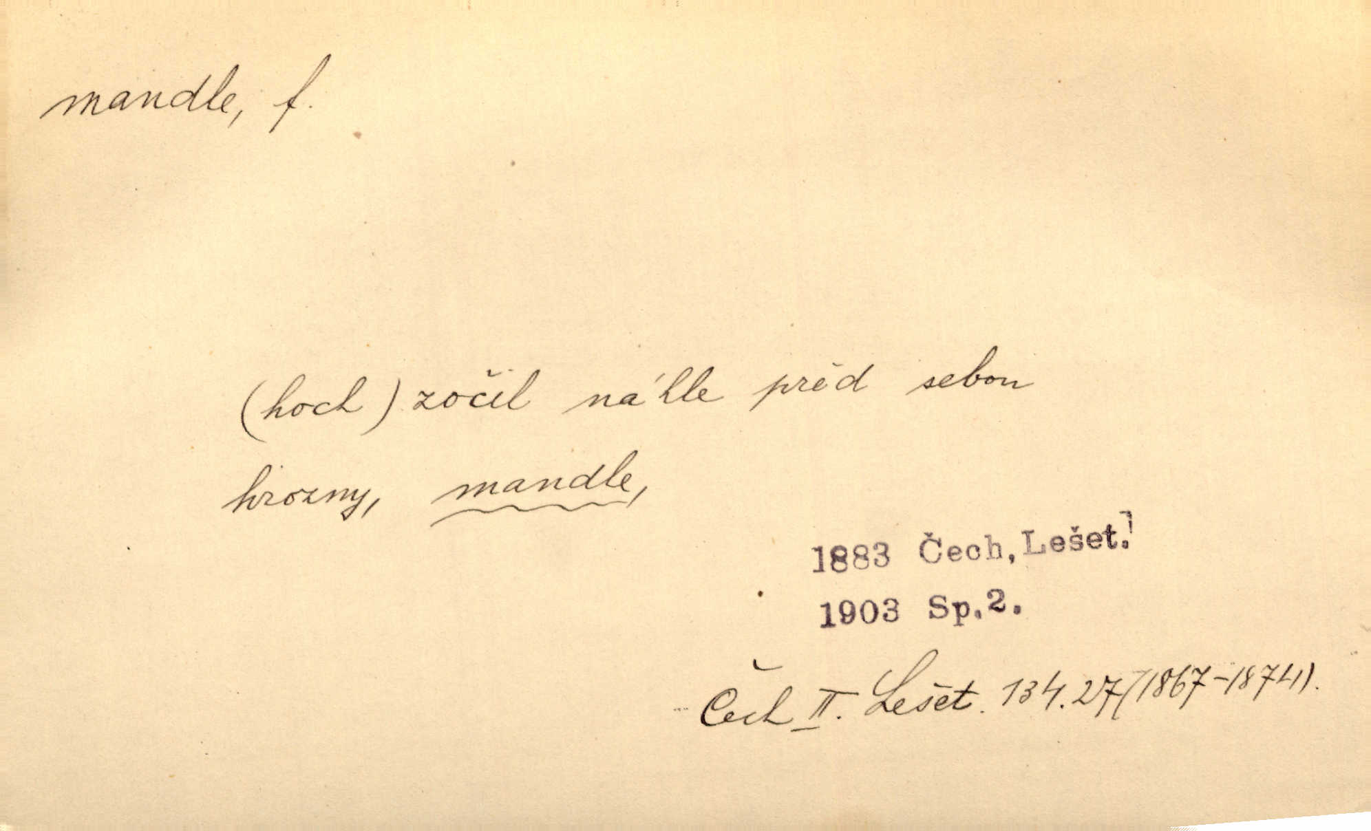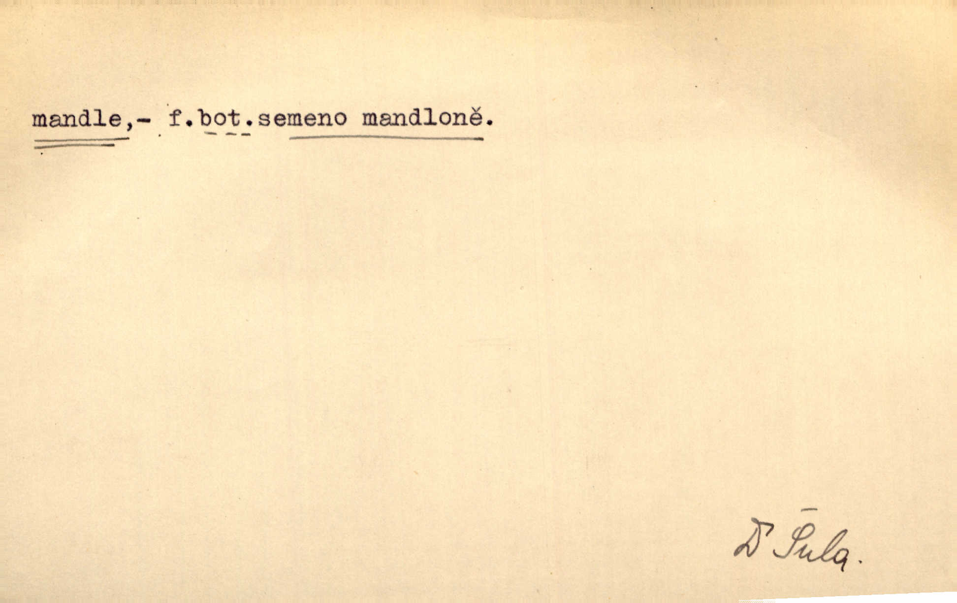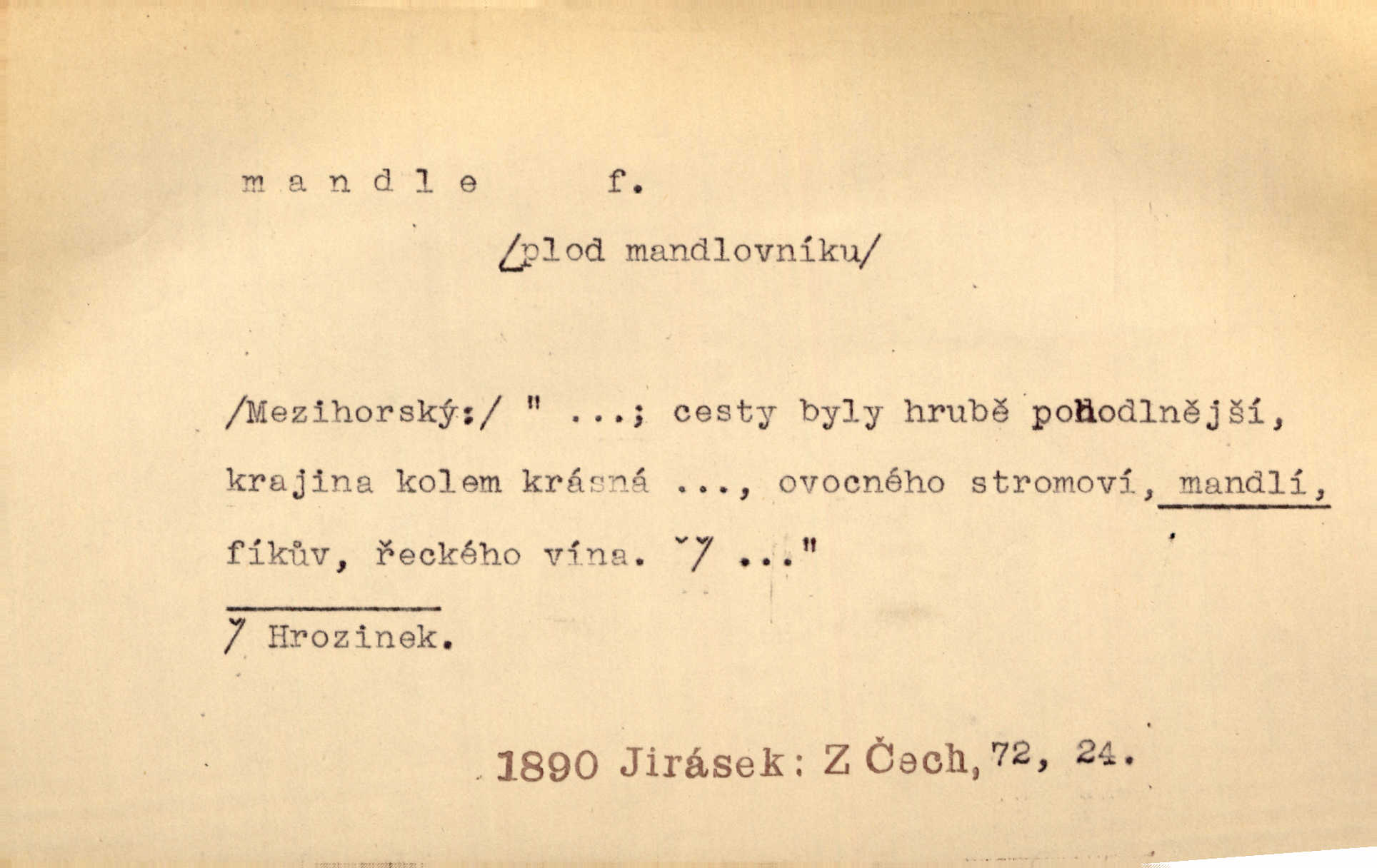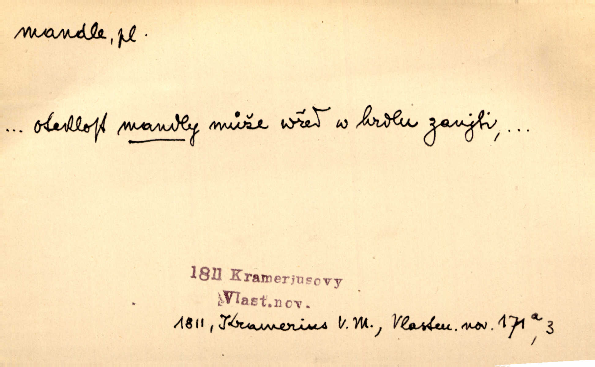 - mandle, -e f. bot. plod mandloně používaný hlavně v kuchařství a cukrářství. Potřebuju mandle a hrozinky do buchty. Herrm. Krásnou vepřovinku máme, jako mandle bude! chutná. Rais. To je holka jak mandle svěží. Stroup. Handle jsou mandle, plácněme si! obchod je znamenitá věc. Sez. Zbož. hořké mandle, sladké mandle; praskavé mandle prodávané se skořápkou. D tonsilla, párové, žlázové těleso mající velikost a podobu mandle na přechodu dutiny ústní v hltanovou. Slepé střevo, mandle, pupek, samé zbytečnosti. K. Čap. Měl „spadlé mandle“ bolení v krku. Vrba. Lid. ustál. sp. Teď spadnou mandle všem tajným nepřátelům říše budou pokořeni. Jah. Kdekdo se na ně [nováčky] chystal, že jim „zvedne mandle…“ potýrá je. Ros. Co pak záleží panu hraběti na nějakém stu metrických centů cukru, pro něj to nic neznamená, a nám by to zvedlo mandle polepšilo, prospělo. Šim. No, teď jsem tě vzala za mandle, ty pejcho jedna! myslela si pokořila. Šlej. Až se to [že purkmistr neplatil daně] doví na berním úřadě — ti mu natřesou mandle! zatočí s ním. Vrba. D mandlovník. Přišla jsem k studánce, tam kde mandle kvetou. Zey. Háje citronů a mandlí září vonným květem. Čech. D Geol. výplň v dutinách vyvřelých hornin tvořená sekundárními nerosty.