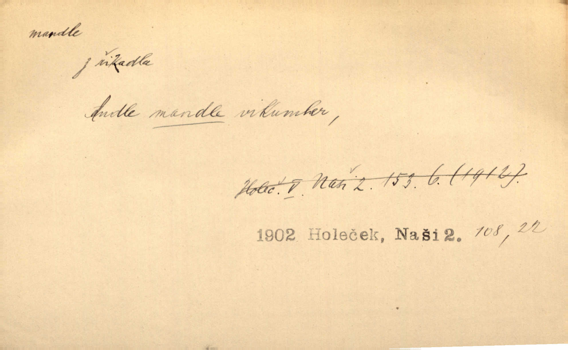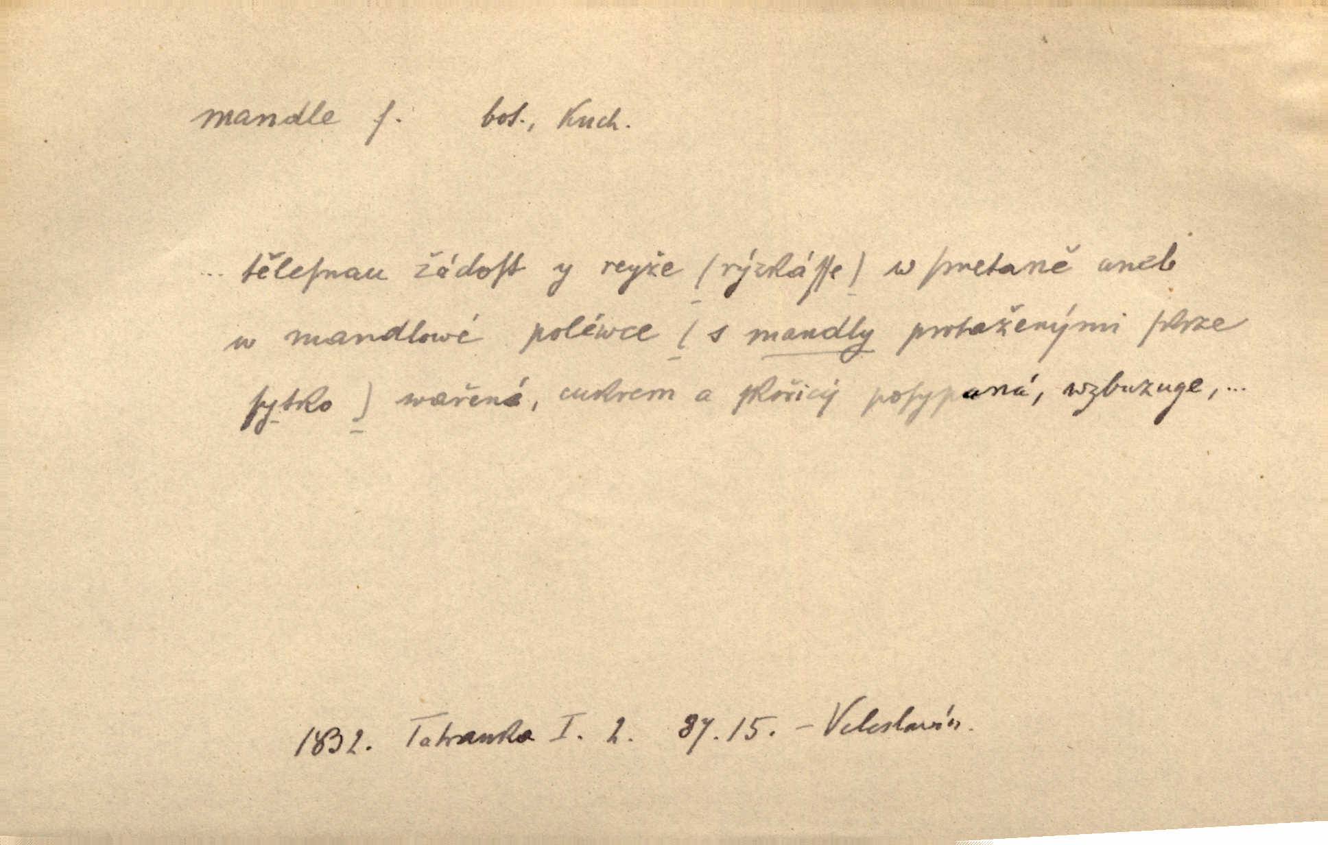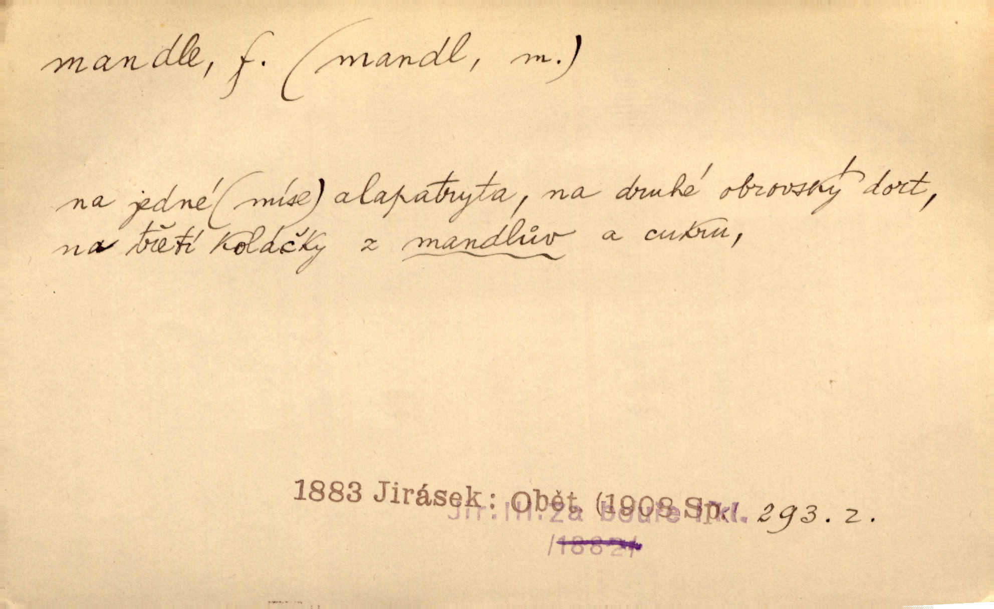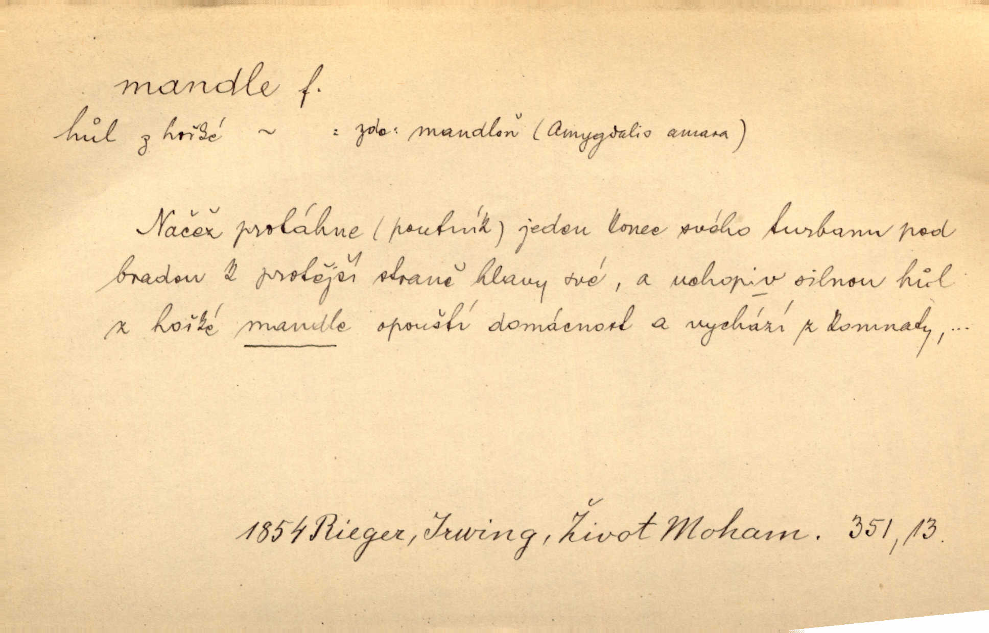 - mandle, -e f. bot. plod mandloně používaný hlavně v kuchařství a cukrářství. Potřebuju mandle a hrozinky do buchty. Herrm. Krásnou vepřovinku máme, jako mandle bude! chutná. Rais. To je holka jak mandle svěží. Stroup. Handle jsou mandle, plácněme si! obchod je znamenitá věc. Sez. Zbož. hořké mandle, sladké mandle; praskavé mandle prodávané se skořápkou. D tonsilla, párové, žlázové těleso mající velikost a podobu mandle na přechodu dutiny ústní v hltanovou. Slepé střevo, mandle, pupek, samé zbytečnosti. K. Čap. Měl „spadlé mandle“ bolení v krku. Vrba. Lid. ustál. sp. Teď spadnou mandle všem tajným nepřátelům říše budou pokořeni. Jah. Kdekdo se na ně [nováčky] chystal, že jim „zvedne mandle…“ potýrá je. Ros. Co pak záleží panu hraběti na nějakém stu metrických centů cukru, pro něj to nic neznamená, a nám by to zvedlo mandle polepšilo, prospělo. Šim. No, teď jsem tě vzala za mandle, ty pejcho jedna! myslela si pokořila. Šlej. Až se to [že purkmistr neplatil daně] doví na berním úřadě — ti mu natřesou mandle! zatočí s ním. Vrba. D mandlovník. Přišla jsem k studánce, tam kde mandle kvetou. Zey. Háje citronů a mandlí září vonným květem. Čech. D Geol. výplň v dutinách vyvřelých hornin tvořená sekundárními nerosty.