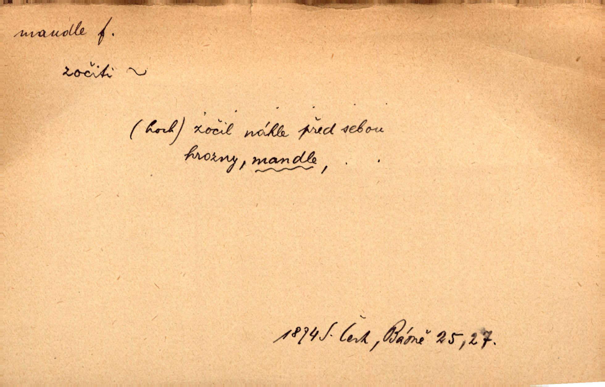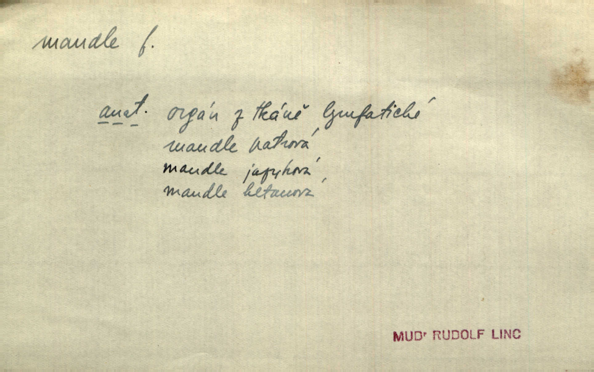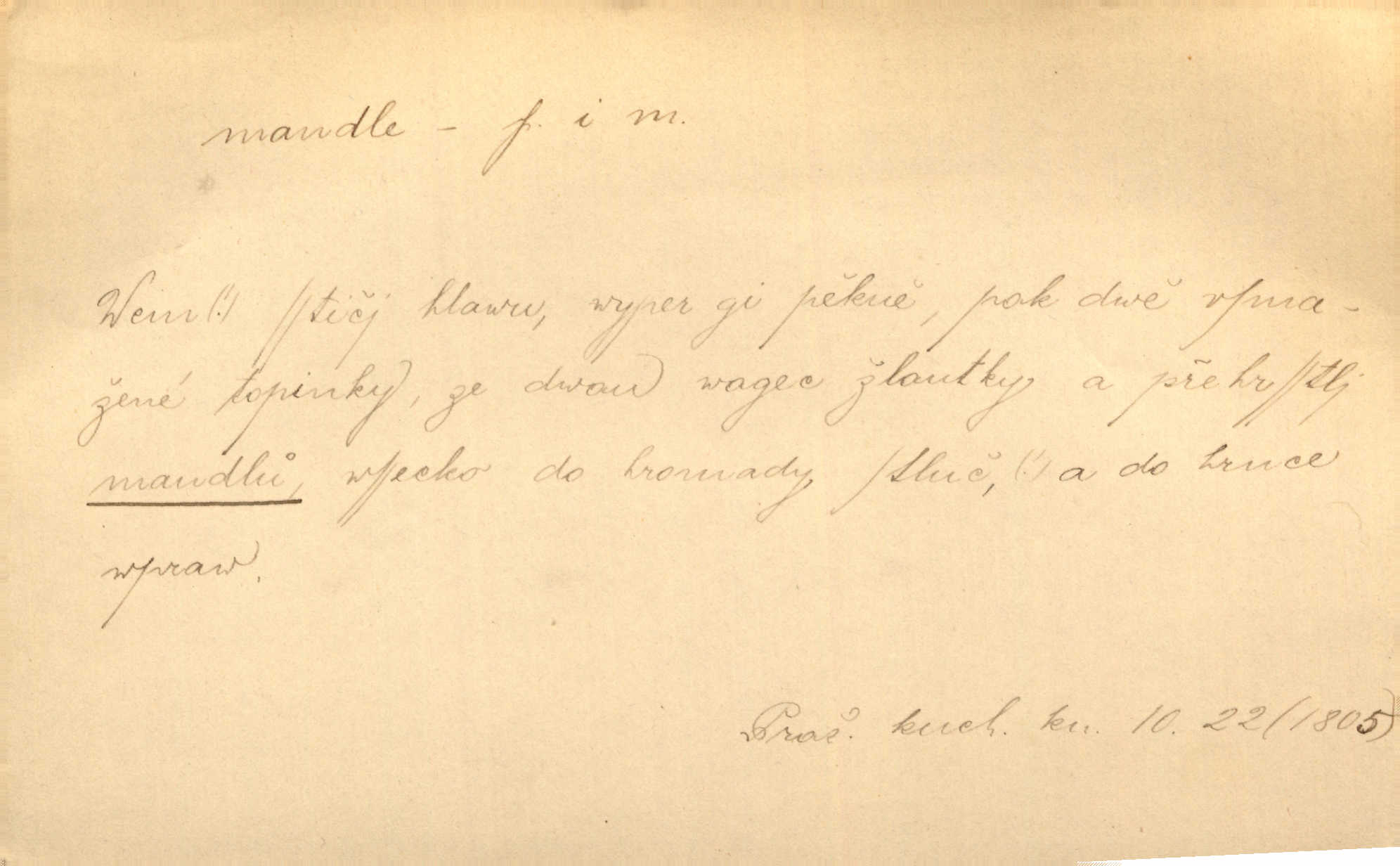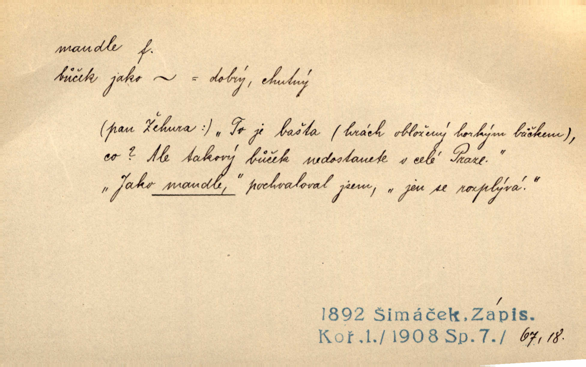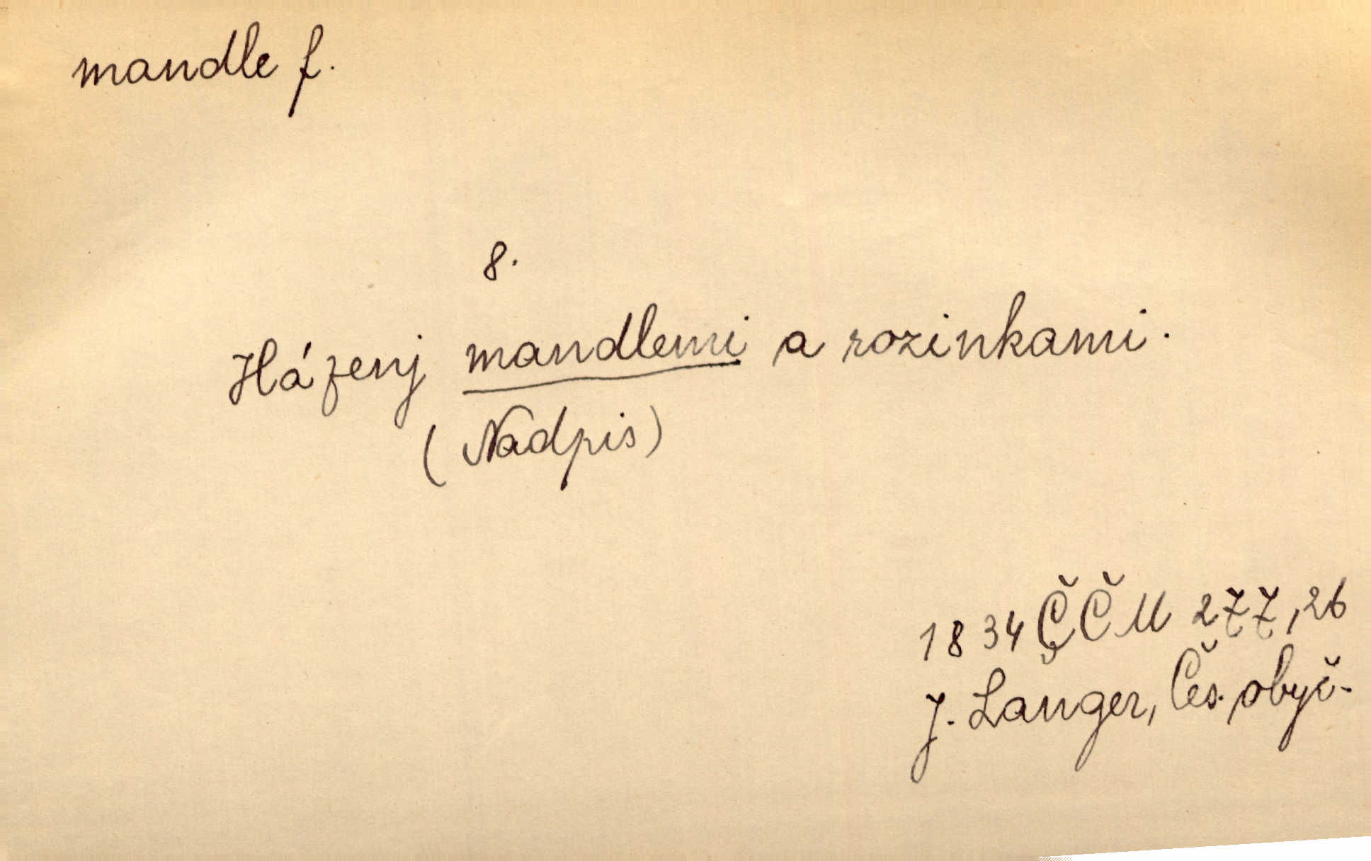 - mandle, -e f. bot. plod mandloně používaný hlavně v kuchařství a cukrářství. Potřebuju mandle a hrozinky do buchty. Herrm. Krásnou vepřovinku máme, jako mandle bude! chutná. Rais. To je holka jak mandle svěží. Stroup. Handle jsou mandle, plácněme si! obchod je znamenitá věc. Sez. Zbož. hořké mandle, sladké mandle; praskavé mandle prodávané se skořápkou. D tonsilla, párové, žlázové těleso mající velikost a podobu mandle na přechodu dutiny ústní v hltanovou. Slepé střevo, mandle, pupek, samé zbytečnosti. K. Čap. Měl „spadlé mandle“ bolení v krku. Vrba. Lid. ustál. sp. Teď spadnou mandle všem tajným nepřátelům říše budou pokořeni. Jah. Kdekdo se na ně [nováčky] chystal, že jim „zvedne mandle…“ potýrá je. Ros. Co pak záleží panu hraběti na nějakém stu metrických centů cukru, pro něj to nic neznamená, a nám by to zvedlo mandle polepšilo, prospělo. Šim. No, teď jsem tě vzala za mandle, ty pejcho jedna! myslela si pokořila. Šlej. Až se to [že purkmistr neplatil daně] doví na berním úřadě — ti mu natřesou mandle! zatočí s ním. Vrba. D mandlovník. Přišla jsem k studánce, tam kde mandle kvetou. Zey. Háje citronů a mandlí září vonným květem. Čech. D Geol. výplň v dutinách vyvřelých hornin tvořená sekundárními nerosty.