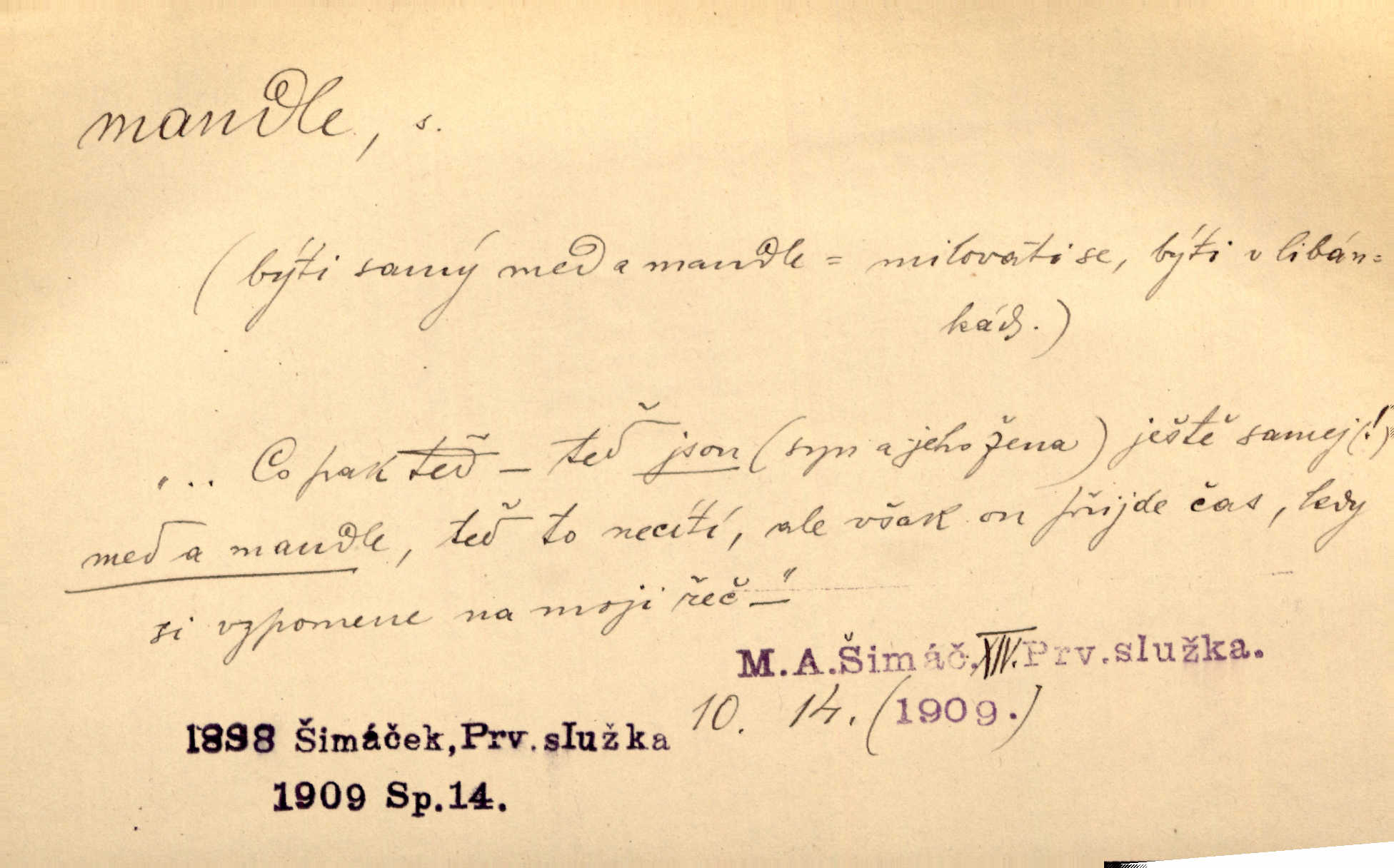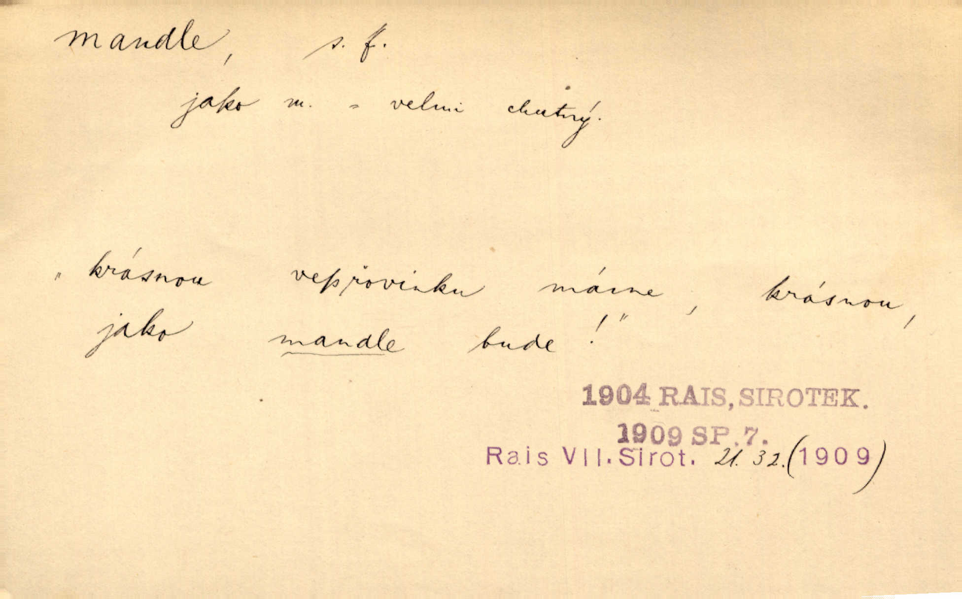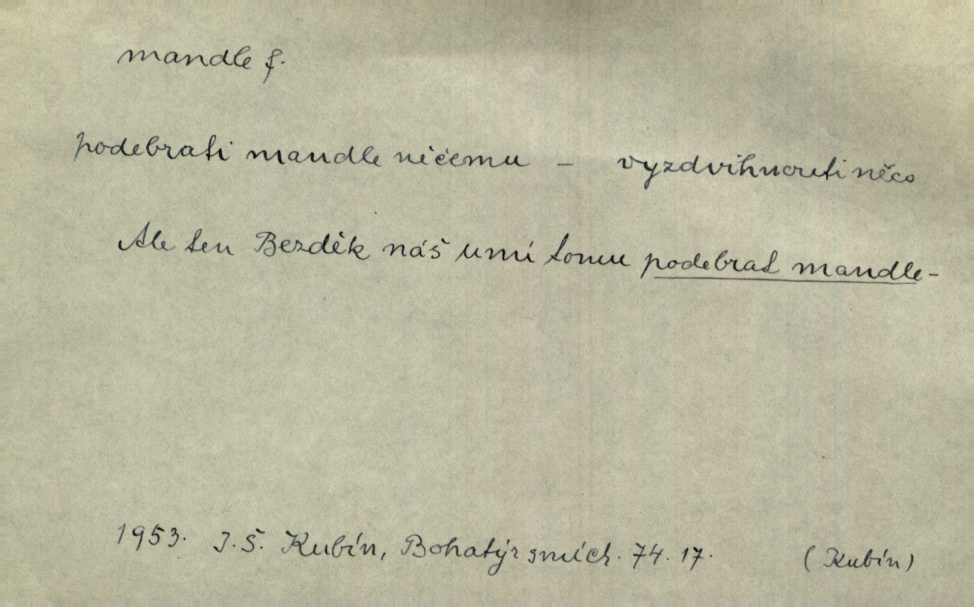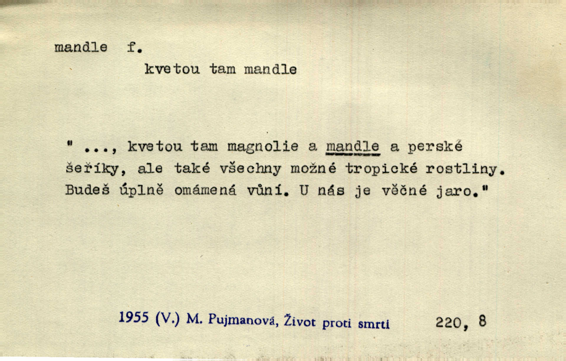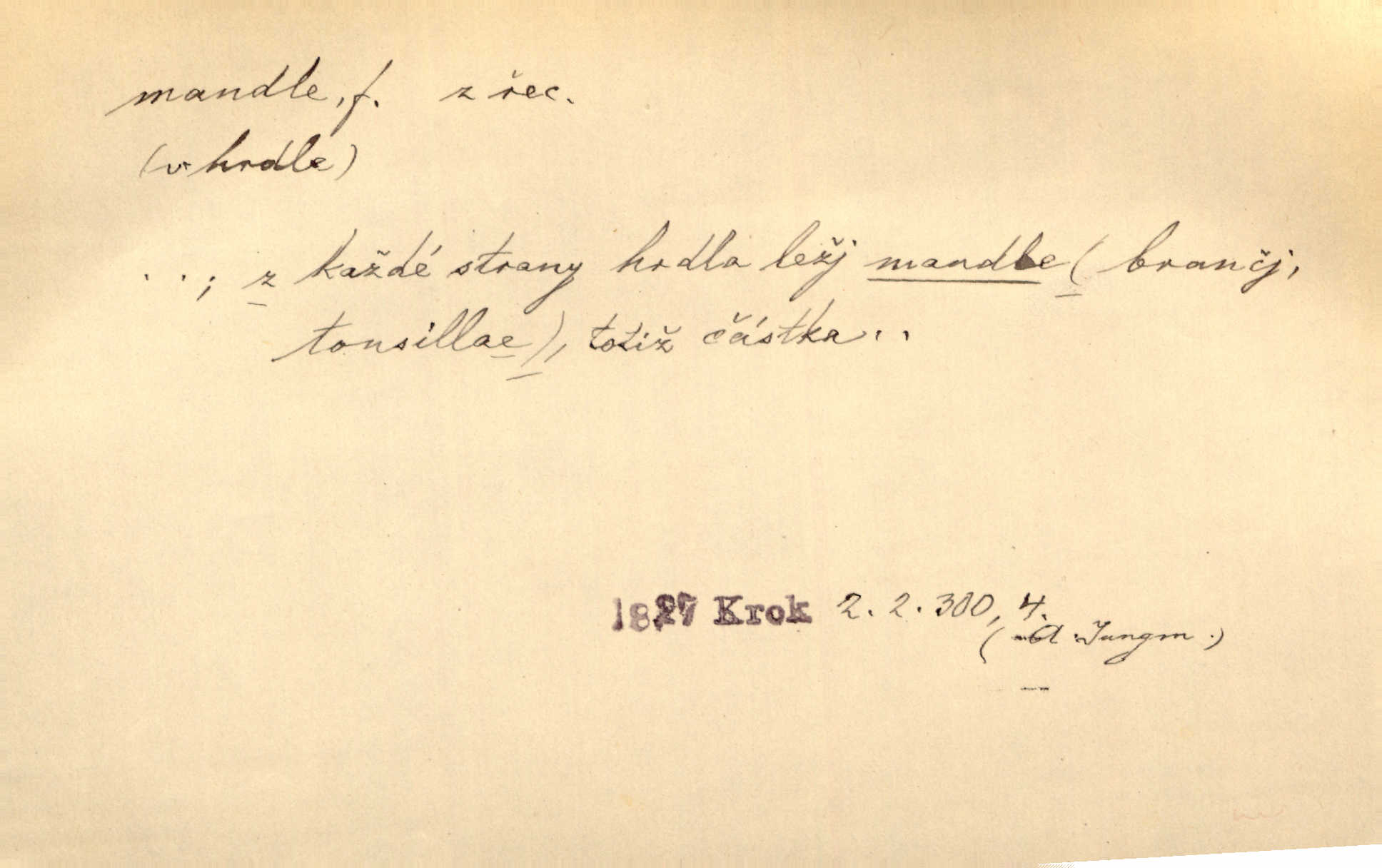 - mandle, -e f. bot. plod mandloně používaný hlavně v kuchařství a cukrářství. Potřebuju mandle a hrozinky do buchty. Herrm. Krásnou vepřovinku máme, jako mandle bude! chutná. Rais. To je holka jak mandle svěží. Stroup. Handle jsou mandle, plácněme si! obchod je znamenitá věc. Sez. Zbož. hořké mandle, sladké mandle; praskavé mandle prodávané se skořápkou. D tonsilla, párové, žlázové těleso mající velikost a podobu mandle na přechodu dutiny ústní v hltanovou. Slepé střevo, mandle, pupek, samé zbytečnosti. K. Čap. Měl „spadlé mandle“ bolení v krku. Vrba. Lid. ustál. sp. Teď spadnou mandle všem tajným nepřátelům říše budou pokořeni. Jah. Kdekdo se na ně [nováčky] chystal, že jim „zvedne mandle…“ potýrá je. Ros. Co pak záleží panu hraběti na nějakém stu metrických centů cukru, pro něj to nic neznamená, a nám by to zvedlo mandle polepšilo, prospělo. Šim. No, teď jsem tě vzala za mandle, ty pejcho jedna! myslela si pokořila. Šlej. Až se to [že purkmistr neplatil daně] doví na berním úřadě — ti mu natřesou mandle! zatočí s ním. Vrba. D mandlovník. Přišla jsem k studánce, tam kde mandle kvetou. Zey. Háje citronů a mandlí září vonným květem. Čech. D Geol. výplň v dutinách vyvřelých hornin tvořená sekundárními nerosty.