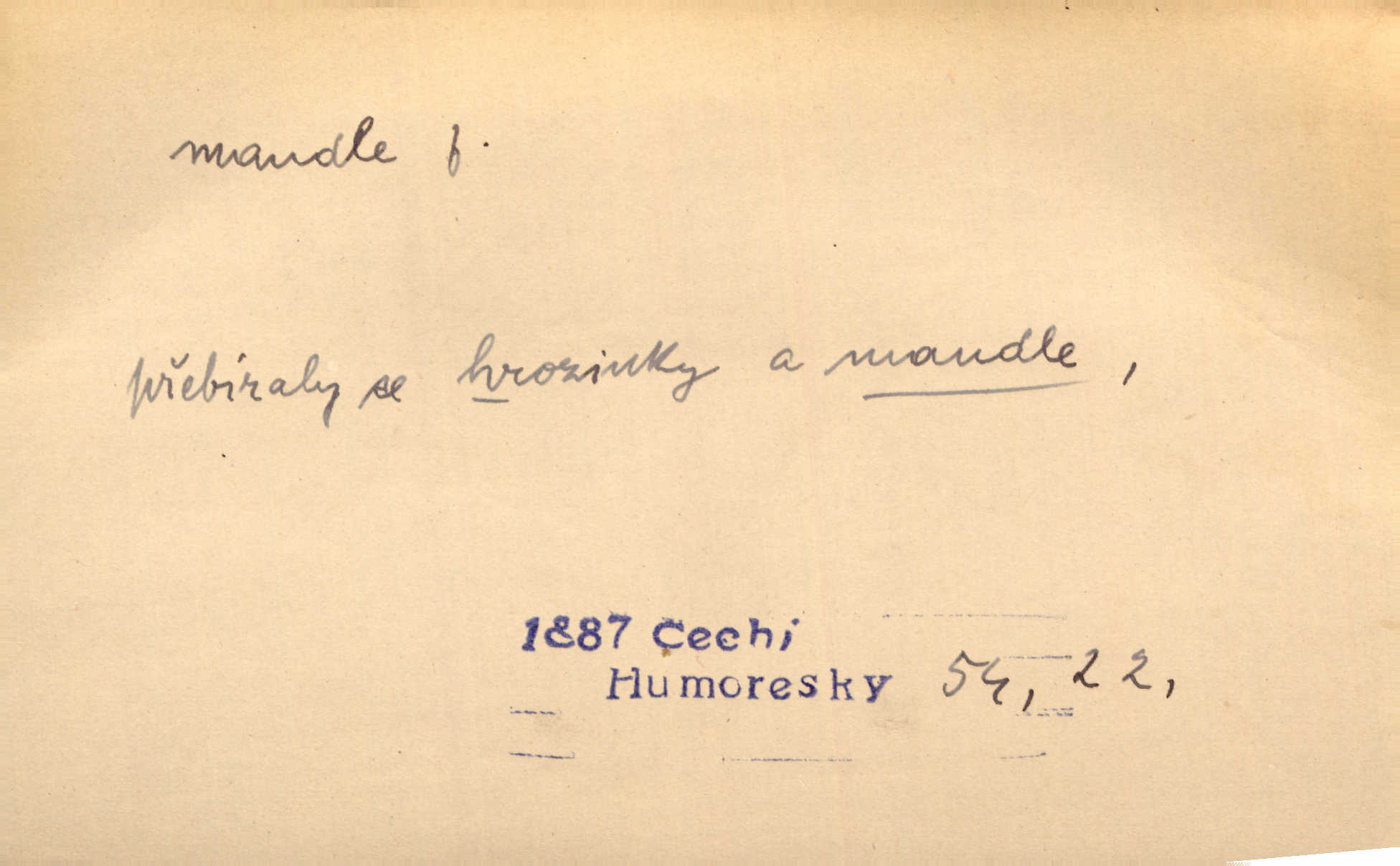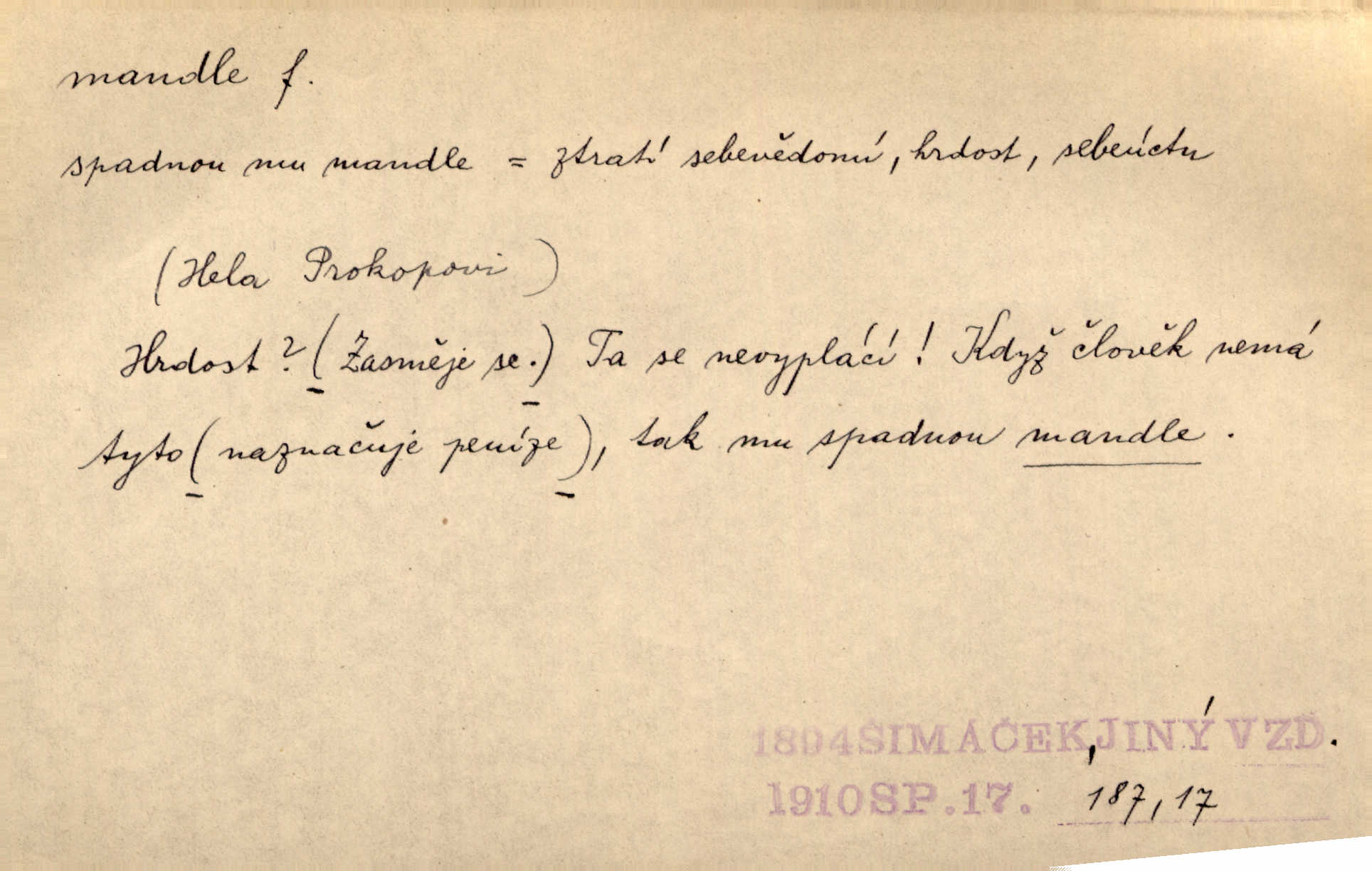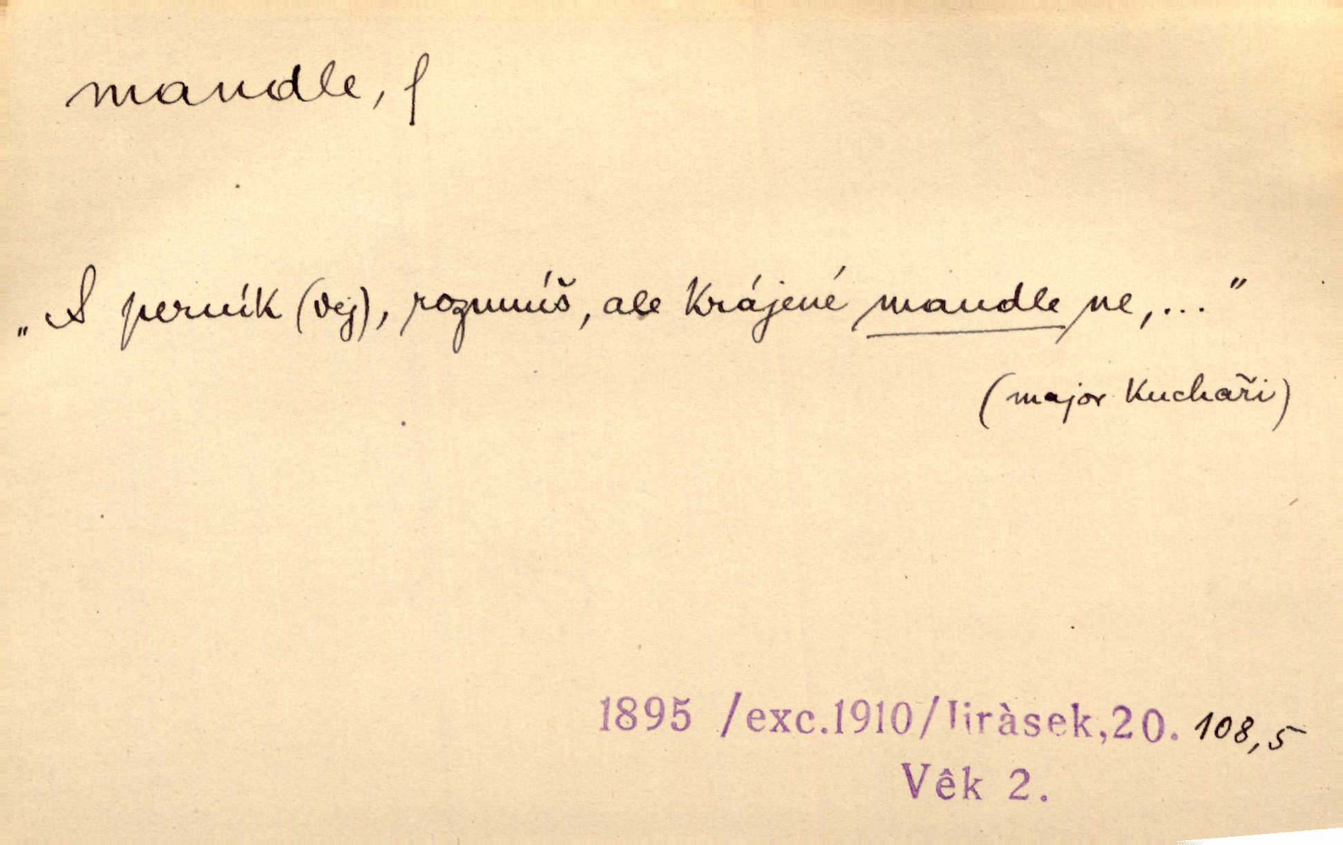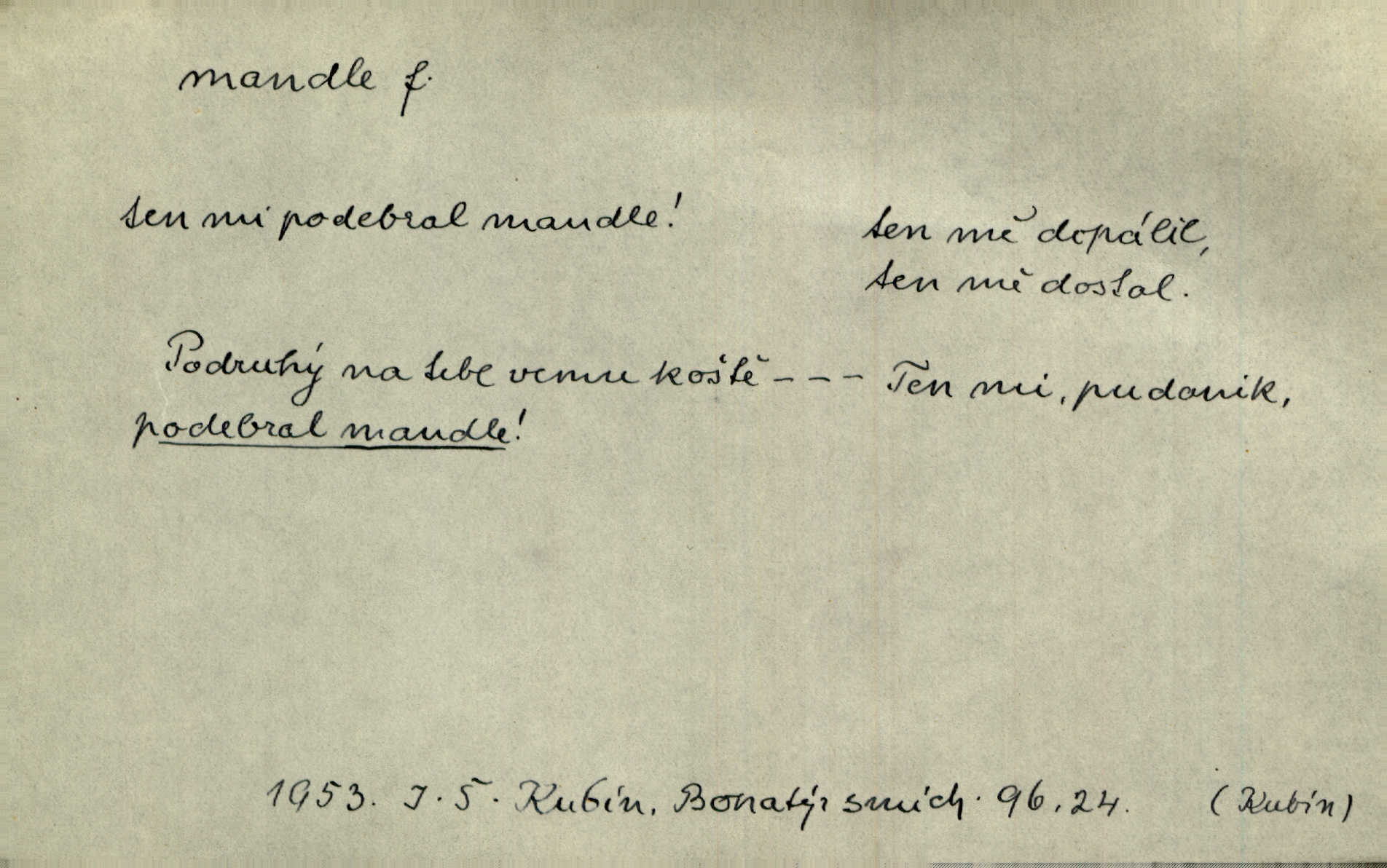 - mandle, -e f. bot. plod mandloně používaný hlavně v kuchařství a cukrářství. Potřebuju mandle a hrozinky do buchty. Herrm. Krásnou vepřovinku máme, jako mandle bude! chutná. Rais. To je holka jak mandle svěží. Stroup. Handle jsou mandle, plácněme si! obchod je znamenitá věc. Sez. Zbož. hořké mandle, sladké mandle; praskavé mandle prodávané se skořápkou. D tonsilla, párové, žlázové těleso mající velikost a podobu mandle na přechodu dutiny ústní v hltanovou. Slepé střevo, mandle, pupek, samé zbytečnosti. K. Čap. Měl „spadlé mandle“ bolení v krku. Vrba. Lid. ustál. sp. Teď spadnou mandle všem tajným nepřátelům říše budou pokořeni. Jah. Kdekdo se na ně [nováčky] chystal, že jim „zvedne mandle…“ potýrá je. Ros. Co pak záleží panu hraběti na nějakém stu metrických centů cukru, pro něj to nic neznamená, a nám by to zvedlo mandle polepšilo, prospělo. Šim. No, teď jsem tě vzala za mandle, ty pejcho jedna! myslela si pokořila. Šlej. Až se to [že purkmistr neplatil daně] doví na berním úřadě — ti mu natřesou mandle! zatočí s ním. Vrba. D mandlovník. Přišla jsem k studánce, tam kde mandle kvetou. Zey. Háje citronů a mandlí září vonným květem. Čech. D Geol. výplň v dutinách vyvřelých hornin tvořená sekundárními nerosty.
