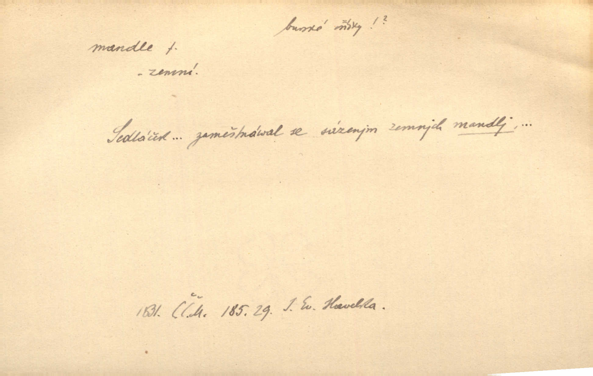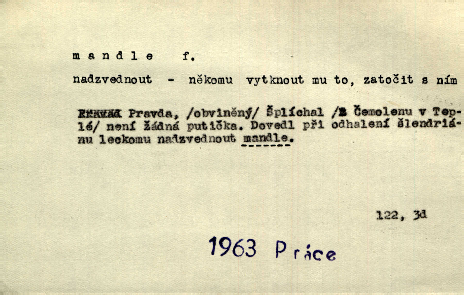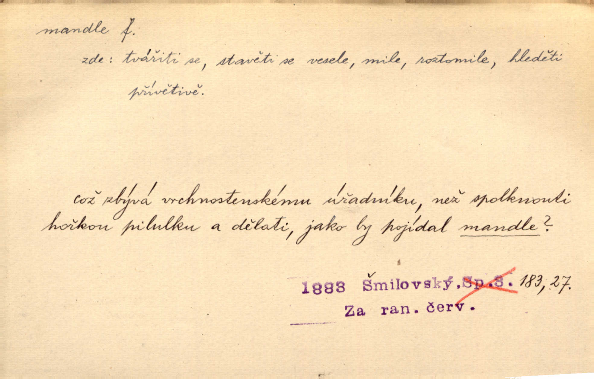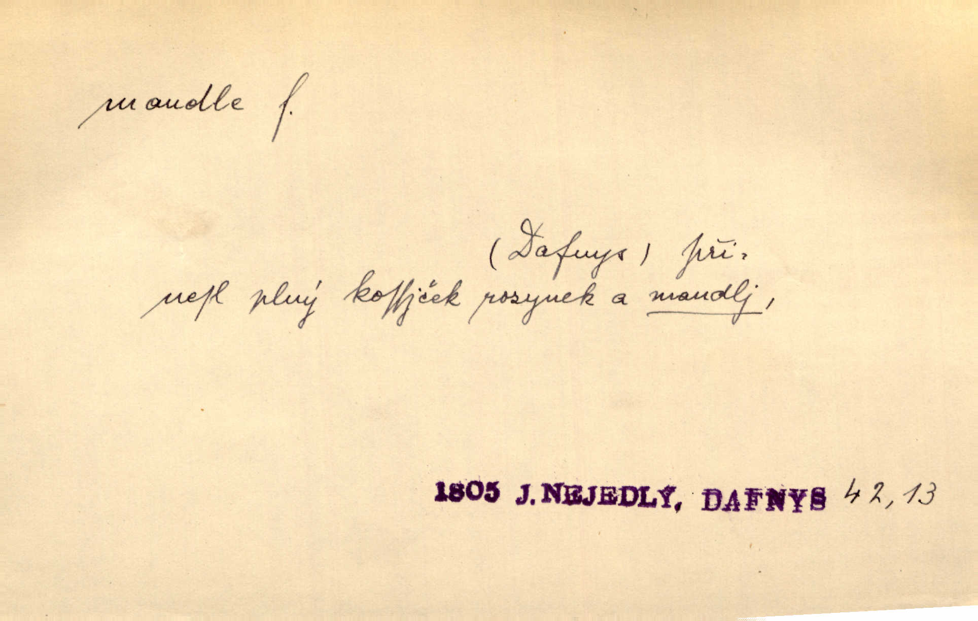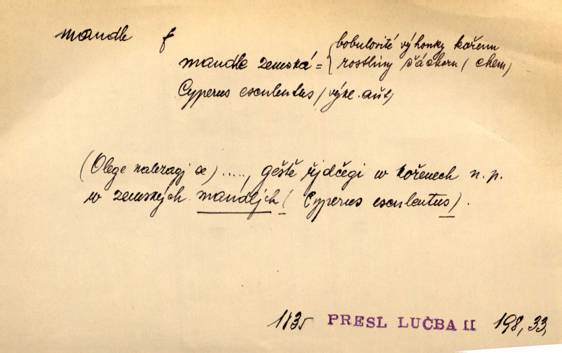 - mandle, -e f. bot. plod mandloně používaný hlavně v kuchařství a cukrářství. Potřebuju mandle a hrozinky do buchty. Herrm. Krásnou vepřovinku máme, jako mandle bude! chutná. Rais. To je holka jak mandle svěží. Stroup. Handle jsou mandle, plácněme si! obchod je znamenitá věc. Sez. Zbož. hořké mandle, sladké mandle; praskavé mandle prodávané se skořápkou. D tonsilla, párové, žlázové těleso mající velikost a podobu mandle na přechodu dutiny ústní v hltanovou. Slepé střevo, mandle, pupek, samé zbytečnosti. K. Čap. Měl „spadlé mandle“ bolení v krku. Vrba. Lid. ustál. sp. Teď spadnou mandle všem tajným nepřátelům říše budou pokořeni. Jah. Kdekdo se na ně [nováčky] chystal, že jim „zvedne mandle…“ potýrá je. Ros. Co pak záleží panu hraběti na nějakém stu metrických centů cukru, pro něj to nic neznamená, a nám by to zvedlo mandle polepšilo, prospělo. Šim. No, teď jsem tě vzala za mandle, ty pejcho jedna! myslela si pokořila. Šlej. Až se to [že purkmistr neplatil daně] doví na berním úřadě — ti mu natřesou mandle! zatočí s ním. Vrba. D mandlovník. Přišla jsem k studánce, tam kde mandle kvetou. Zey. Háje citronů a mandlí září vonným květem. Čech. D Geol. výplň v dutinách vyvřelých hornin tvořená sekundárními nerosty.