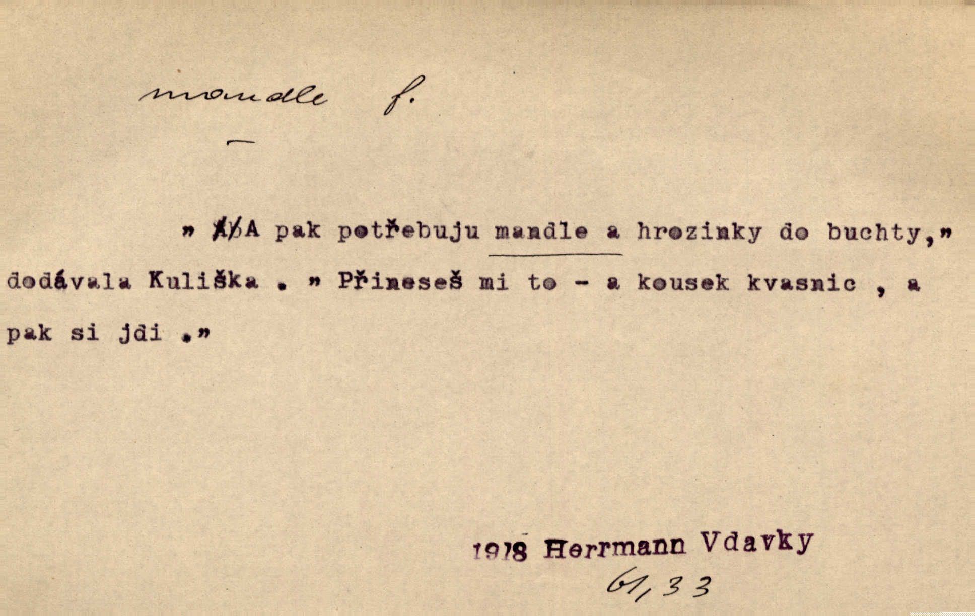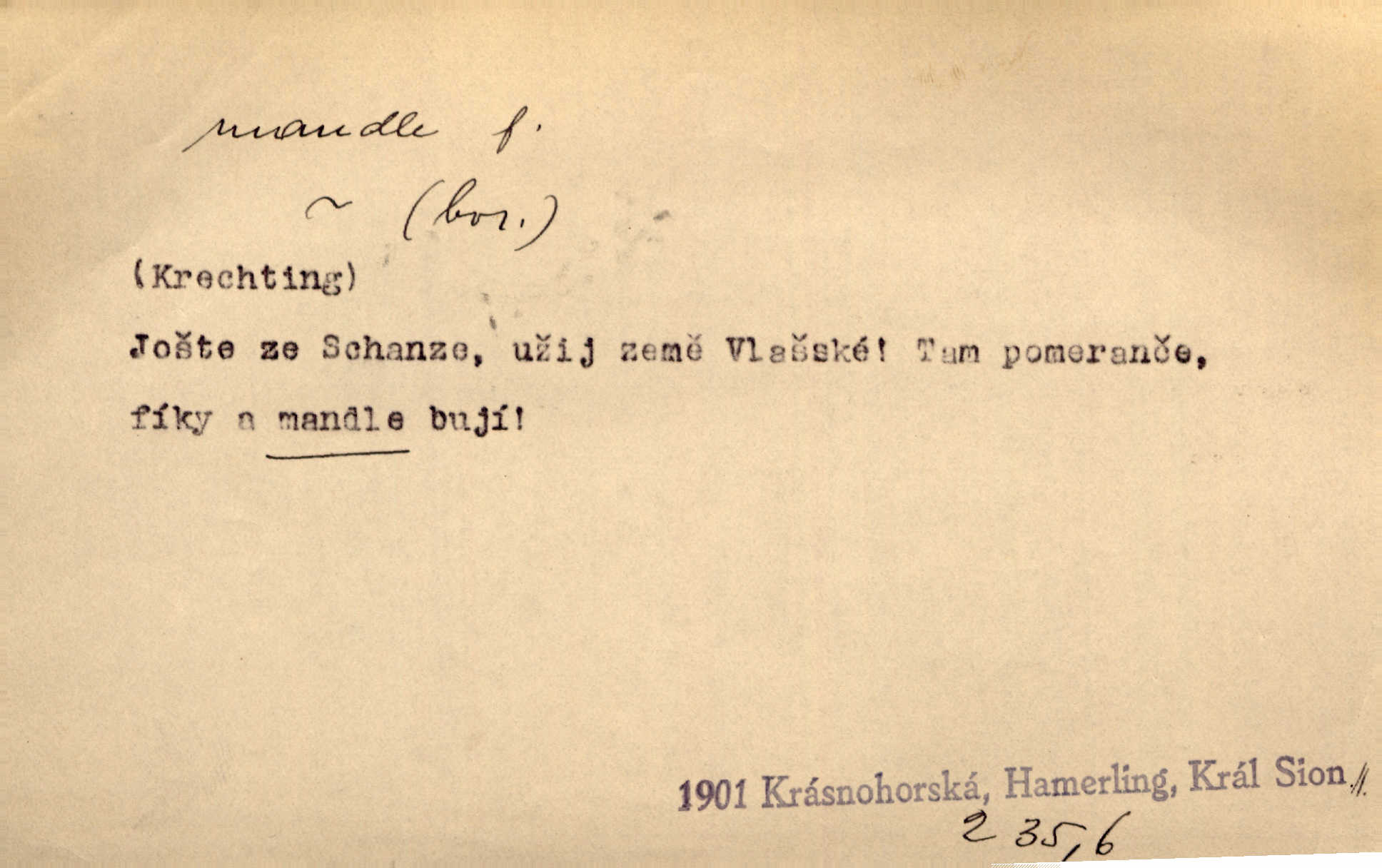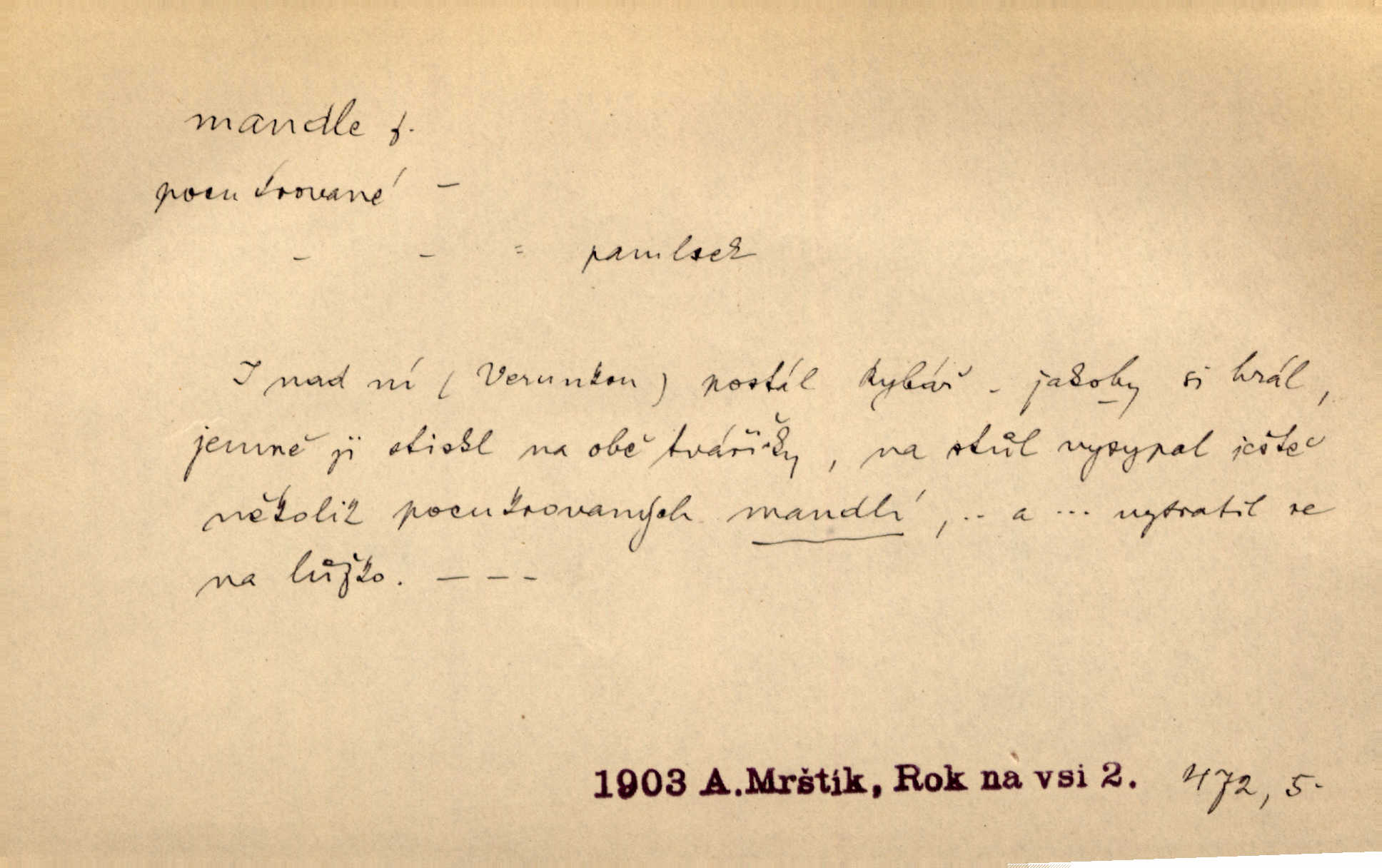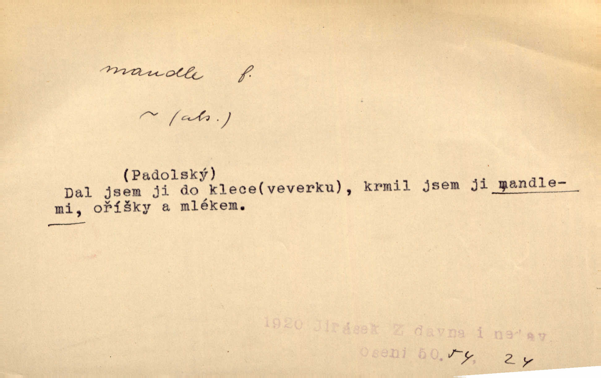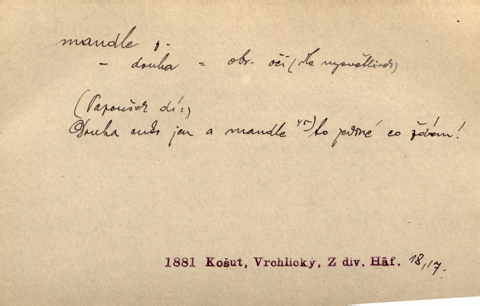 - mandle, -e f. bot. plod mandloně používaný hlavně v kuchařství a cukrářství. Potřebuju mandle a hrozinky do buchty. Herrm. Krásnou vepřovinku máme, jako mandle bude! chutná. Rais. To je holka jak mandle svěží. Stroup. Handle jsou mandle, plácněme si! obchod je znamenitá věc. Sez. Zbož. hořké mandle, sladké mandle; praskavé mandle prodávané se skořápkou. D tonsilla, párové, žlázové těleso mající velikost a podobu mandle na přechodu dutiny ústní v hltanovou. Slepé střevo, mandle, pupek, samé zbytečnosti. K. Čap. Měl „spadlé mandle“ bolení v krku. Vrba. Lid. ustál. sp. Teď spadnou mandle všem tajným nepřátelům říše budou pokořeni. Jah. Kdekdo se na ně [nováčky] chystal, že jim „zvedne mandle…“ potýrá je. Ros. Co pak záleží panu hraběti na nějakém stu metrických centů cukru, pro něj to nic neznamená, a nám by to zvedlo mandle polepšilo, prospělo. Šim. No, teď jsem tě vzala za mandle, ty pejcho jedna! myslela si pokořila. Šlej. Až se to [že purkmistr neplatil daně] doví na berním úřadě — ti mu natřesou mandle! zatočí s ním. Vrba. D mandlovník. Přišla jsem k studánce, tam kde mandle kvetou. Zey. Háje citronů a mandlí září vonným květem. Čech. D Geol. výplň v dutinách vyvřelých hornin tvořená sekundárními nerosty.