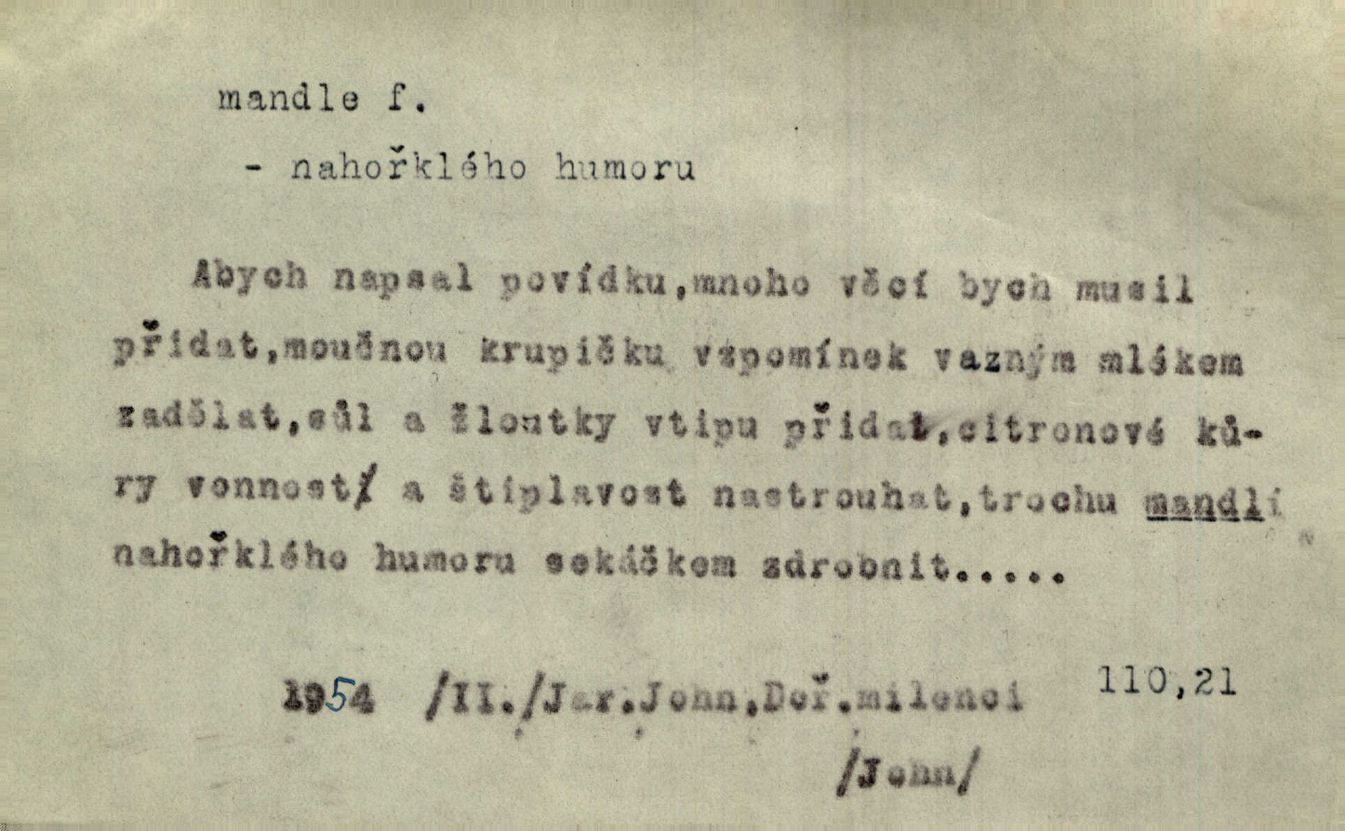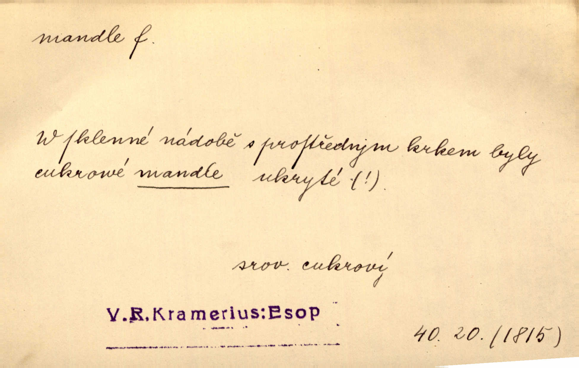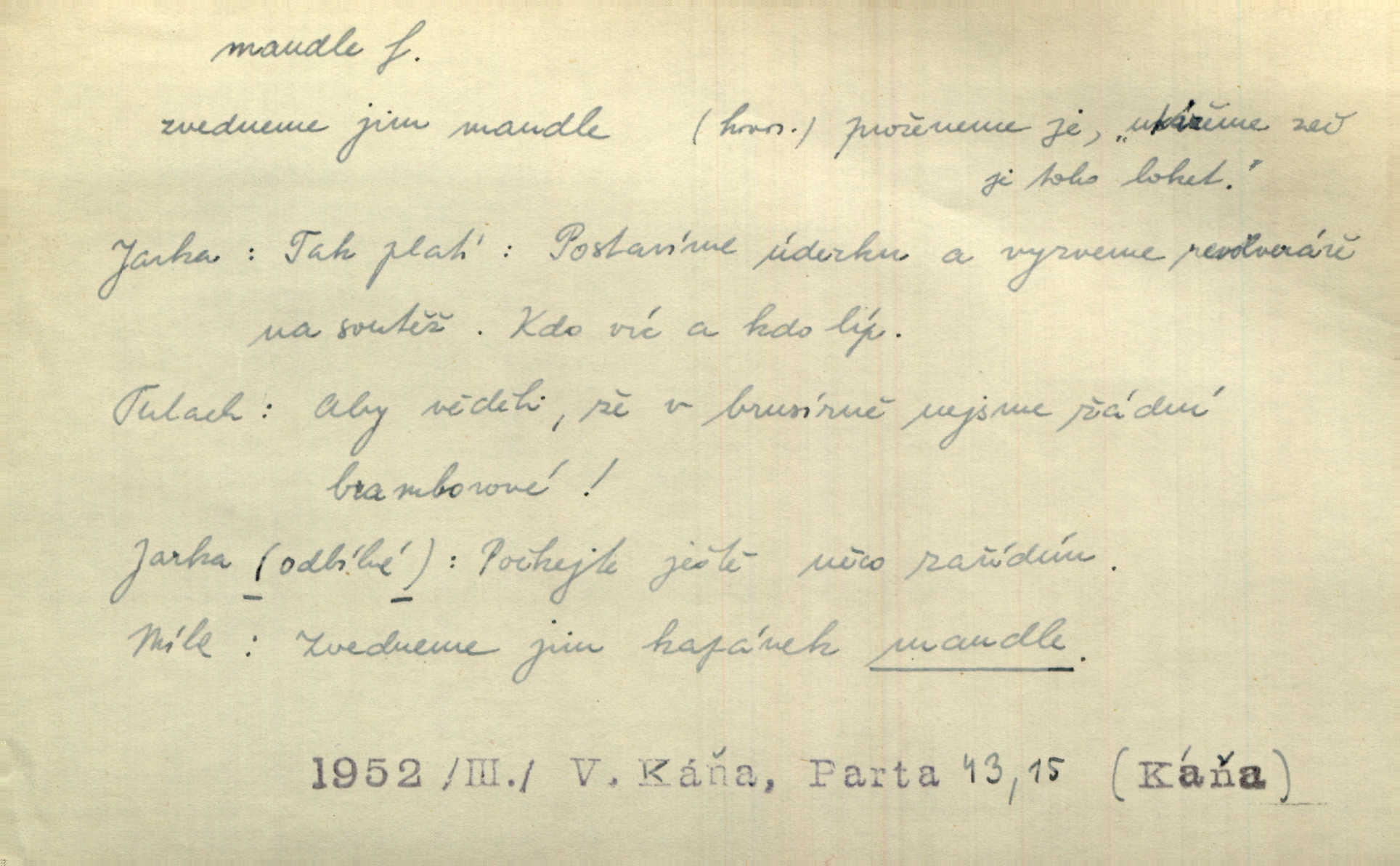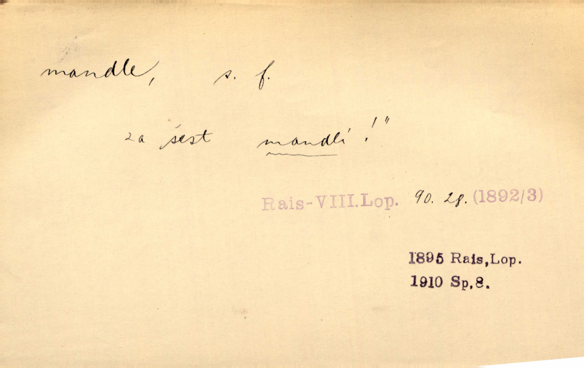 - mandle, -e f. bot. plod mandloně používaný hlavně v kuchařství a cukrářství. Potřebuju mandle a hrozinky do buchty. Herrm. Krásnou vepřovinku máme, jako mandle bude! chutná. Rais. To je holka jak mandle svěží. Stroup. Handle jsou mandle, plácněme si! obchod je znamenitá věc. Sez. Zbož. hořké mandle, sladké mandle; praskavé mandle prodávané se skořápkou. D tonsilla, párové, žlázové těleso mající velikost a podobu mandle na přechodu dutiny ústní v hltanovou. Slepé střevo, mandle, pupek, samé zbytečnosti. K. Čap. Měl „spadlé mandle“ bolení v krku. Vrba. Lid. ustál. sp. Teď spadnou mandle všem tajným nepřátelům říše budou pokořeni. Jah. Kdekdo se na ně [nováčky] chystal, že jim „zvedne mandle…“ potýrá je. Ros. Co pak záleží panu hraběti na nějakém stu metrických centů cukru, pro něj to nic neznamená, a nám by to zvedlo mandle polepšilo, prospělo. Šim. No, teď jsem tě vzala za mandle, ty pejcho jedna! myslela si pokořila. Šlej. Až se to [že purkmistr neplatil daně] doví na berním úřadě — ti mu natřesou mandle! zatočí s ním. Vrba. D mandlovník. Přišla jsem k studánce, tam kde mandle kvetou. Zey. Háje citronů a mandlí září vonným květem. Čech. D Geol. výplň v dutinách vyvřelých hornin tvořená sekundárními nerosty.