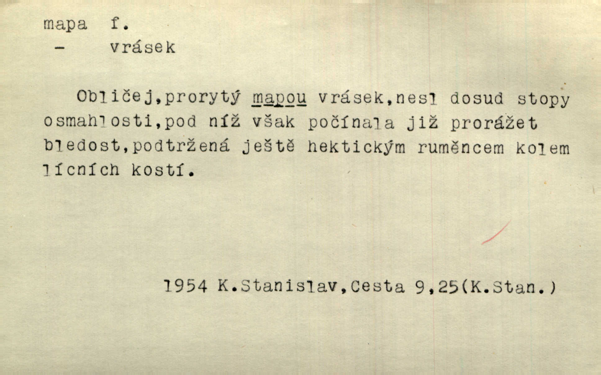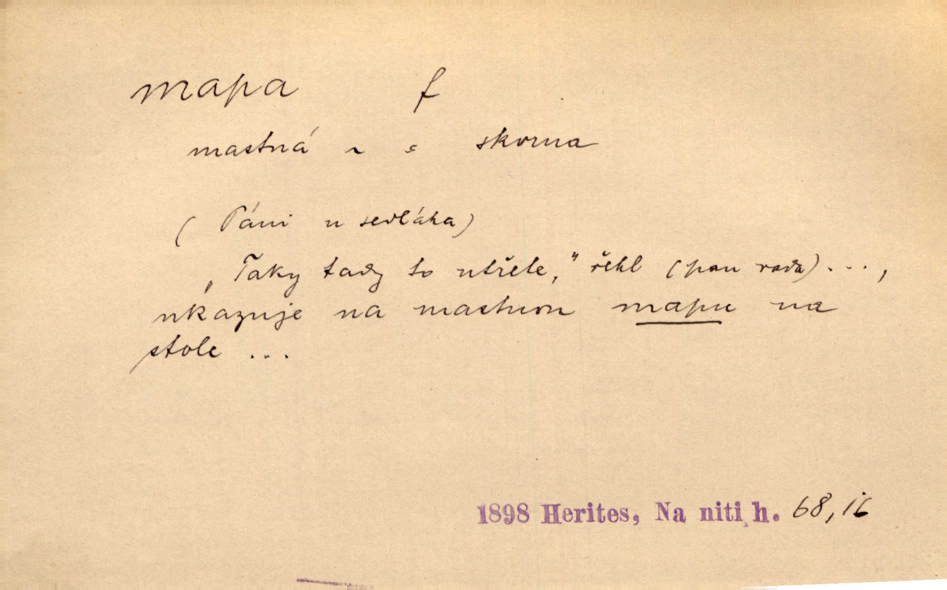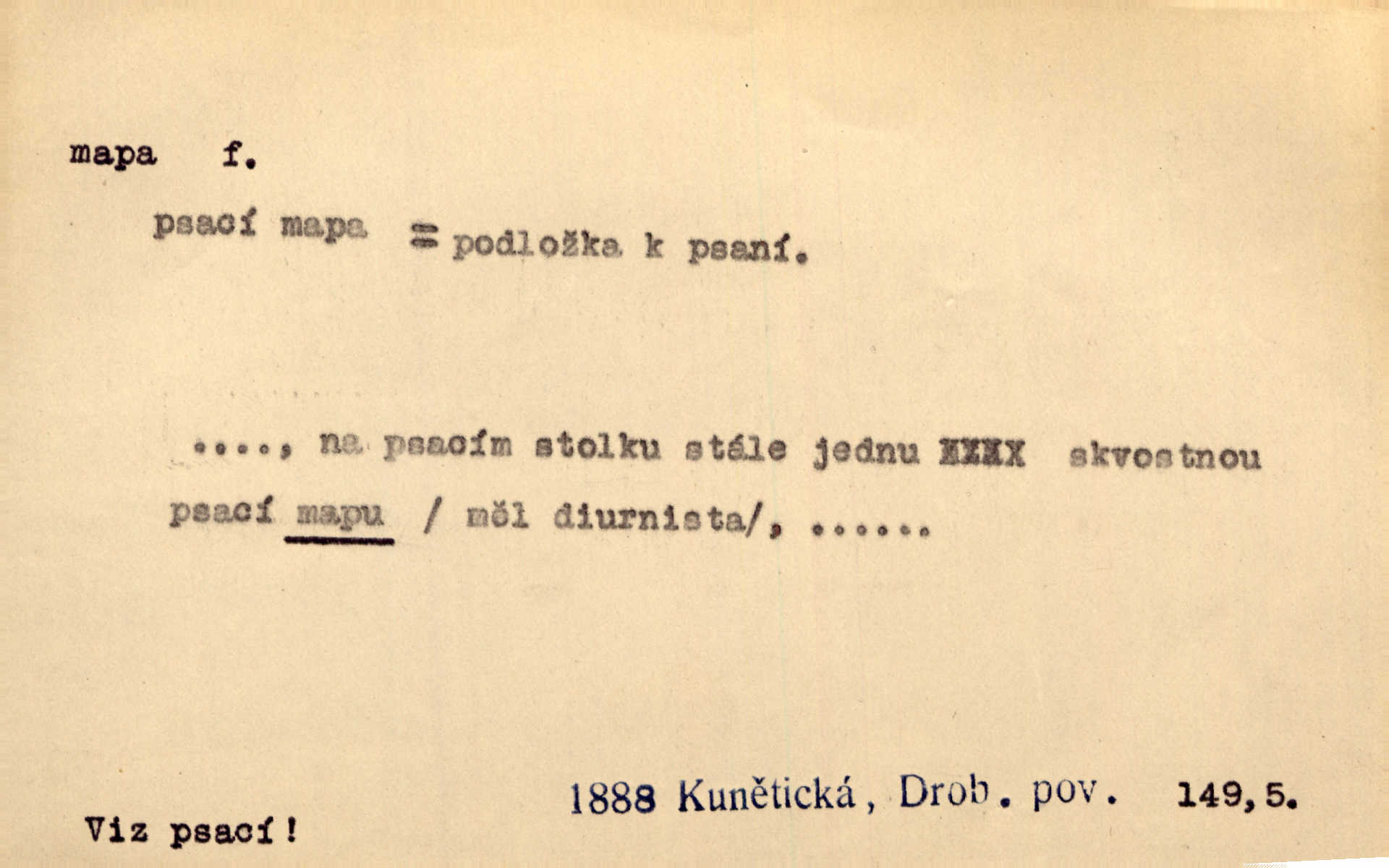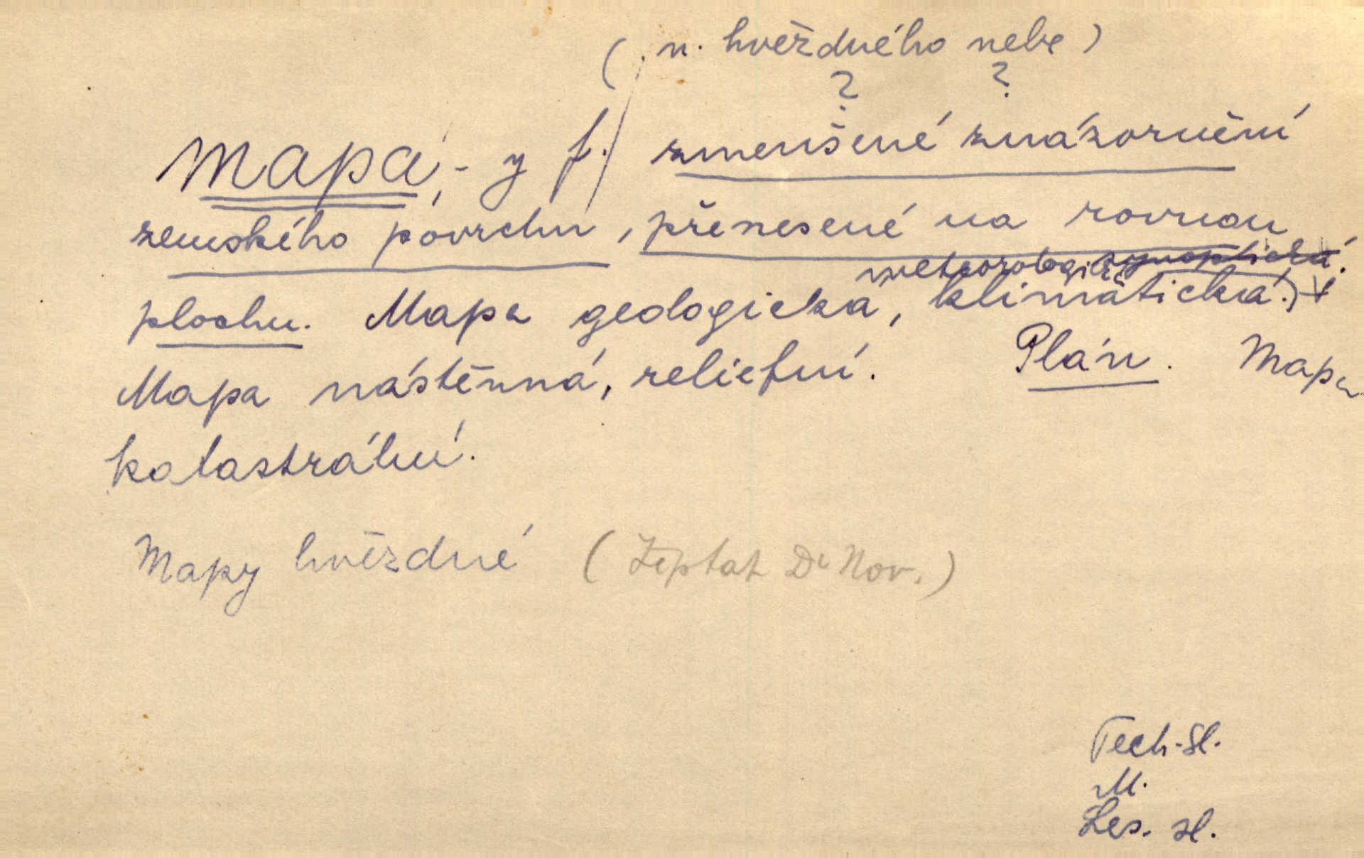 - mapa, -y f. zmenšené znázornění zemského povrchu n. jeho částí, přenesené na rovnou plochu; podobné znázornění hvězdného nebe. Na zdi visela mapa Čech. Něm. Mapa okolí pražského. Herrm. Mapy zeměpisné i hvězdářské. Zschokke. Mapa geologická znázorňující rozšíření hornin a útvarů na zemském povrchu. Mapa klimatická, meteorologická, národopisná a p. Velmi názorně podávají nerovnosti terénu reliefní mapy. Bač. Mapa katastrální, pozemková. [Hrabec s geometry] začal choditi po polích s mapami, triangly a řetízky plány. Herb. Dole [pod Skalkou] ležel Mníšek jako mapa. Svob. Přen. Nebyl jeho život mapou na stole k nahlédnutí rozloženou. Šmil. D skvrna připomínající svým tvarem mapu. V suterénních barech rostly na temněrudých malbách mapy vlhkosti. Maj. „Taky tady to utřete,“ řekl, ukazuje na mastnou mapu na stole. Her. Rezavá mapa od potu na vestě. Čap. Ch. Her. slang. Hrůzně a zbytečně pomalovanému obličeji říká se [mezi herci] mapa nebo nádraží. Stej. Typ. (žert.) velká korektura. D desky n. obálka pro listiny, kresby a p. Na jednom ze stolů mapa s listinami. Bozd. Několik malířů a malířek s mapami a skřínkami. Mach. Z mapy zesnulého B. Wachsmanna vybrali jsme několik drobných kreseb. Vol. sm.