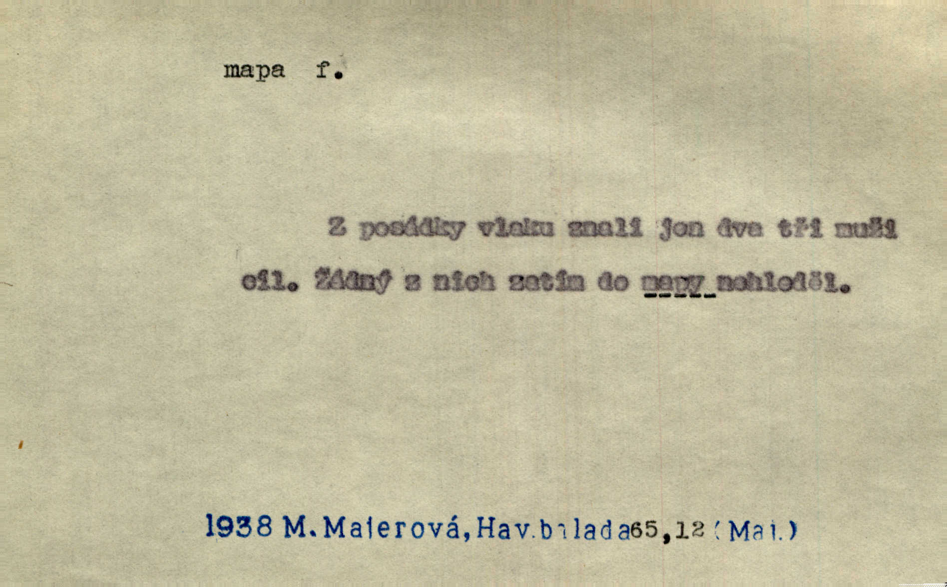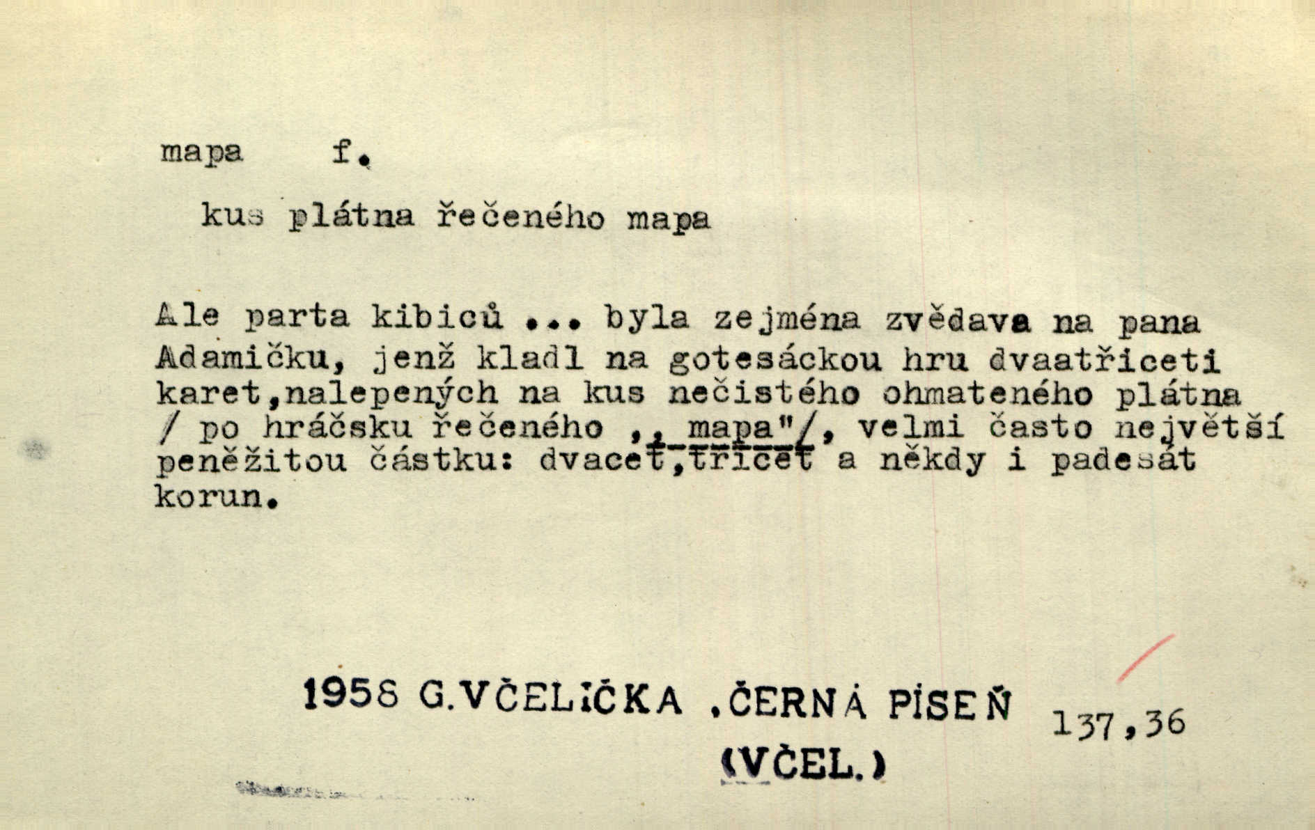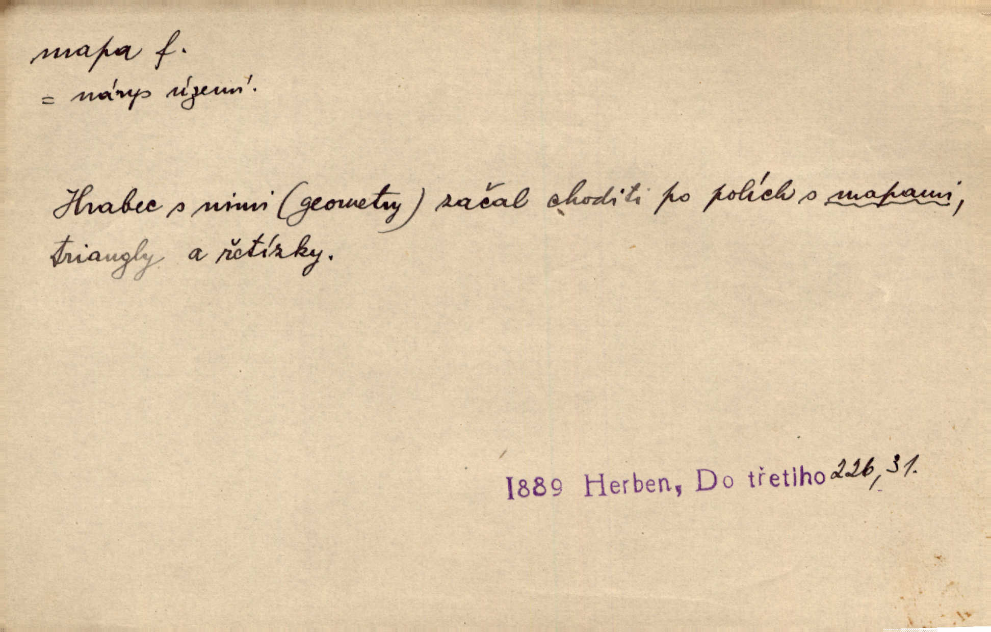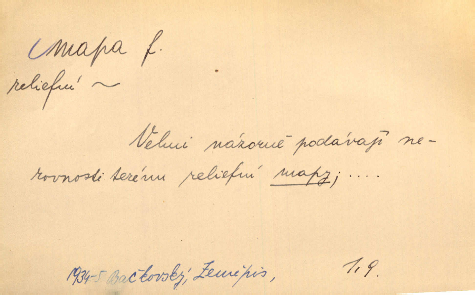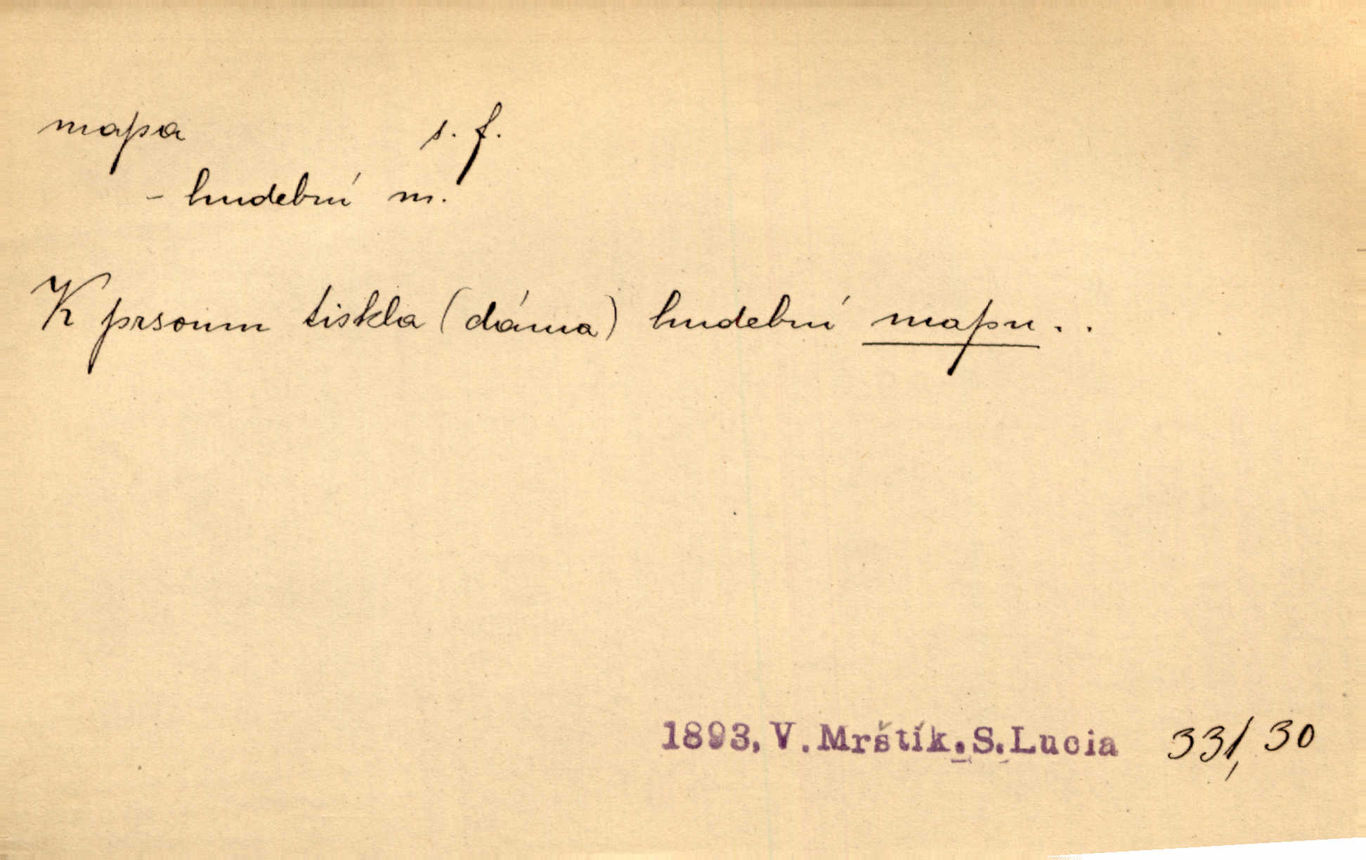 - mapa, -y f. zmenšené znázornění zemského povrchu n. jeho částí, přenesené na rovnou plochu; podobné znázornění hvězdného nebe. Na zdi visela mapa Čech. Něm. Mapa okolí pražského. Herrm. Mapy zeměpisné i hvězdářské. Zschokke. Mapa geologická znázorňující rozšíření hornin a útvarů na zemském povrchu. Mapa klimatická, meteorologická, národopisná a p. Velmi názorně podávají nerovnosti terénu reliefní mapy. Bač. Mapa katastrální, pozemková. [Hrabec s geometry] začal choditi po polích s mapami, triangly a řetízky plány. Herb. Dole [pod Skalkou] ležel Mníšek jako mapa. Svob. Přen. Nebyl jeho život mapou na stole k nahlédnutí rozloženou. Šmil. D skvrna připomínající svým tvarem mapu. V suterénních barech rostly na temněrudých malbách mapy vlhkosti. Maj. „Taky tady to utřete,“ řekl, ukazuje na mastnou mapu na stole. Her. Rezavá mapa od potu na vestě. Čap. Ch. Her. slang. Hrůzně a zbytečně pomalovanému obličeji říká se [mezi herci] mapa nebo nádraží. Stej. Typ. (žert.) velká korektura. D desky n. obálka pro listiny, kresby a p. Na jednom ze stolů mapa s listinami. Bozd. Několik malířů a malířek s mapami a skřínkami. Mach. Z mapy zesnulého B. Wachsmanna vybrali jsme několik drobných kreseb. Vol. sm.