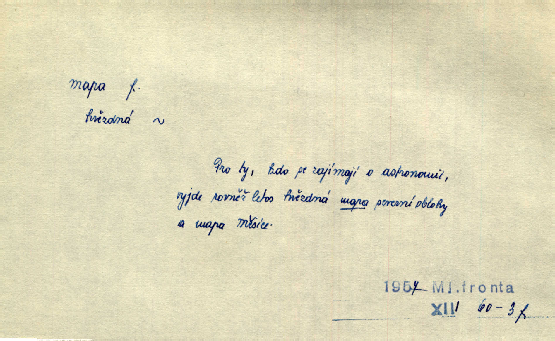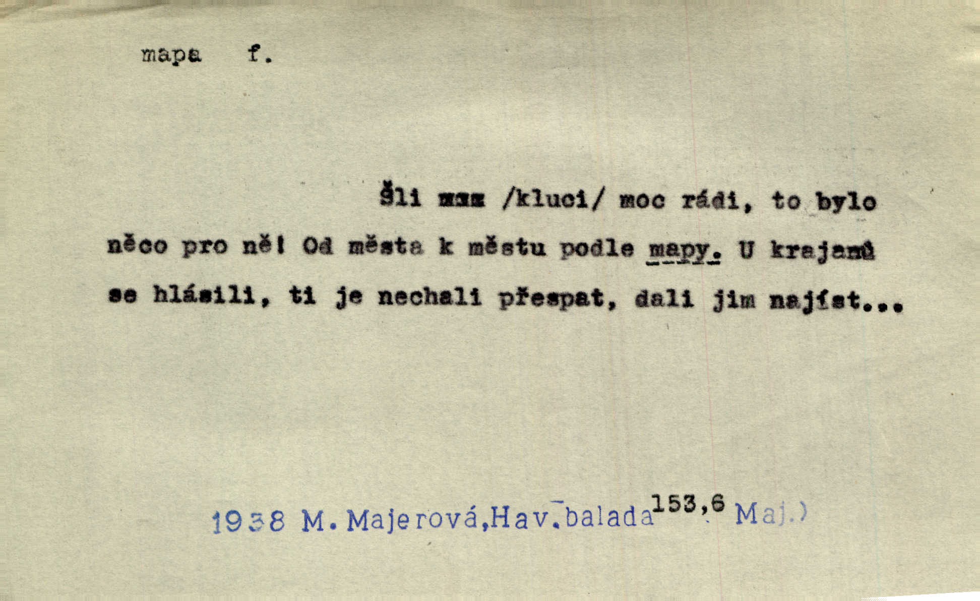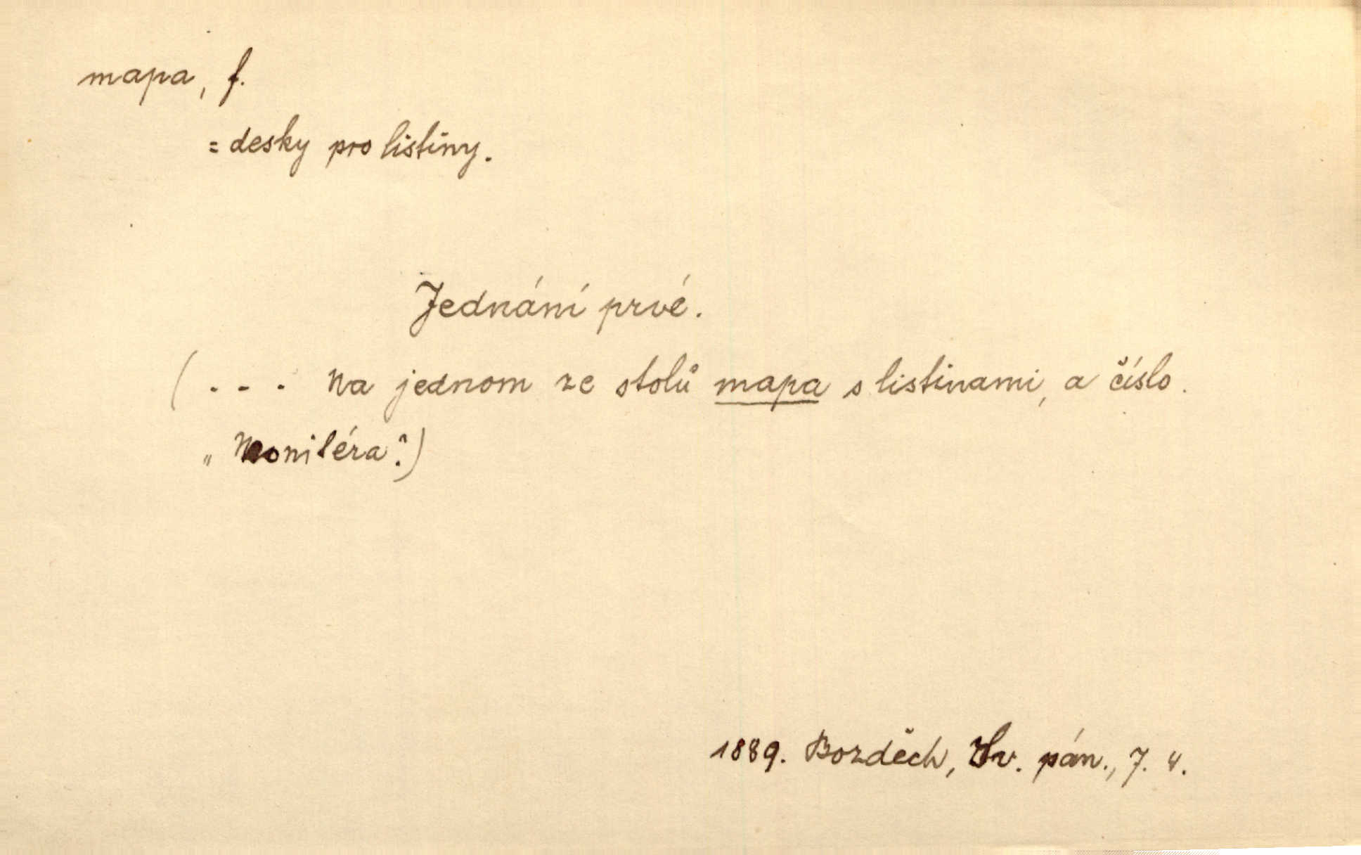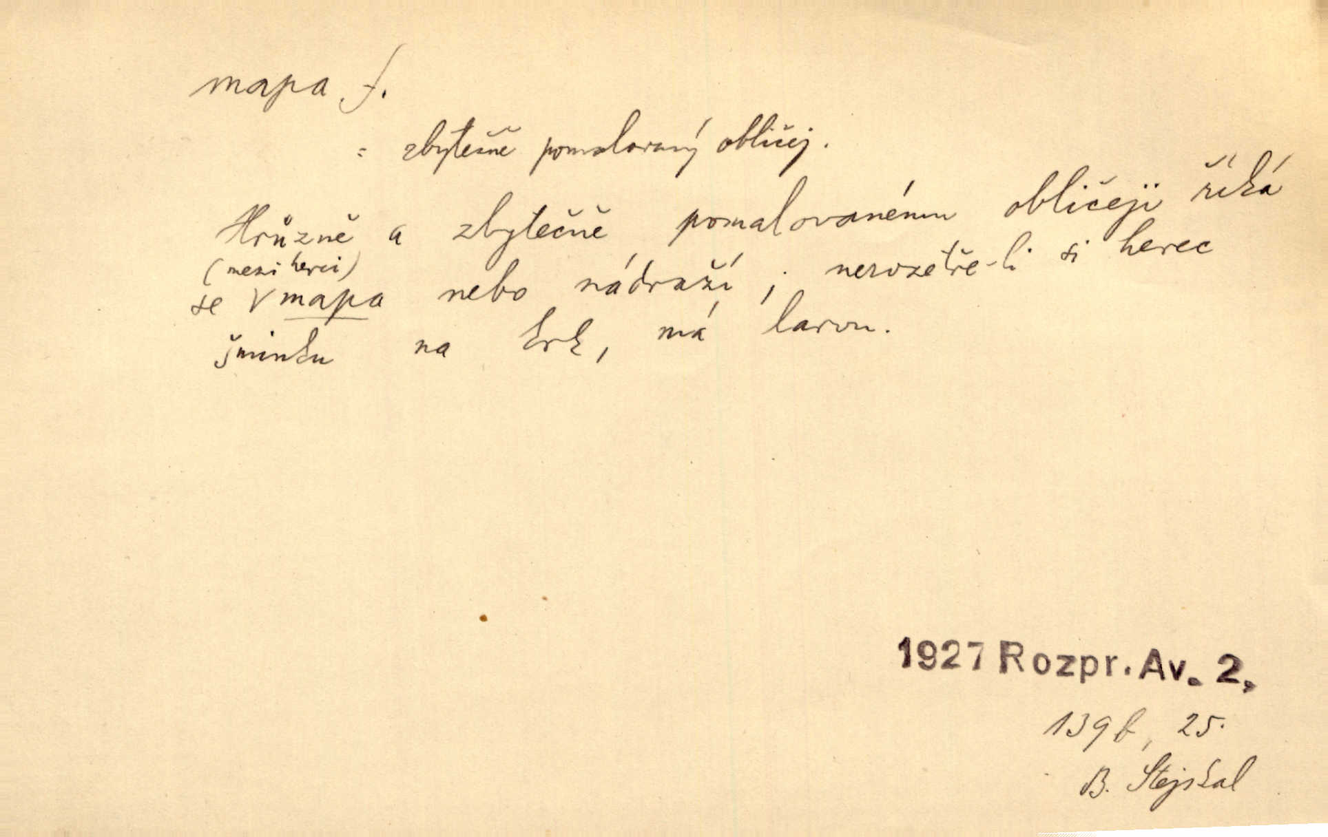 - mapa, -y f. zmenšené znázornění zemského povrchu n. jeho částí, přenesené na rovnou plochu; podobné znázornění hvězdného nebe. Na zdi visela mapa Čech. Něm. Mapa okolí pražského. Herrm. Mapy zeměpisné i hvězdářské. Zschokke. Mapa geologická znázorňující rozšíření hornin a útvarů na zemském povrchu. Mapa klimatická, meteorologická, národopisná a p. Velmi názorně podávají nerovnosti terénu reliefní mapy. Bač. Mapa katastrální, pozemková. [Hrabec s geometry] začal choditi po polích s mapami, triangly a řetízky plány. Herb. Dole [pod Skalkou] ležel Mníšek jako mapa. Svob. Přen. Nebyl jeho život mapou na stole k nahlédnutí rozloženou. Šmil. D skvrna připomínající svým tvarem mapu. V suterénních barech rostly na temněrudých malbách mapy vlhkosti. Maj. „Taky tady to utřete,“ řekl, ukazuje na mastnou mapu na stole. Her. Rezavá mapa od potu na vestě. Čap. Ch. Her. slang. Hrůzně a zbytečně pomalovanému obličeji říká se [mezi herci] mapa nebo nádraží. Stej. Typ. (žert.) velká korektura. D desky n. obálka pro listiny, kresby a p. Na jednom ze stolů mapa s listinami. Bozd. Několik malířů a malířek s mapami a skřínkami. Mach. Z mapy zesnulého B. Wachsmanna vybrali jsme několik drobných kreseb. Vol. sm.