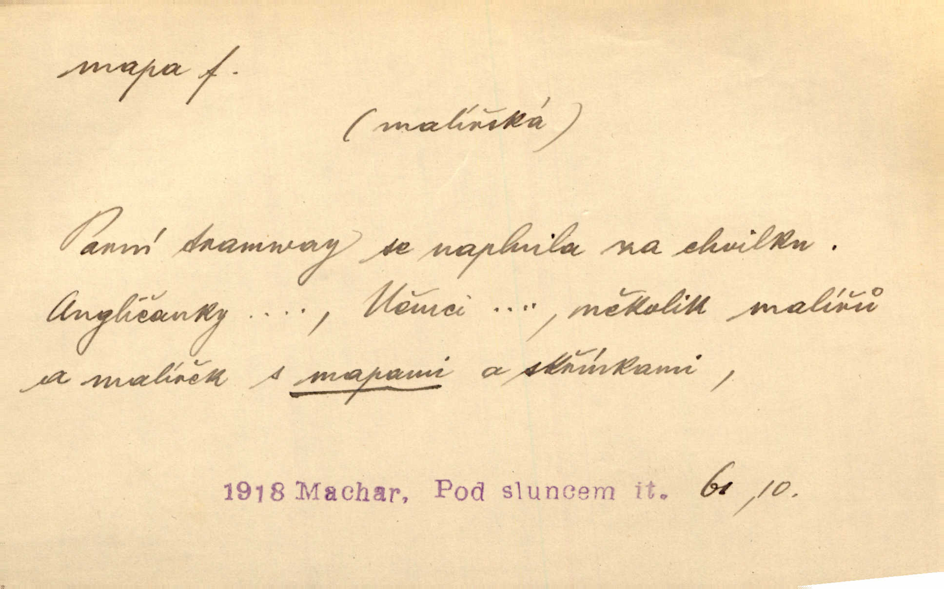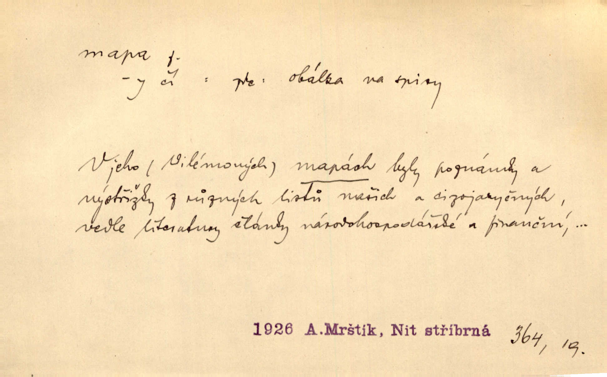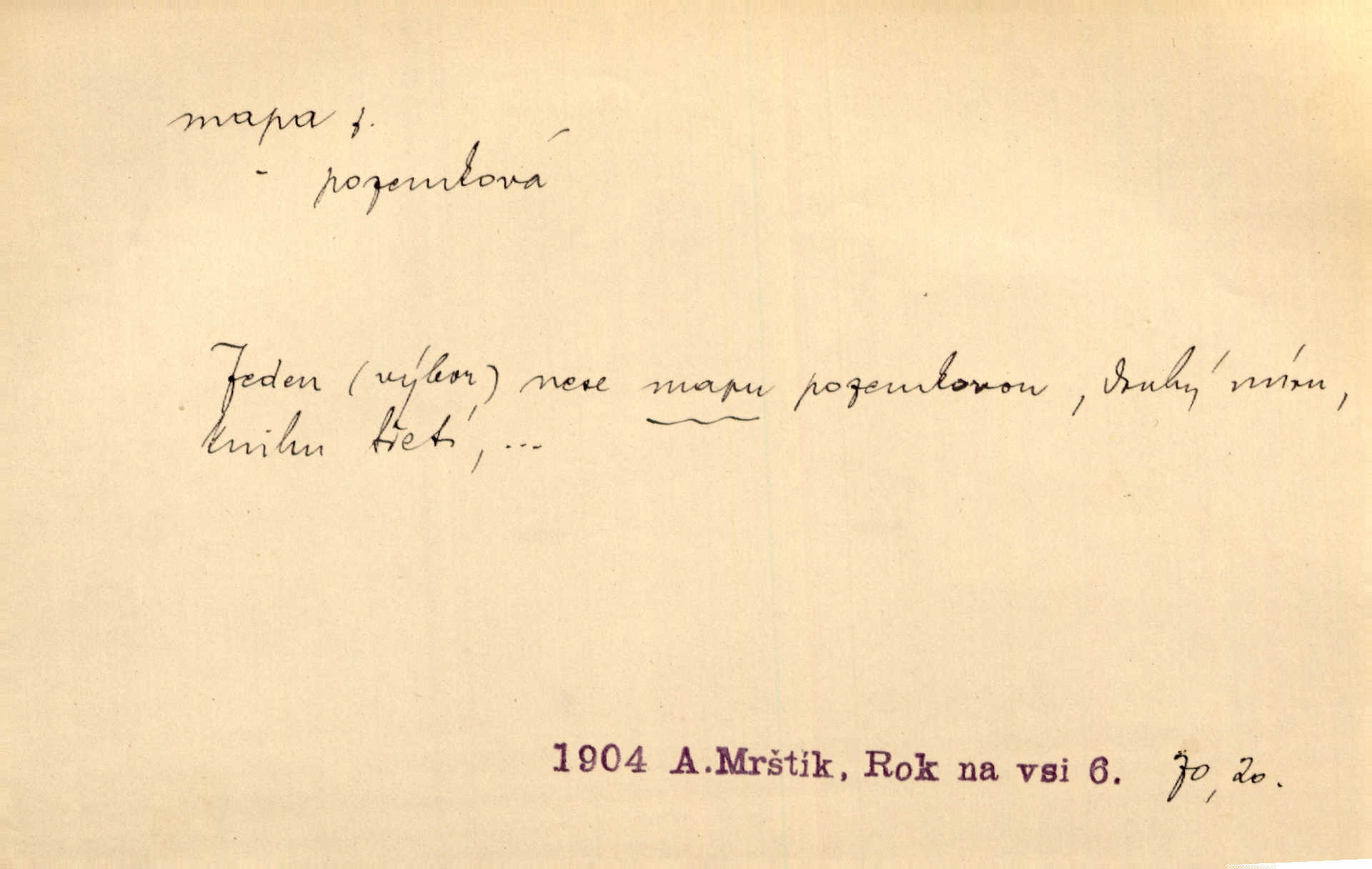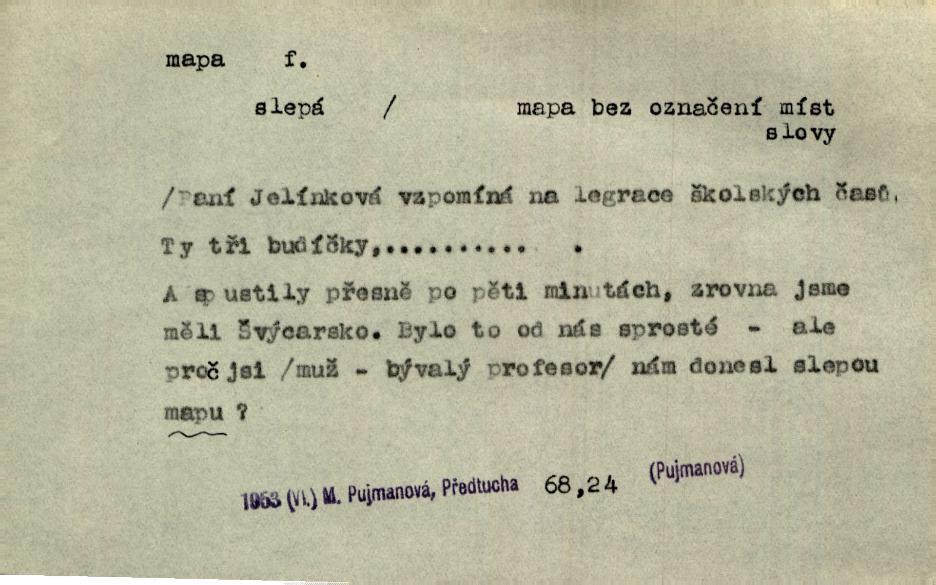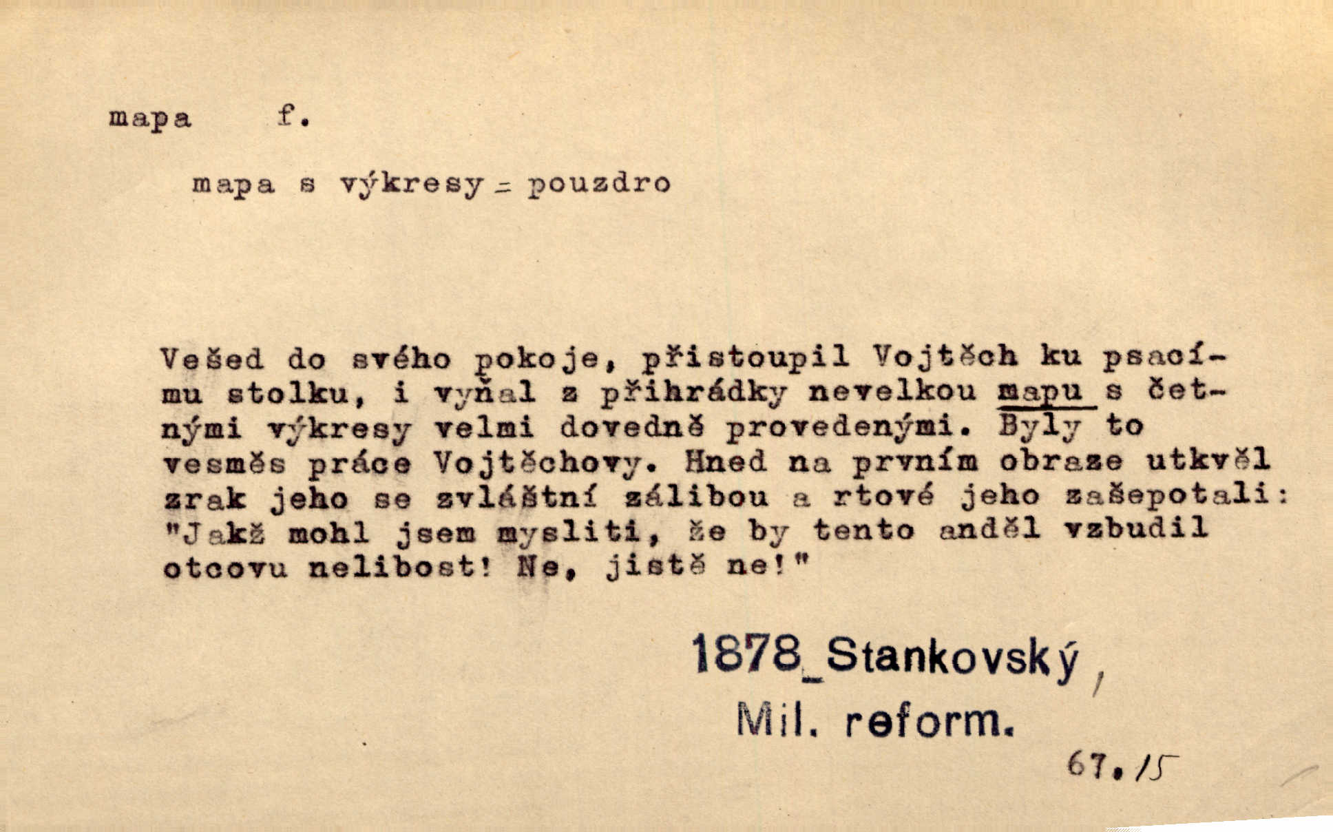 - mapa, -y f. zmenšené znázornění zemského povrchu n. jeho částí, přenesené na rovnou plochu; podobné znázornění hvězdného nebe. Na zdi visela mapa Čech. Něm. Mapa okolí pražského. Herrm. Mapy zeměpisné i hvězdářské. Zschokke. Mapa geologická znázorňující rozšíření hornin a útvarů na zemském povrchu. Mapa klimatická, meteorologická, národopisná a p. Velmi názorně podávají nerovnosti terénu reliefní mapy. Bač. Mapa katastrální, pozemková. [Hrabec s geometry] začal choditi po polích s mapami, triangly a řetízky plány. Herb. Dole [pod Skalkou] ležel Mníšek jako mapa. Svob. Přen. Nebyl jeho život mapou na stole k nahlédnutí rozloženou. Šmil. D skvrna připomínající svým tvarem mapu. V suterénních barech rostly na temněrudých malbách mapy vlhkosti. Maj. „Taky tady to utřete,“ řekl, ukazuje na mastnou mapu na stole. Her. Rezavá mapa od potu na vestě. Čap. Ch. Her. slang. Hrůzně a zbytečně pomalovanému obličeji říká se [mezi herci] mapa nebo nádraží. Stej. Typ. (žert.) velká korektura. D desky n. obálka pro listiny, kresby a p. Na jednom ze stolů mapa s listinami. Bozd. Několik malířů a malířek s mapami a skřínkami. Mach. Z mapy zesnulého B. Wachsmanna vybrali jsme několik drobných kreseb. Vol. sm.