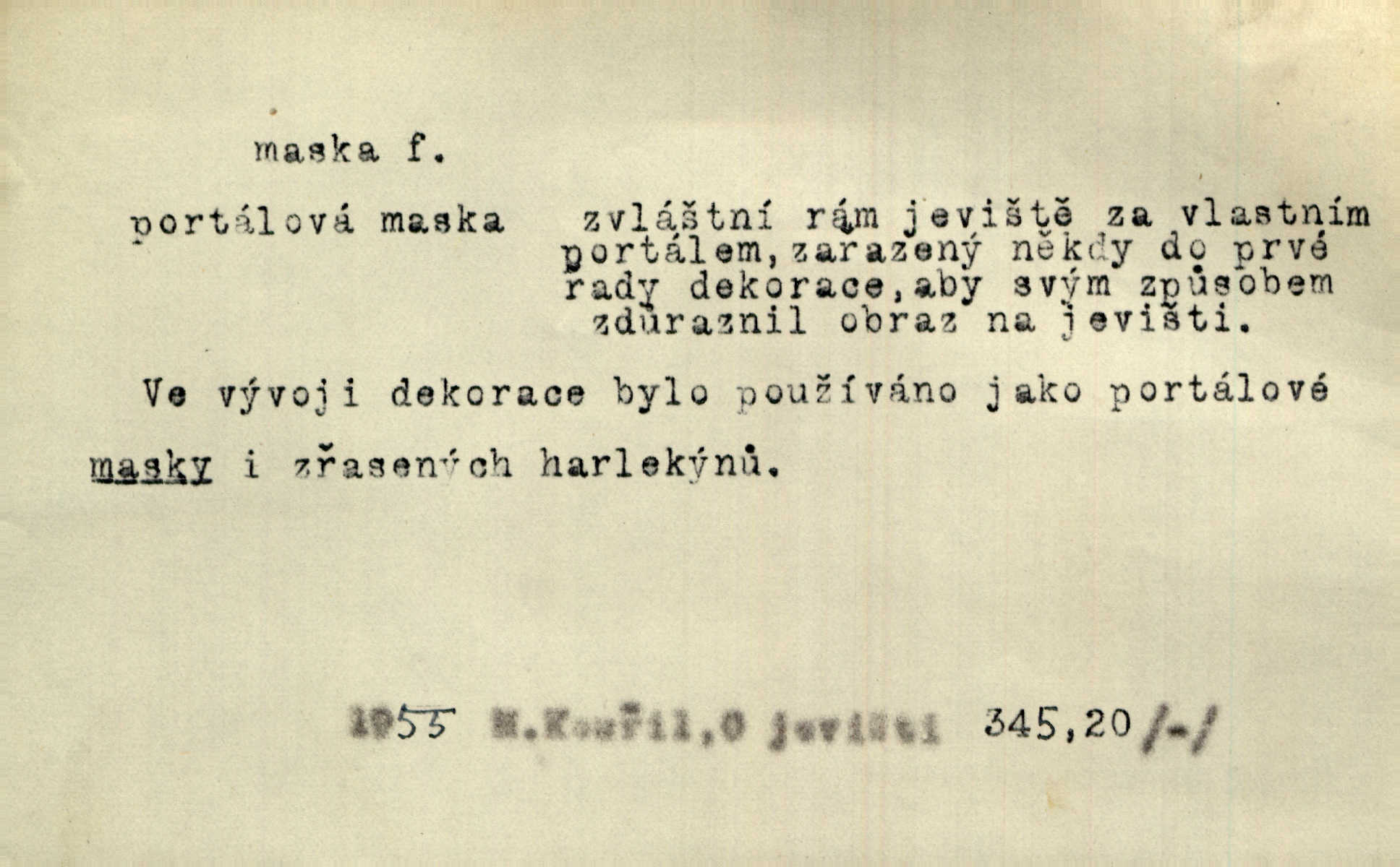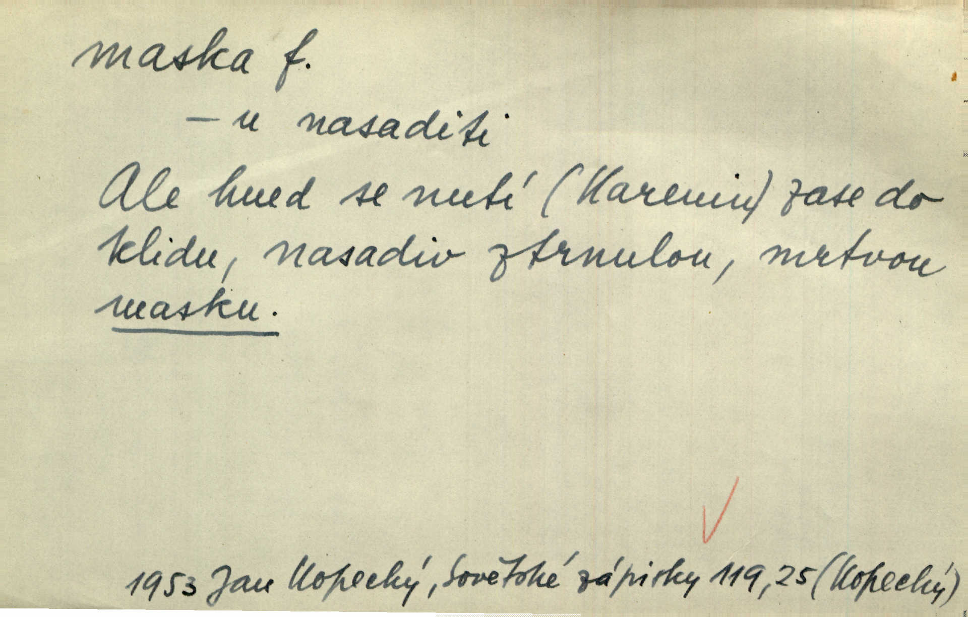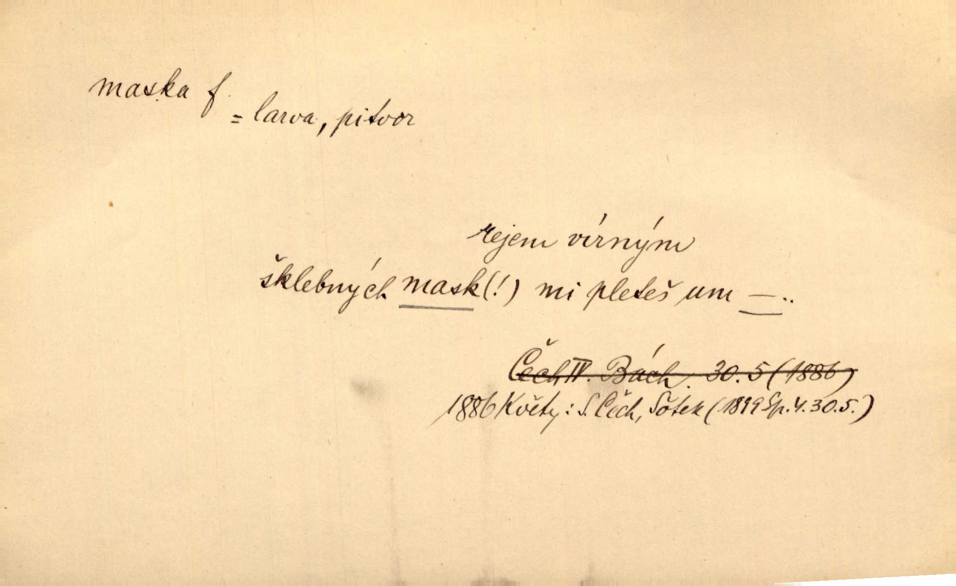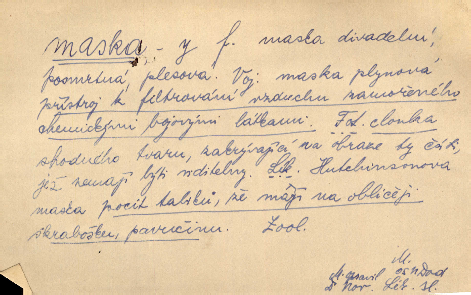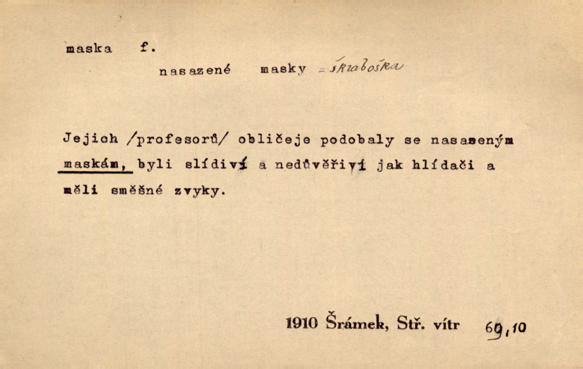- maska, -y f. (gen. pl. masek) dutá plastická forma nošená na obličeji, aby změnila jeho vzhled, larva, škraboška. Janek, přestrojený za čerta v obrácený kožich z černé ovčí vlny, s neuvěřitelnou maskou v obličeji poděsil celou Habrůvku. A. Mrš. Jejich [profesorů] obličeje podobaly se nasazeným maskám. Šrám. Voj. plynová maska přístroj k filtrování vzduchu zamořeného bojovými chemickými látkami nebo jinými otravnými plyny. Lék. maska při narkotisování. Sport. šermířská maska. D Lék. Hutchinsonova maska pocit tabiků, jako by měli na obličeji škrabošku, pavučinu. D celkové přestrojení, zakuklení n. osoba takto přestrojená. Viděla tu [na Žofíně] vystupovati na sta účastníků ve fantastických maskách. Herrm. Roznemohla se paní majorová. Černá maska jakási, muž v dominu, vnikl v noci do jejího příbytku a škrtil ji, ale neuškrtil. R. Svob. Maska divadelní vnějškové založení představované postavy, zvláště charakterisační úprava obličeje hercova. D Výtv. posmrtná maska sádrový n. voskový odlitek tváře zemřelého. D vnější tvářnost, vnější výraz, zvláště předstíraný, n. předstírání, přetvářka sama. Všechno v okolí, hory, doly, města, lidé bylo ryze bajuvarské, zhyzděné pouze vlašskou maskou. Lier. Kdo tvrdí, že na př. náboženství není než „přestrojení“ nebo „maska“ poměrů hospodářských, musil by přece náboženský cit a náboženské idee analysovat. Mas. Podávala si [děvčata] ruce a tiskla s takovou vroucností, která jest jim jen maskou a zvykem. R. Svob. Dovedla vše obratně zakrýti maskou soucitu zdáním. Maj. Prohlášení o německé politice jsou pouze maskou, klamem, způsobeným příkazy taktiky. Pek. Odhodil masku hrubosti a furiantství, nepřetvařoval se, ale změkl jako vosk. Baar. Stroj. maska (u osobních automobilů) zařízení, které má zlepšit vzhled předku vozu a také chránit chladič před poškozením. D Fot. rámeček nepropouštějící světlo, užívaný při kopírování k dosažení vhodného tvaru obrázku. Zool. zvlášť upravený spodní pysk u nymf našich vážek, kryjící zespodu ústní orgány.