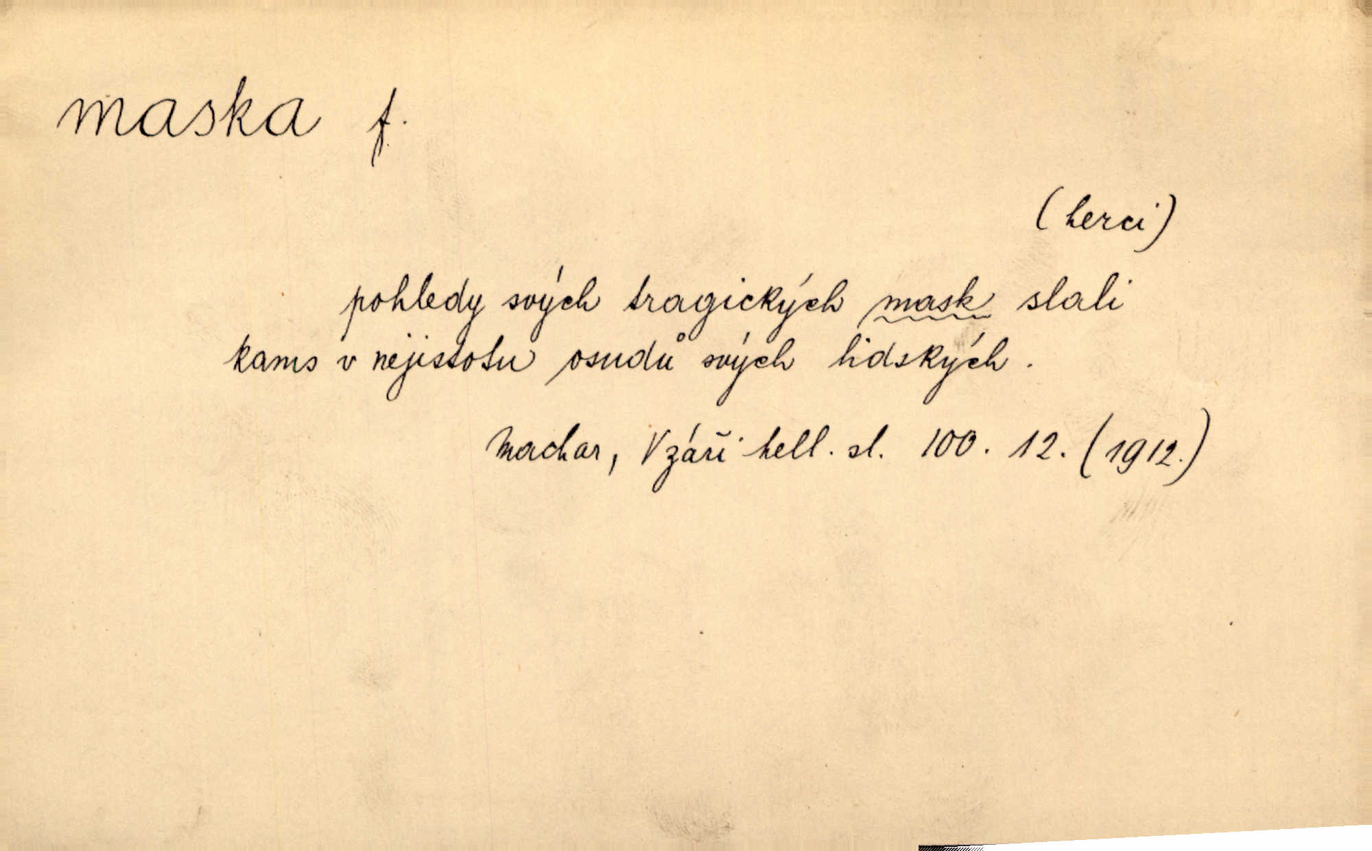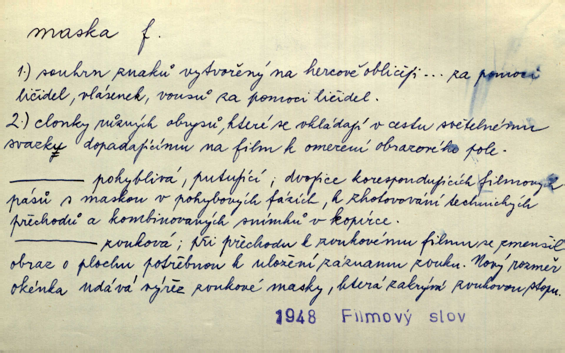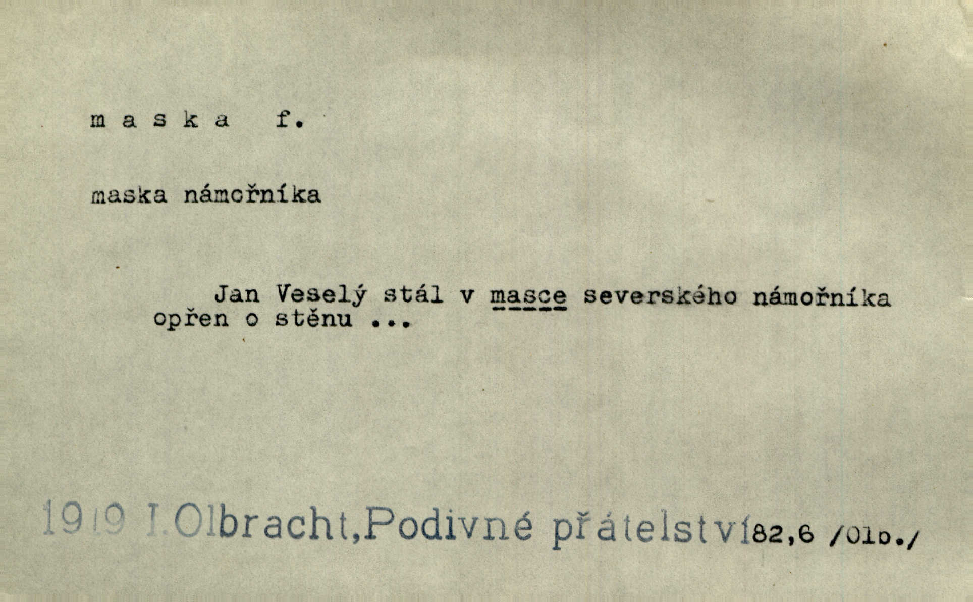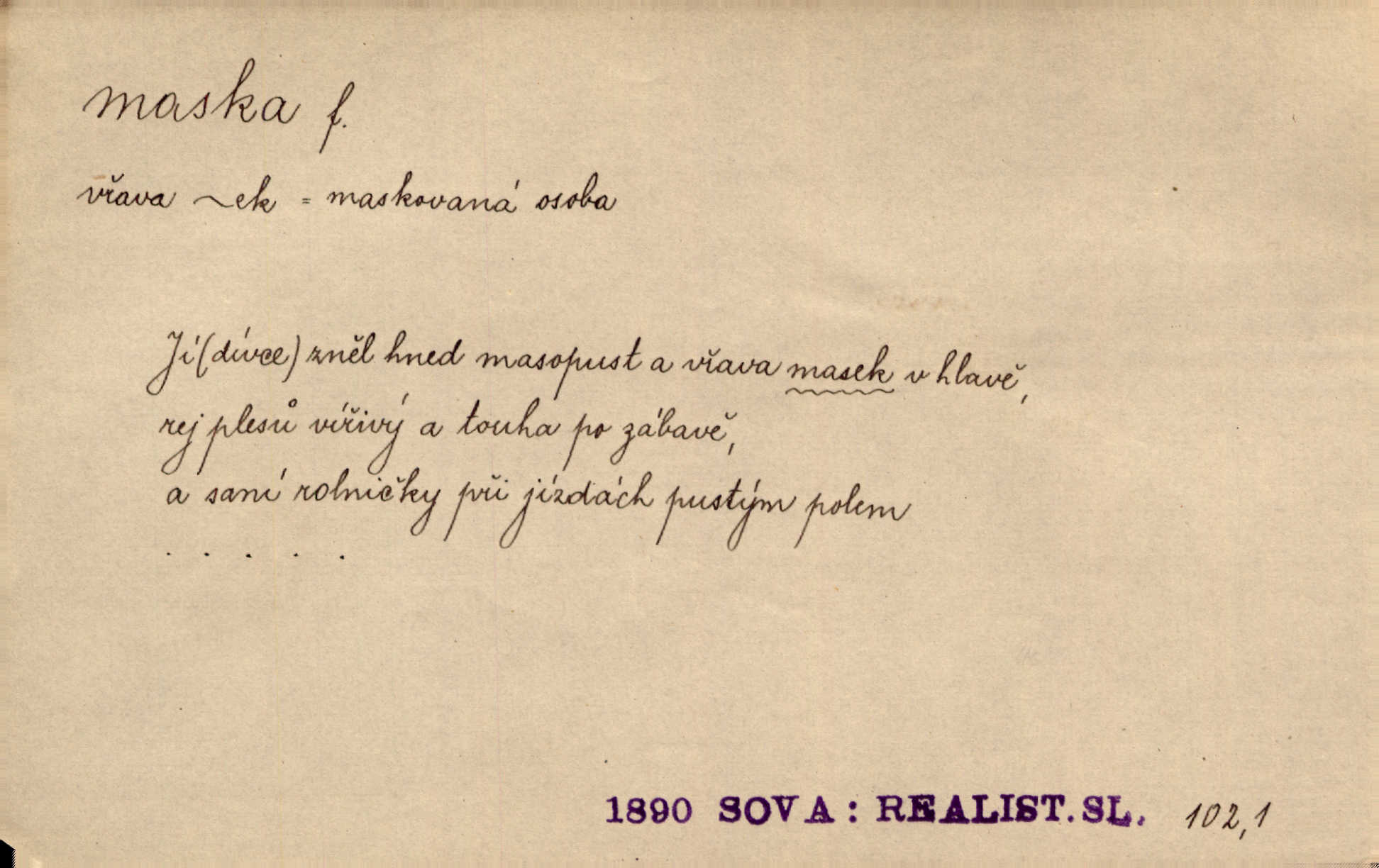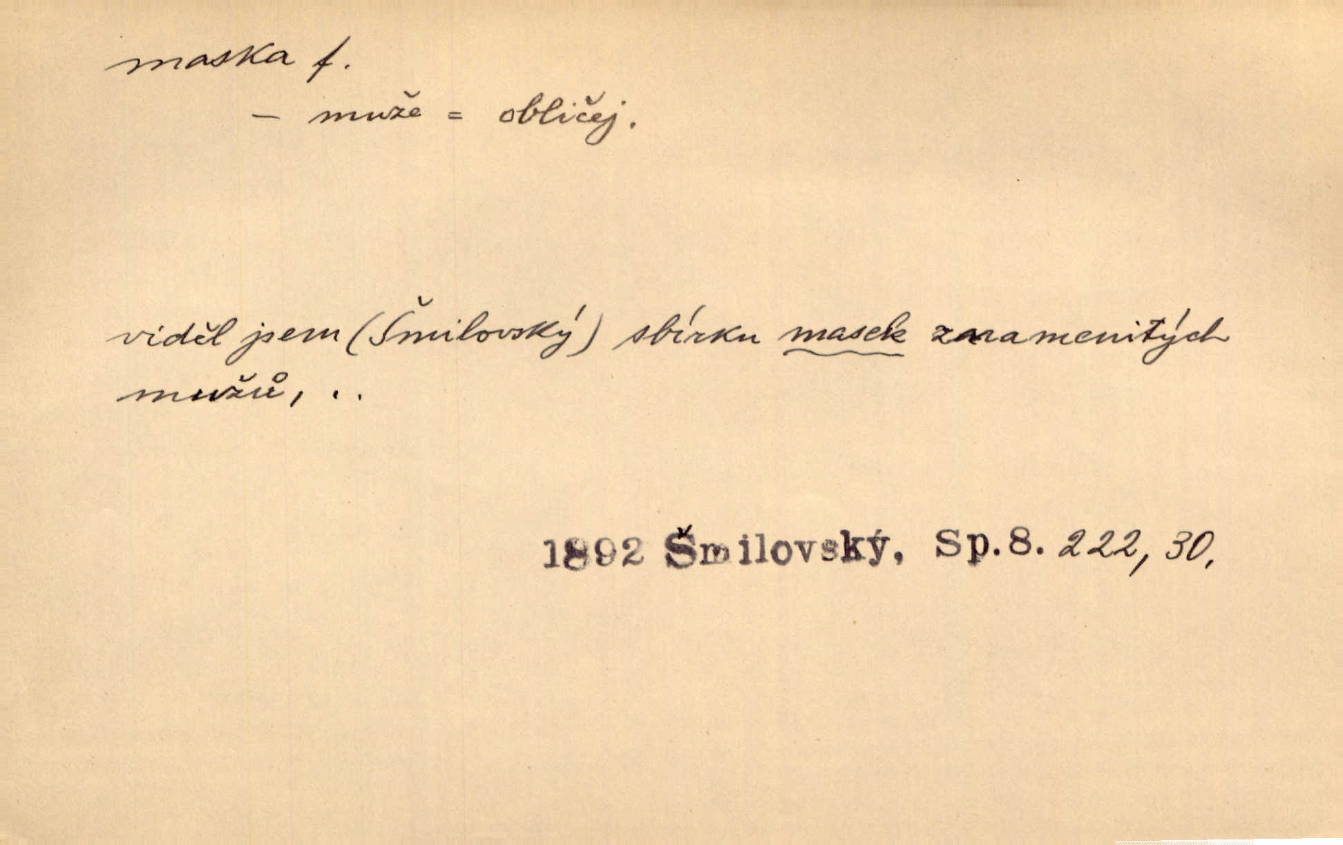 - maska, -y f. (gen. pl. masek) dutá plastická forma nošená na obličeji, aby změnila jeho vzhled, larva, škraboška. Janek, přestrojený za čerta v obrácený kožich z černé ovčí vlny, s neuvěřitelnou maskou v obličeji poděsil celou Habrůvku. A. Mrš. Jejich [profesorů] obličeje podobaly se nasazeným maskám. Šrám. Voj. plynová maska přístroj k filtrování vzduchu zamořeného bojovými chemickými látkami nebo jinými otravnými plyny. Lék. maska při narkotisování. Sport. šermířská maska. D Lék. Hutchinsonova maska pocit tabiků, jako by měli na obličeji škrabošku, pavučinu. D celkové přestrojení, zakuklení n. osoba takto přestrojená. Viděla tu [na Žofíně] vystupovati na sta účastníků ve fantastických maskách. Herrm. Roznemohla se paní majorová. Černá maska jakási, muž v dominu, vnikl v noci do jejího příbytku a škrtil ji, ale neuškrtil. R. Svob. Maska divadelní vnějškové založení představované postavy, zvláště charakterisační úprava obličeje hercova. D Výtv. posmrtná maska sádrový n. voskový odlitek tváře zemřelého. D vnější tvářnost, vnější výraz, zvláště předstíraný, n. předstírání, přetvářka sama. Všechno v okolí, hory, doly, města, lidé bylo ryze bajuvarské, zhyzděné pouze vlašskou maskou. Lier. Kdo tvrdí, že na př. náboženství není než „přestrojení“ nebo „maska“ poměrů hospodářských, musil by přece náboženský cit a náboženské idee analysovat. Mas. Podávala si [děvčata] ruce a tiskla s takovou vroucností, která jest jim jen maskou a zvykem. R. Svob. Dovedla vše obratně zakrýti maskou soucitu zdáním. Maj. Prohlášení o německé politice jsou pouze maskou, klamem, způsobeným příkazy taktiky. Pek. Odhodil masku hrubosti a furiantství, nepřetvařoval se, ale změkl jako vosk. Baar. Stroj. maska (u osobních automobilů) zařízení, které má zlepšit vzhled předku vozu a také chránit chladič před poškozením. D Fot. rámeček nepropouštějící světlo, užívaný při kopírování k dosažení vhodného tvaru obrázku. Zool. zvlášť upravený spodní pysk u nymf našich vážek, kryjící zespodu ústní orgány.
