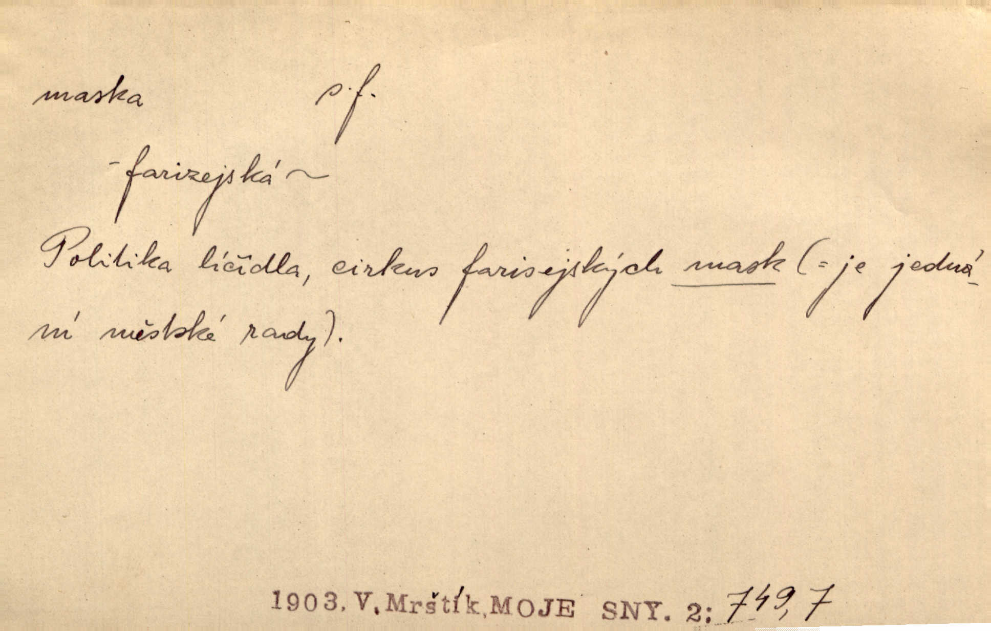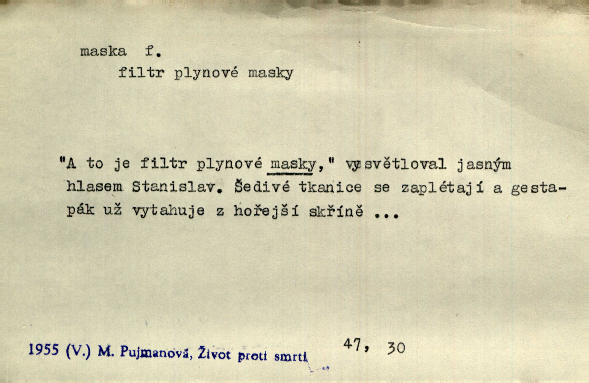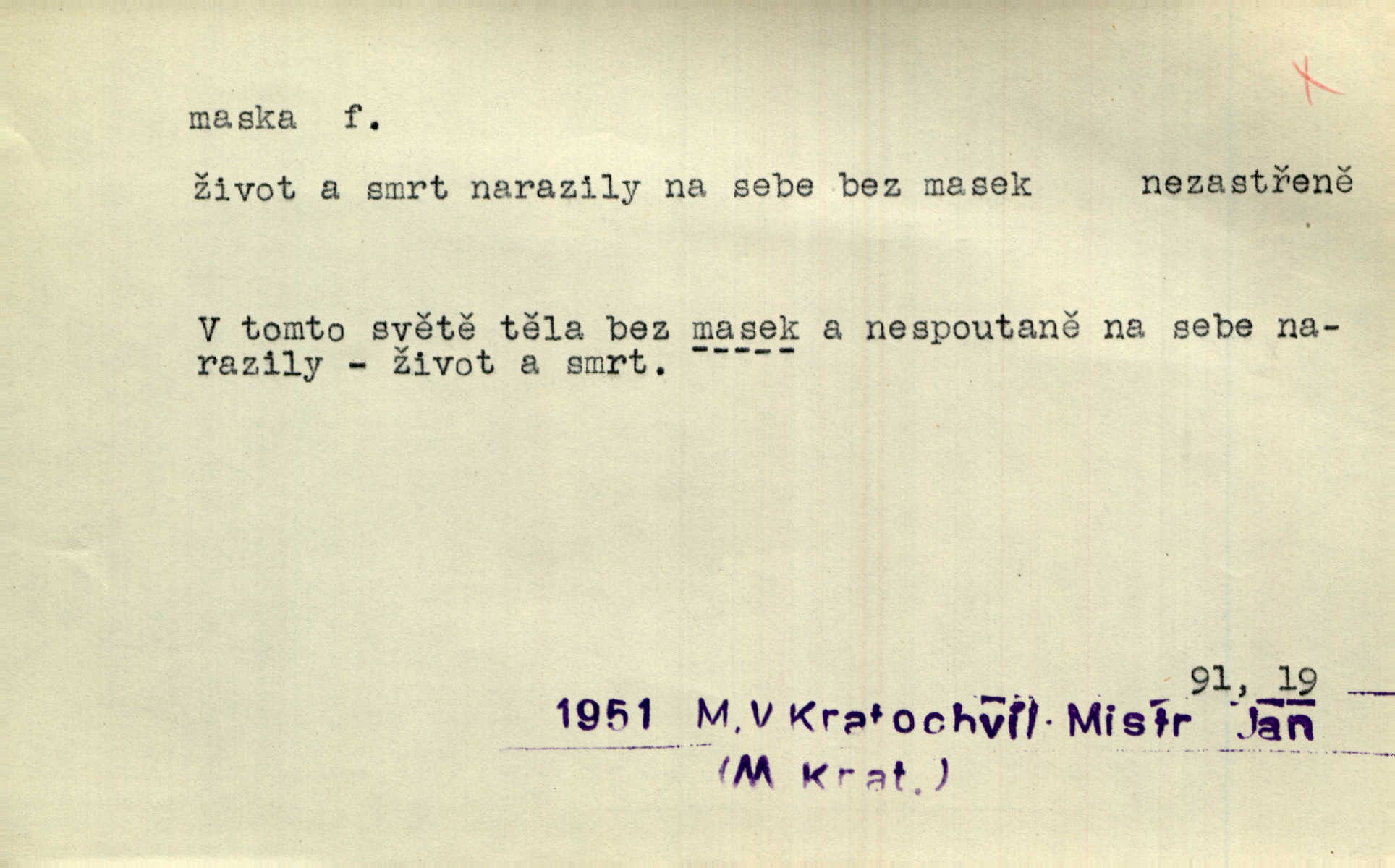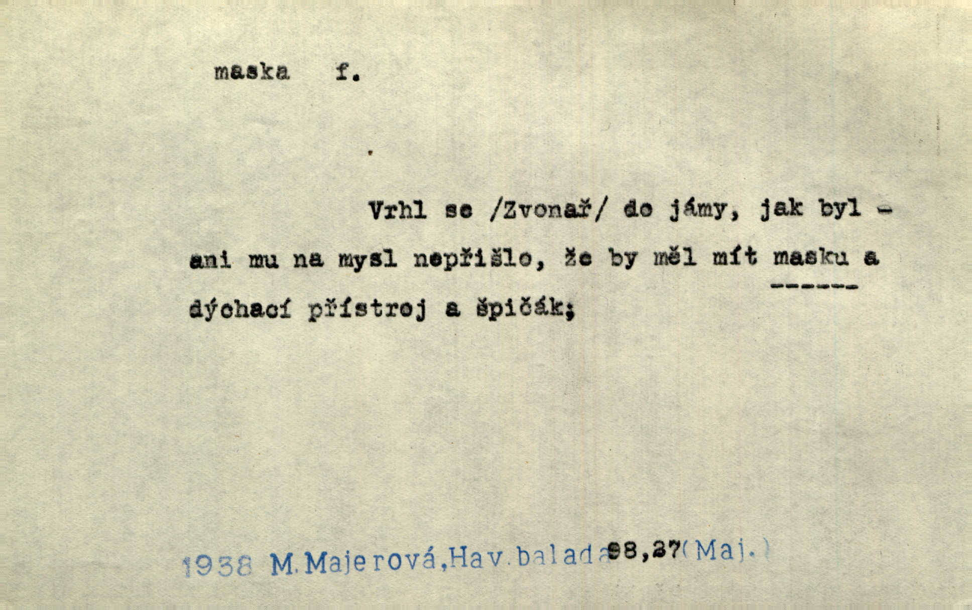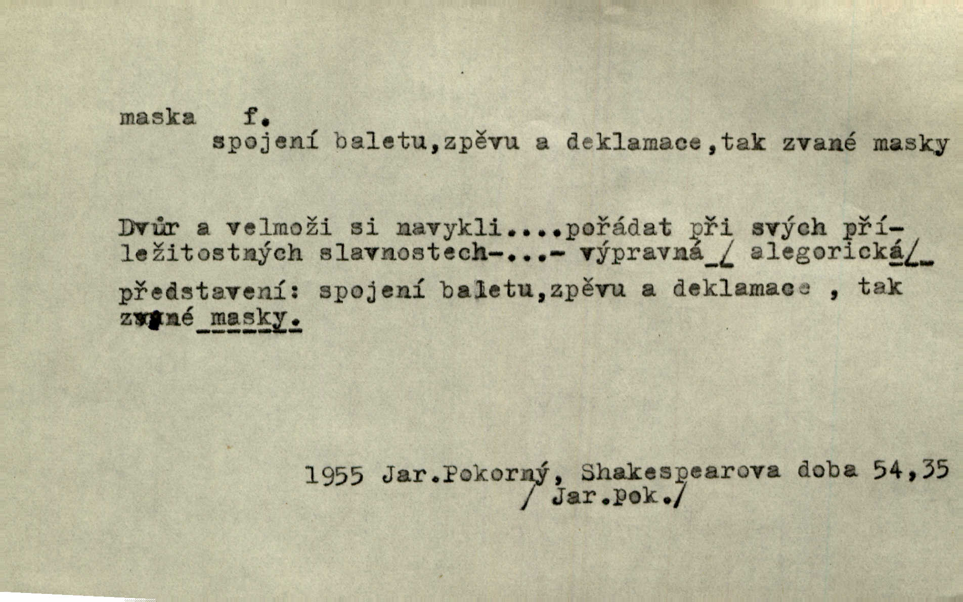 - maska, -y f. (gen. pl. masek) dutá plastická forma nošená na obličeji, aby změnila jeho vzhled, larva, škraboška. Janek, přestrojený za čerta v obrácený kožich z černé ovčí vlny, s neuvěřitelnou maskou v obličeji poděsil celou Habrůvku. A. Mrš. Jejich [profesorů] obličeje podobaly se nasazeným maskám. Šrám. Voj. plynová maska přístroj k filtrování vzduchu zamořeného bojovými chemickými látkami nebo jinými otravnými plyny. Lék. maska při narkotisování. Sport. šermířská maska. D Lék. Hutchinsonova maska pocit tabiků, jako by měli na obličeji škrabošku, pavučinu. D celkové přestrojení, zakuklení n. osoba takto přestrojená. Viděla tu [na Žofíně] vystupovati na sta účastníků ve fantastických maskách. Herrm. Roznemohla se paní majorová. Černá maska jakási, muž v dominu, vnikl v noci do jejího příbytku a škrtil ji, ale neuškrtil. R. Svob. Maska divadelní vnějškové založení představované postavy, zvláště charakterisační úprava obličeje hercova. D Výtv. posmrtná maska sádrový n. voskový odlitek tváře zemřelého. D vnější tvářnost, vnější výraz, zvláště předstíraný, n. předstírání, přetvářka sama. Všechno v okolí, hory, doly, města, lidé bylo ryze bajuvarské, zhyzděné pouze vlašskou maskou. Lier. Kdo tvrdí, že na př. náboženství není než „přestrojení“ nebo „maska“ poměrů hospodářských, musil by přece náboženský cit a náboženské idee analysovat. Mas. Podávala si [děvčata] ruce a tiskla s takovou vroucností, která jest jim jen maskou a zvykem. R. Svob. Dovedla vše obratně zakrýti maskou soucitu zdáním. Maj. Prohlášení o německé politice jsou pouze maskou, klamem, způsobeným příkazy taktiky. Pek. Odhodil masku hrubosti a furiantství, nepřetvařoval se, ale změkl jako vosk. Baar. Stroj. maska (u osobních automobilů) zařízení, které má zlepšit vzhled předku vozu a také chránit chladič před poškozením. D Fot. rámeček nepropouštějící světlo, užívaný při kopírování k dosažení vhodného tvaru obrázku. Zool. zvlášť upravený spodní pysk u nymf našich vážek, kryjící zespodu ústní orgány.