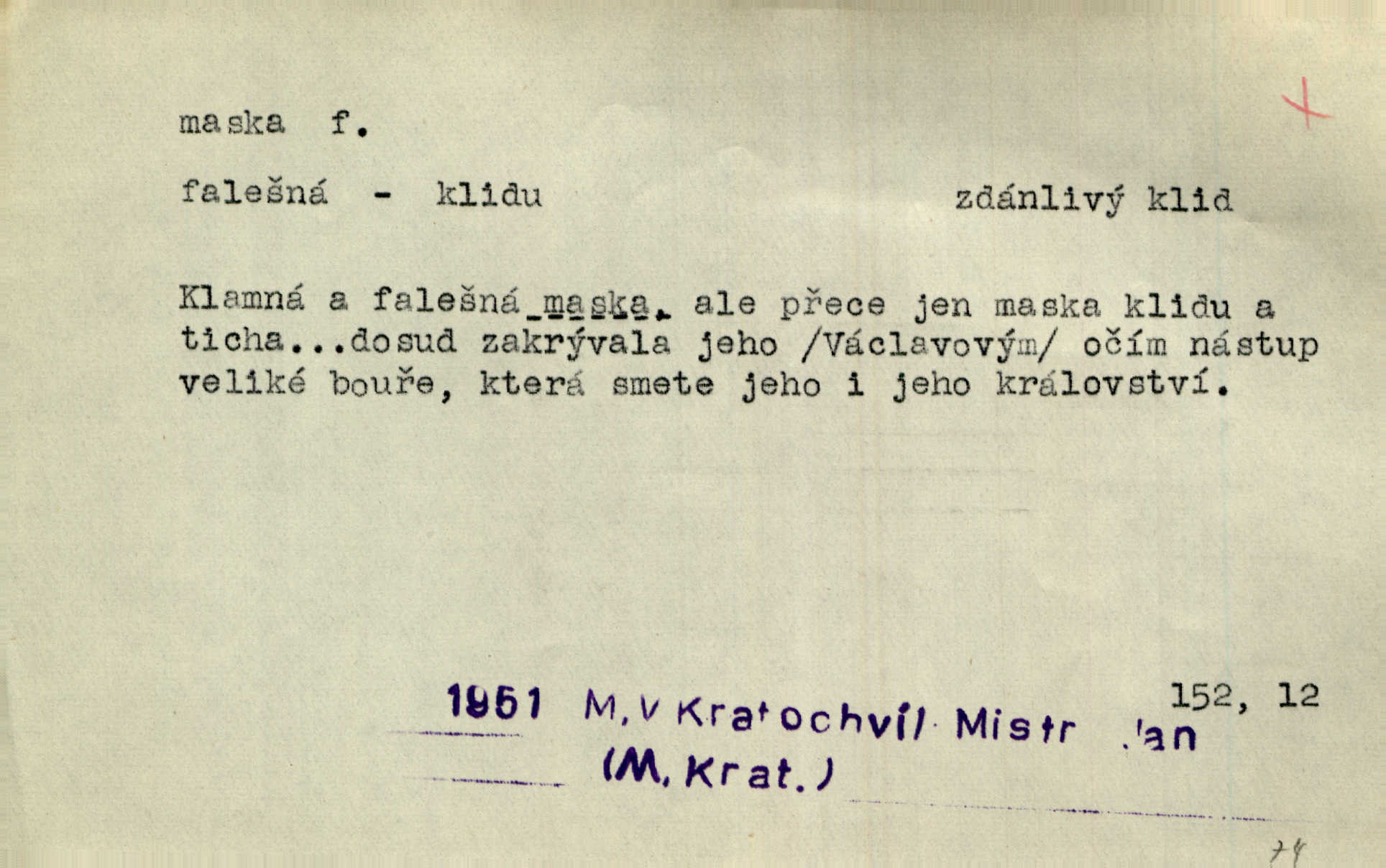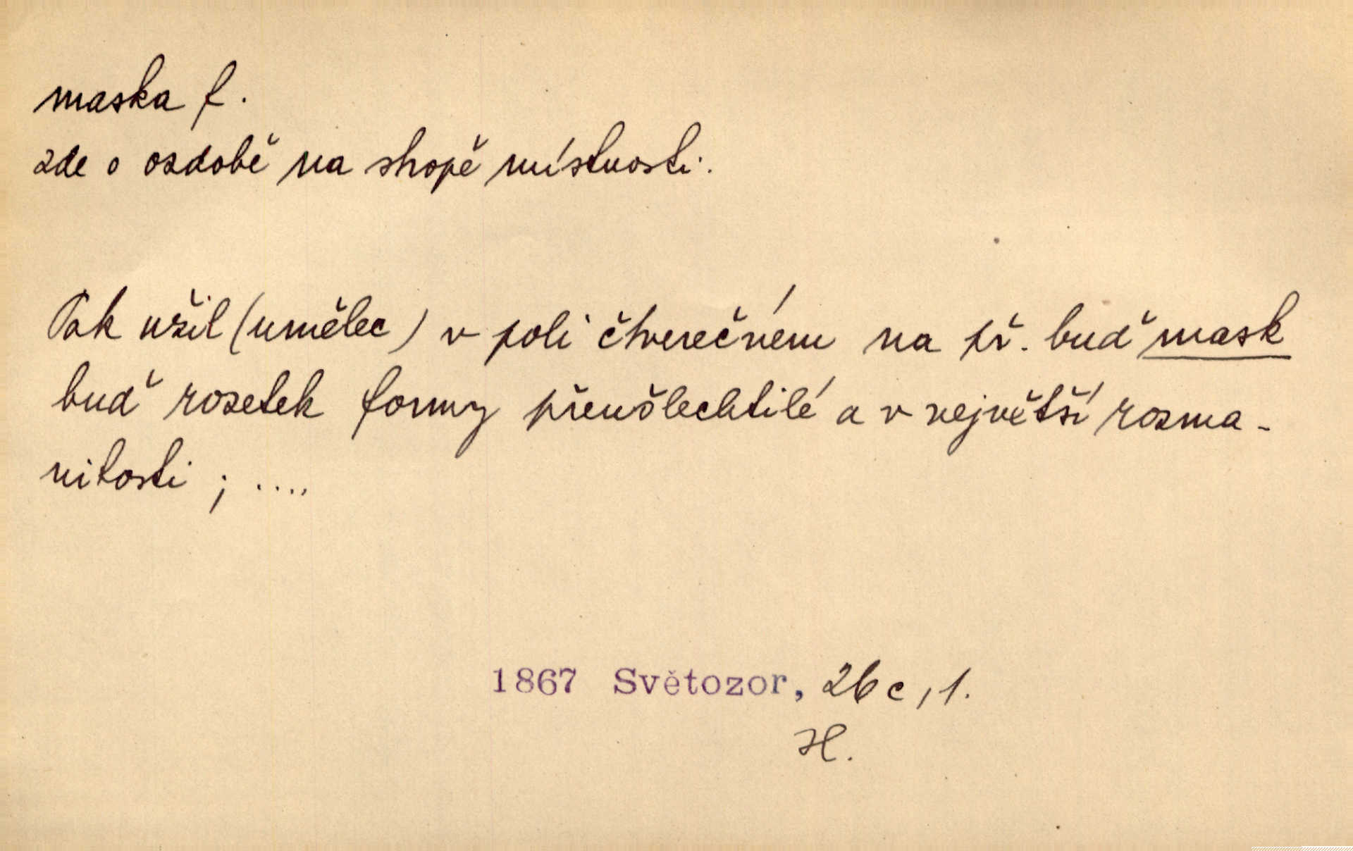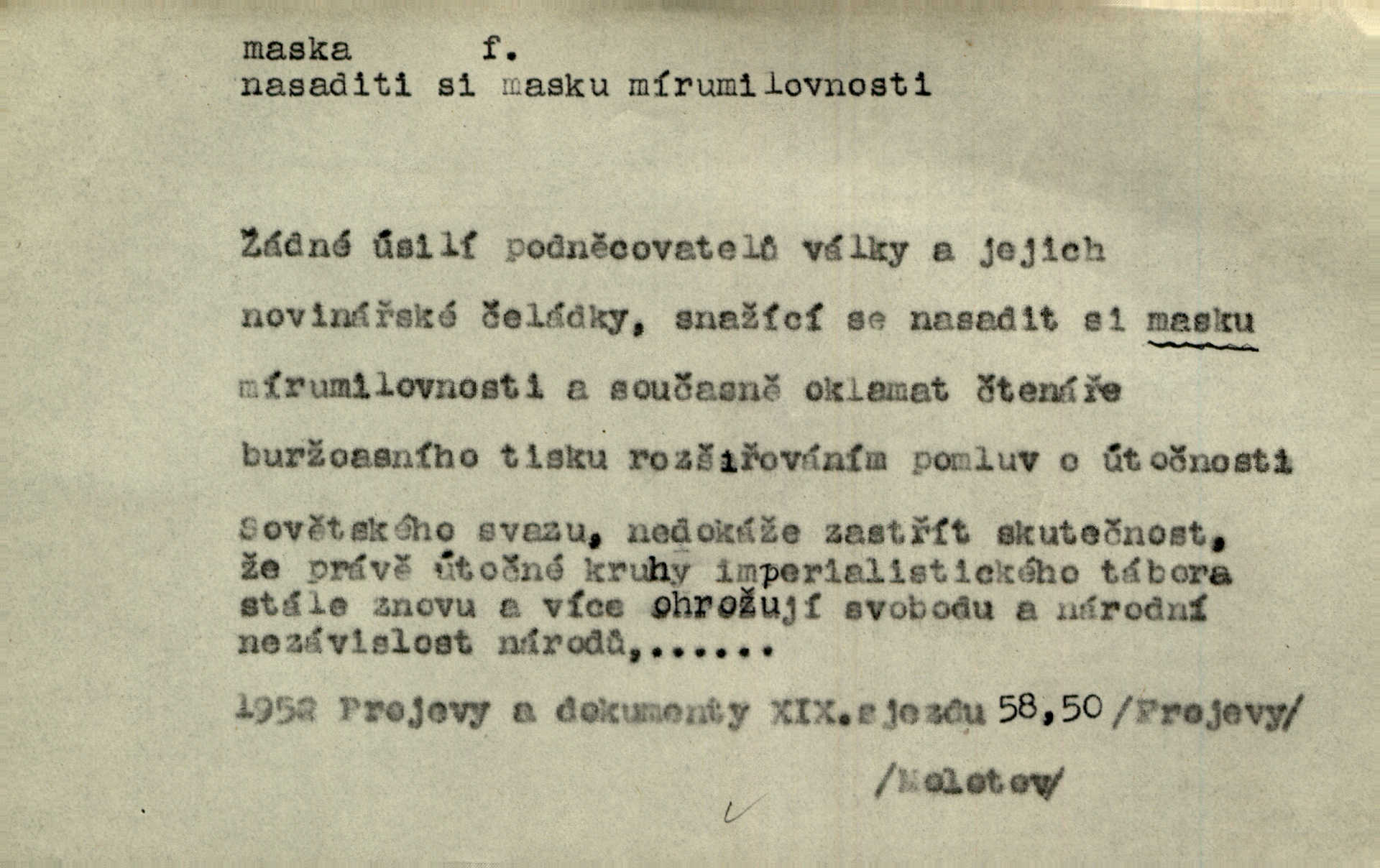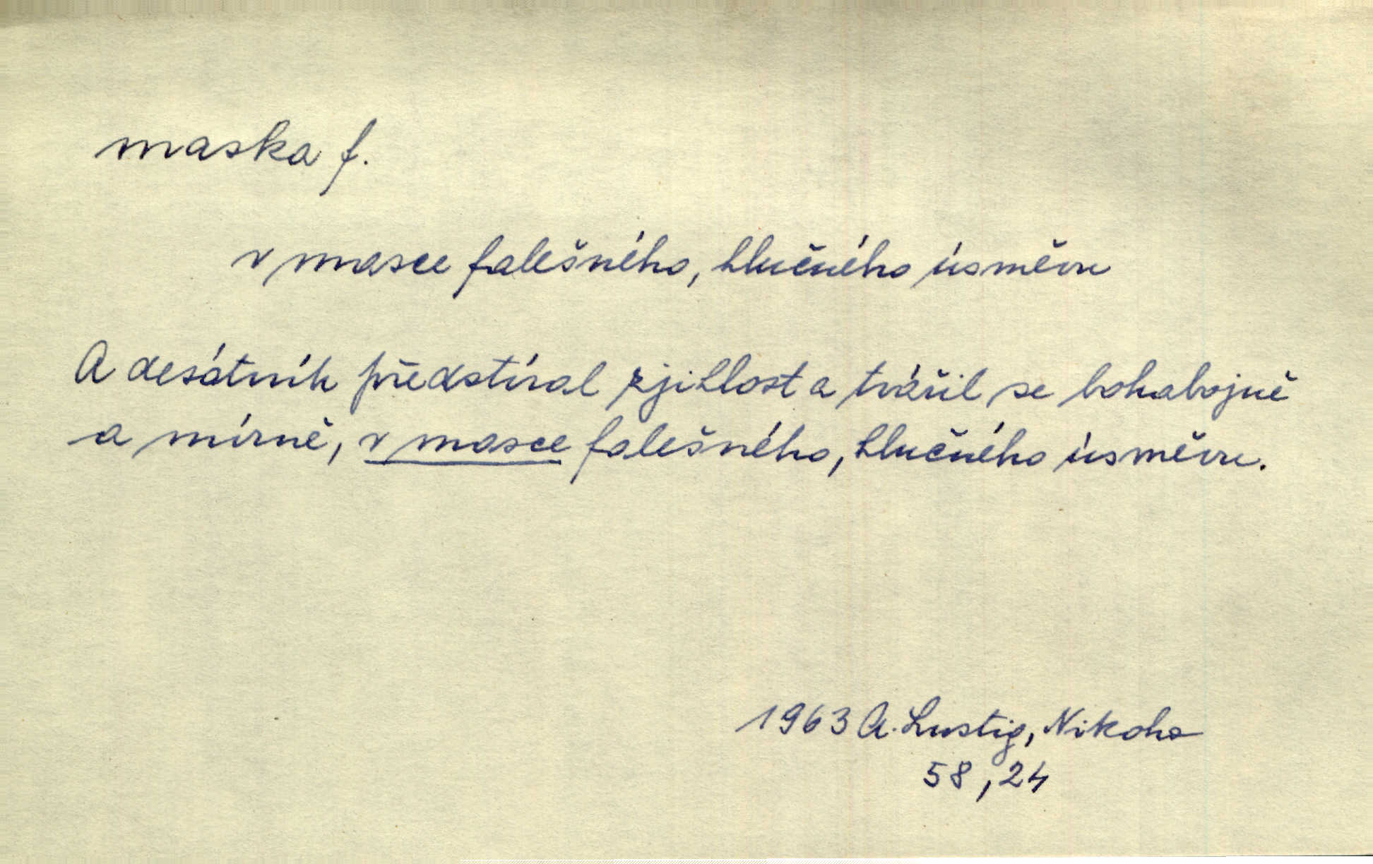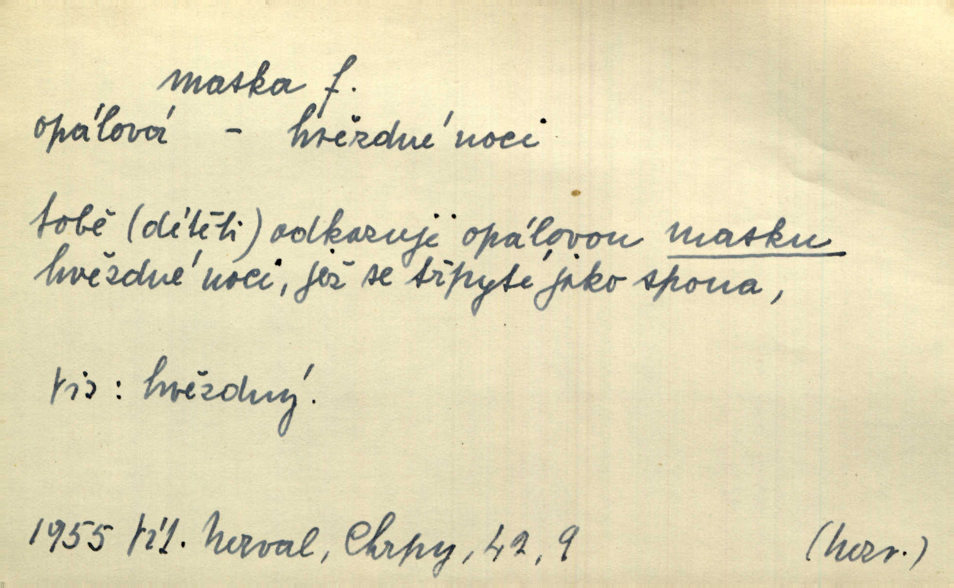 - maska, -y f. (gen. pl. masek) dutá plastická forma nošená na obličeji, aby změnila jeho vzhled, larva, škraboška. Janek, přestrojený za čerta v obrácený kožich z černé ovčí vlny, s neuvěřitelnou maskou v obličeji poděsil celou Habrůvku. A. Mrš. Jejich [profesorů] obličeje podobaly se nasazeným maskám. Šrám. Voj. plynová maska přístroj k filtrování vzduchu zamořeného bojovými chemickými látkami nebo jinými otravnými plyny. Lék. maska při narkotisování. Sport. šermířská maska. D Lék. Hutchinsonova maska pocit tabiků, jako by měli na obličeji škrabošku, pavučinu. D celkové přestrojení, zakuklení n. osoba takto přestrojená. Viděla tu [na Žofíně] vystupovati na sta účastníků ve fantastických maskách. Herrm. Roznemohla se paní majorová. Černá maska jakási, muž v dominu, vnikl v noci do jejího příbytku a škrtil ji, ale neuškrtil. R. Svob. Maska divadelní vnějškové založení představované postavy, zvláště charakterisační úprava obličeje hercova. D Výtv. posmrtná maska sádrový n. voskový odlitek tváře zemřelého. D vnější tvářnost, vnější výraz, zvláště předstíraný, n. předstírání, přetvářka sama. Všechno v okolí, hory, doly, města, lidé bylo ryze bajuvarské, zhyzděné pouze vlašskou maskou. Lier. Kdo tvrdí, že na př. náboženství není než „přestrojení“ nebo „maska“ poměrů hospodářských, musil by přece náboženský cit a náboženské idee analysovat. Mas. Podávala si [děvčata] ruce a tiskla s takovou vroucností, která jest jim jen maskou a zvykem. R. Svob. Dovedla vše obratně zakrýti maskou soucitu zdáním. Maj. Prohlášení o německé politice jsou pouze maskou, klamem, způsobeným příkazy taktiky. Pek. Odhodil masku hrubosti a furiantství, nepřetvařoval se, ale změkl jako vosk. Baar. Stroj. maska (u osobních automobilů) zařízení, které má zlepšit vzhled předku vozu a také chránit chladič před poškozením. D Fot. rámeček nepropouštějící světlo, užívaný při kopírování k dosažení vhodného tvaru obrázku. Zool. zvlášť upravený spodní pysk u nymf našich vážek, kryjící zespodu ústní orgány.