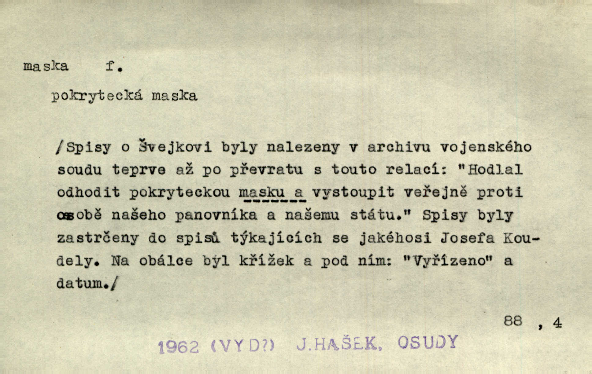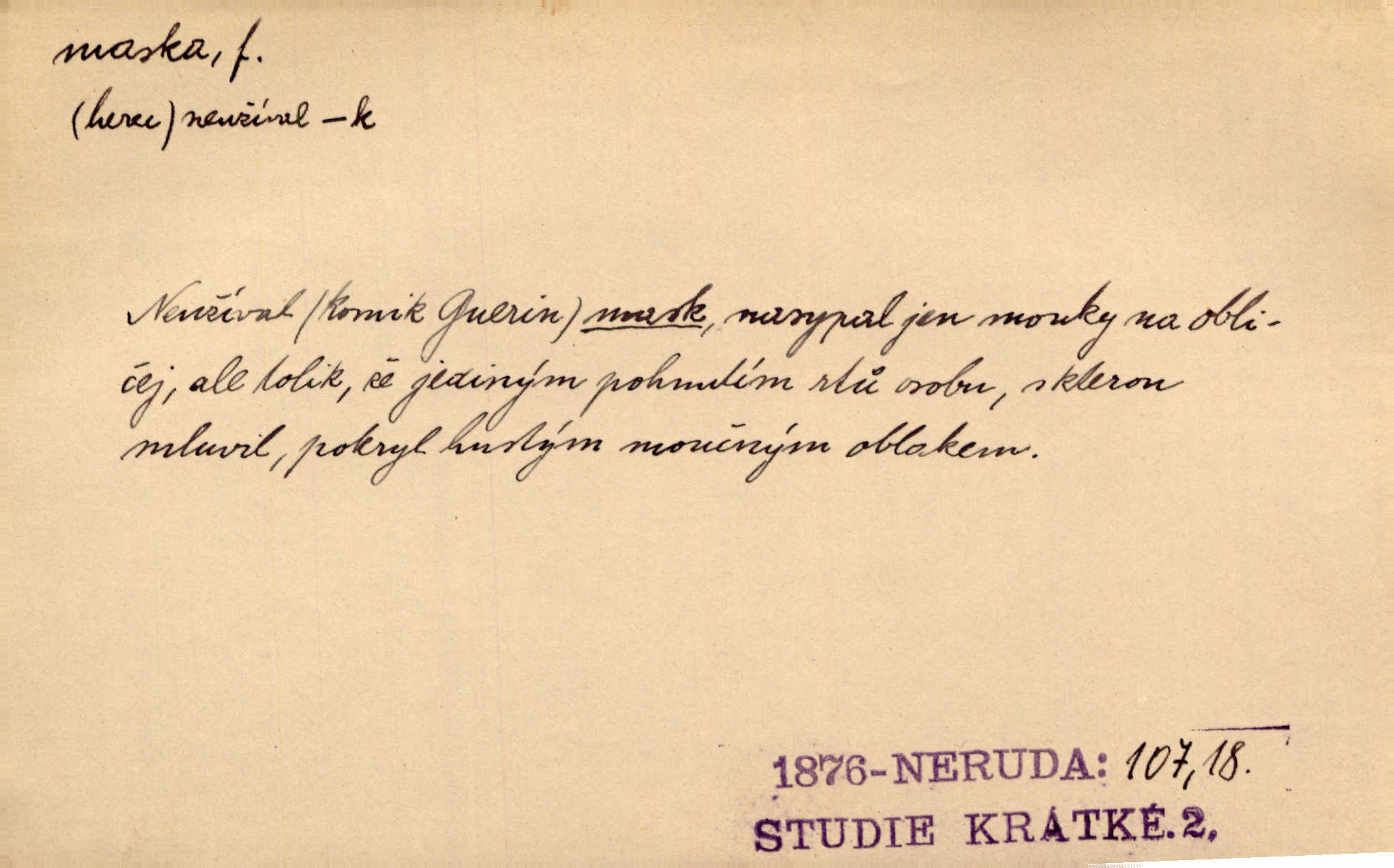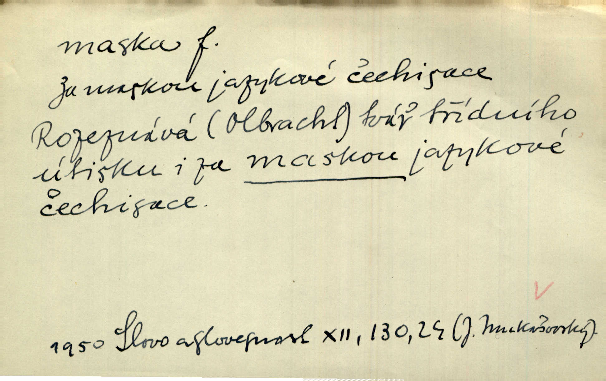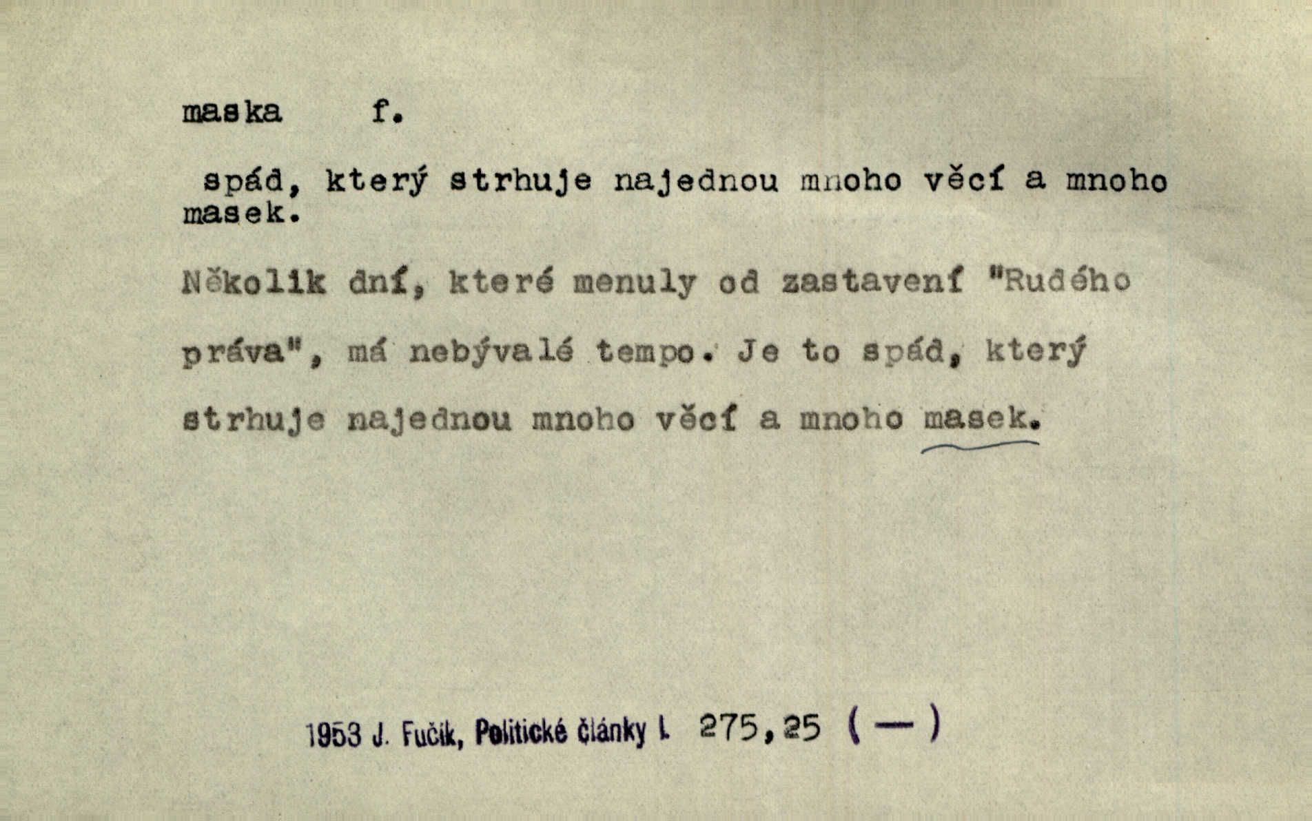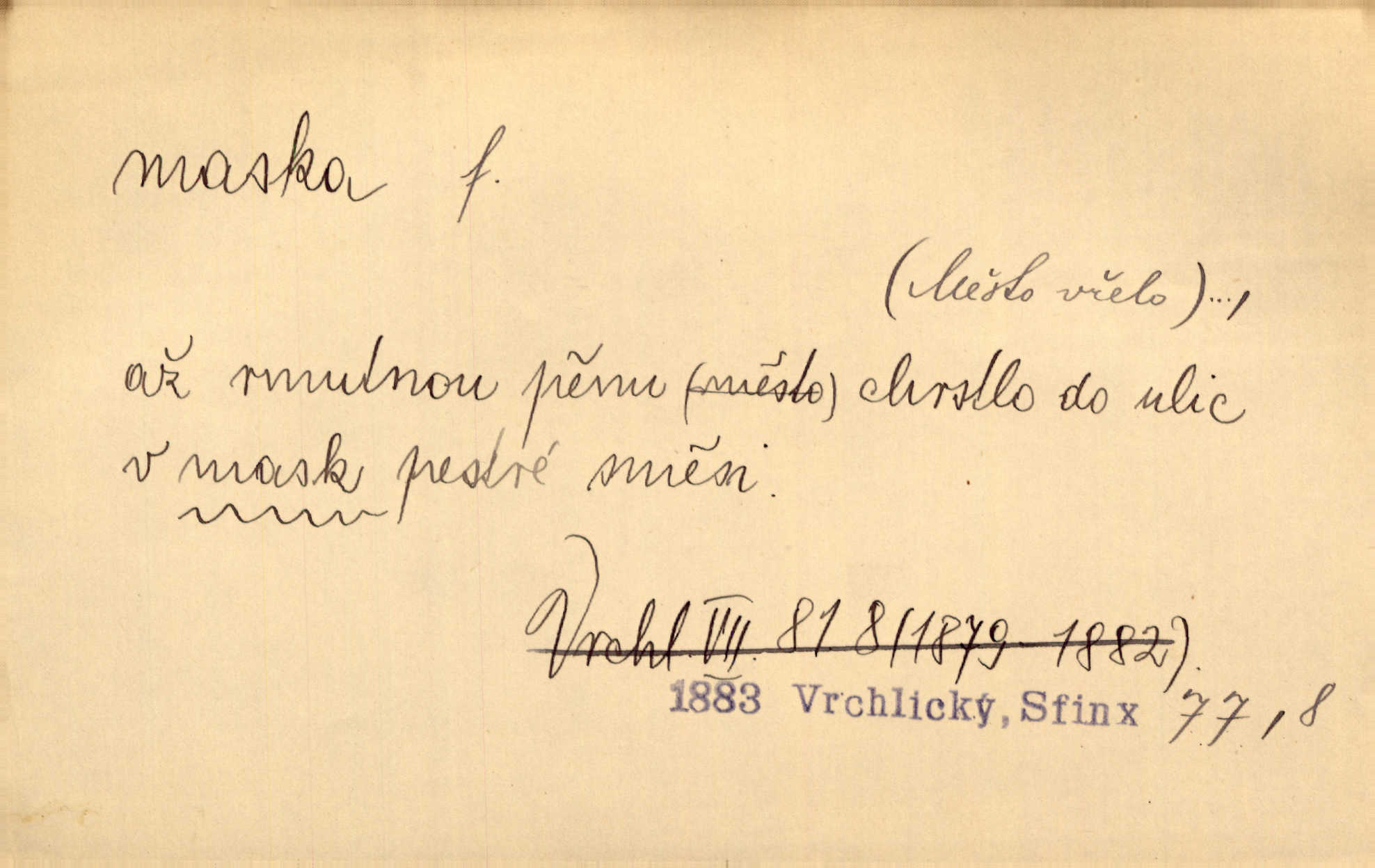 - maska, -y f. (gen. pl. masek) dutá plastická forma nošená na obličeji, aby změnila jeho vzhled, larva, škraboška. Janek, přestrojený za čerta v obrácený kožich z černé ovčí vlny, s neuvěřitelnou maskou v obličeji poděsil celou Habrůvku. A. Mrš. Jejich [profesorů] obličeje podobaly se nasazeným maskám. Šrám. Voj. plynová maska přístroj k filtrování vzduchu zamořeného bojovými chemickými látkami nebo jinými otravnými plyny. Lék. maska při narkotisování. Sport. šermířská maska. D Lék. Hutchinsonova maska pocit tabiků, jako by měli na obličeji škrabošku, pavučinu. D celkové přestrojení, zakuklení n. osoba takto přestrojená. Viděla tu [na Žofíně] vystupovati na sta účastníků ve fantastických maskách. Herrm. Roznemohla se paní majorová. Černá maska jakási, muž v dominu, vnikl v noci do jejího příbytku a škrtil ji, ale neuškrtil. R. Svob. Maska divadelní vnějškové založení představované postavy, zvláště charakterisační úprava obličeje hercova. D Výtv. posmrtná maska sádrový n. voskový odlitek tváře zemřelého. D vnější tvářnost, vnější výraz, zvláště předstíraný, n. předstírání, přetvářka sama. Všechno v okolí, hory, doly, města, lidé bylo ryze bajuvarské, zhyzděné pouze vlašskou maskou. Lier. Kdo tvrdí, že na př. náboženství není než „přestrojení“ nebo „maska“ poměrů hospodářských, musil by přece náboženský cit a náboženské idee analysovat. Mas. Podávala si [děvčata] ruce a tiskla s takovou vroucností, která jest jim jen maskou a zvykem. R. Svob. Dovedla vše obratně zakrýti maskou soucitu zdáním. Maj. Prohlášení o německé politice jsou pouze maskou, klamem, způsobeným příkazy taktiky. Pek. Odhodil masku hrubosti a furiantství, nepřetvařoval se, ale změkl jako vosk. Baar. Stroj. maska (u osobních automobilů) zařízení, které má zlepšit vzhled předku vozu a také chránit chladič před poškozením. D Fot. rámeček nepropouštějící světlo, užívaný při kopírování k dosažení vhodného tvaru obrázku. Zool. zvlášť upravený spodní pysk u nymf našich vážek, kryjící zespodu ústní orgány.