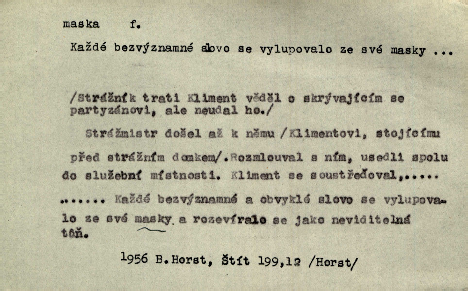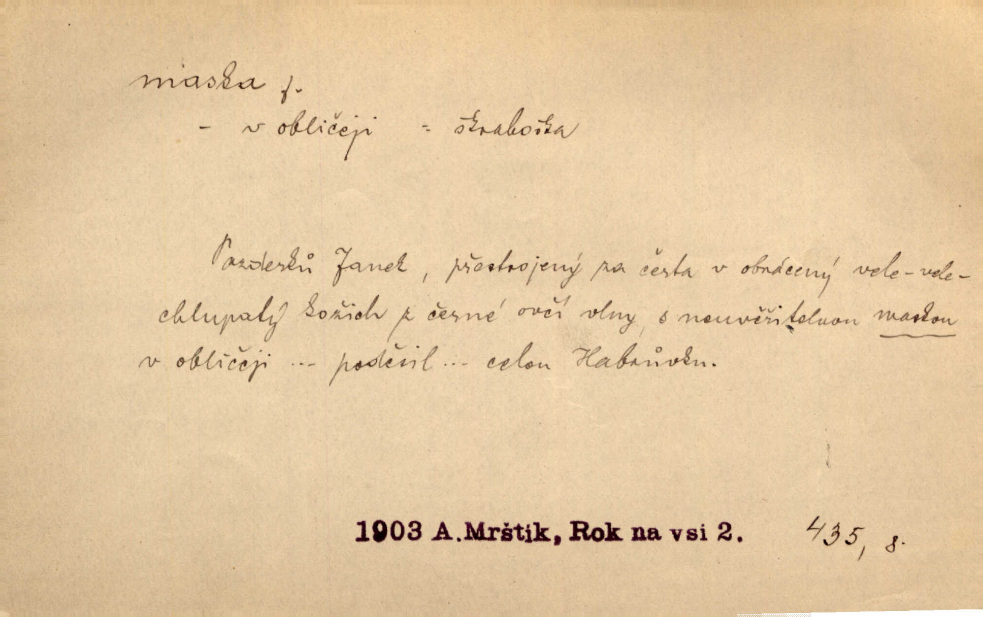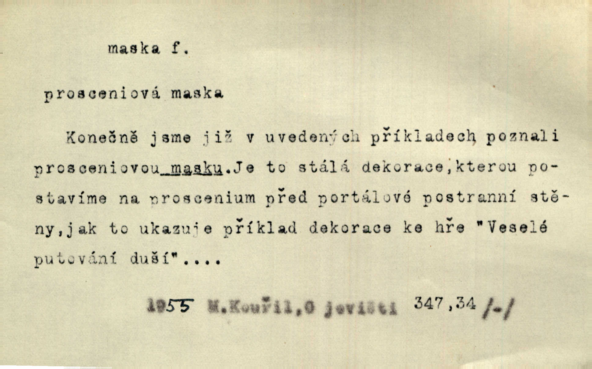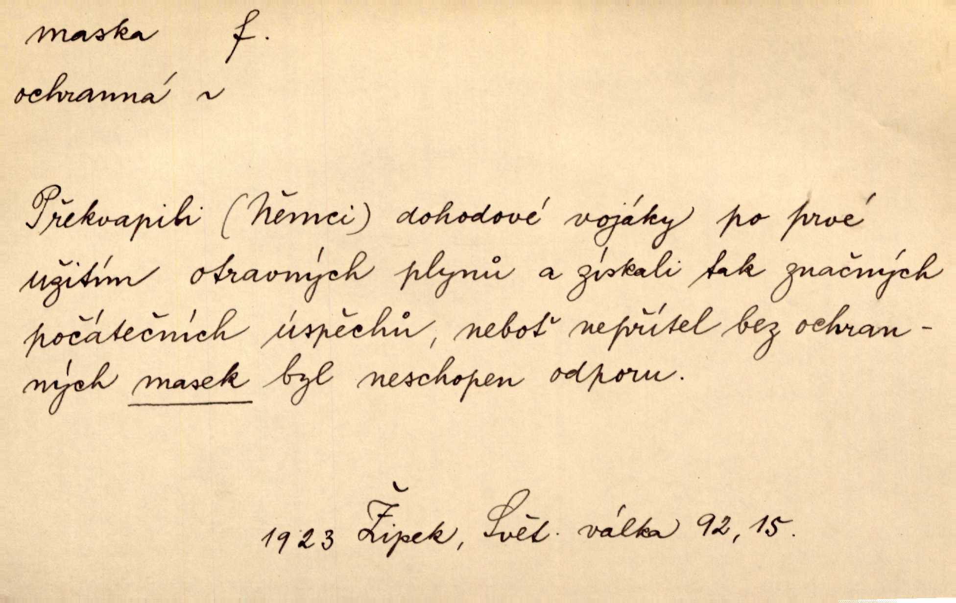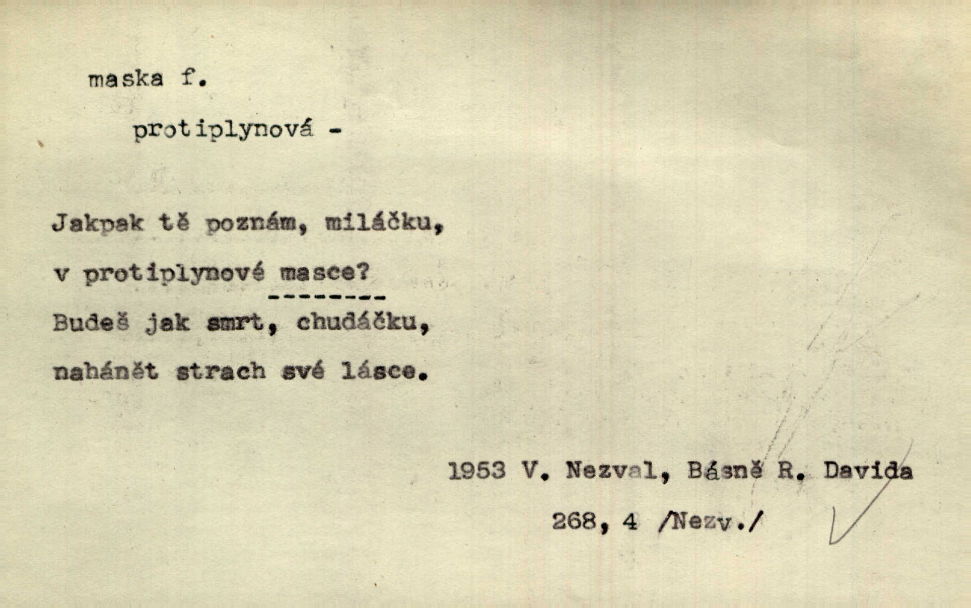 - maska, -y f. (gen. pl. masek) dutá plastická forma nošená na obličeji, aby změnila jeho vzhled, larva, škraboška. Janek, přestrojený za čerta v obrácený kožich z černé ovčí vlny, s neuvěřitelnou maskou v obličeji poděsil celou Habrůvku. A. Mrš. Jejich [profesorů] obličeje podobaly se nasazeným maskám. Šrám. Voj. plynová maska přístroj k filtrování vzduchu zamořeného bojovými chemickými látkami nebo jinými otravnými plyny. Lék. maska při narkotisování. Sport. šermířská maska. D Lék. Hutchinsonova maska pocit tabiků, jako by měli na obličeji škrabošku, pavučinu. D celkové přestrojení, zakuklení n. osoba takto přestrojená. Viděla tu [na Žofíně] vystupovati na sta účastníků ve fantastických maskách. Herrm. Roznemohla se paní majorová. Černá maska jakási, muž v dominu, vnikl v noci do jejího příbytku a škrtil ji, ale neuškrtil. R. Svob. Maska divadelní vnějškové založení představované postavy, zvláště charakterisační úprava obličeje hercova. D Výtv. posmrtná maska sádrový n. voskový odlitek tváře zemřelého. D vnější tvářnost, vnější výraz, zvláště předstíraný, n. předstírání, přetvářka sama. Všechno v okolí, hory, doly, města, lidé bylo ryze bajuvarské, zhyzděné pouze vlašskou maskou. Lier. Kdo tvrdí, že na př. náboženství není než „přestrojení“ nebo „maska“ poměrů hospodářských, musil by přece náboženský cit a náboženské idee analysovat. Mas. Podávala si [děvčata] ruce a tiskla s takovou vroucností, která jest jim jen maskou a zvykem. R. Svob. Dovedla vše obratně zakrýti maskou soucitu zdáním. Maj. Prohlášení o německé politice jsou pouze maskou, klamem, způsobeným příkazy taktiky. Pek. Odhodil masku hrubosti a furiantství, nepřetvařoval se, ale změkl jako vosk. Baar. Stroj. maska (u osobních automobilů) zařízení, které má zlepšit vzhled předku vozu a také chránit chladič před poškozením. D Fot. rámeček nepropouštějící světlo, užívaný při kopírování k dosažení vhodného tvaru obrázku. Zool. zvlášť upravený spodní pysk u nymf našich vážek, kryjící zespodu ústní orgány.