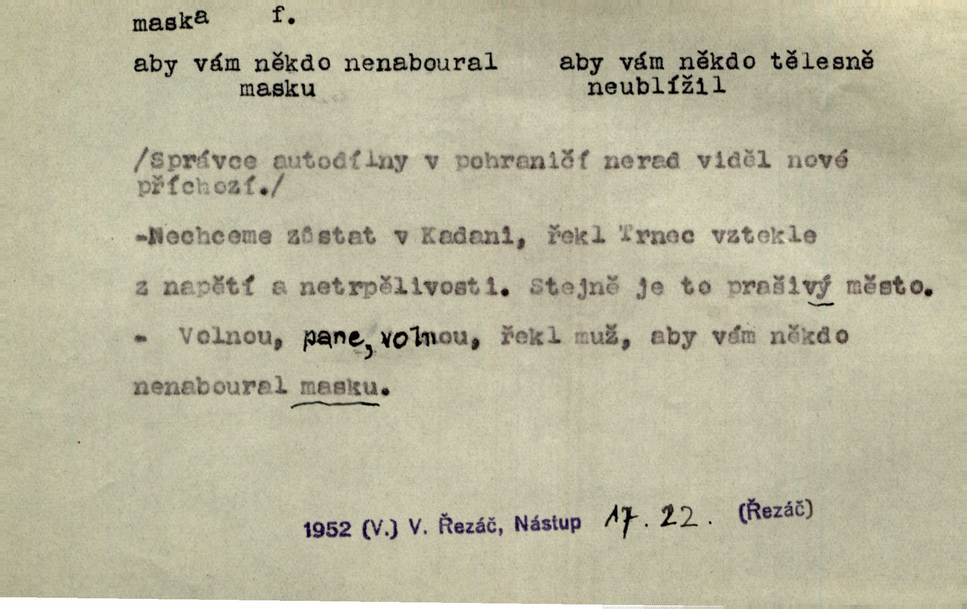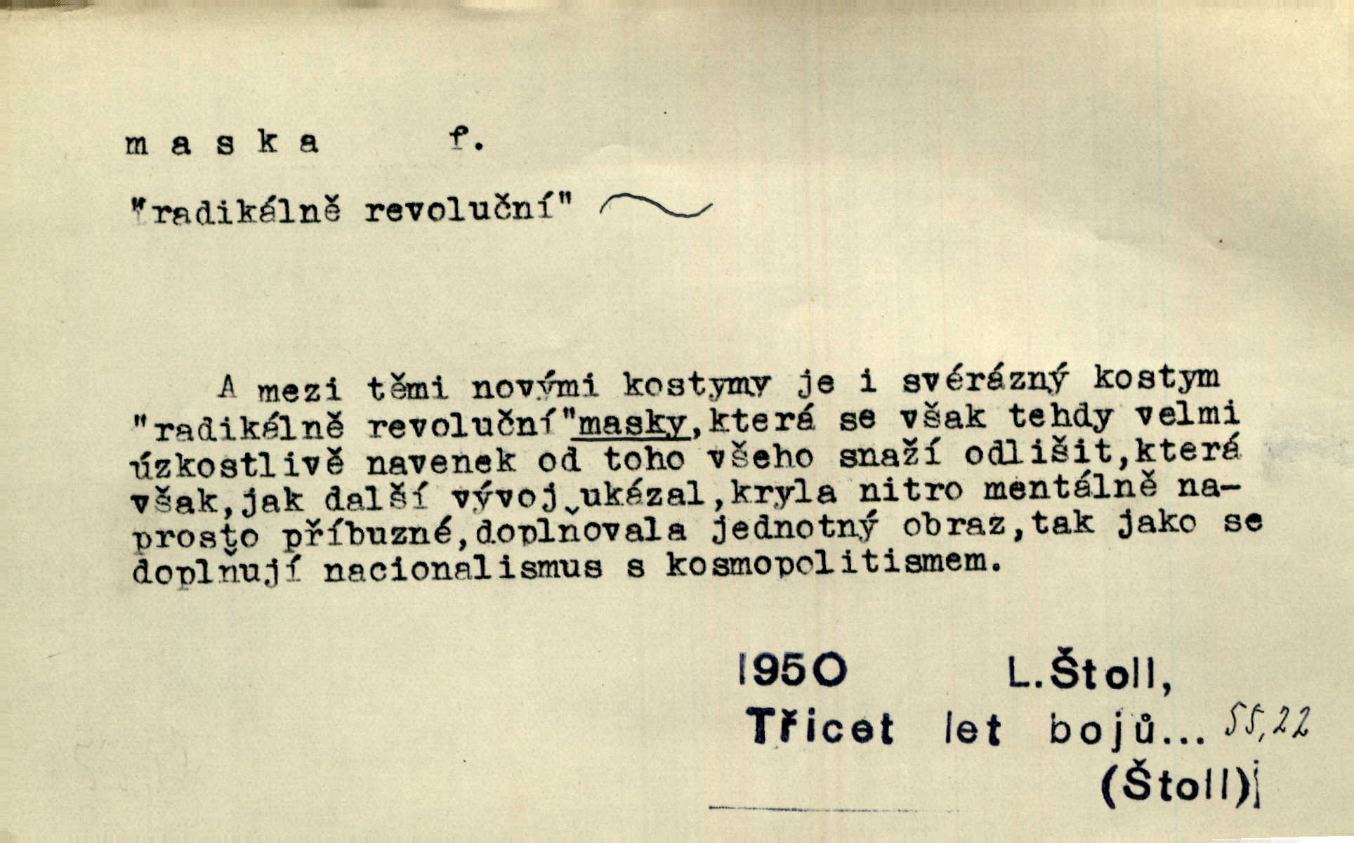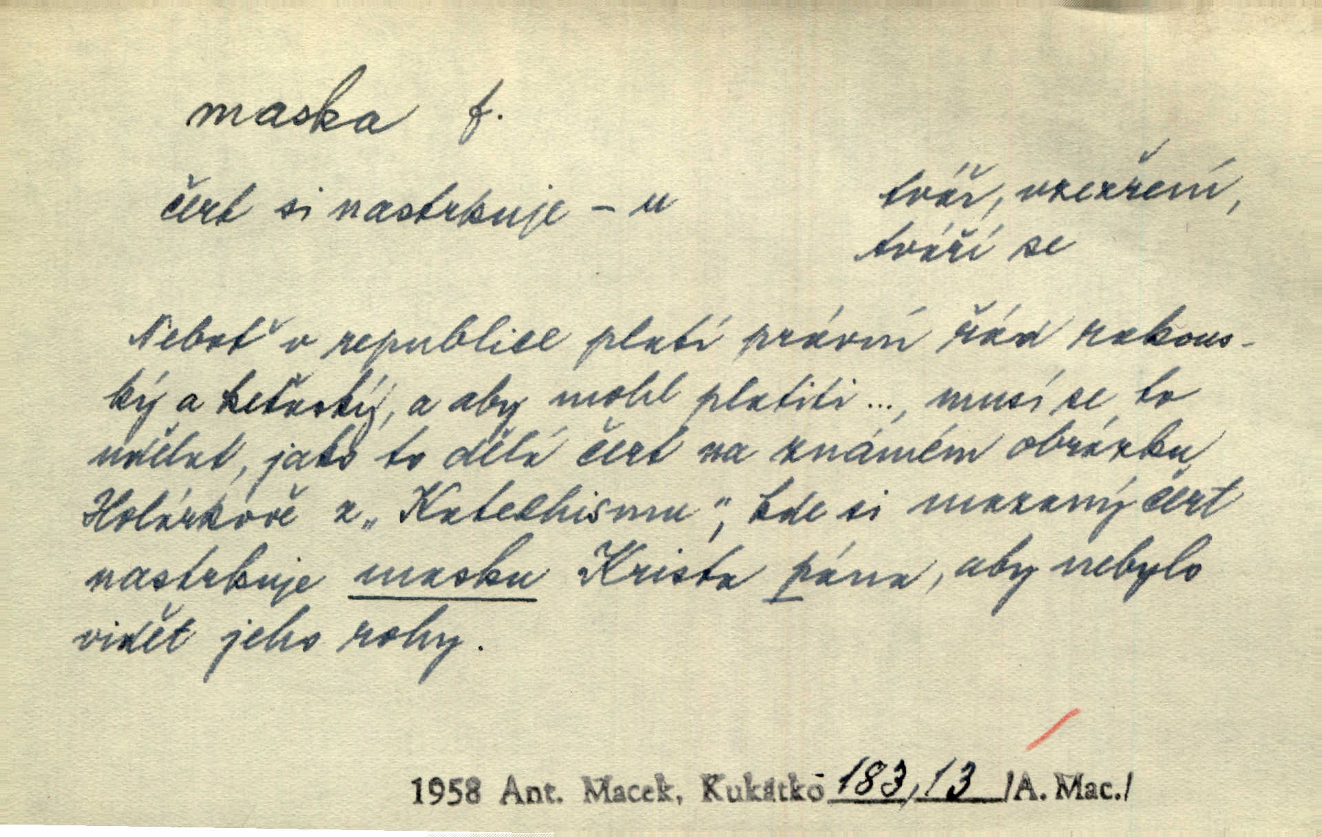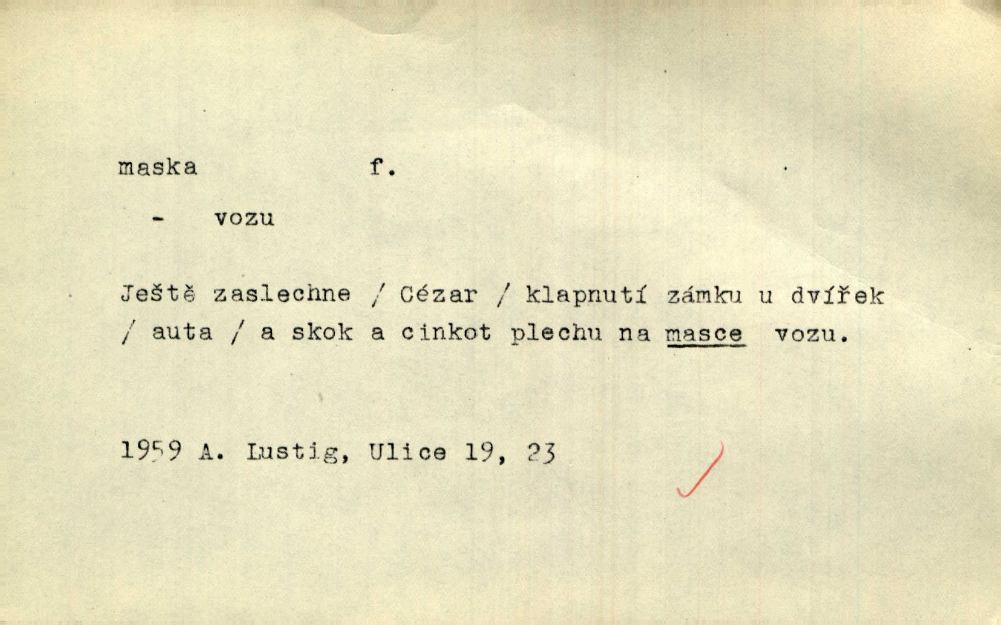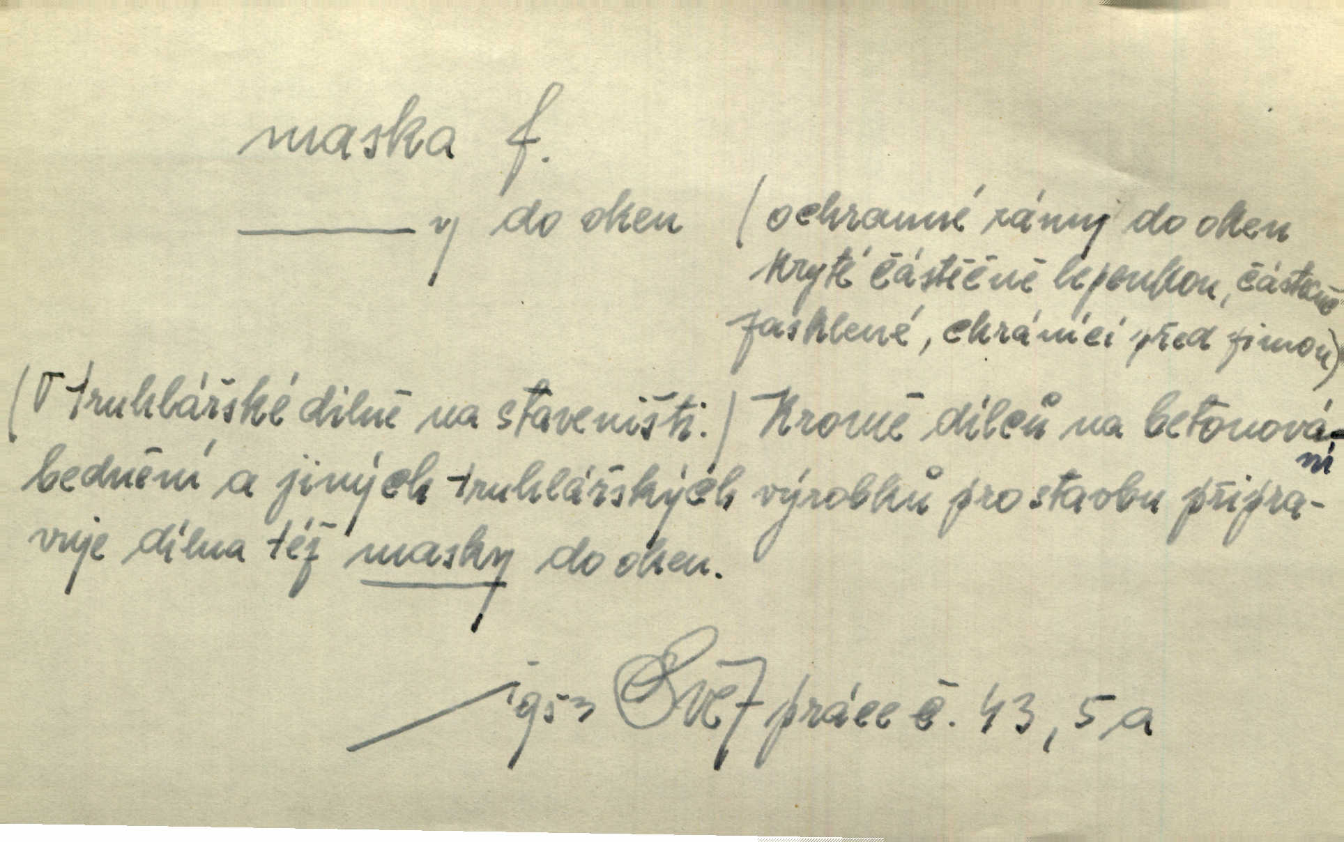 - maska, -y f. (gen. pl. masek) dutá plastická forma nošená na obličeji, aby změnila jeho vzhled, larva, škraboška. Janek, přestrojený za čerta v obrácený kožich z černé ovčí vlny, s neuvěřitelnou maskou v obličeji poděsil celou Habrůvku. A. Mrš. Jejich [profesorů] obličeje podobaly se nasazeným maskám. Šrám. Voj. plynová maska přístroj k filtrování vzduchu zamořeného bojovými chemickými látkami nebo jinými otravnými plyny. Lék. maska při narkotisování. Sport. šermířská maska. D Lék. Hutchinsonova maska pocit tabiků, jako by měli na obličeji škrabošku, pavučinu. D celkové přestrojení, zakuklení n. osoba takto přestrojená. Viděla tu [na Žofíně] vystupovati na sta účastníků ve fantastických maskách. Herrm. Roznemohla se paní majorová. Černá maska jakási, muž v dominu, vnikl v noci do jejího příbytku a škrtil ji, ale neuškrtil. R. Svob. Maska divadelní vnějškové založení představované postavy, zvláště charakterisační úprava obličeje hercova. D Výtv. posmrtná maska sádrový n. voskový odlitek tváře zemřelého. D vnější tvářnost, vnější výraz, zvláště předstíraný, n. předstírání, přetvářka sama. Všechno v okolí, hory, doly, města, lidé bylo ryze bajuvarské, zhyzděné pouze vlašskou maskou. Lier. Kdo tvrdí, že na př. náboženství není než „přestrojení“ nebo „maska“ poměrů hospodářských, musil by přece náboženský cit a náboženské idee analysovat. Mas. Podávala si [děvčata] ruce a tiskla s takovou vroucností, která jest jim jen maskou a zvykem. R. Svob. Dovedla vše obratně zakrýti maskou soucitu zdáním. Maj. Prohlášení o německé politice jsou pouze maskou, klamem, způsobeným příkazy taktiky. Pek. Odhodil masku hrubosti a furiantství, nepřetvařoval se, ale změkl jako vosk. Baar. Stroj. maska (u osobních automobilů) zařízení, které má zlepšit vzhled předku vozu a také chránit chladič před poškozením. D Fot. rámeček nepropouštějící světlo, užívaný při kopírování k dosažení vhodného tvaru obrázku. Zool. zvlášť upravený spodní pysk u nymf našich vážek, kryjící zespodu ústní orgány.