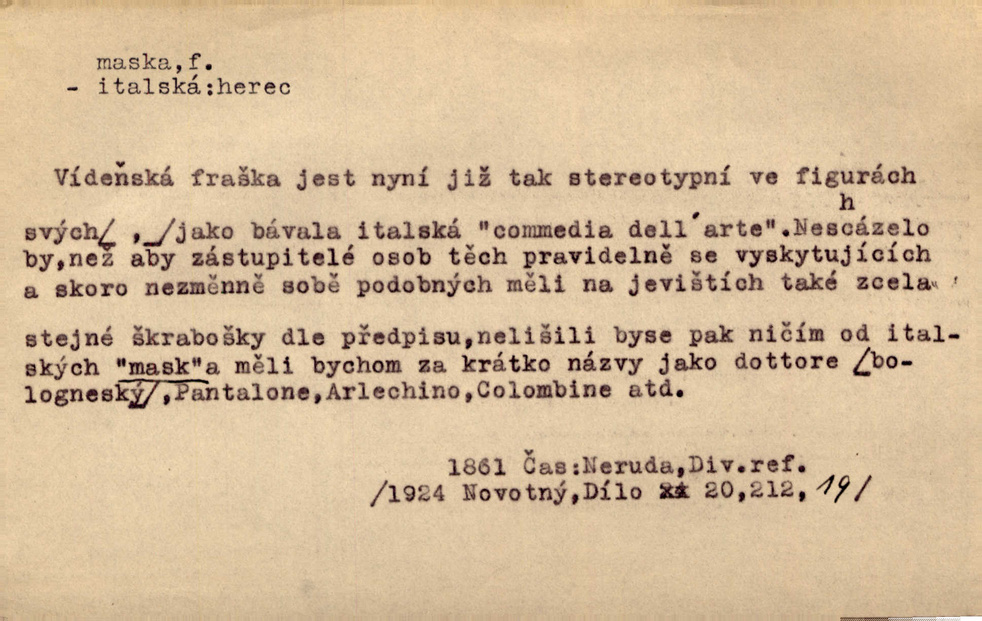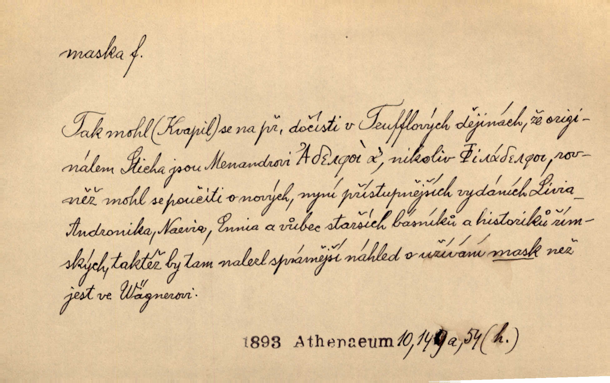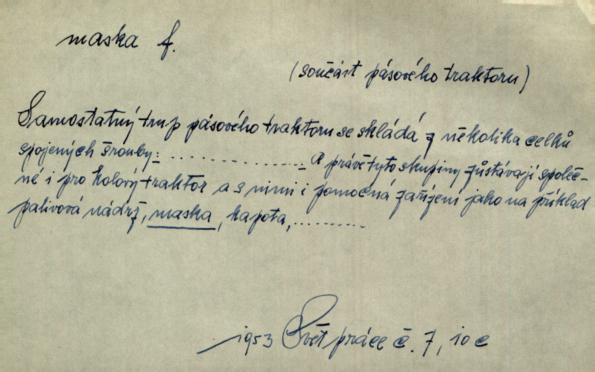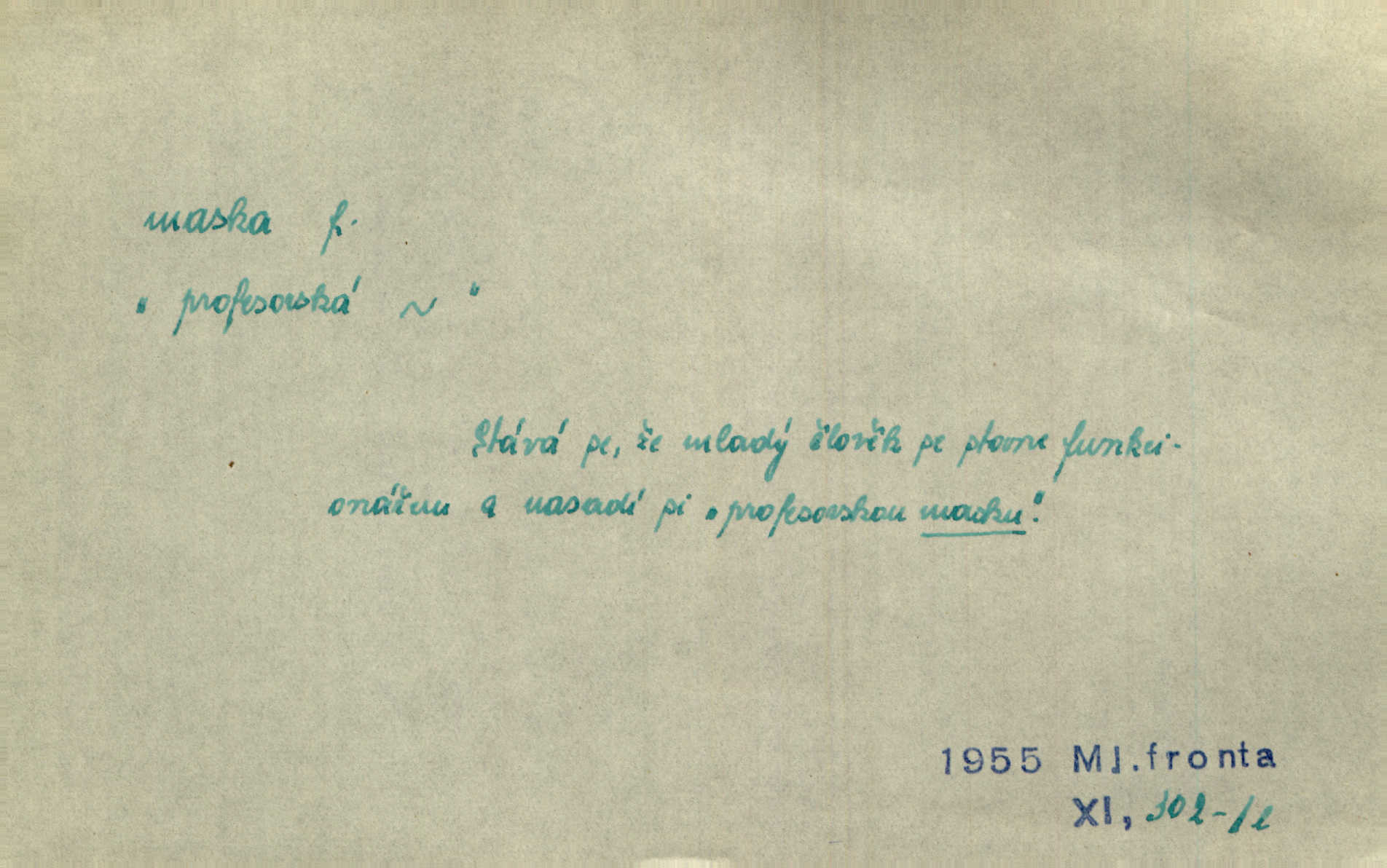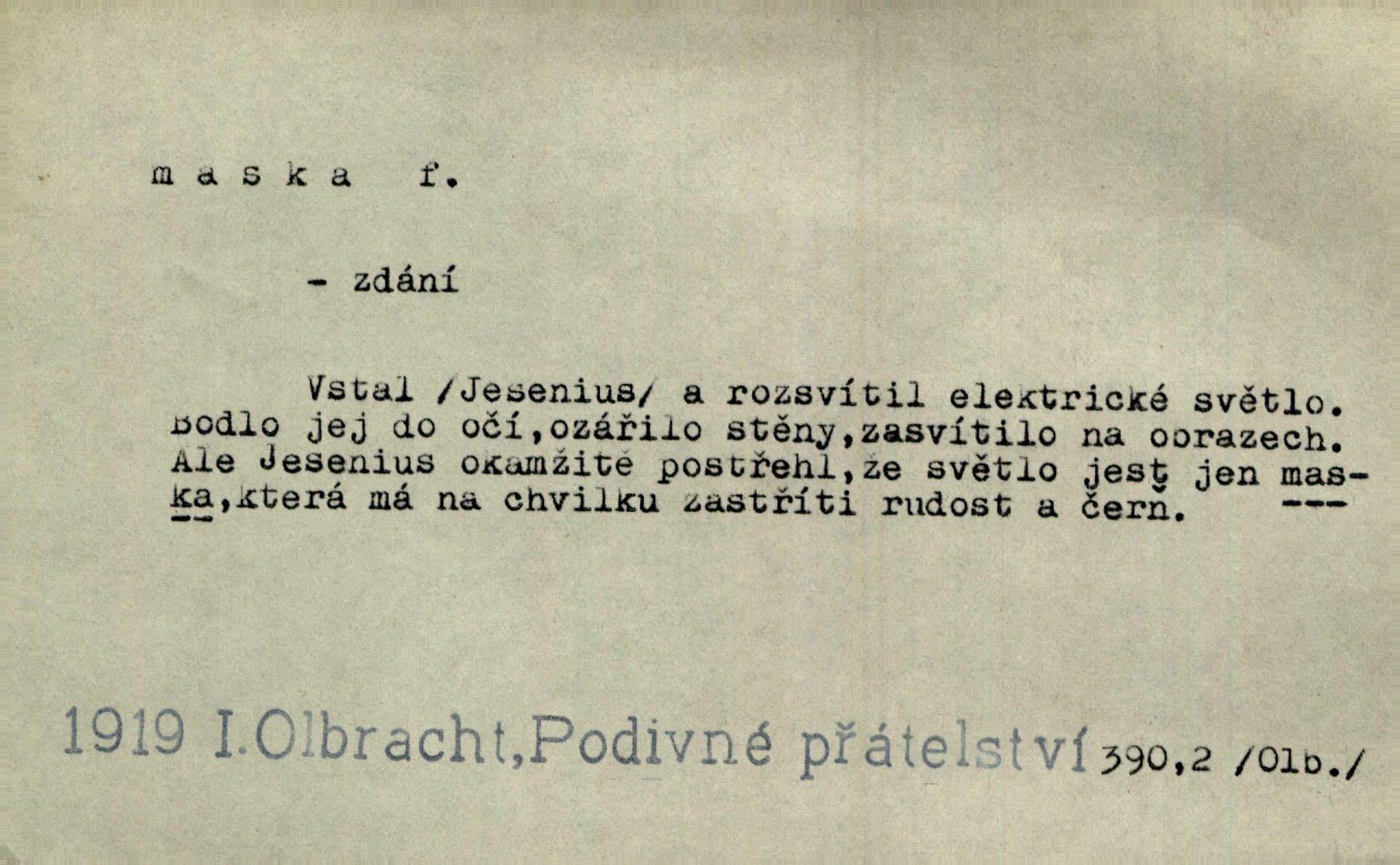 - maska, -y f. (gen. pl. masek) dutá plastická forma nošená na obličeji, aby změnila jeho vzhled, larva, škraboška. Janek, přestrojený za čerta v obrácený kožich z černé ovčí vlny, s neuvěřitelnou maskou v obličeji poděsil celou Habrůvku. A. Mrš. Jejich [profesorů] obličeje podobaly se nasazeným maskám. Šrám. Voj. plynová maska přístroj k filtrování vzduchu zamořeného bojovými chemickými látkami nebo jinými otravnými plyny. Lék. maska při narkotisování. Sport. šermířská maska. D Lék. Hutchinsonova maska pocit tabiků, jako by měli na obličeji škrabošku, pavučinu. D celkové přestrojení, zakuklení n. osoba takto přestrojená. Viděla tu [na Žofíně] vystupovati na sta účastníků ve fantastických maskách. Herrm. Roznemohla se paní majorová. Černá maska jakási, muž v dominu, vnikl v noci do jejího příbytku a škrtil ji, ale neuškrtil. R. Svob. Maska divadelní vnějškové založení představované postavy, zvláště charakterisační úprava obličeje hercova. D Výtv. posmrtná maska sádrový n. voskový odlitek tváře zemřelého. D vnější tvářnost, vnější výraz, zvláště předstíraný, n. předstírání, přetvářka sama. Všechno v okolí, hory, doly, města, lidé bylo ryze bajuvarské, zhyzděné pouze vlašskou maskou. Lier. Kdo tvrdí, že na př. náboženství není než „přestrojení“ nebo „maska“ poměrů hospodářských, musil by přece náboženský cit a náboženské idee analysovat. Mas. Podávala si [děvčata] ruce a tiskla s takovou vroucností, která jest jim jen maskou a zvykem. R. Svob. Dovedla vše obratně zakrýti maskou soucitu zdáním. Maj. Prohlášení o německé politice jsou pouze maskou, klamem, způsobeným příkazy taktiky. Pek. Odhodil masku hrubosti a furiantství, nepřetvařoval se, ale změkl jako vosk. Baar. Stroj. maska (u osobních automobilů) zařízení, které má zlepšit vzhled předku vozu a také chránit chladič před poškozením. D Fot. rámeček nepropouštějící světlo, užívaný při kopírování k dosažení vhodného tvaru obrázku. Zool. zvlášť upravený spodní pysk u nymf našich vážek, kryjící zespodu ústní orgány.