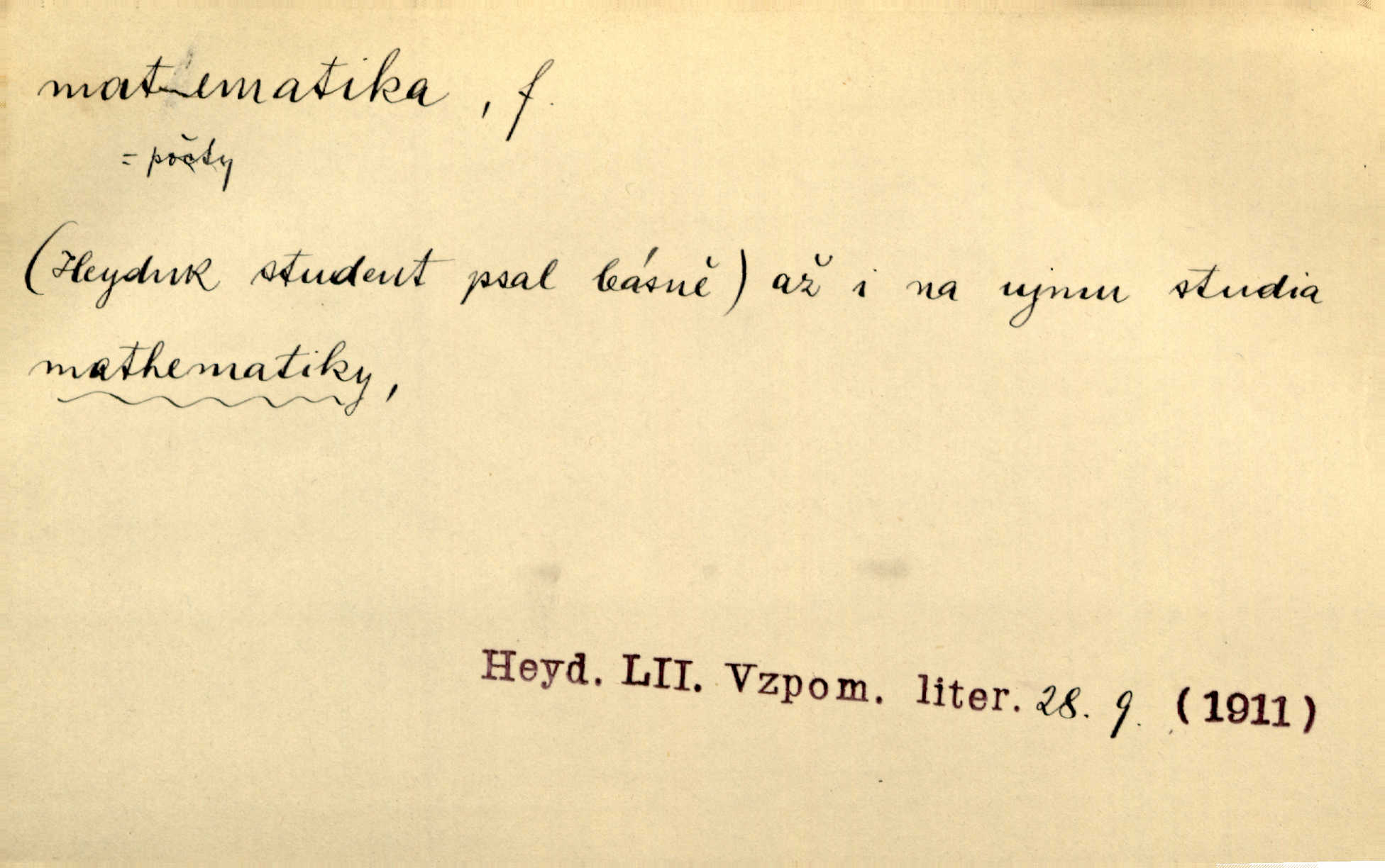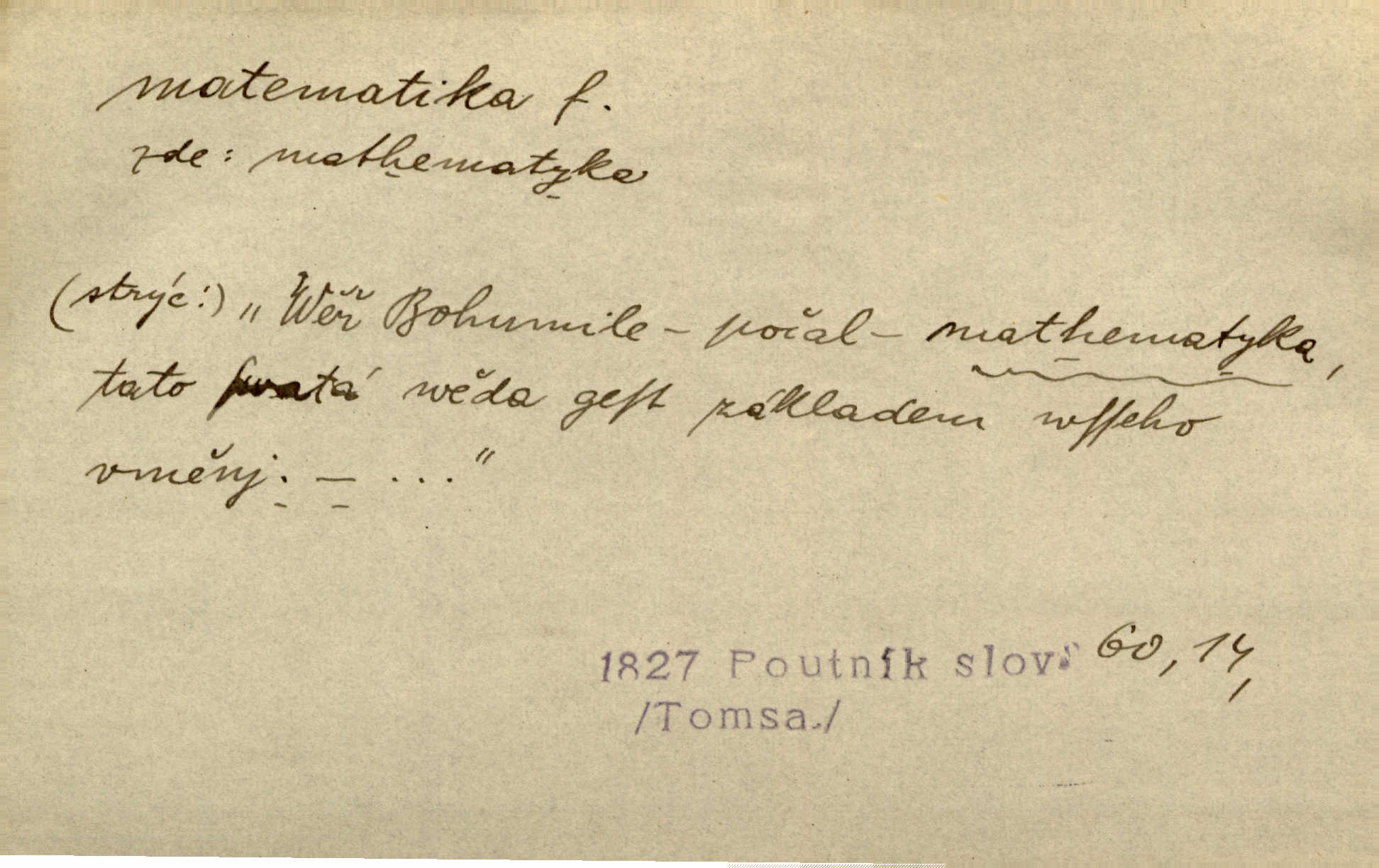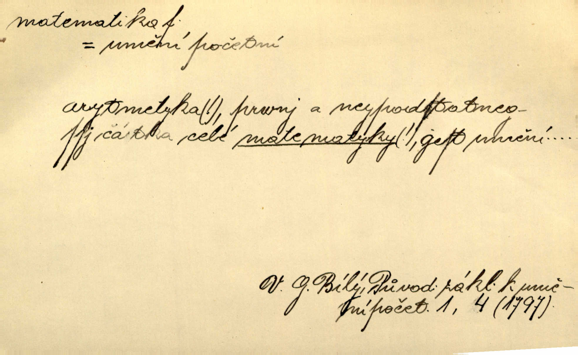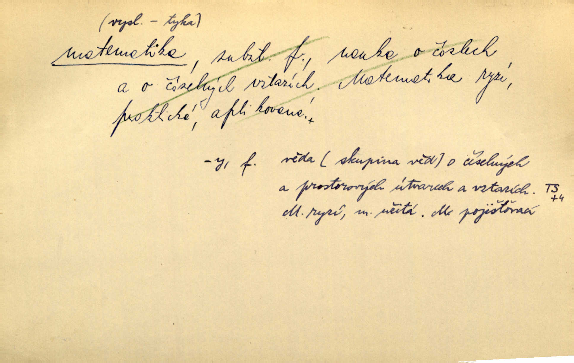- matematika, -y f. věda o číselných a prostorových útvarech a vztazích. Plavala jsem [při písemné zkoušce] z matematiky. Čap. Ch. Dobrovský, domácí učitel mathematiky mladého hraběte z Nostic. Jir. To, prosím, je skoro tak jisté jako matematika: slabost láká útočníka, risiko odpuzuje. Přít. Mat. matematika čistá, užitá, pojišťovací a j.