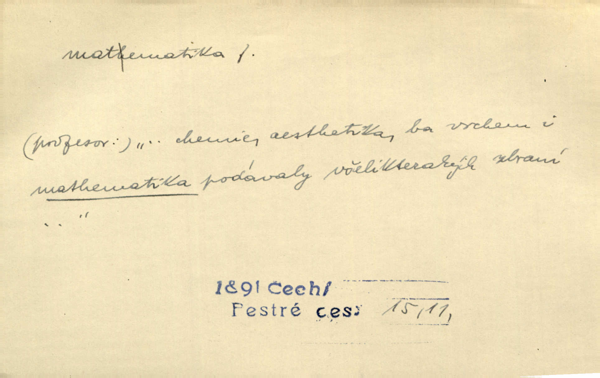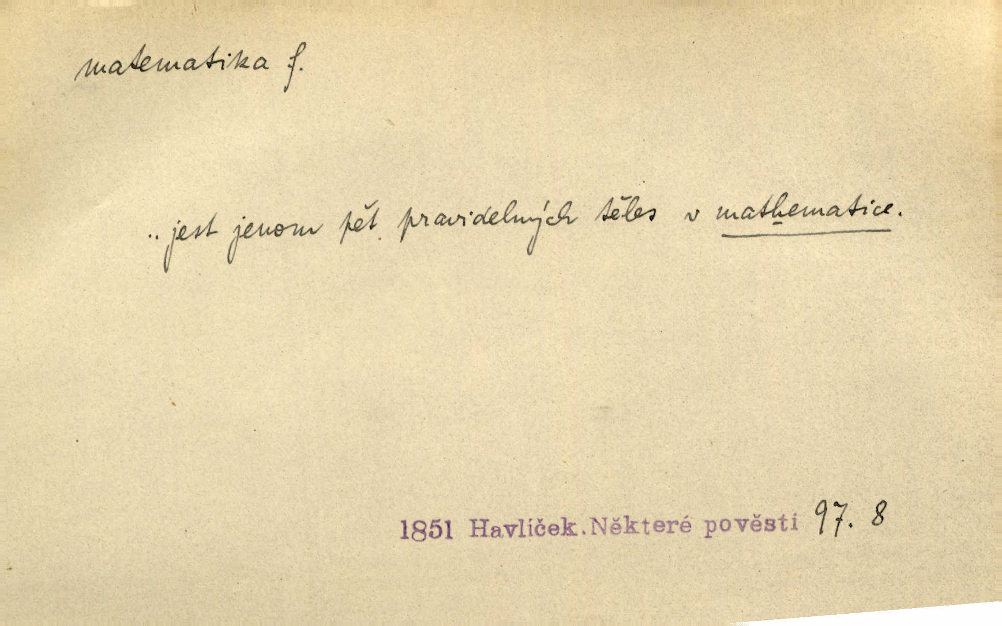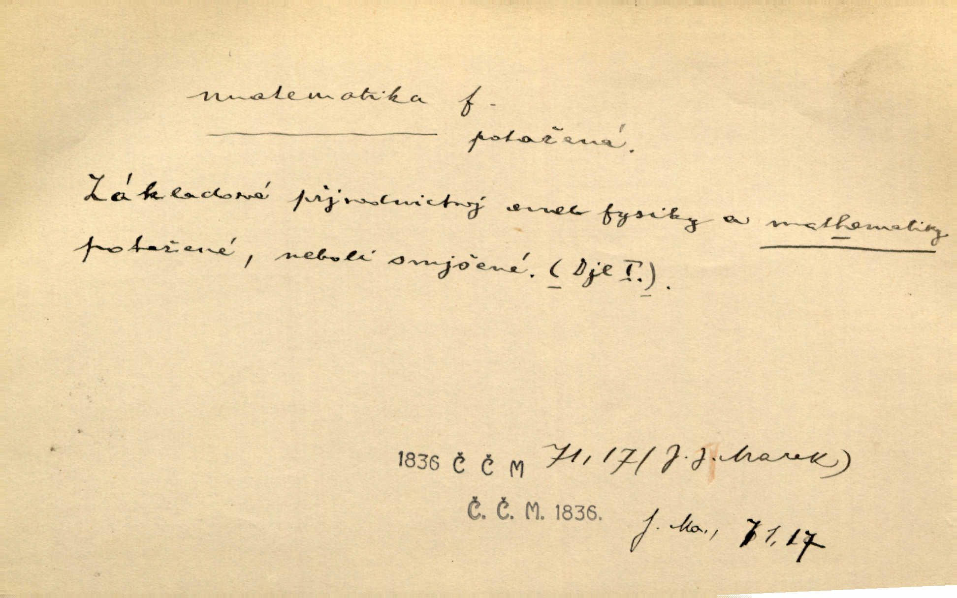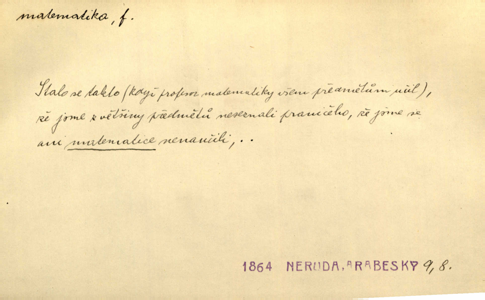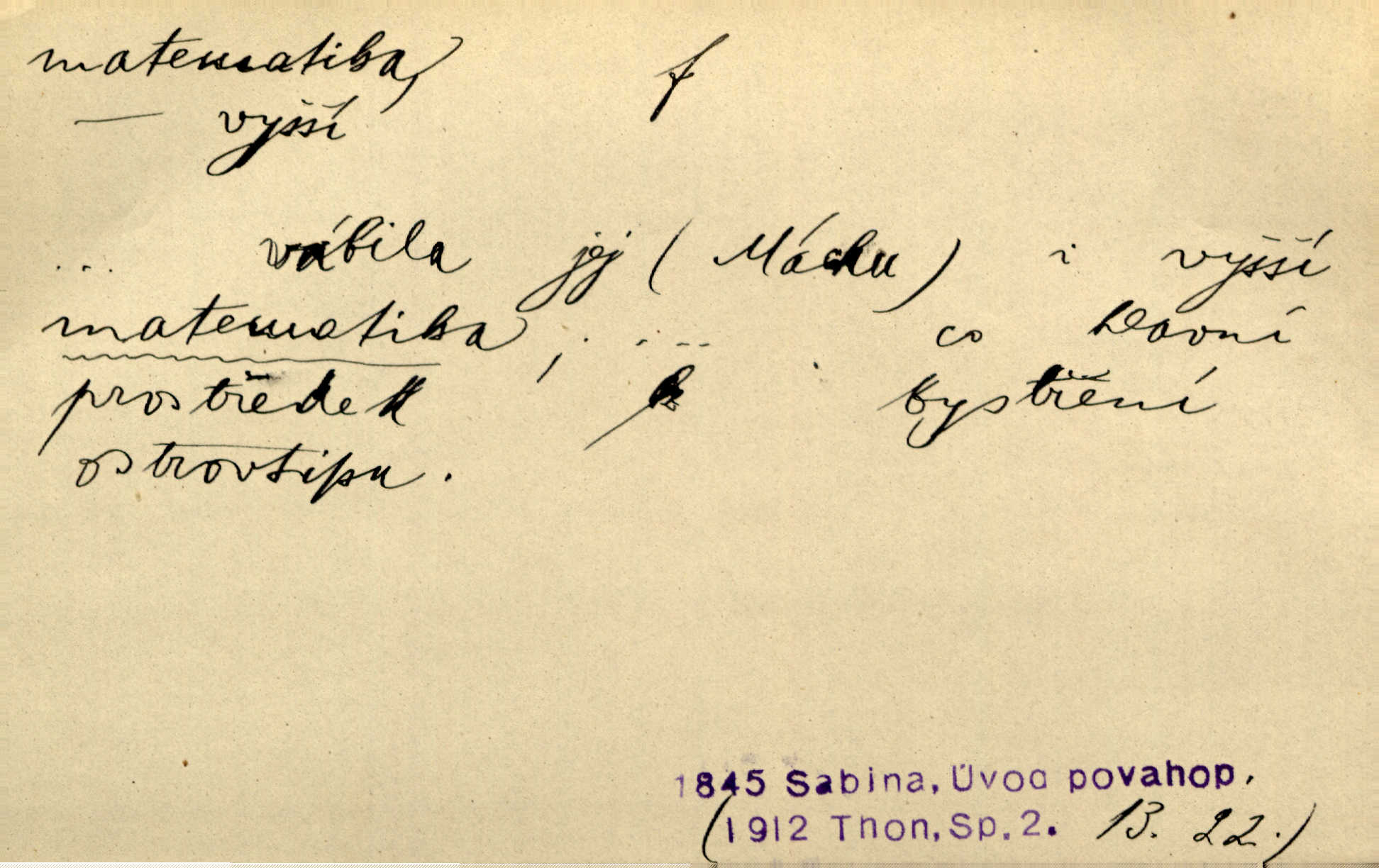 - matematika, -y f. věda o číselných a prostorových útvarech a vztazích. Plavala jsem [při písemné zkoušce] z matematiky. Čap. Ch. Dobrovský, domácí učitel mathematiky mladého hraběte z Nostic. Jir. To, prosím, je skoro tak jisté jako matematika: slabost láká útočníka, risiko odpuzuje. Přít. Mat. matematika čistá, užitá, pojišťovací a j.