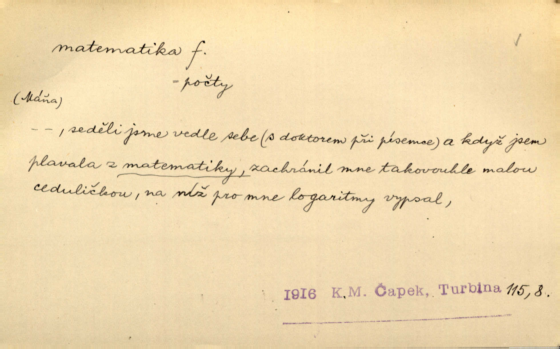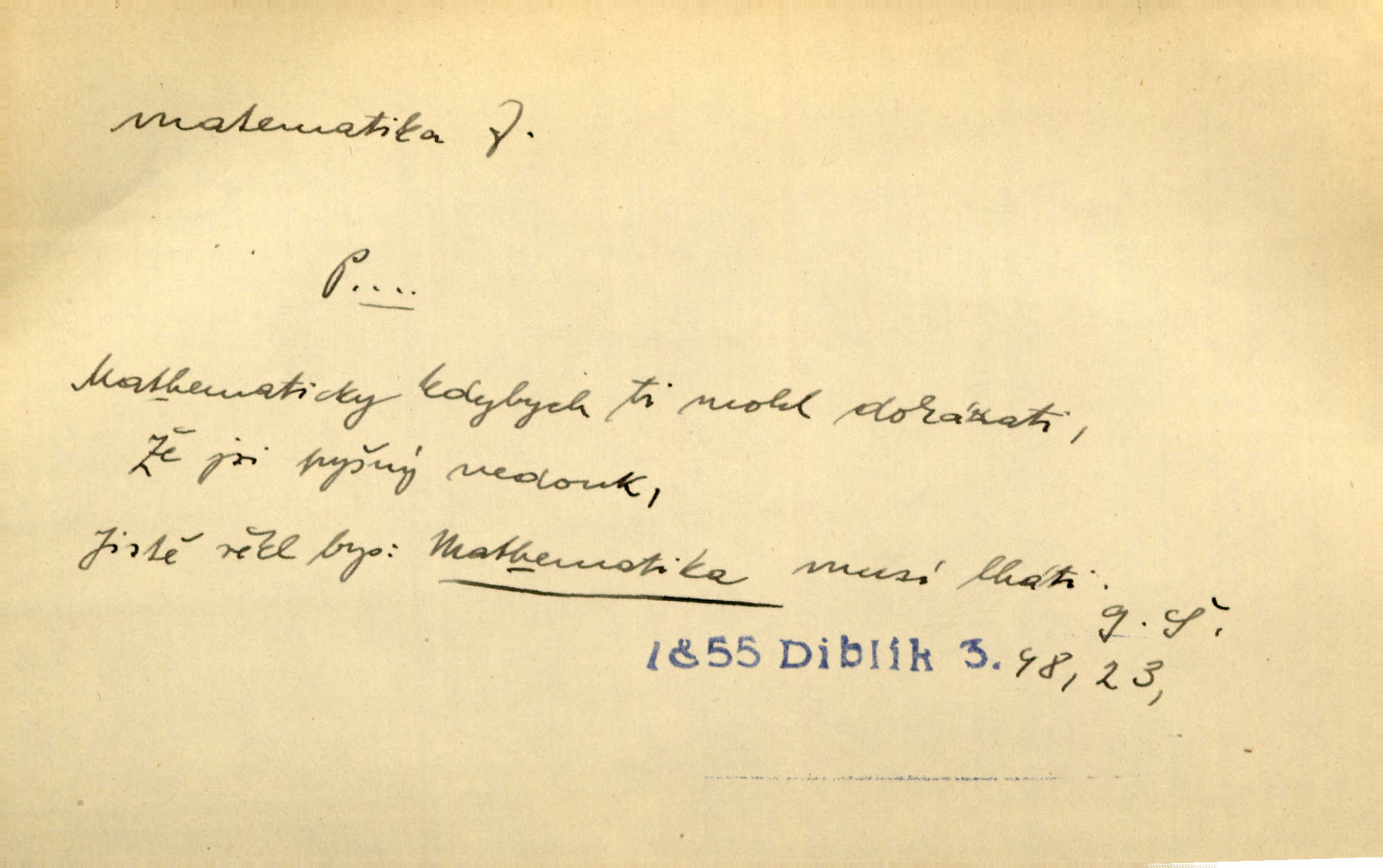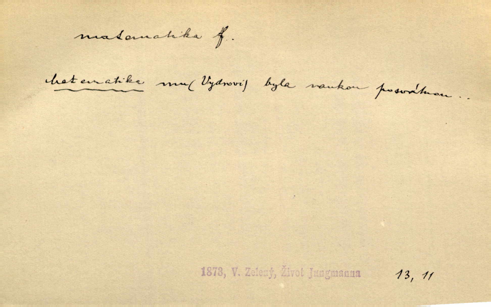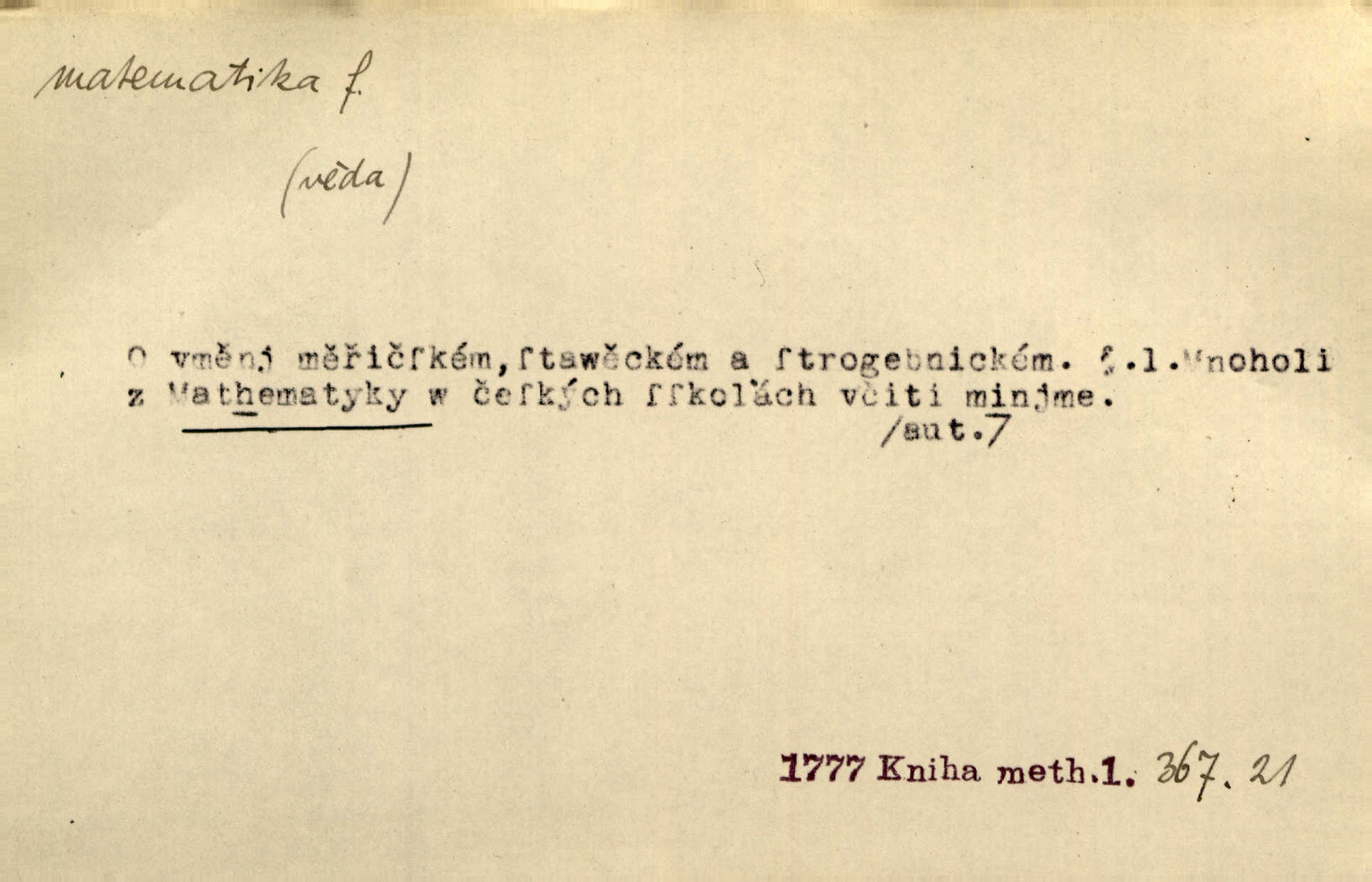 - matematika, -y f. věda o číselných a prostorových útvarech a vztazích. Plavala jsem [při písemné zkoušce] z matematiky. Čap. Ch. Dobrovský, domácí učitel mathematiky mladého hraběte z Nostic. Jir. To, prosím, je skoro tak jisté jako matematika: slabost láká útočníka, risiko odpuzuje. Přít. Mat. matematika čistá, užitá, pojišťovací a j.