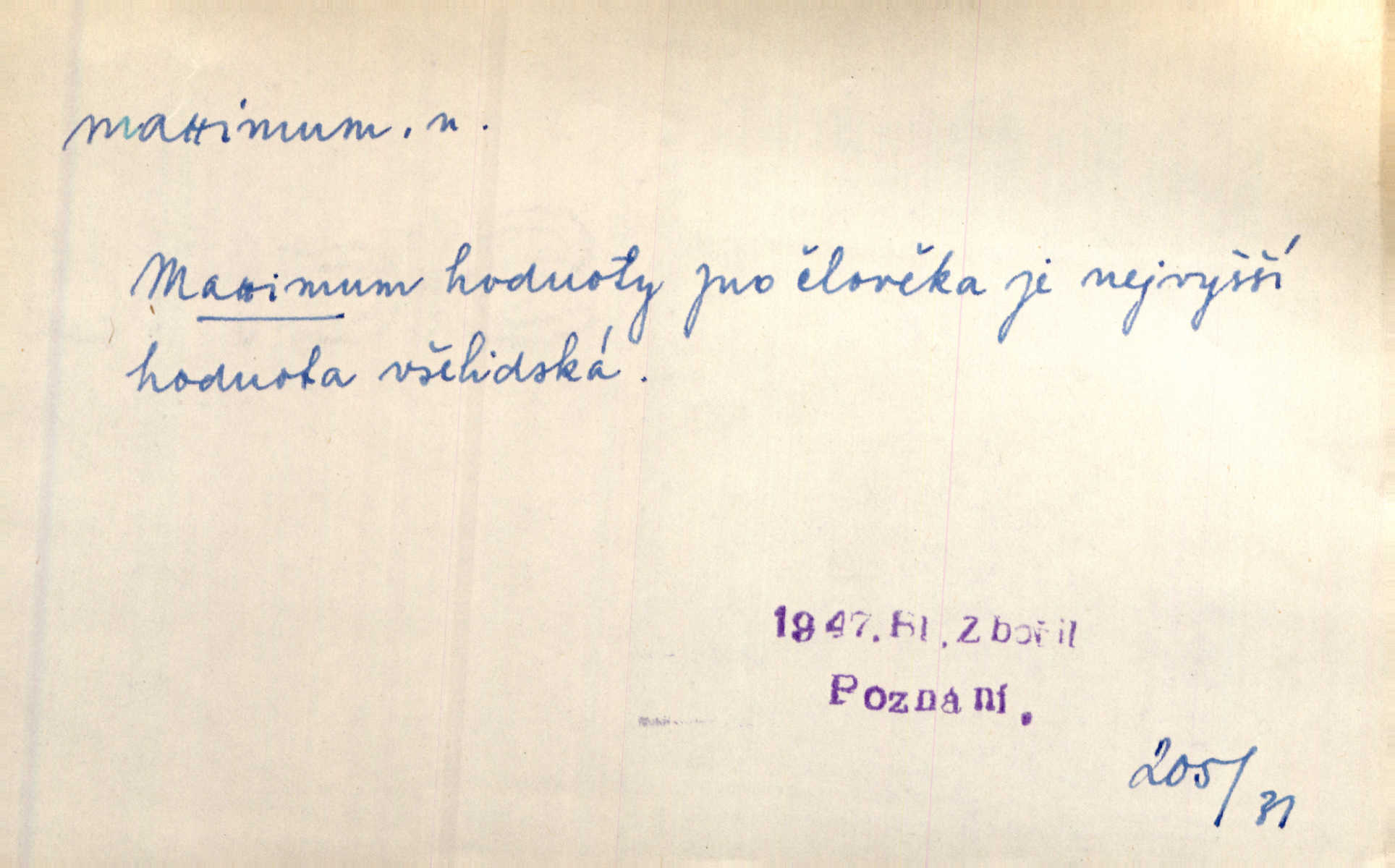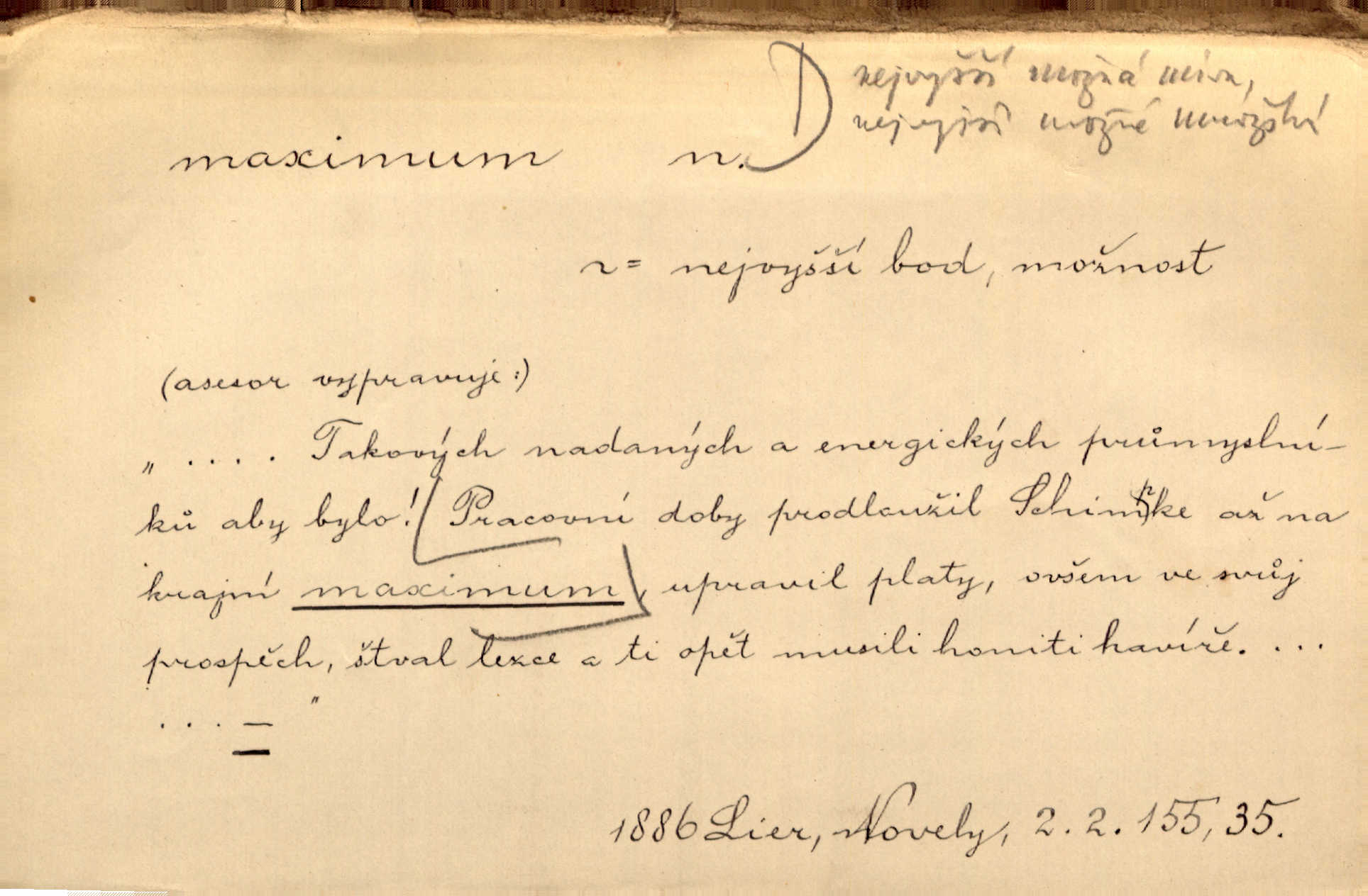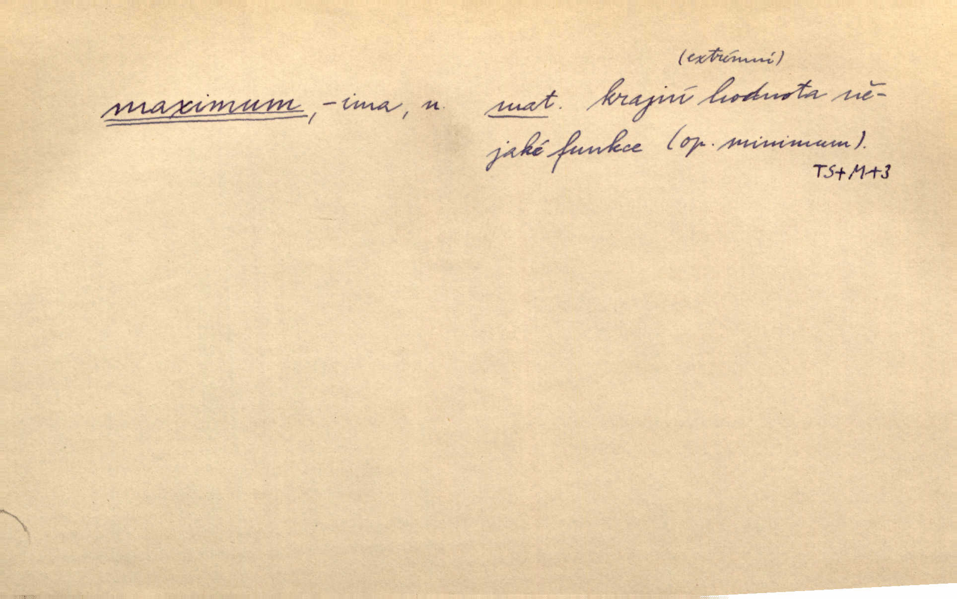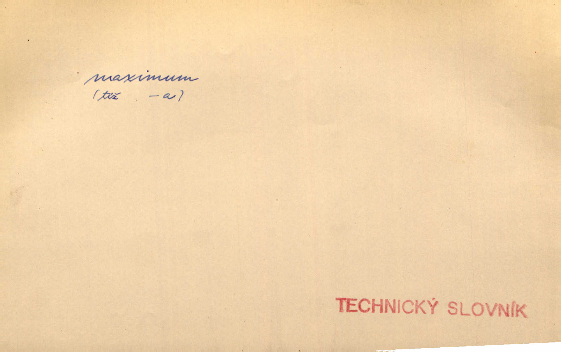 - maximum, -ima n. nejvyšší možná míra, největší možné množství (op. minimum). Pracovní doby prodloužil až na krajní maximum. Lier. Mládí nese v sobě maximum tragiky. Mah. Jeho [konstruktéra] činnost vedena jest touto jedinou myšlénkou: minimem síly přírodní dosáhnout maxima effektu. Naše d. Mat. krajní (extrémní) hodnota funkce (op. minimum). Meteor. nejvyšší hodnota meteorologického činitele, zvl. oblast poměrně nejvyššího tlaku (op. minimum).