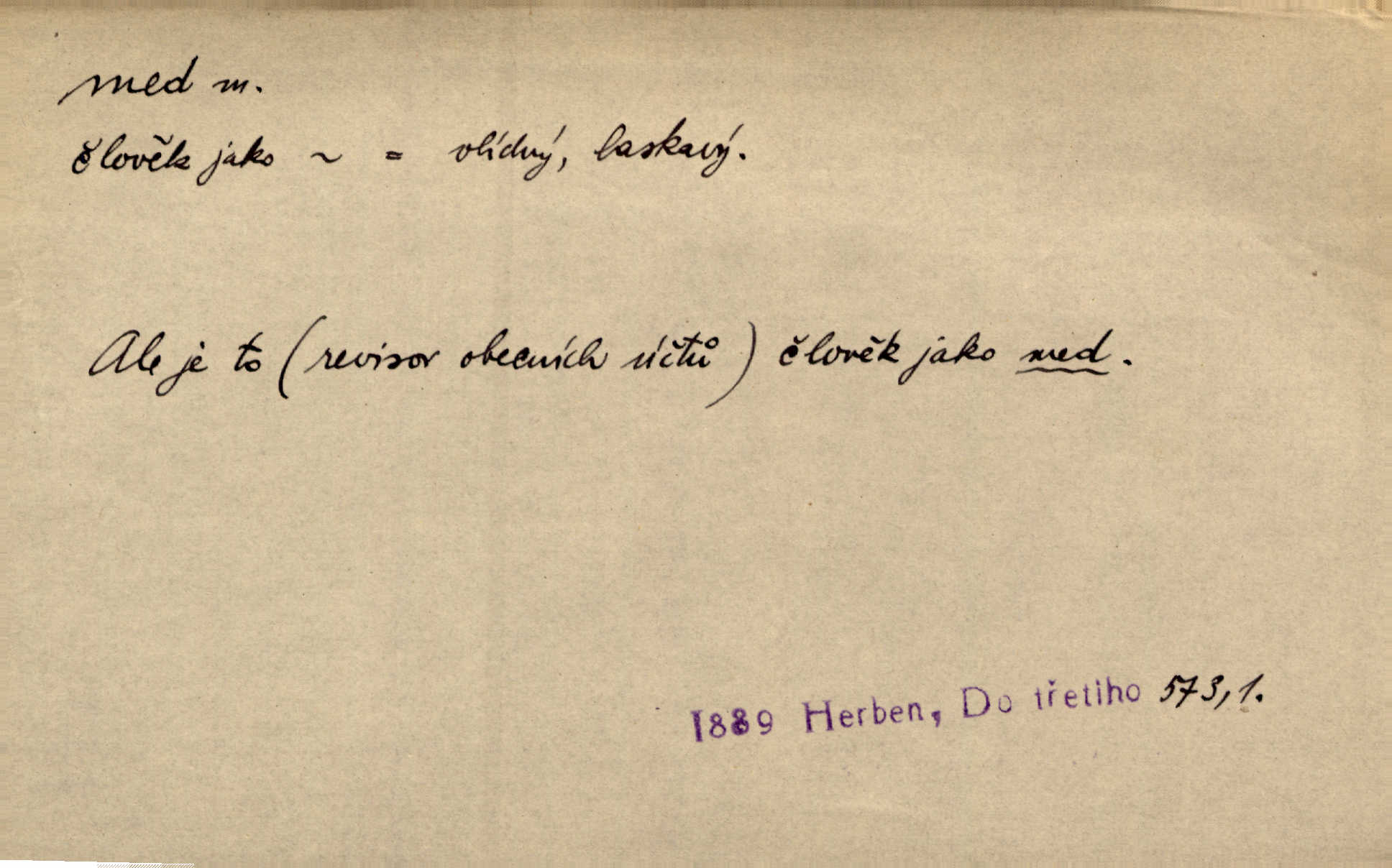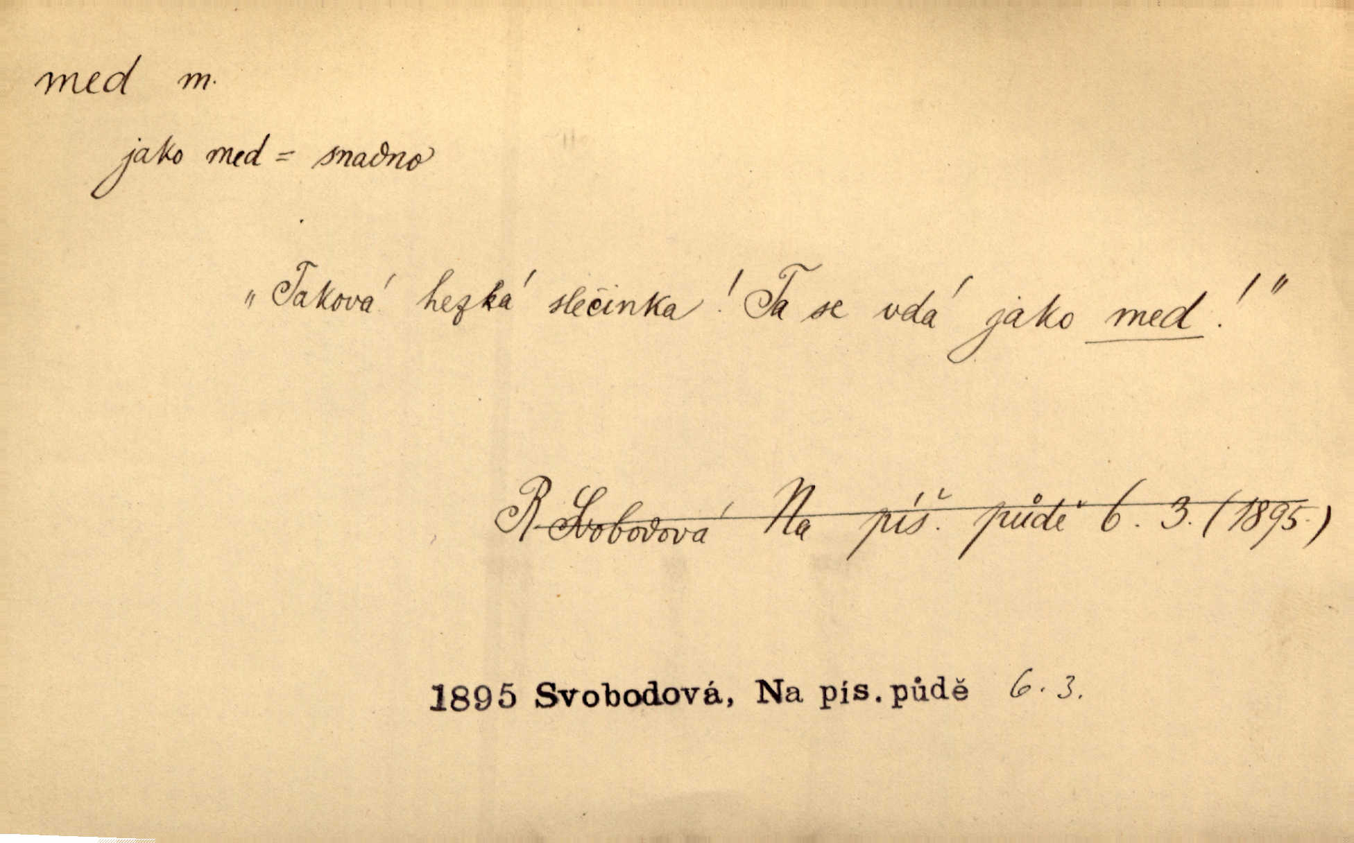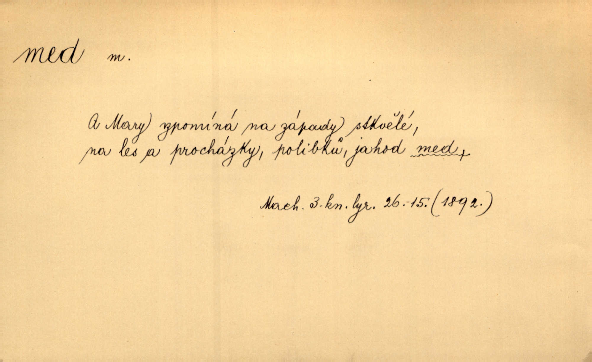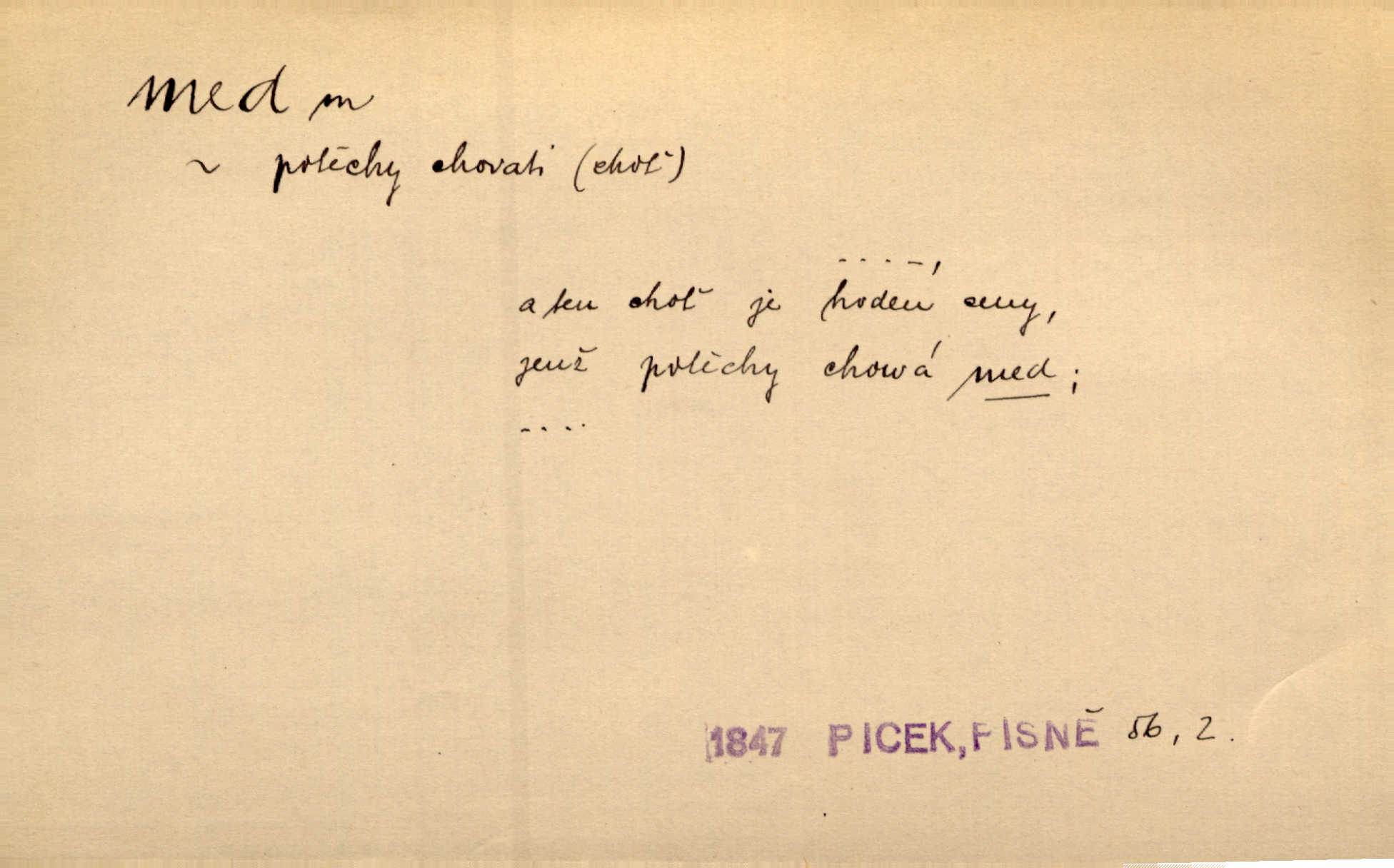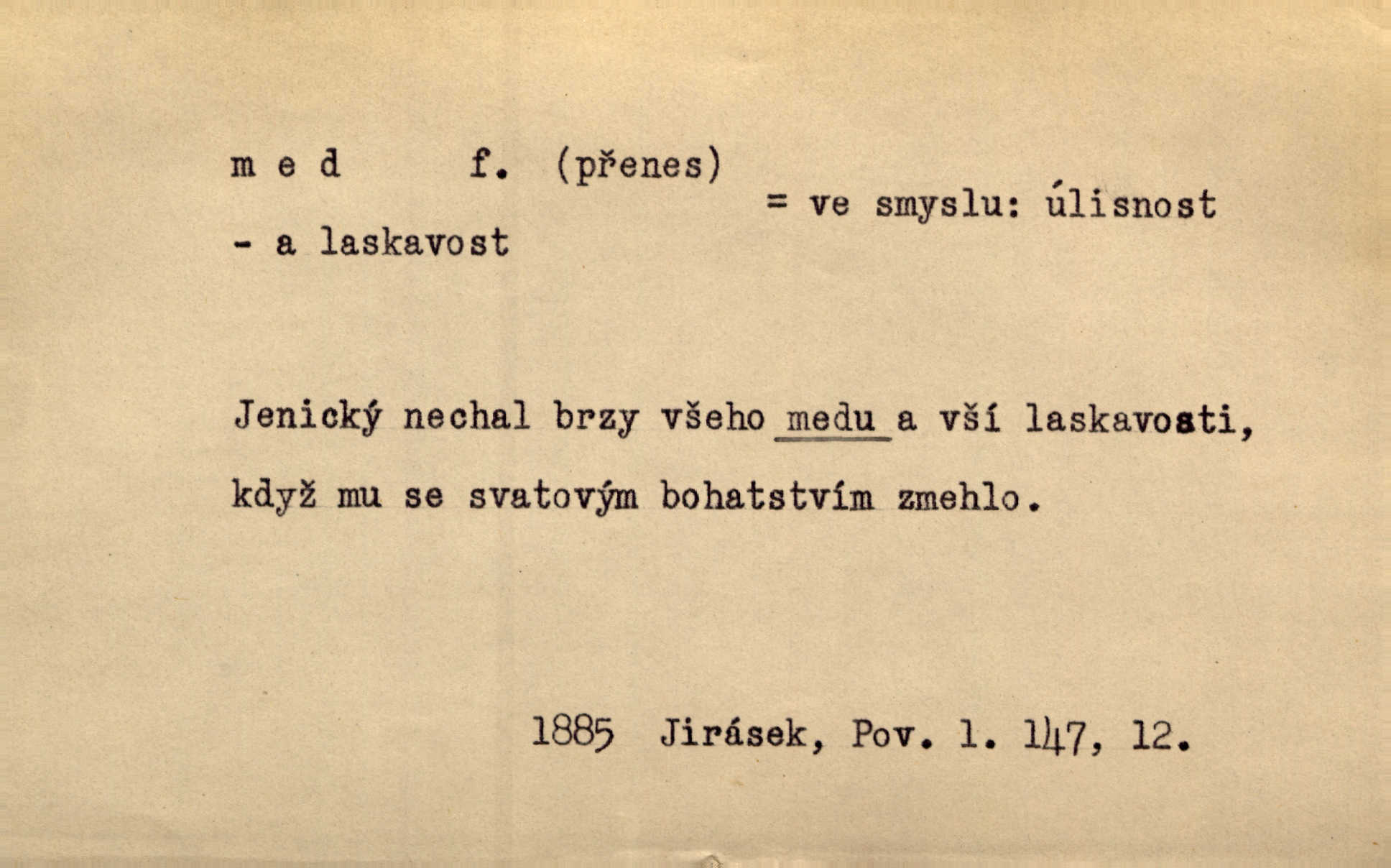 - med, -u m. sladká, hustá šťáva, kterou včely po květech sbírají, v svých útrobách uzpůsobují a ukládají do buněk v plástech. Na stolku byly dobré buchty, chléb, med, pomazánka. Něm. Pod sladkým medem tráví lidi jedem úlisností. Pořek. Od včely pochází med, od hada jed. Přísl. Tentokrát nás měla ráda sv. Hedvika, o které se říká, že do řepy ještě medu nalívá v polovici října nejvíce cukernatí řepa. A. Mrš. Přen. V stínu stromů chutná líp rtů dívčích med sladké rty. Vrch. Jenický nechal brzy všeho medu a vší laskavosti, když mu se svatovým bohatstvím zmehlo lichocení. Jir. Ustál. sp. Matka ke mně byla jako med, zvali mě, trachtili velmi přívětivá. Herrm. Je to člověk jako med vlídný, laskavý. Herb. Táhlo se to za mnou jako mouchy za medem. Baar. Slova jeho plynula lahodně jako med. Zey. Pan školní rada mluvil, jako když medu ukrajuje. Vrba. Taková hezká slečinka! Ta se vdá jako med! snadno. R. Svob. Já mu starostování ze srdce přeju. Za rok, za dva pozná, že to není med lízat, a omrzí ho příjemná věc. Vrba. Musíš se na službách protírati mezi cizími lidmi, a dobře víš, že to není žádný med. Šmil. Tu noc nebyla služba [strážníků] žádným medem. Vach. Med vám [Čechům] bude [Aeneáš Sylvius] mazat kolem úst lichotiti. Jir. Co pak teď — teď jsou [syn se ženou] ještě samej med a mandle milují se, jsou v líbánkách. Šim. Borovec byl samý cukr a med samá laskavost, velmi roztomilý. Šmil. Cukr. Turecký med halva, výrobek z pšeničné mouky, másla, medu, sesamového oleje a mandlí n. ořechů. Umělý med. Typ. slang. vysázená, ale ještě nevyplacená práce počítajícího sazeče. D medovina. Med, pivo a víno jsem tam pil. Čel. Praotec váš… zpit medem topor robil k loupežím. Heyd.