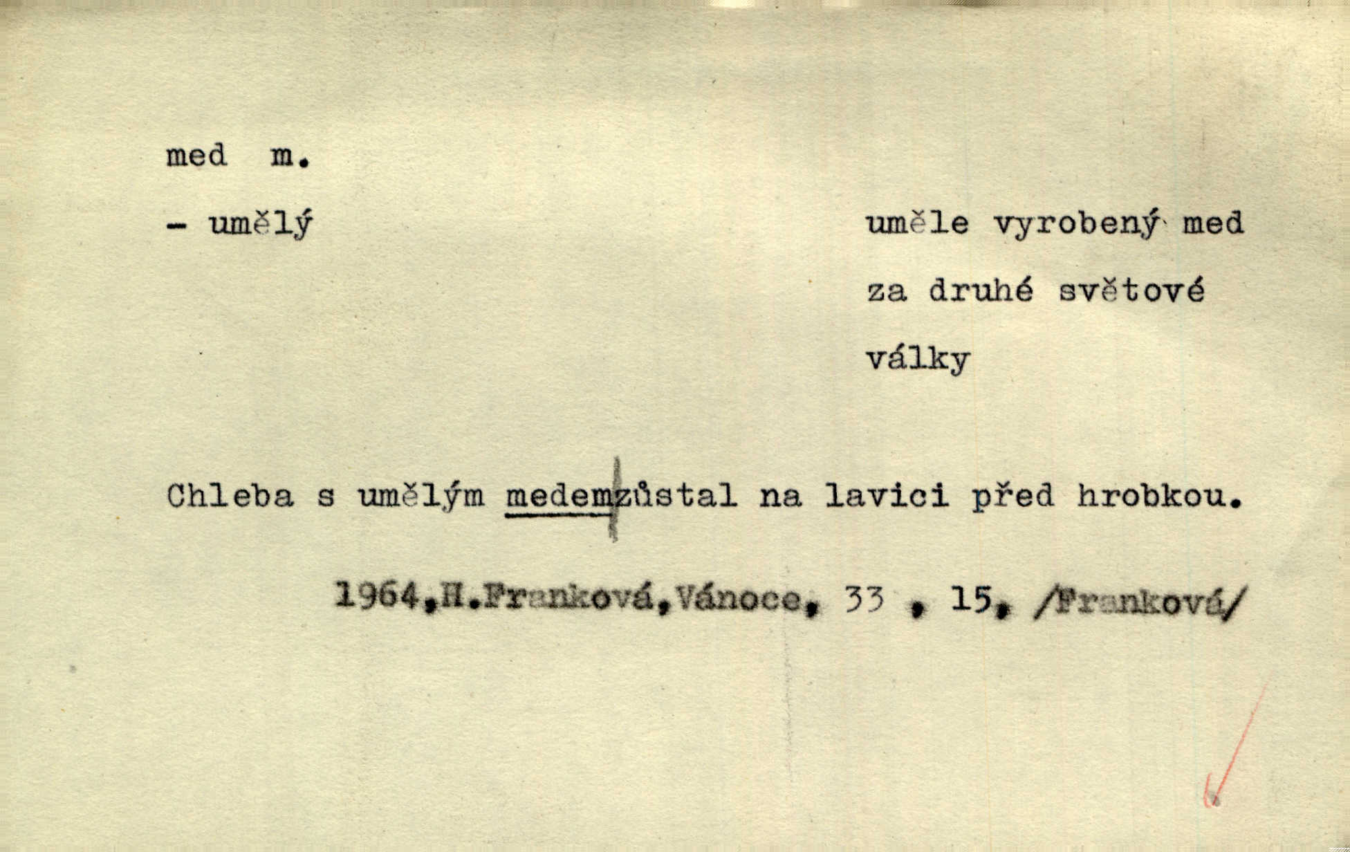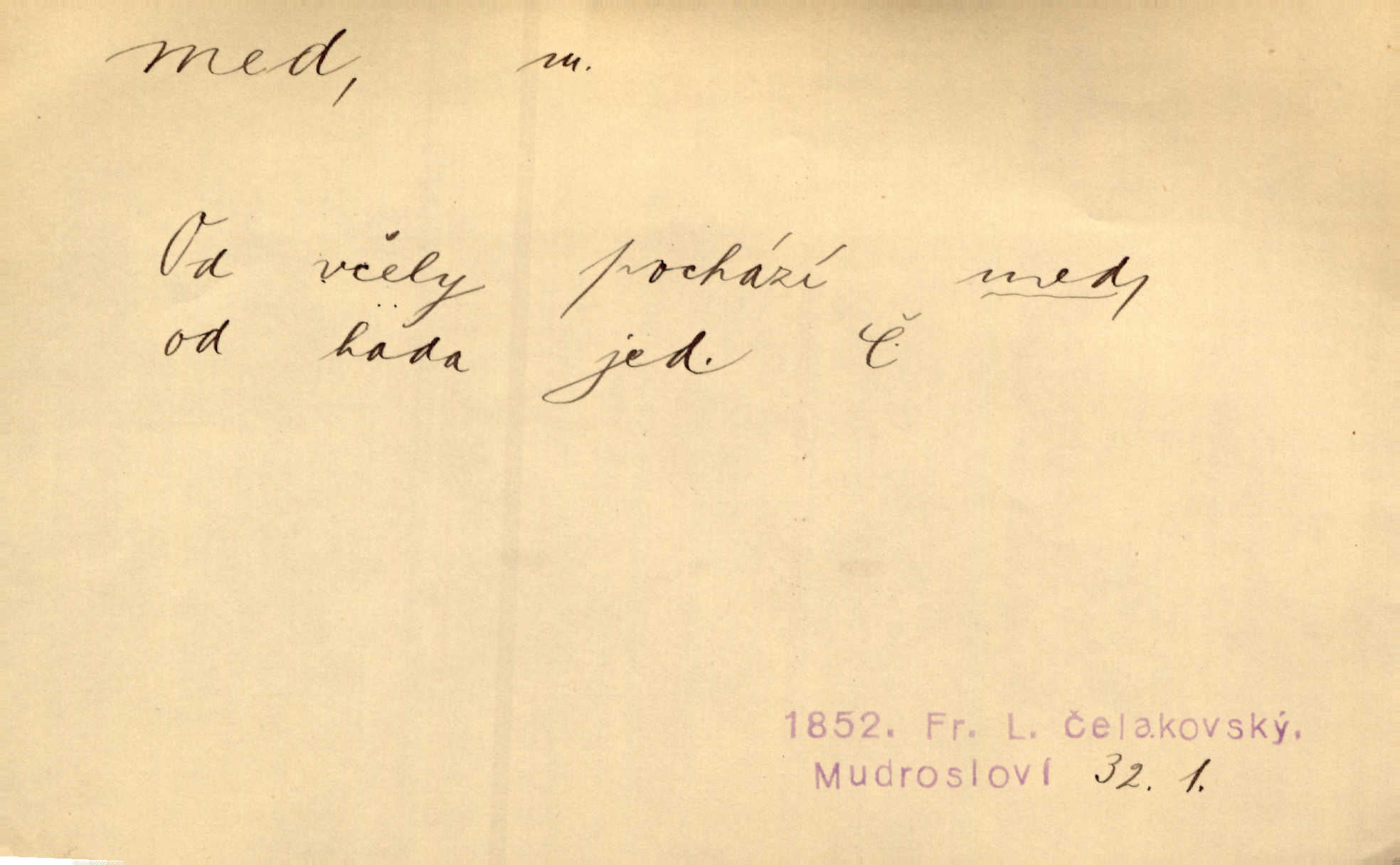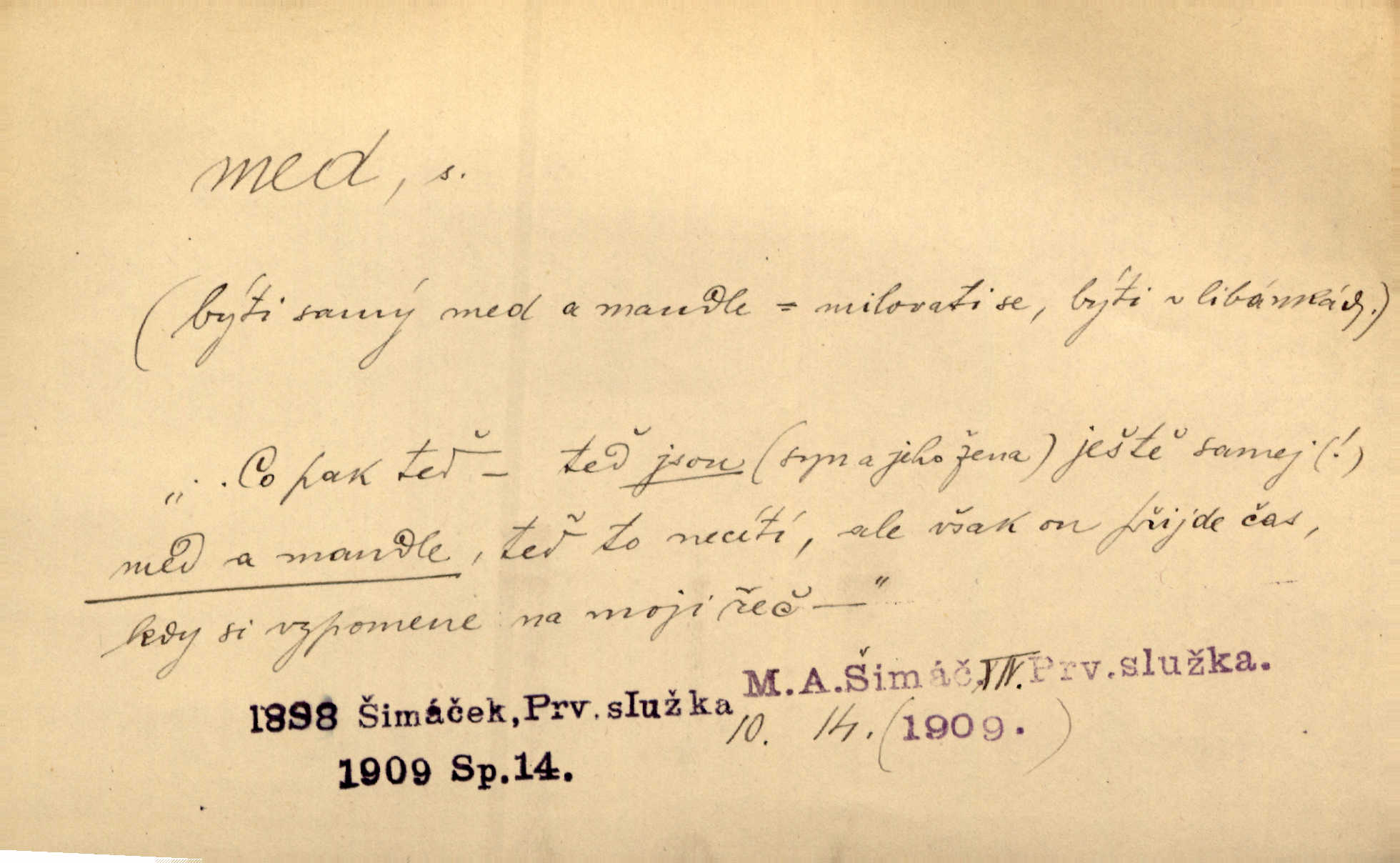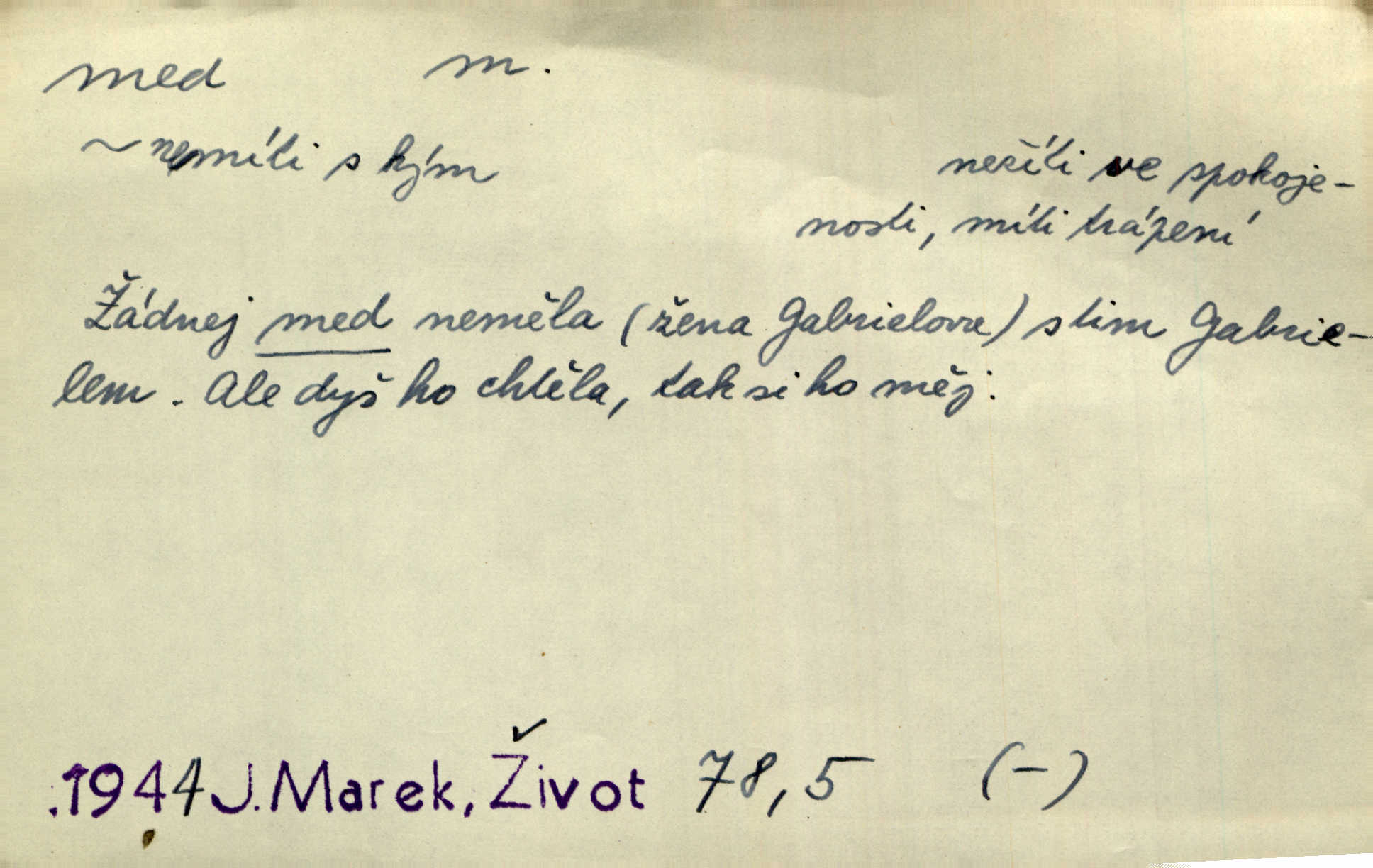 - med, -u m. sladká, hustá šťáva, kterou včely po květech sbírají, v svých útrobách uzpůsobují a ukládají do buněk v plástech. Na stolku byly dobré buchty, chléb, med, pomazánka. Něm. Pod sladkým medem tráví lidi jedem úlisností. Pořek. Od včely pochází med, od hada jed. Přísl. Tentokrát nás měla ráda sv. Hedvika, o které se říká, že do řepy ještě medu nalívá v polovici října nejvíce cukernatí řepa. A. Mrš. Přen. V stínu stromů chutná líp rtů dívčích med sladké rty. Vrch. Jenický nechal brzy všeho medu a vší laskavosti, když mu se svatovým bohatstvím zmehlo lichocení. Jir. Ustál. sp. Matka ke mně byla jako med, zvali mě, trachtili velmi přívětivá. Herrm. Je to člověk jako med vlídný, laskavý. Herb. Táhlo se to za mnou jako mouchy za medem. Baar. Slova jeho plynula lahodně jako med. Zey. Pan školní rada mluvil, jako když medu ukrajuje. Vrba. Taková hezká slečinka! Ta se vdá jako med! snadno. R. Svob. Já mu starostování ze srdce přeju. Za rok, za dva pozná, že to není med lízat, a omrzí ho příjemná věc. Vrba. Musíš se na službách protírati mezi cizími lidmi, a dobře víš, že to není žádný med. Šmil. Tu noc nebyla služba [strážníků] žádným medem. Vach. Med vám [Čechům] bude [Aeneáš Sylvius] mazat kolem úst lichotiti. Jir. Co pak teď — teď jsou [syn se ženou] ještě samej med a mandle milují se, jsou v líbánkách. Šim. Borovec byl samý cukr a med samá laskavost, velmi roztomilý. Šmil. Cukr. Turecký med halva, výrobek z pšeničné mouky, másla, medu, sesamového oleje a mandlí n. ořechů. Umělý med. Typ. slang. vysázená, ale ještě nevyplacená práce počítajícího sazeče. D medovina. Med, pivo a víno jsem tam pil. Čel. Praotec váš… zpit medem topor robil k loupežím. Heyd.