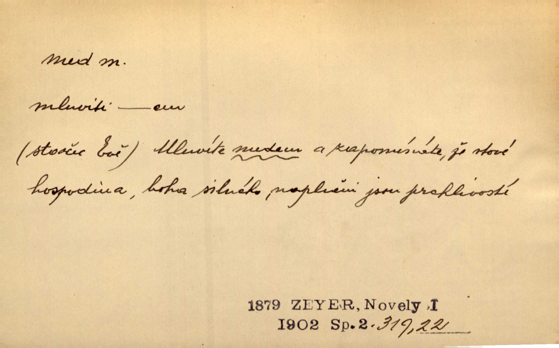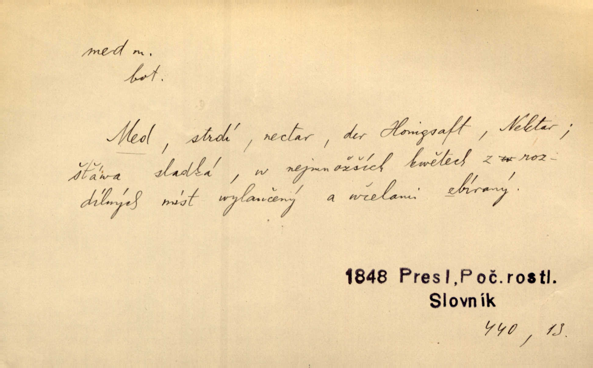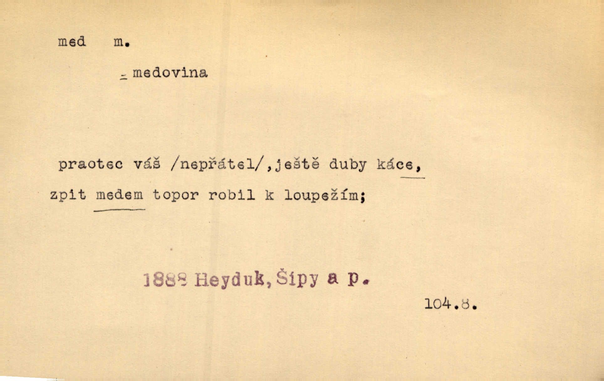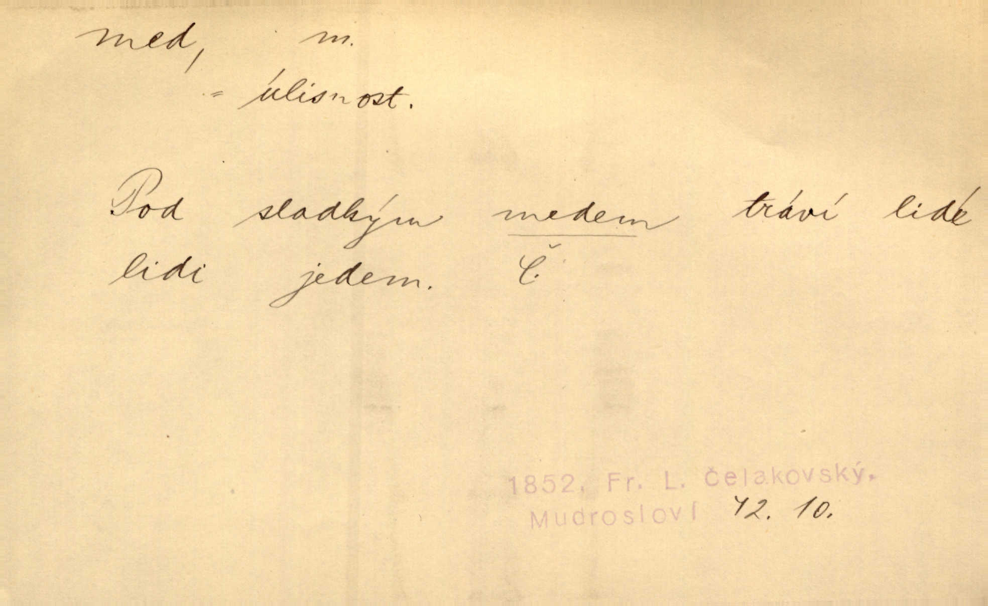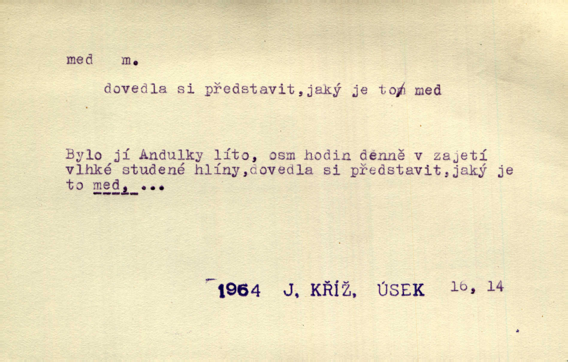 - med, -u m. sladká, hustá šťáva, kterou včely po květech sbírají, v svých útrobách uzpůsobují a ukládají do buněk v plástech. Na stolku byly dobré buchty, chléb, med, pomazánka. Něm. Pod sladkým medem tráví lidi jedem úlisností. Pořek. Od včely pochází med, od hada jed. Přísl. Tentokrát nás měla ráda sv. Hedvika, o které se říká, že do řepy ještě medu nalívá v polovici října nejvíce cukernatí řepa. A. Mrš. Přen. V stínu stromů chutná líp rtů dívčích med sladké rty. Vrch. Jenický nechal brzy všeho medu a vší laskavosti, když mu se svatovým bohatstvím zmehlo lichocení. Jir. Ustál. sp. Matka ke mně byla jako med, zvali mě, trachtili velmi přívětivá. Herrm. Je to člověk jako med vlídný, laskavý. Herb. Táhlo se to za mnou jako mouchy za medem. Baar. Slova jeho plynula lahodně jako med. Zey. Pan školní rada mluvil, jako když medu ukrajuje. Vrba. Taková hezká slečinka! Ta se vdá jako med! snadno. R. Svob. Já mu starostování ze srdce přeju. Za rok, za dva pozná, že to není med lízat, a omrzí ho příjemná věc. Vrba. Musíš se na službách protírati mezi cizími lidmi, a dobře víš, že to není žádný med. Šmil. Tu noc nebyla služba [strážníků] žádným medem. Vach. Med vám [Čechům] bude [Aeneáš Sylvius] mazat kolem úst lichotiti. Jir. Co pak teď — teď jsou [syn se ženou] ještě samej med a mandle milují se, jsou v líbánkách. Šim. Borovec byl samý cukr a med samá laskavost, velmi roztomilý. Šmil. Cukr. Turecký med halva, výrobek z pšeničné mouky, másla, medu, sesamového oleje a mandlí n. ořechů. Umělý med. Typ. slang. vysázená, ale ještě nevyplacená práce počítajícího sazeče. D medovina. Med, pivo a víno jsem tam pil. Čel. Praotec váš… zpit medem topor robil k loupežím. Heyd.