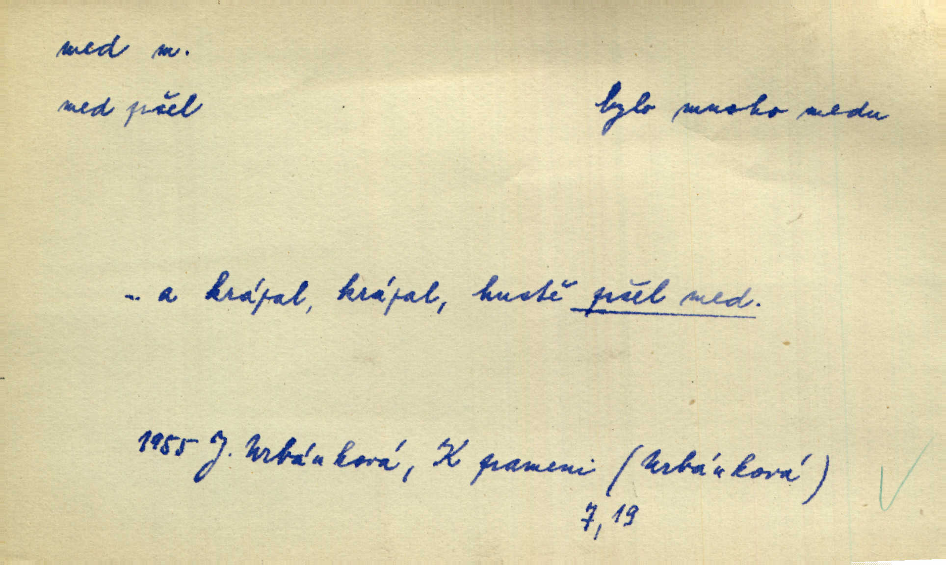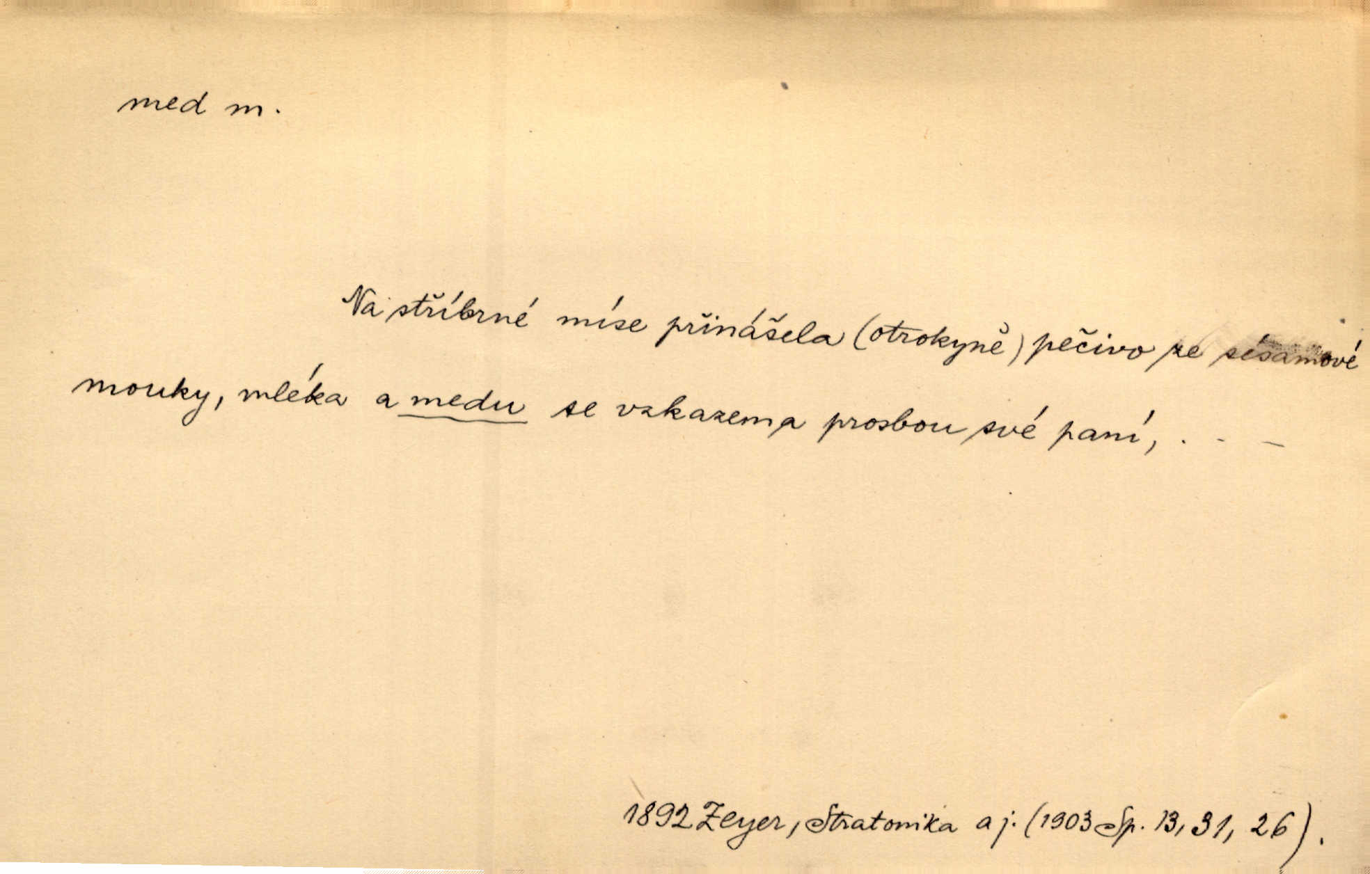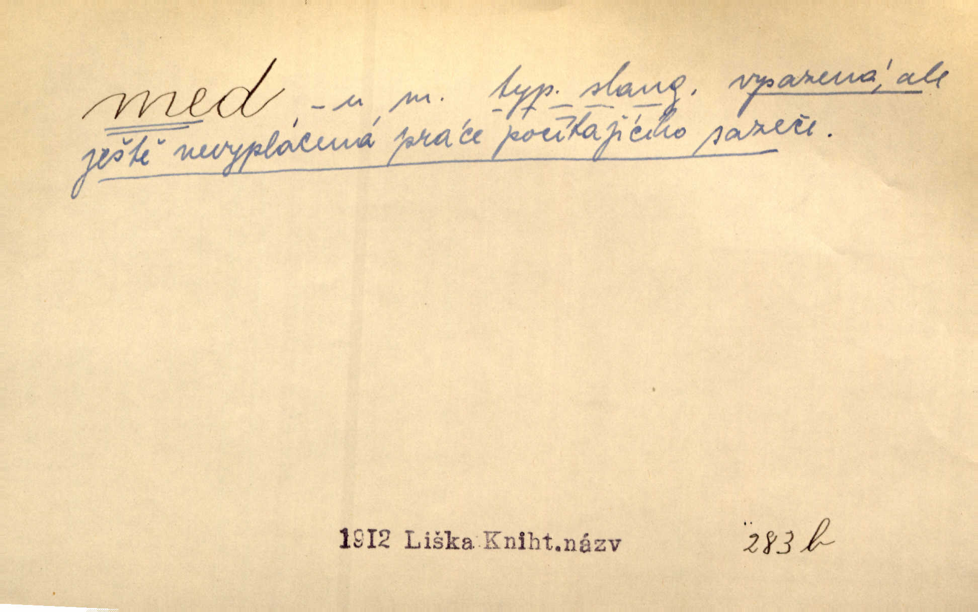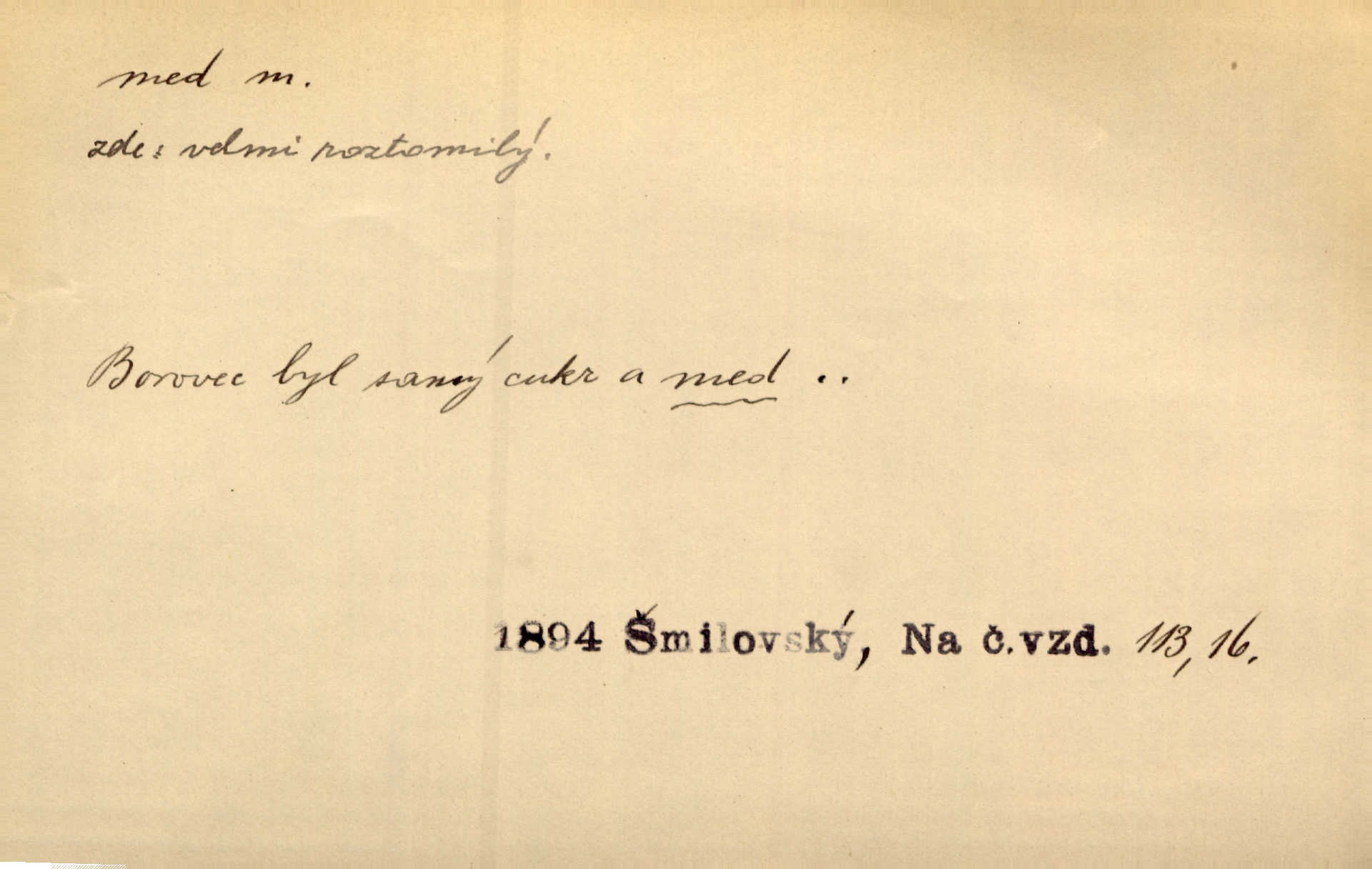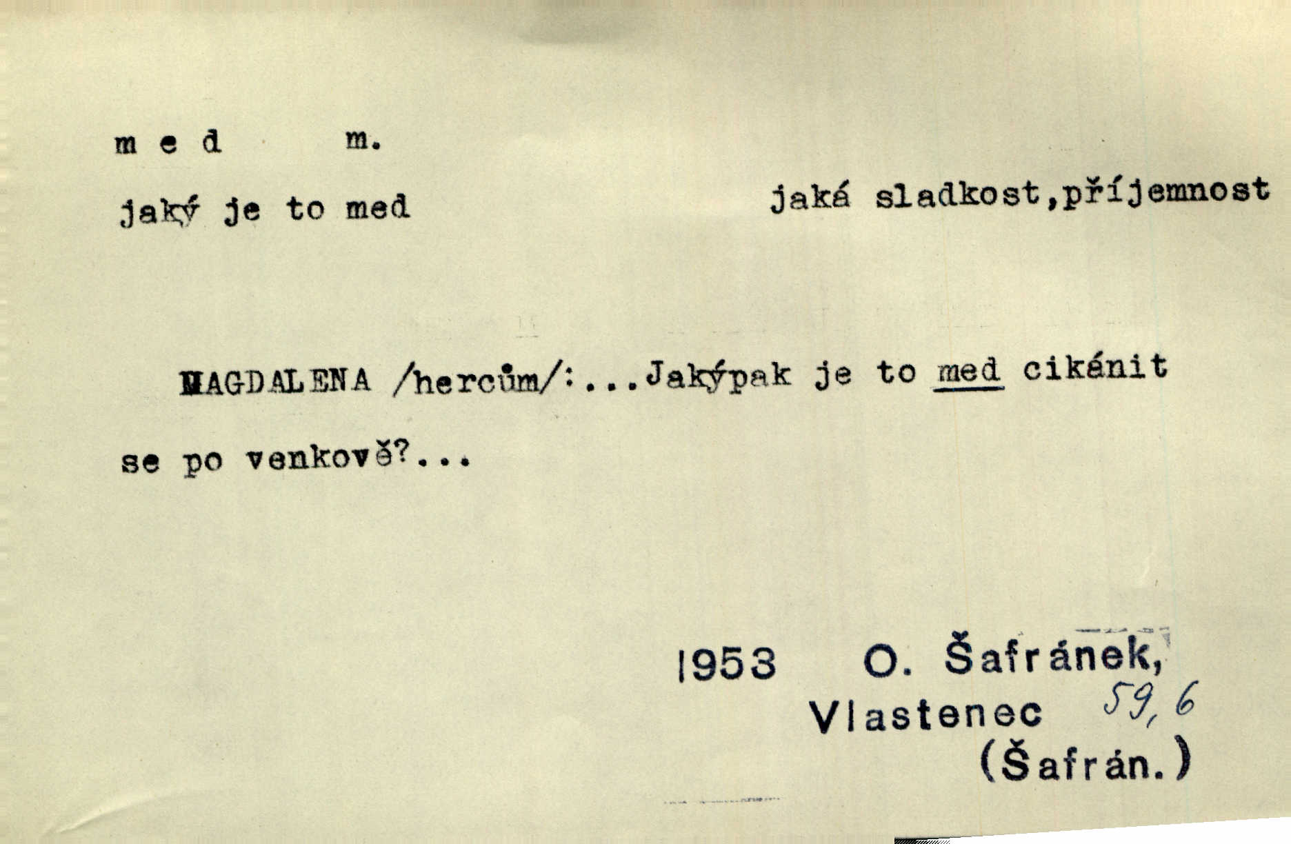 - med, -u m. sladká, hustá šťáva, kterou včely po květech sbírají, v svých útrobách uzpůsobují a ukládají do buněk v plástech. Na stolku byly dobré buchty, chléb, med, pomazánka. Něm. Pod sladkým medem tráví lidi jedem úlisností. Pořek. Od včely pochází med, od hada jed. Přísl. Tentokrát nás měla ráda sv. Hedvika, o které se říká, že do řepy ještě medu nalívá v polovici října nejvíce cukernatí řepa. A. Mrš. Přen. V stínu stromů chutná líp rtů dívčích med sladké rty. Vrch. Jenický nechal brzy všeho medu a vší laskavosti, když mu se svatovým bohatstvím zmehlo lichocení. Jir. Ustál. sp. Matka ke mně byla jako med, zvali mě, trachtili velmi přívětivá. Herrm. Je to člověk jako med vlídný, laskavý. Herb. Táhlo se to za mnou jako mouchy za medem. Baar. Slova jeho plynula lahodně jako med. Zey. Pan školní rada mluvil, jako když medu ukrajuje. Vrba. Taková hezká slečinka! Ta se vdá jako med! snadno. R. Svob. Já mu starostování ze srdce přeju. Za rok, za dva pozná, že to není med lízat, a omrzí ho příjemná věc. Vrba. Musíš se na službách protírati mezi cizími lidmi, a dobře víš, že to není žádný med. Šmil. Tu noc nebyla služba [strážníků] žádným medem. Vach. Med vám [Čechům] bude [Aeneáš Sylvius] mazat kolem úst lichotiti. Jir. Co pak teď — teď jsou [syn se ženou] ještě samej med a mandle milují se, jsou v líbánkách. Šim. Borovec byl samý cukr a med samá laskavost, velmi roztomilý. Šmil. Cukr. Turecký med halva, výrobek z pšeničné mouky, másla, medu, sesamového oleje a mandlí n. ořechů. Umělý med. Typ. slang. vysázená, ale ještě nevyplacená práce počítajícího sazeče. D medovina. Med, pivo a víno jsem tam pil. Čel. Praotec váš… zpit medem topor robil k loupežím. Heyd.