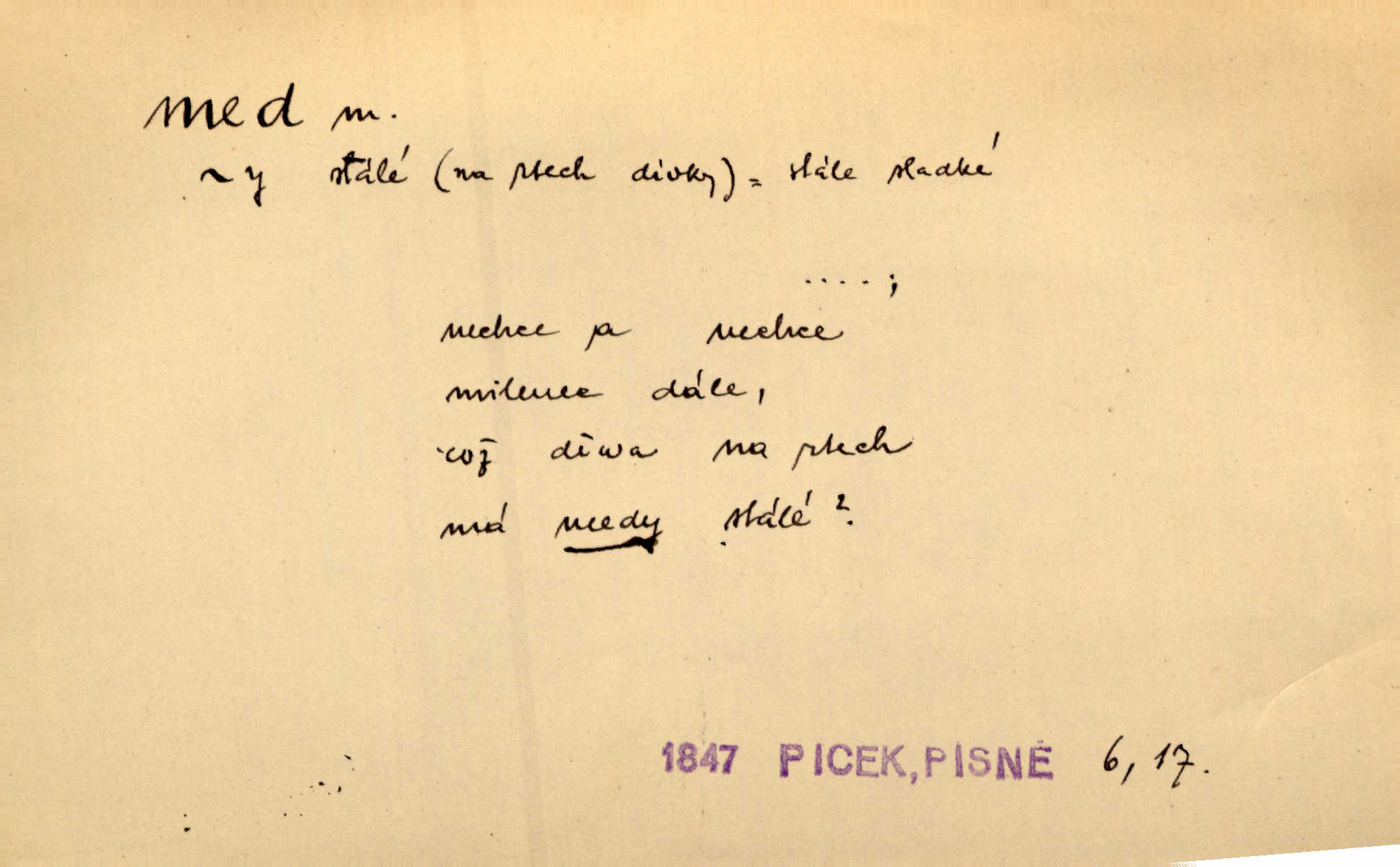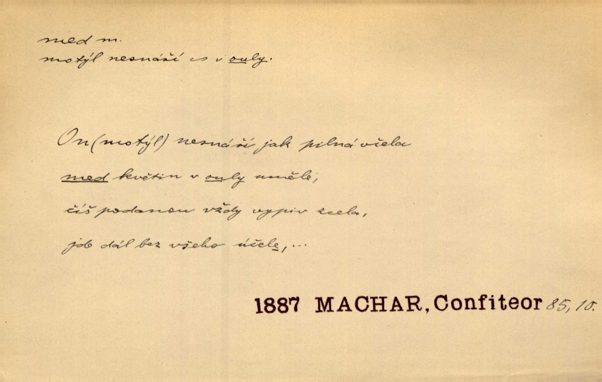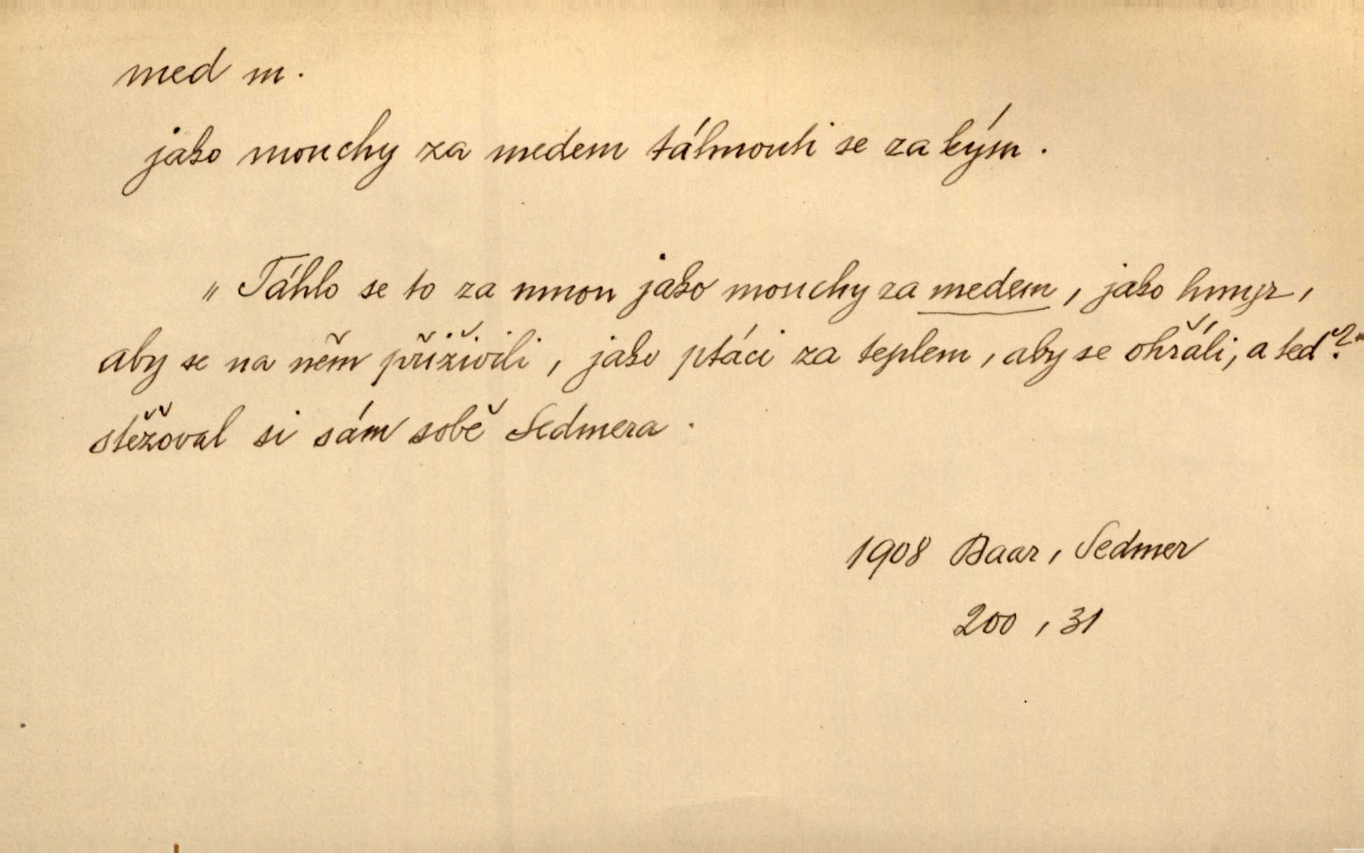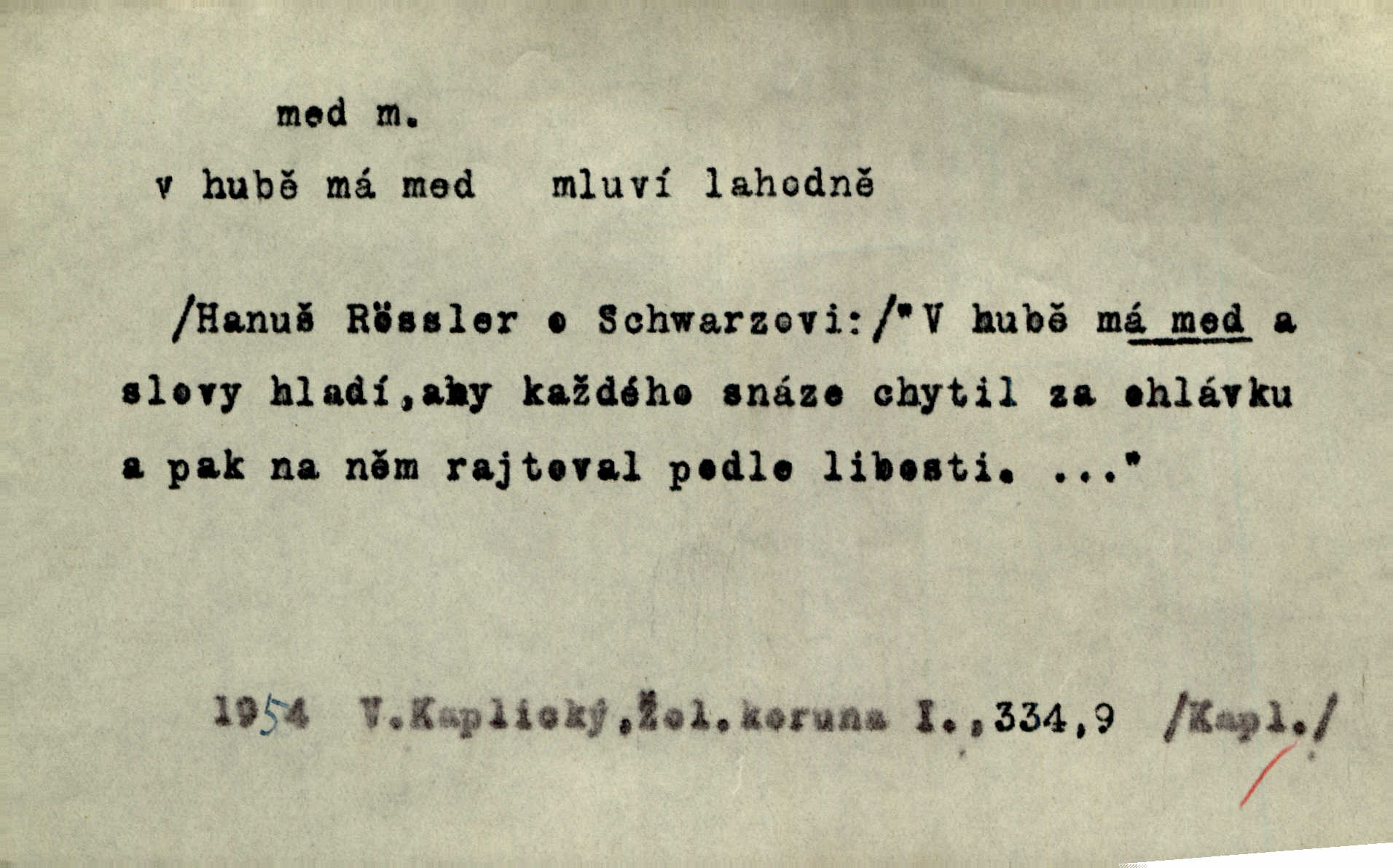 - med, -u m. sladká, hustá šťáva, kterou včely po květech sbírají, v svých útrobách uzpůsobují a ukládají do buněk v plástech. Na stolku byly dobré buchty, chléb, med, pomazánka. Něm. Pod sladkým medem tráví lidi jedem úlisností. Pořek. Od včely pochází med, od hada jed. Přísl. Tentokrát nás měla ráda sv. Hedvika, o které se říká, že do řepy ještě medu nalívá v polovici října nejvíce cukernatí řepa. A. Mrš. Přen. V stínu stromů chutná líp rtů dívčích med sladké rty. Vrch. Jenický nechal brzy všeho medu a vší laskavosti, když mu se svatovým bohatstvím zmehlo lichocení. Jir. Ustál. sp. Matka ke mně byla jako med, zvali mě, trachtili velmi přívětivá. Herrm. Je to člověk jako med vlídný, laskavý. Herb. Táhlo se to za mnou jako mouchy za medem. Baar. Slova jeho plynula lahodně jako med. Zey. Pan školní rada mluvil, jako když medu ukrajuje. Vrba. Taková hezká slečinka! Ta se vdá jako med! snadno. R. Svob. Já mu starostování ze srdce přeju. Za rok, za dva pozná, že to není med lízat, a omrzí ho příjemná věc. Vrba. Musíš se na službách protírati mezi cizími lidmi, a dobře víš, že to není žádný med. Šmil. Tu noc nebyla služba [strážníků] žádným medem. Vach. Med vám [Čechům] bude [Aeneáš Sylvius] mazat kolem úst lichotiti. Jir. Co pak teď — teď jsou [syn se ženou] ještě samej med a mandle milují se, jsou v líbánkách. Šim. Borovec byl samý cukr a med samá laskavost, velmi roztomilý. Šmil. Cukr. Turecký med halva, výrobek z pšeničné mouky, másla, medu, sesamového oleje a mandlí n. ořechů. Umělý med. Typ. slang. vysázená, ale ještě nevyplacená práce počítajícího sazeče. D medovina. Med, pivo a víno jsem tam pil. Čel. Praotec váš… zpit medem topor robil k loupežím. Heyd.