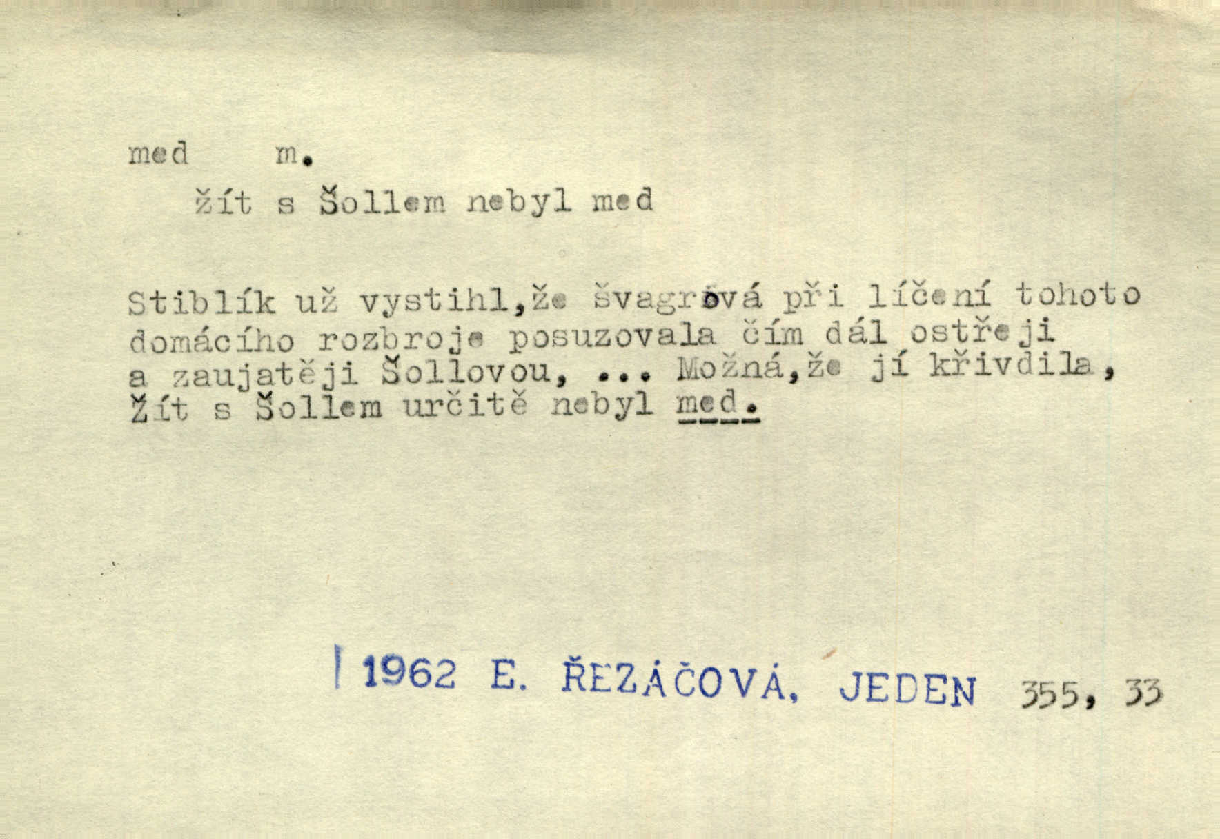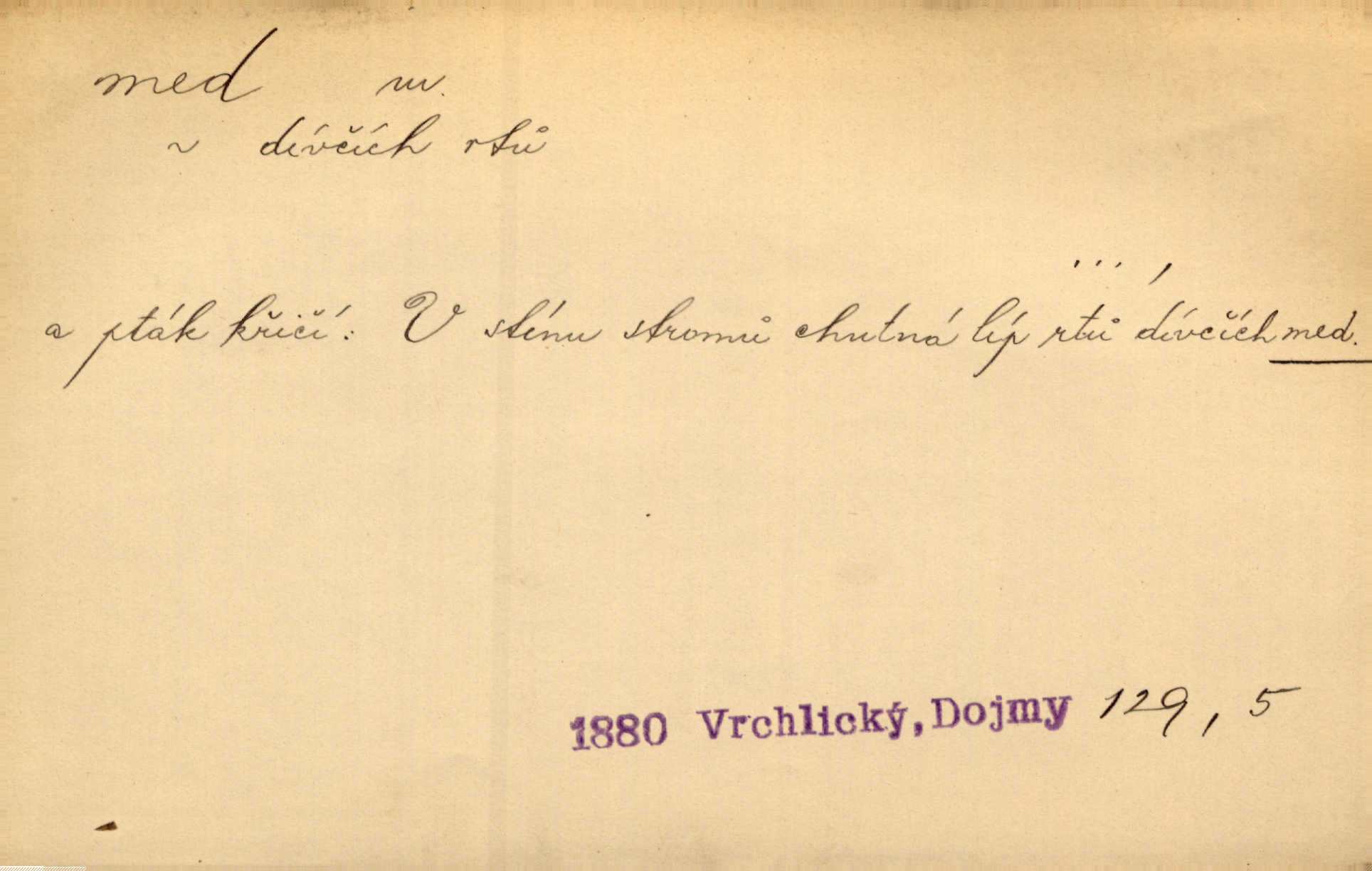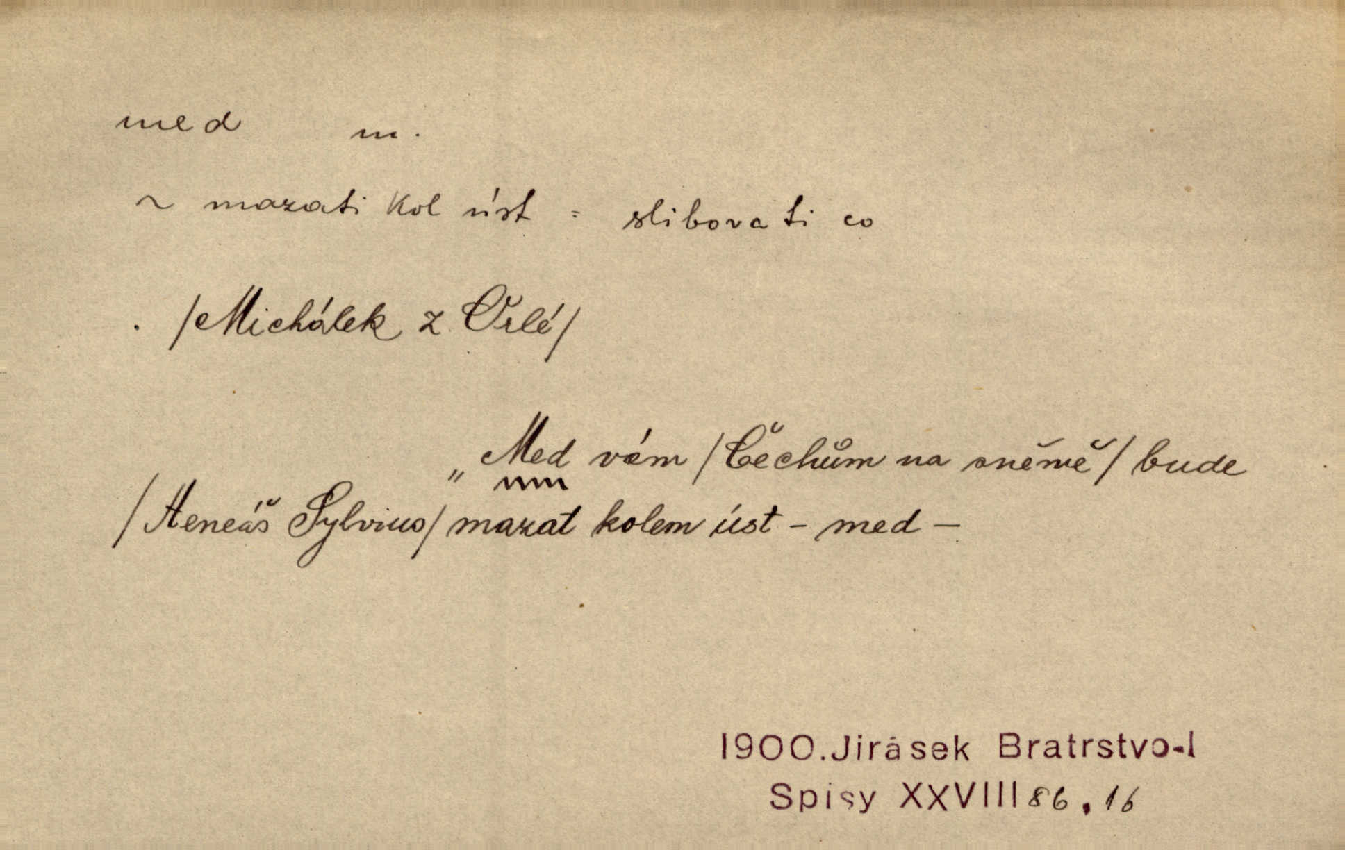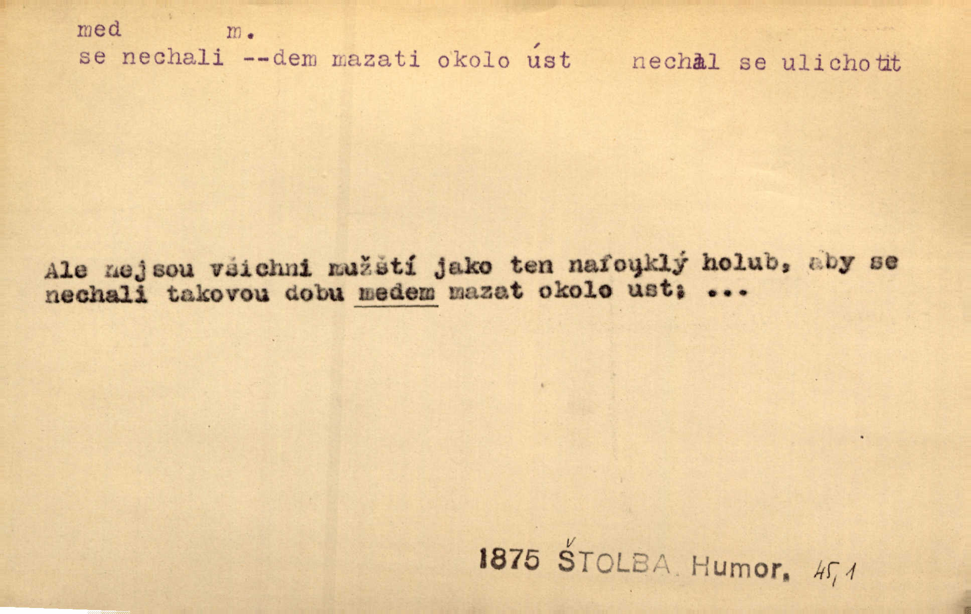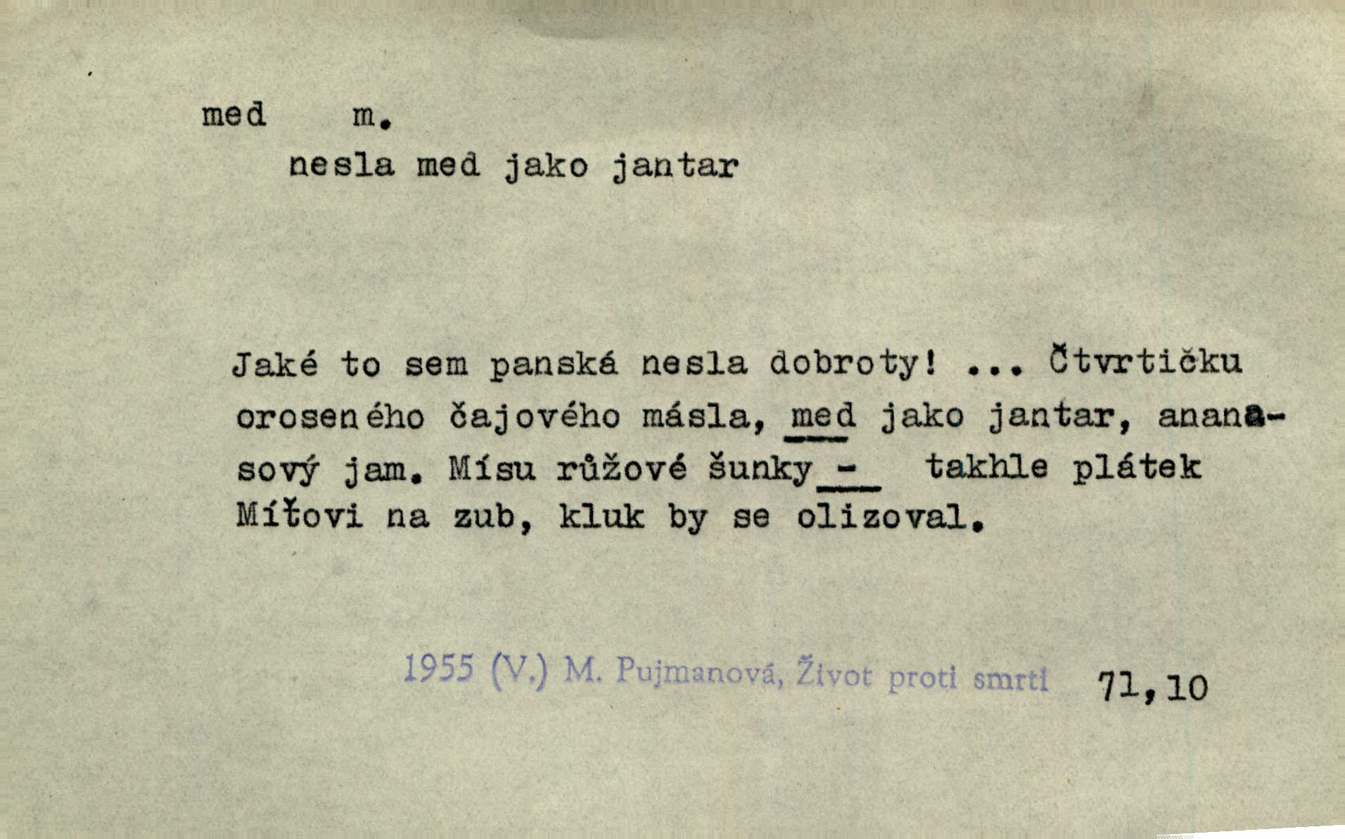 - med, -u m. sladká, hustá šťáva, kterou včely po květech sbírají, v svých útrobách uzpůsobují a ukládají do buněk v plástech. Na stolku byly dobré buchty, chléb, med, pomazánka. Něm. Pod sladkým medem tráví lidi jedem úlisností. Pořek. Od včely pochází med, od hada jed. Přísl. Tentokrát nás měla ráda sv. Hedvika, o které se říká, že do řepy ještě medu nalívá v polovici října nejvíce cukernatí řepa. A. Mrš. Přen. V stínu stromů chutná líp rtů dívčích med sladké rty. Vrch. Jenický nechal brzy všeho medu a vší laskavosti, když mu se svatovým bohatstvím zmehlo lichocení. Jir. Ustál. sp. Matka ke mně byla jako med, zvali mě, trachtili velmi přívětivá. Herrm. Je to člověk jako med vlídný, laskavý. Herb. Táhlo se to za mnou jako mouchy za medem. Baar. Slova jeho plynula lahodně jako med. Zey. Pan školní rada mluvil, jako když medu ukrajuje. Vrba. Taková hezká slečinka! Ta se vdá jako med! snadno. R. Svob. Já mu starostování ze srdce přeju. Za rok, za dva pozná, že to není med lízat, a omrzí ho příjemná věc. Vrba. Musíš se na službách protírati mezi cizími lidmi, a dobře víš, že to není žádný med. Šmil. Tu noc nebyla služba [strážníků] žádným medem. Vach. Med vám [Čechům] bude [Aeneáš Sylvius] mazat kolem úst lichotiti. Jir. Co pak teď — teď jsou [syn se ženou] ještě samej med a mandle milují se, jsou v líbánkách. Šim. Borovec byl samý cukr a med samá laskavost, velmi roztomilý. Šmil. Cukr. Turecký med halva, výrobek z pšeničné mouky, másla, medu, sesamového oleje a mandlí n. ořechů. Umělý med. Typ. slang. vysázená, ale ještě nevyplacená práce počítajícího sazeče. D medovina. Med, pivo a víno jsem tam pil. Čel. Praotec váš… zpit medem topor robil k loupežím. Heyd.