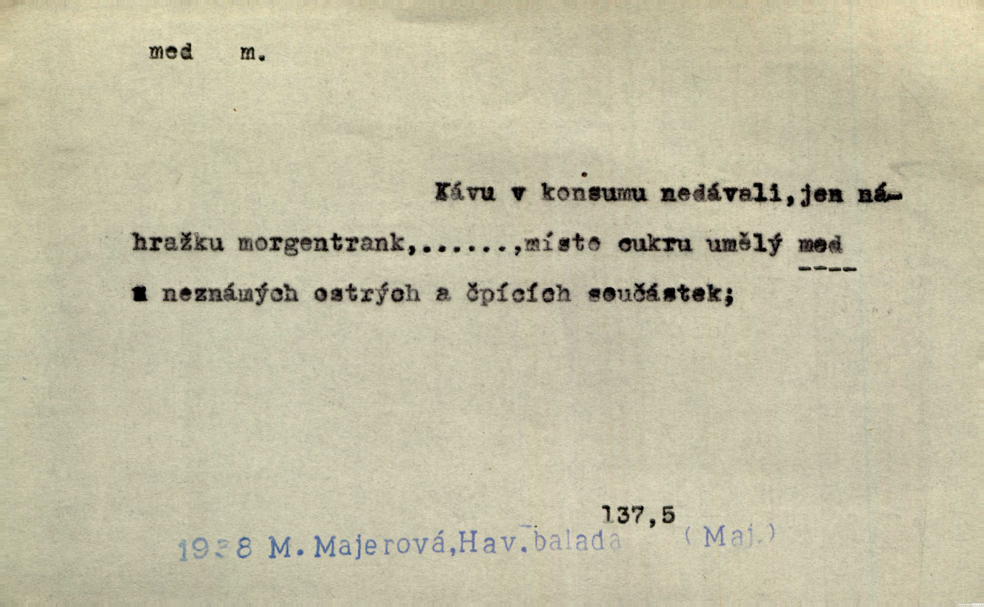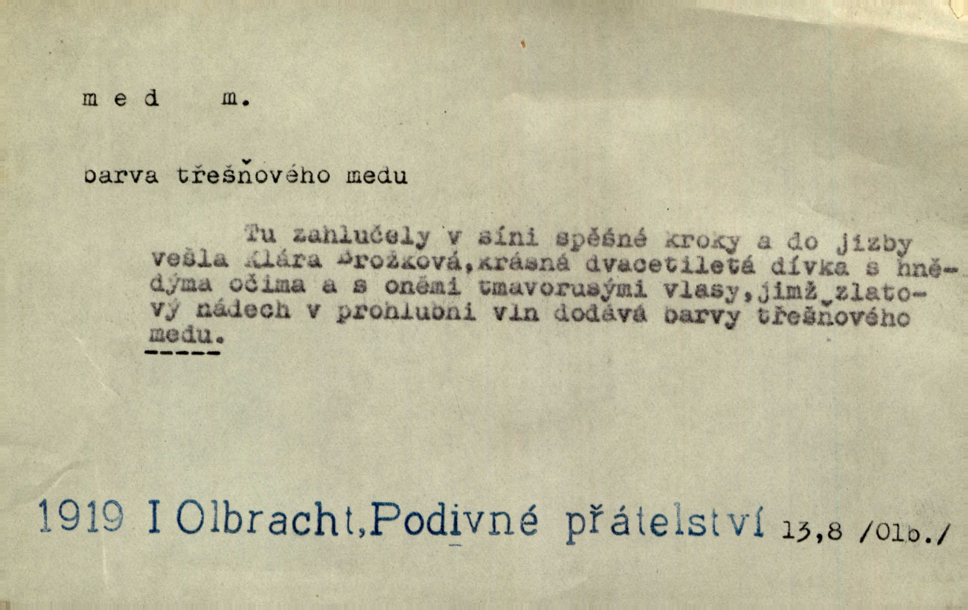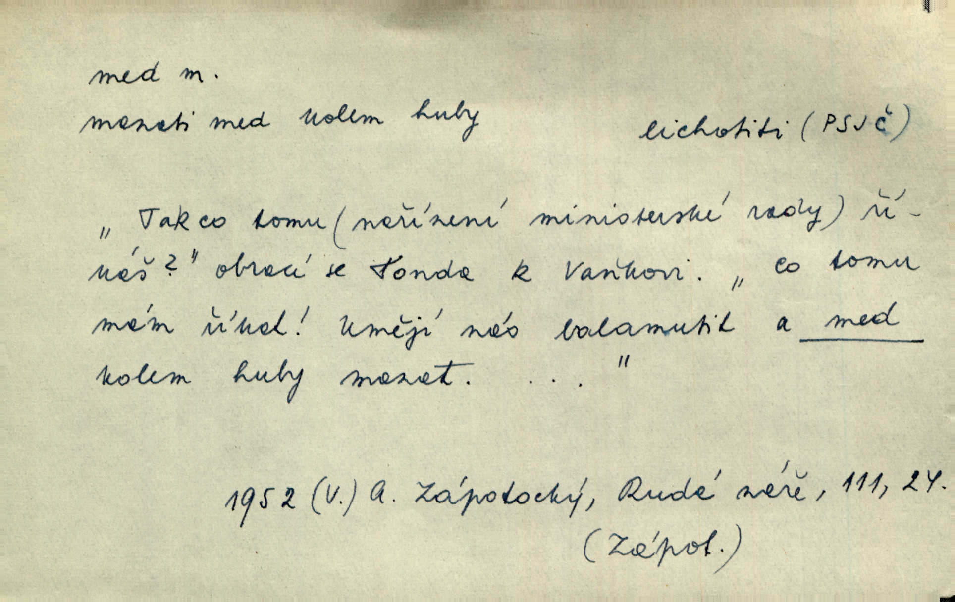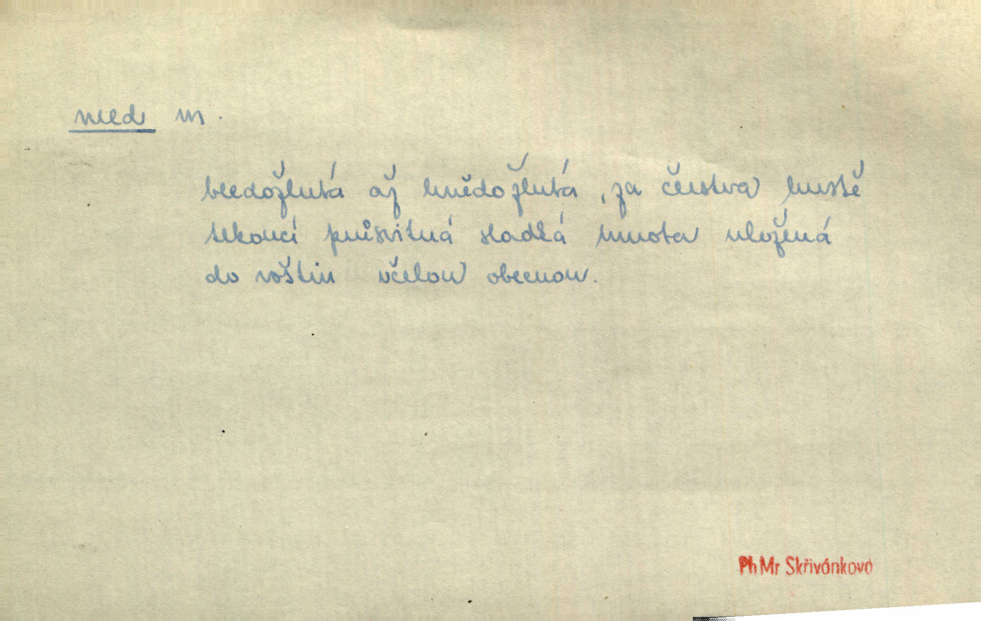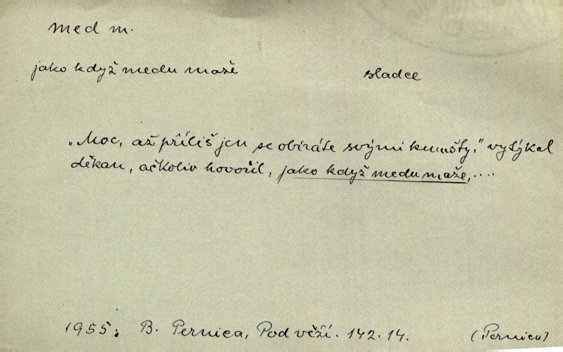 - med, -u m. sladká, hustá šťáva, kterou včely po květech sbírají, v svých útrobách uzpůsobují a ukládají do buněk v plástech. Na stolku byly dobré buchty, chléb, med, pomazánka. Něm. Pod sladkým medem tráví lidi jedem úlisností. Pořek. Od včely pochází med, od hada jed. Přísl. Tentokrát nás měla ráda sv. Hedvika, o které se říká, že do řepy ještě medu nalívá v polovici října nejvíce cukernatí řepa. A. Mrš. Přen. V stínu stromů chutná líp rtů dívčích med sladké rty. Vrch. Jenický nechal brzy všeho medu a vší laskavosti, když mu se svatovým bohatstvím zmehlo lichocení. Jir. Ustál. sp. Matka ke mně byla jako med, zvali mě, trachtili velmi přívětivá. Herrm. Je to člověk jako med vlídný, laskavý. Herb. Táhlo se to za mnou jako mouchy za medem. Baar. Slova jeho plynula lahodně jako med. Zey. Pan školní rada mluvil, jako když medu ukrajuje. Vrba. Taková hezká slečinka! Ta se vdá jako med! snadno. R. Svob. Já mu starostování ze srdce přeju. Za rok, za dva pozná, že to není med lízat, a omrzí ho příjemná věc. Vrba. Musíš se na službách protírati mezi cizími lidmi, a dobře víš, že to není žádný med. Šmil. Tu noc nebyla služba [strážníků] žádným medem. Vach. Med vám [Čechům] bude [Aeneáš Sylvius] mazat kolem úst lichotiti. Jir. Co pak teď — teď jsou [syn se ženou] ještě samej med a mandle milují se, jsou v líbánkách. Šim. Borovec byl samý cukr a med samá laskavost, velmi roztomilý. Šmil. Cukr. Turecký med halva, výrobek z pšeničné mouky, másla, medu, sesamového oleje a mandlí n. ořechů. Umělý med. Typ. slang. vysázená, ale ještě nevyplacená práce počítajícího sazeče. D medovina. Med, pivo a víno jsem tam pil. Čel. Praotec váš… zpit medem topor robil k loupežím. Heyd.