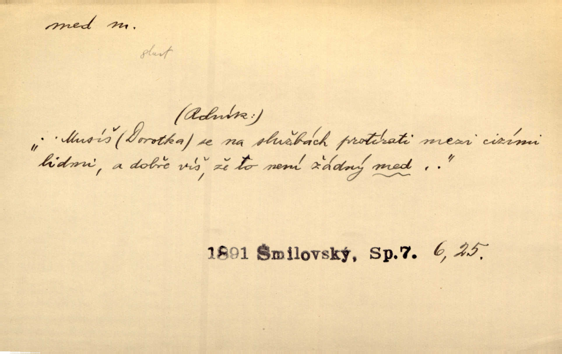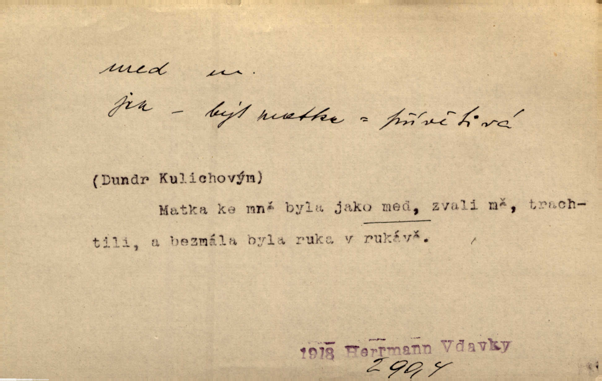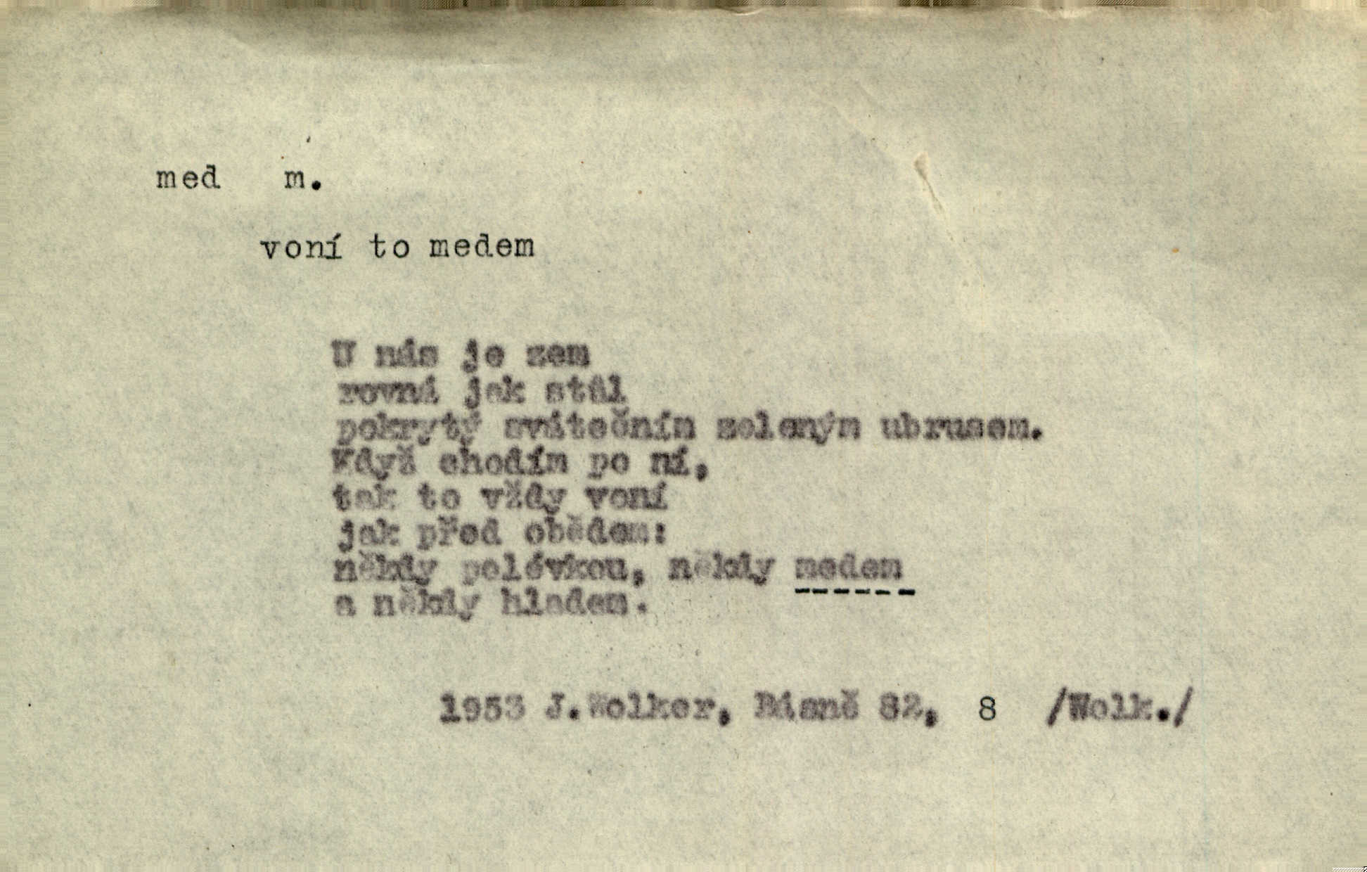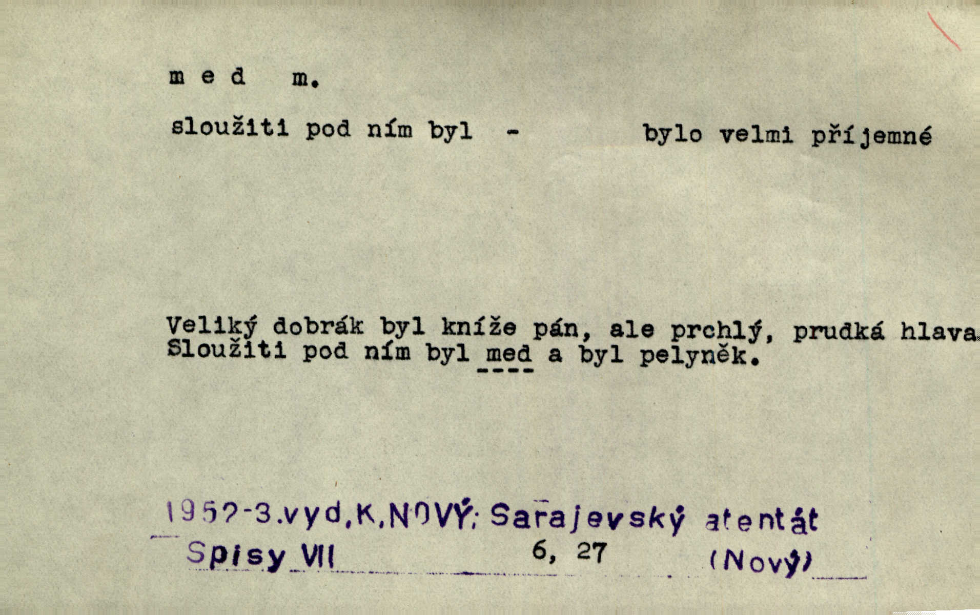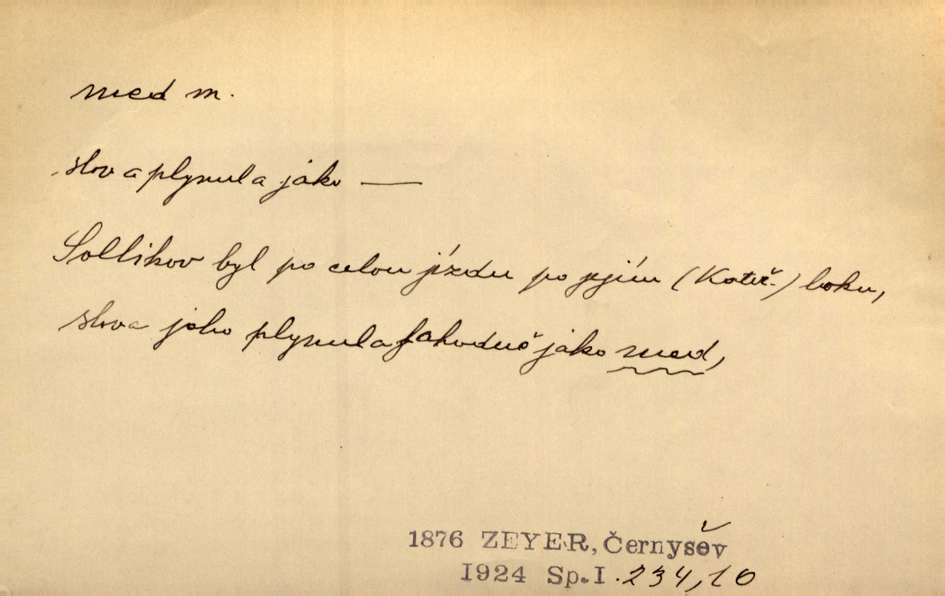- med, -u m. sladká, hustá šťáva, kterou včely po květech sbírají, v svých útrobách uzpůsobují a ukládají do buněk v plástech. Na stolku byly dobré buchty, chléb, med, pomazánka. Něm. Pod sladkým medem tráví lidi jedem úlisností. Pořek. Od včely pochází med, od hada jed. Přísl. Tentokrát nás měla ráda sv. Hedvika, o které se říká, že do řepy ještě medu nalívá v polovici října nejvíce cukernatí řepa. A. Mrš. Přen. V stínu stromů chutná líp rtů dívčích med sladké rty. Vrch. Jenický nechal brzy všeho medu a vší laskavosti, když mu se svatovým bohatstvím zmehlo lichocení. Jir. Ustál. sp. Matka ke mně byla jako med, zvali mě, trachtili velmi přívětivá. Herrm. Je to člověk jako med vlídný, laskavý. Herb. Táhlo se to za mnou jako mouchy za medem. Baar. Slova jeho plynula lahodně jako med. Zey. Pan školní rada mluvil, jako když medu ukrajuje. Vrba. Taková hezká slečinka! Ta se vdá jako med! snadno. R. Svob. Já mu starostování ze srdce přeju. Za rok, za dva pozná, že to není med lízat, a omrzí ho příjemná věc. Vrba. Musíš se na službách protírati mezi cizími lidmi, a dobře víš, že to není žádný med. Šmil. Tu noc nebyla služba [strážníků] žádným medem. Vach. Med vám [Čechům] bude [Aeneáš Sylvius] mazat kolem úst lichotiti. Jir. Co pak teď — teď jsou [syn se ženou] ještě samej med a mandle milují se, jsou v líbánkách. Šim. Borovec byl samý cukr a med samá laskavost, velmi roztomilý. Šmil. Cukr. Turecký med halva, výrobek z pšeničné mouky, másla, medu, sesamového oleje a mandlí n. ořechů. Umělý med. Typ. slang. vysázená, ale ještě nevyplacená práce počítajícího sazeče. D medovina. Med, pivo a víno jsem tam pil. Čel. Praotec váš… zpit medem topor robil k loupežím. Heyd.