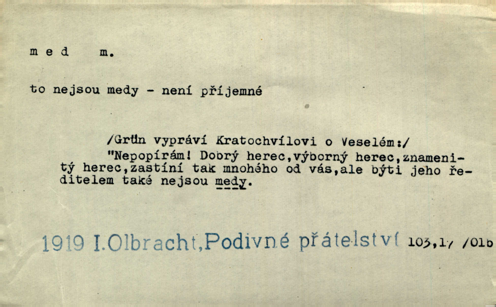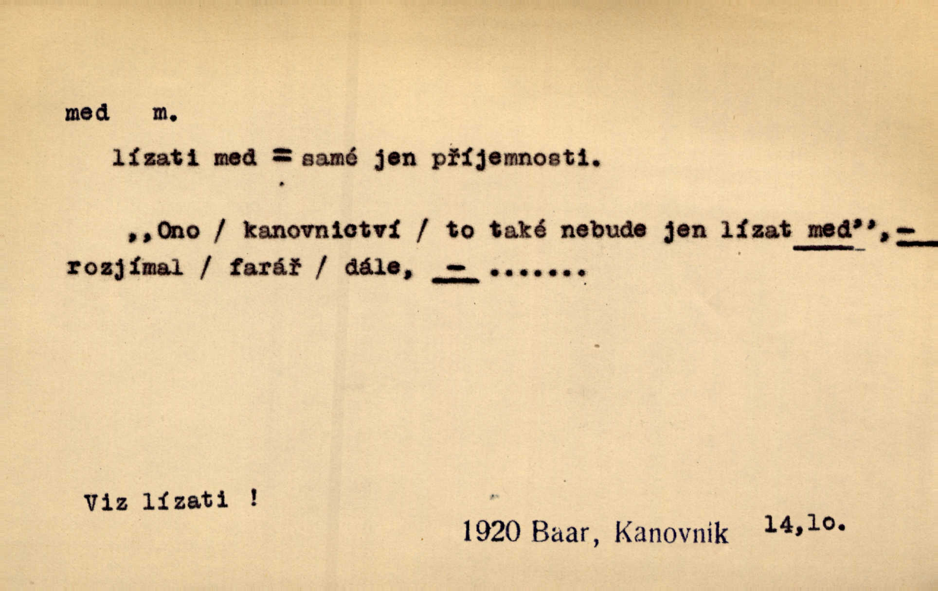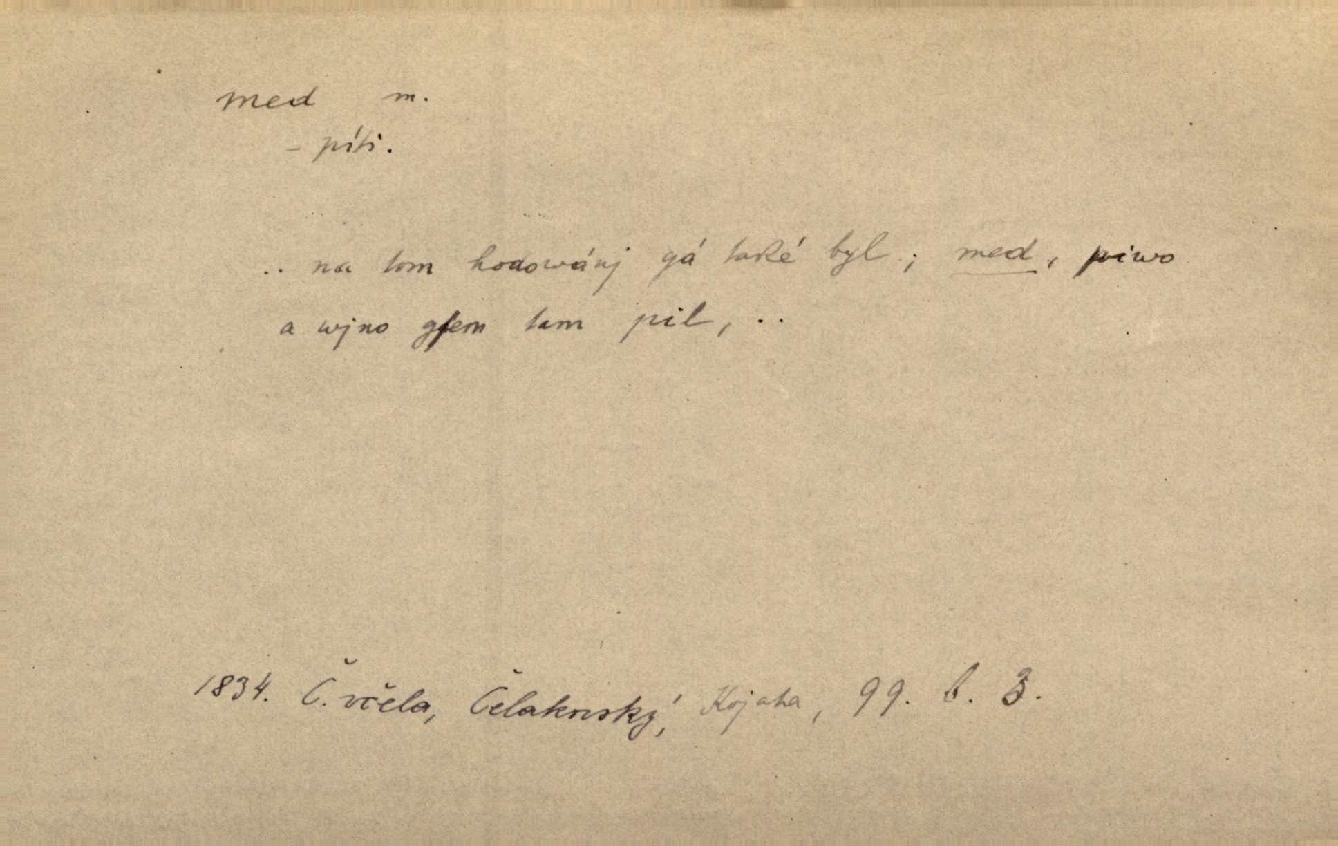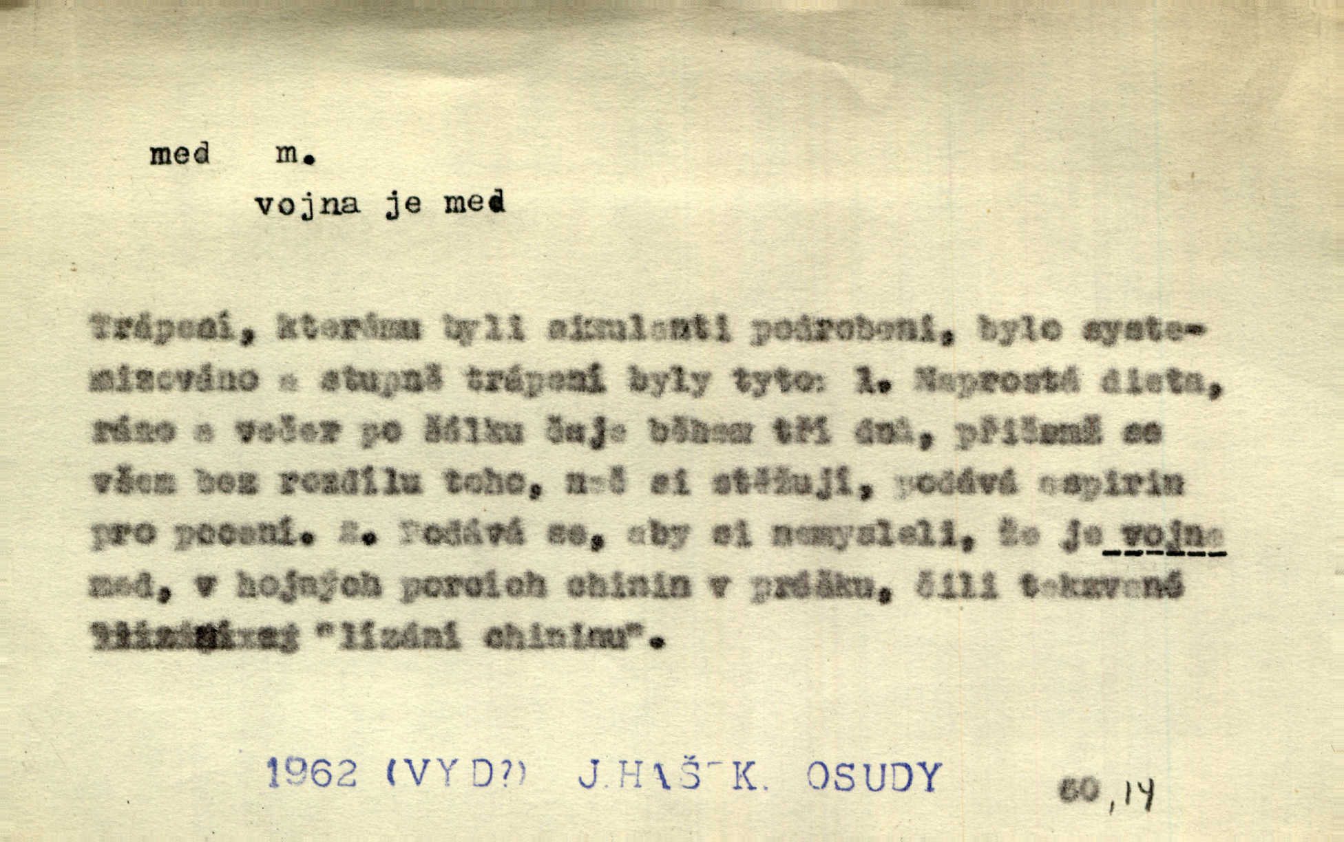 - med, -u m. sladká, hustá šťáva, kterou včely po květech sbírají, v svých útrobách uzpůsobují a ukládají do buněk v plástech. Na stolku byly dobré buchty, chléb, med, pomazánka. Něm. Pod sladkým medem tráví lidi jedem úlisností. Pořek. Od včely pochází med, od hada jed. Přísl. Tentokrát nás měla ráda sv. Hedvika, o které se říká, že do řepy ještě medu nalívá v polovici října nejvíce cukernatí řepa. A. Mrš. Přen. V stínu stromů chutná líp rtů dívčích med sladké rty. Vrch. Jenický nechal brzy všeho medu a vší laskavosti, když mu se svatovým bohatstvím zmehlo lichocení. Jir. Ustál. sp. Matka ke mně byla jako med, zvali mě, trachtili velmi přívětivá. Herrm. Je to člověk jako med vlídný, laskavý. Herb. Táhlo se to za mnou jako mouchy za medem. Baar. Slova jeho plynula lahodně jako med. Zey. Pan školní rada mluvil, jako když medu ukrajuje. Vrba. Taková hezká slečinka! Ta se vdá jako med! snadno. R. Svob. Já mu starostování ze srdce přeju. Za rok, za dva pozná, že to není med lízat, a omrzí ho příjemná věc. Vrba. Musíš se na službách protírati mezi cizími lidmi, a dobře víš, že to není žádný med. Šmil. Tu noc nebyla služba [strážníků] žádným medem. Vach. Med vám [Čechům] bude [Aeneáš Sylvius] mazat kolem úst lichotiti. Jir. Co pak teď — teď jsou [syn se ženou] ještě samej med a mandle milují se, jsou v líbánkách. Šim. Borovec byl samý cukr a med samá laskavost, velmi roztomilý. Šmil. Cukr. Turecký med halva, výrobek z pšeničné mouky, másla, medu, sesamového oleje a mandlí n. ořechů. Umělý med. Typ. slang. vysázená, ale ještě nevyplacená práce počítajícího sazeče. D medovina. Med, pivo a víno jsem tam pil. Čel. Praotec váš… zpit medem topor robil k loupežím. Heyd.