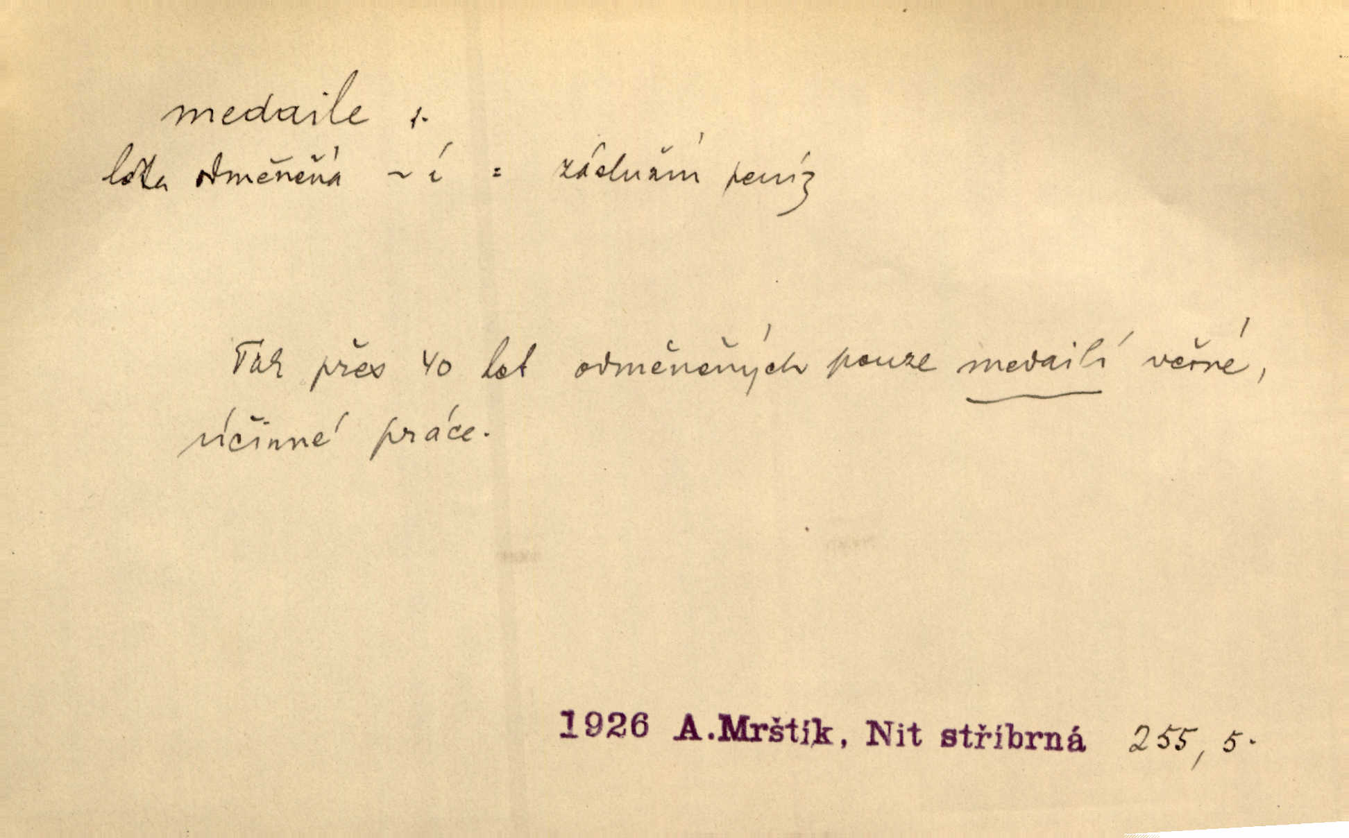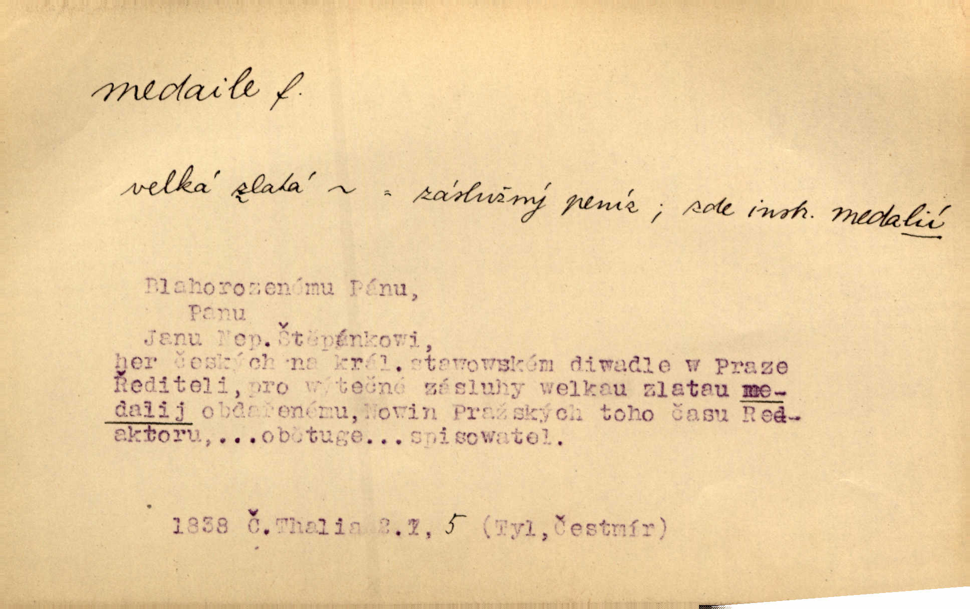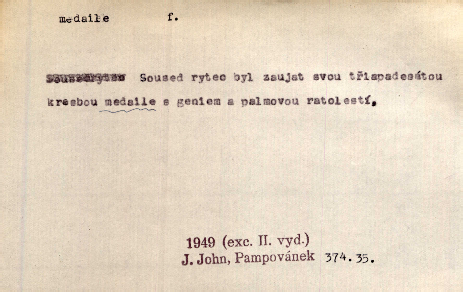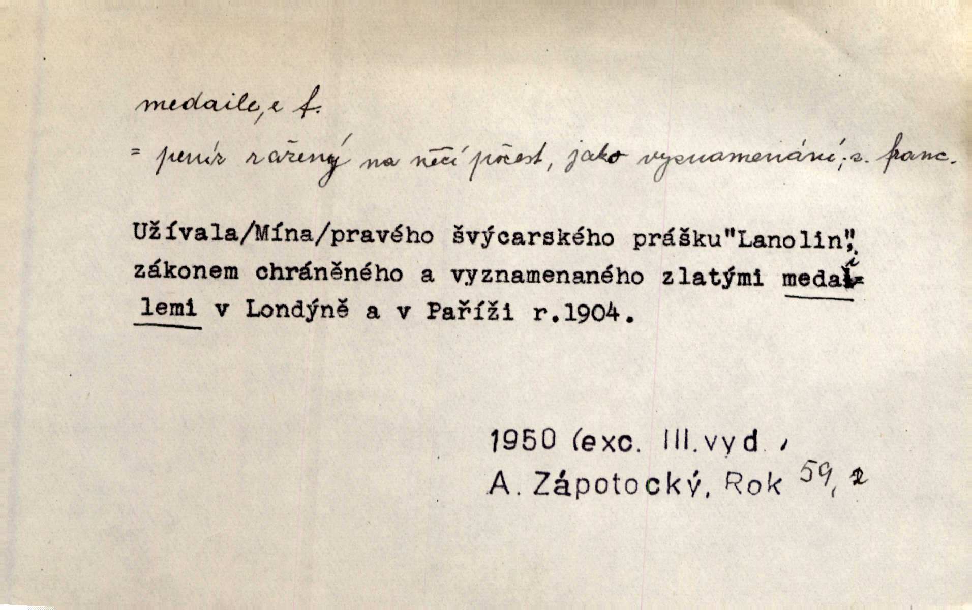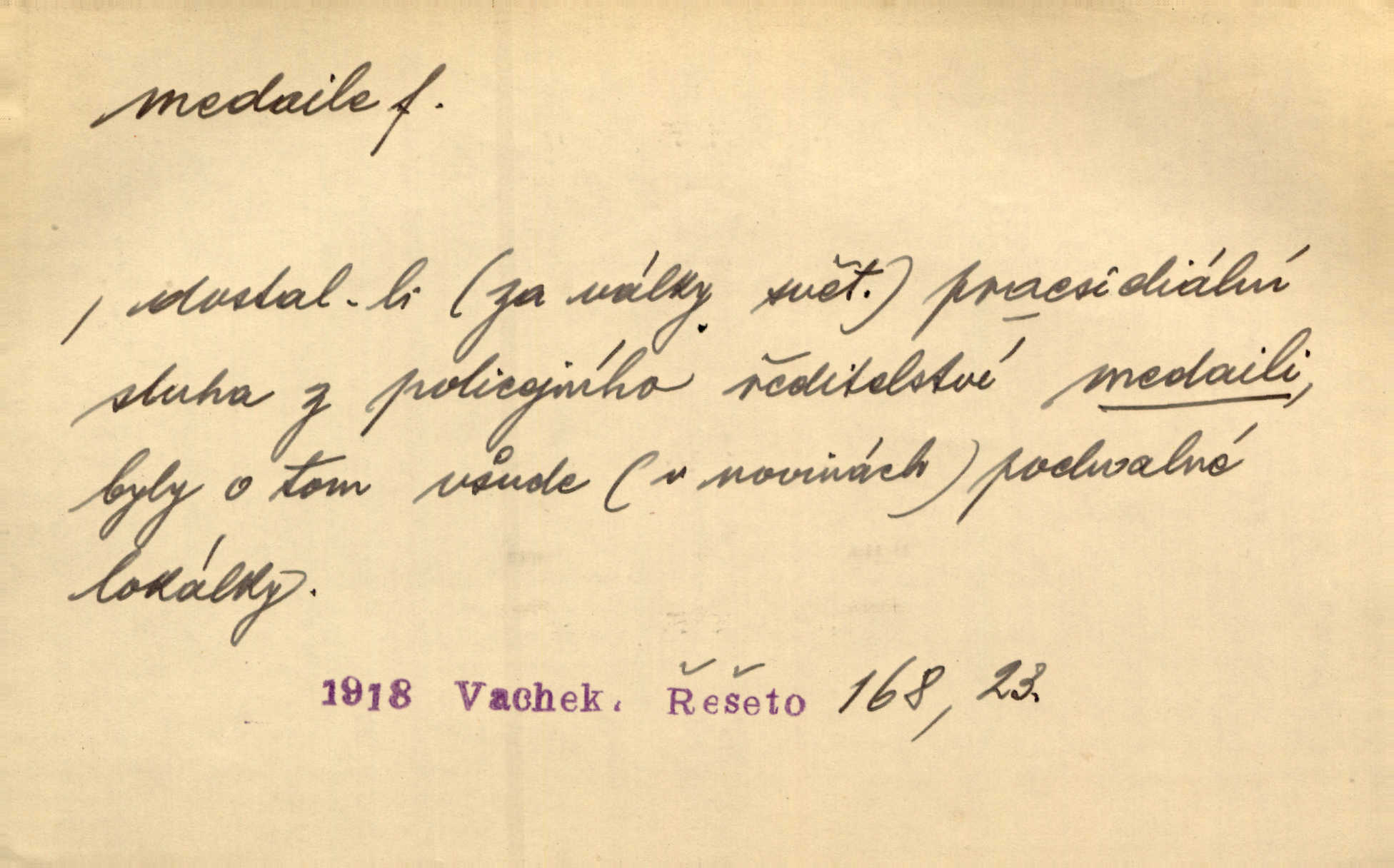 - medaile (lid. také medalie), -e f. záslužný peníz, vyznamenání, řád. Sedělo tam několik důstojníků, většinou s lesklými medaillemi na prsou. Jir. Premianti na gymnasiu dostávali tenkráte zlacené a postříbřené medaile. Jir. Československá revoluční medaile. Medaile vítězství. Za svou rozvahu a hrdinský skutek dostal stříbrnou medalii. Jir. Na jeho [vysloužilcově] kabátě nikdo nikdy nespatřil vojenskou válečnou medalii. Baar. D pamětní peníz. Jedná se o pomníku Janu Kollárovi a o medailli, ježto k jeho památce bude lita. Lum. Nyní ovšem přijdou také úvahy o druhé straně této medaile. Rub racionalisace je znám jako nezaměstnanost o stinné stránce této věci. Přít.