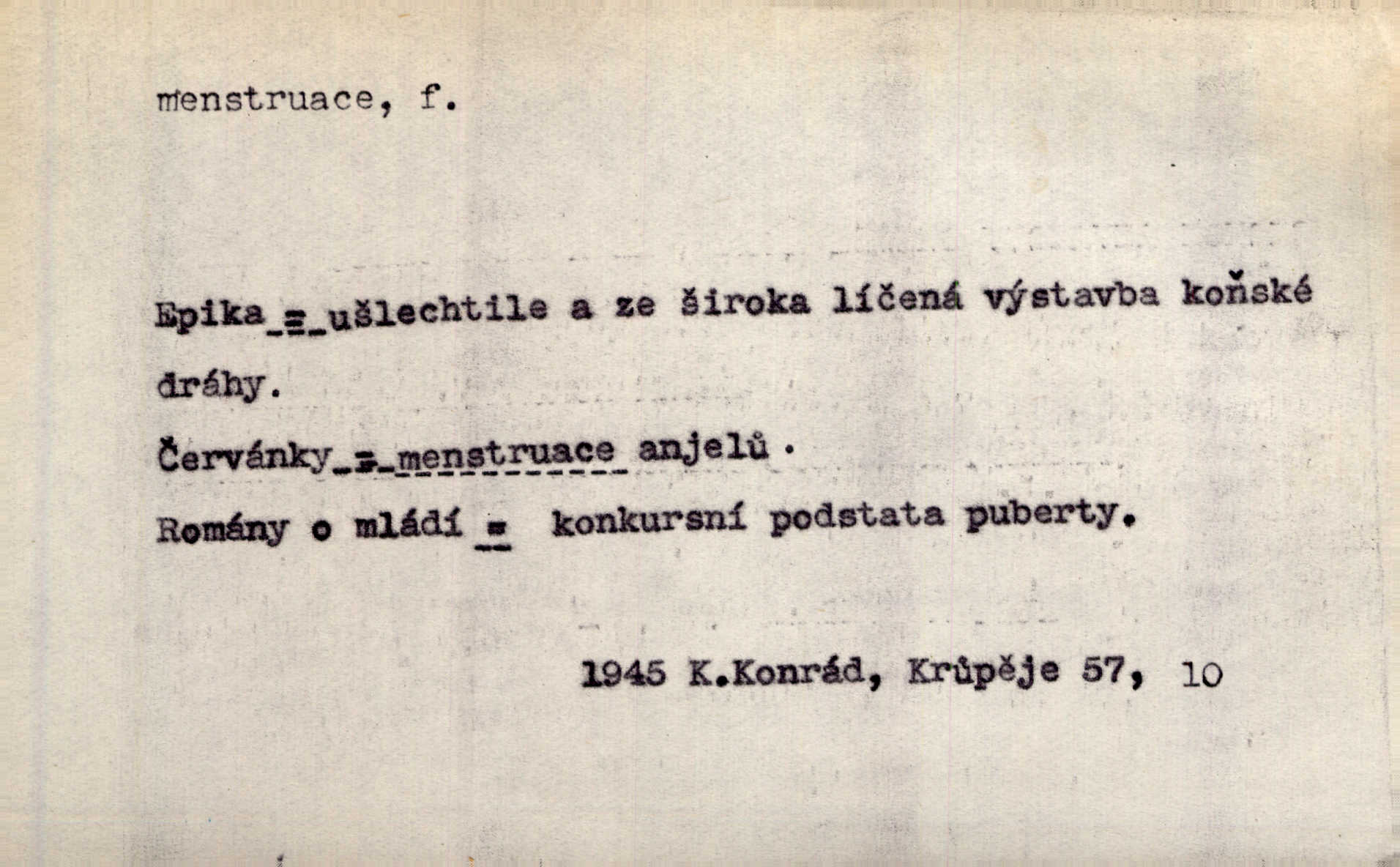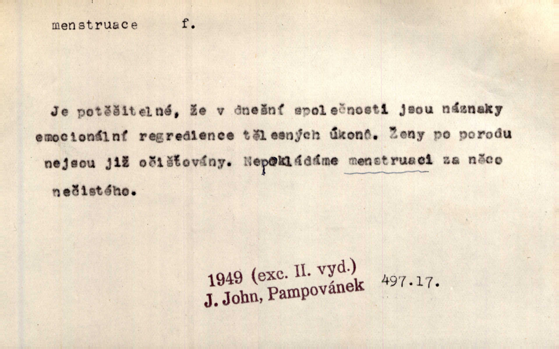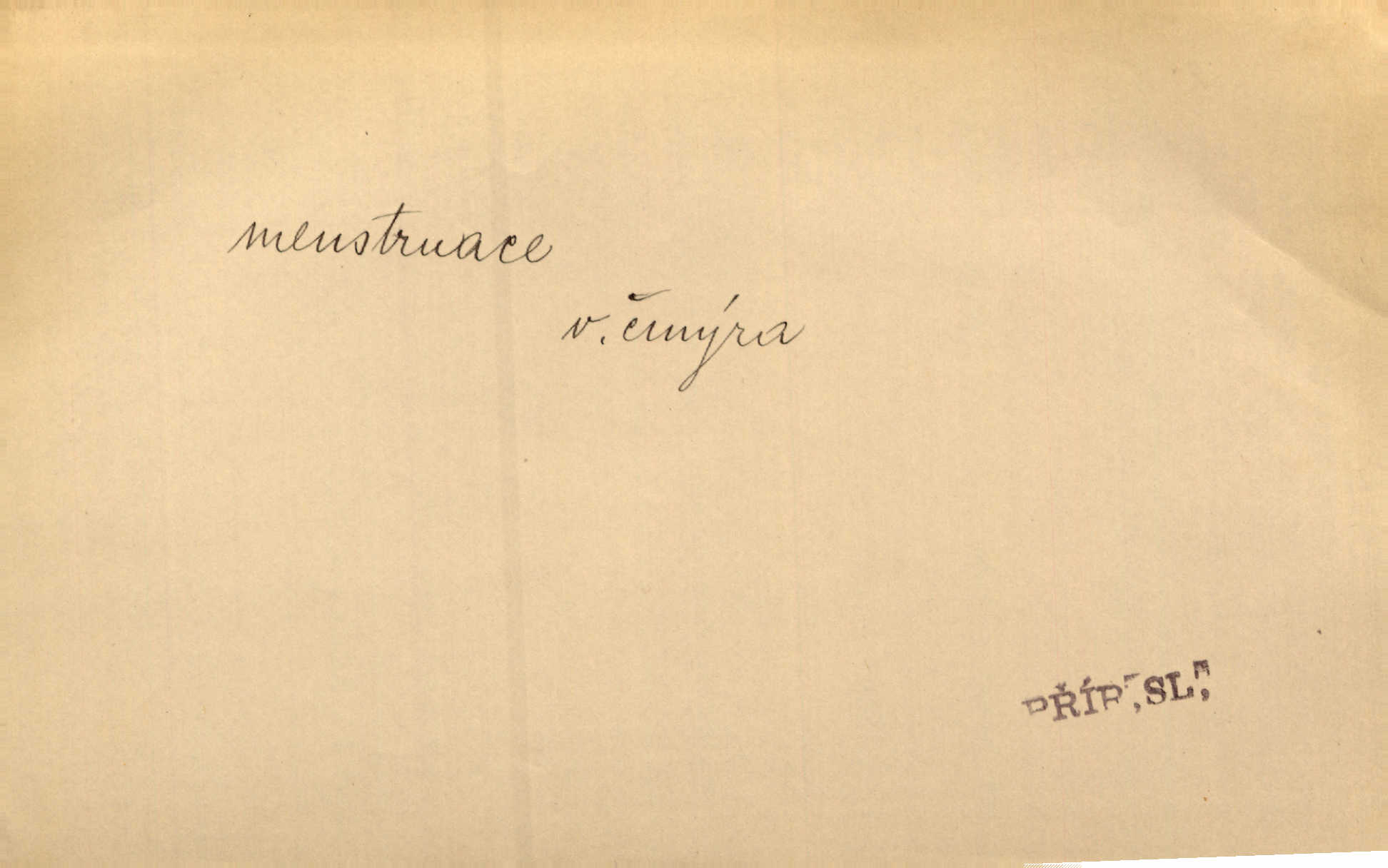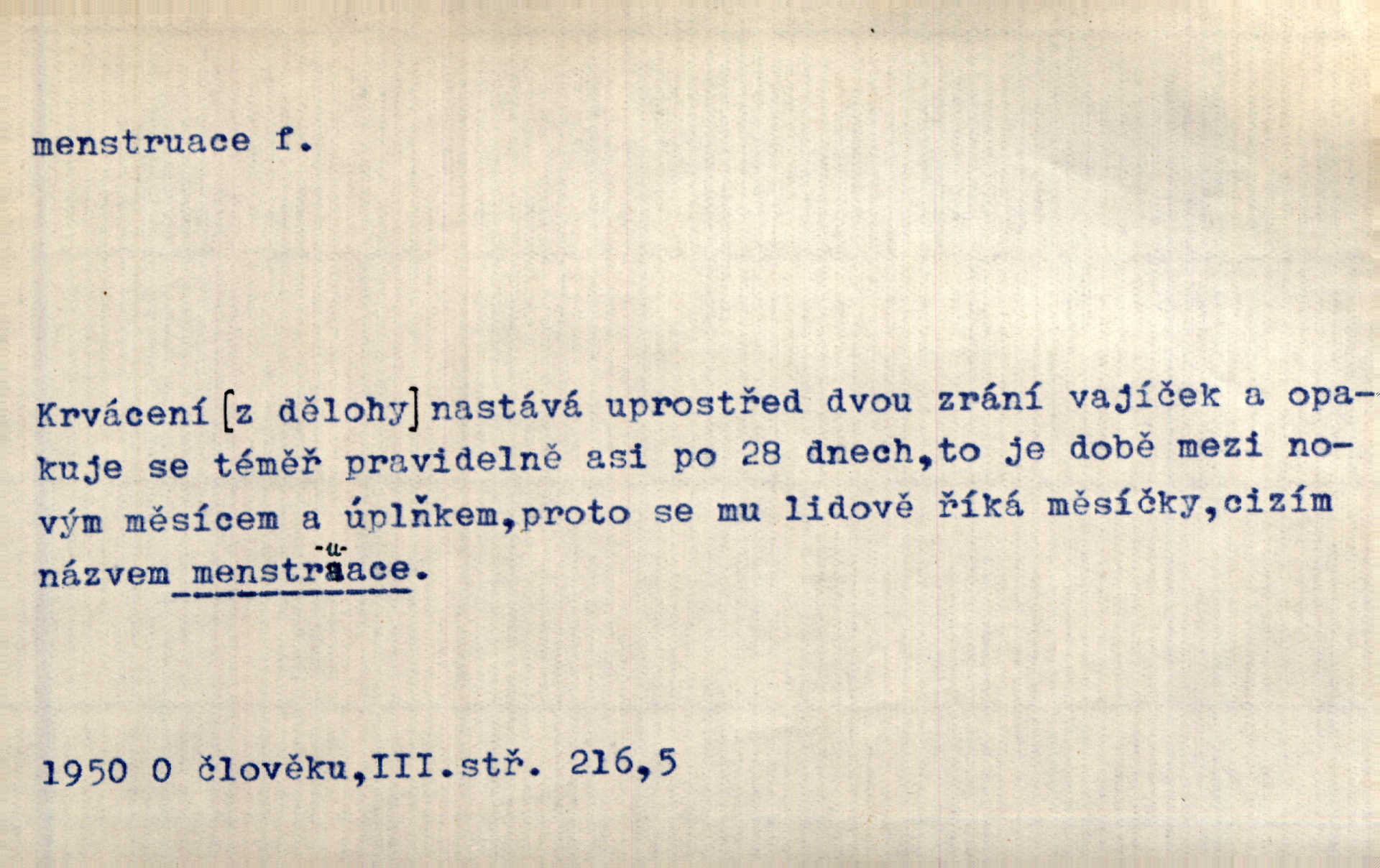 pravidelné, periodicky se opakující krvácení z dělohy u pohlavně dospělé ženy, čmýra.