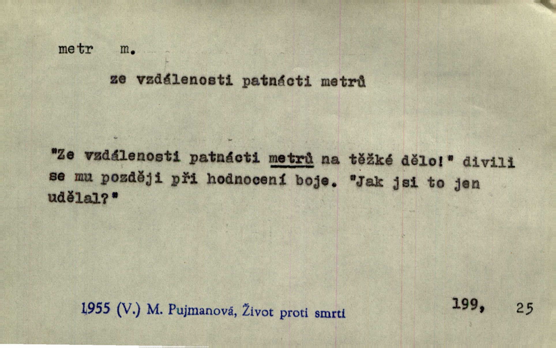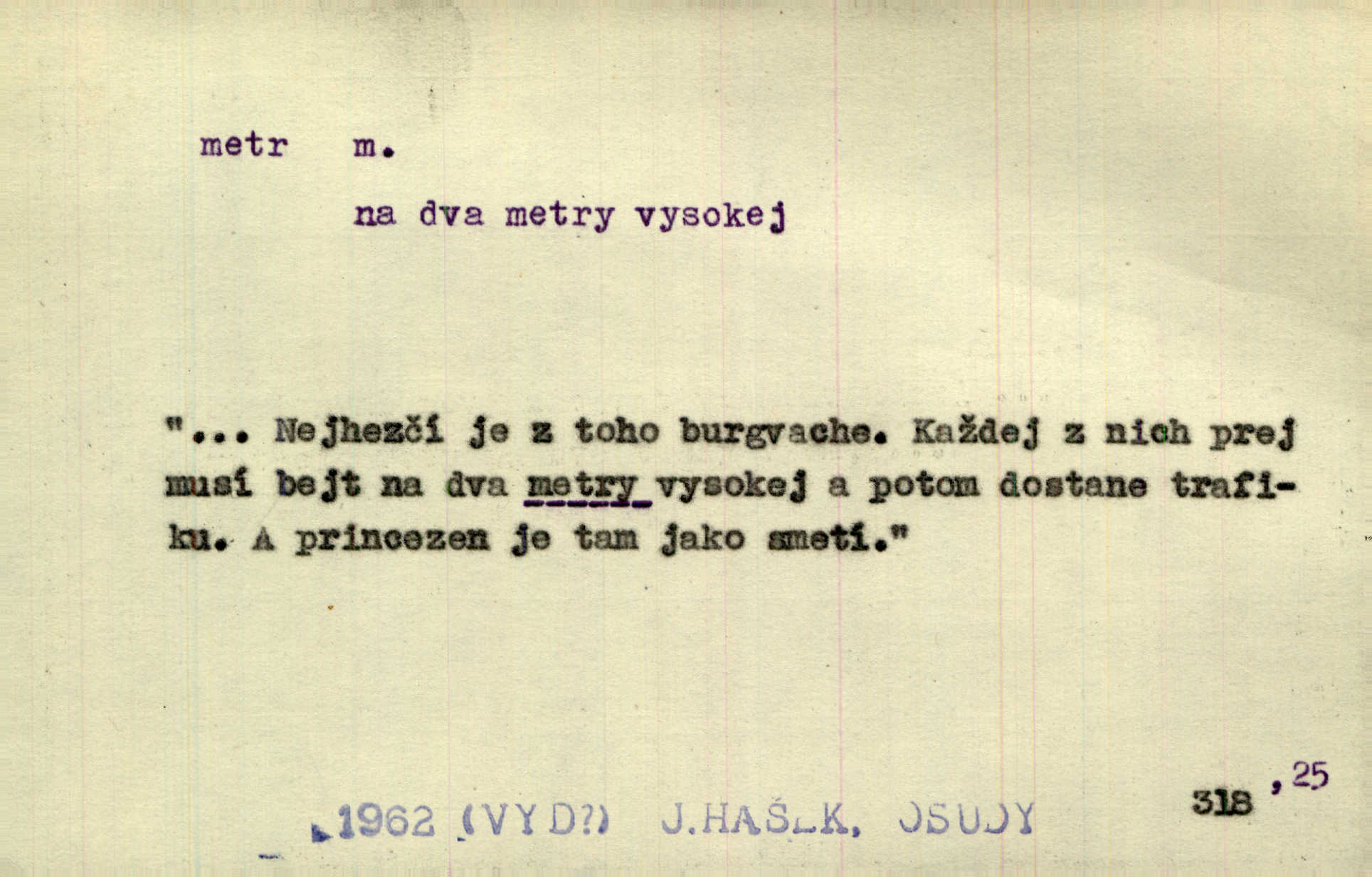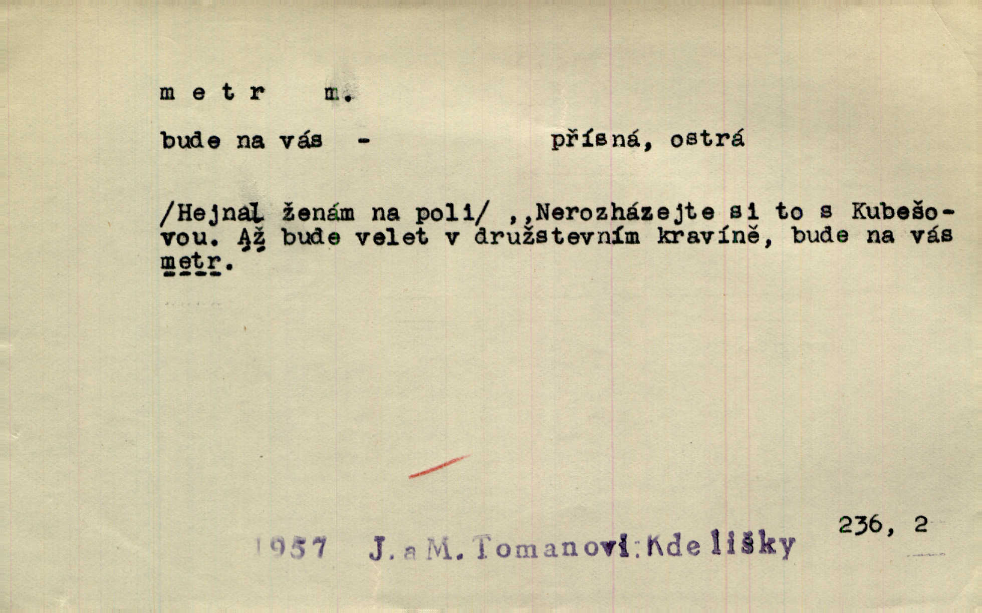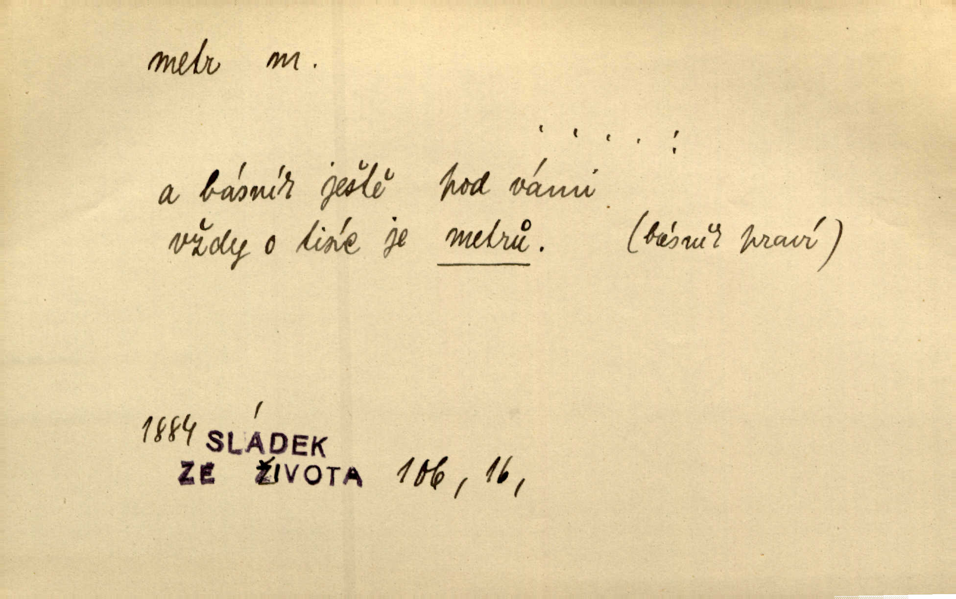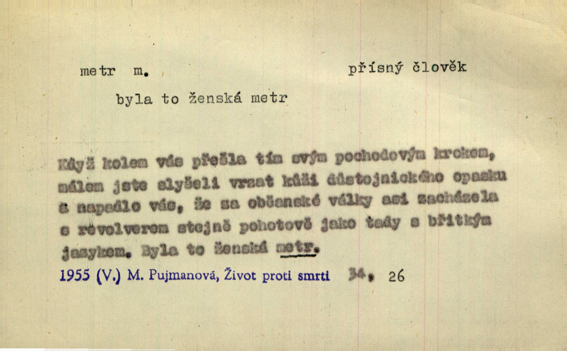 - metr, -u m. základní jednotka délkové míry, přibližně desítimiliontá část čtvrtiny zemského poledníku. Metr délkový, čtvereční, krychlový, pevný, prostorový. D měřítko dlouhé jeden metr. Vzal metr a měřil zas výšku. A. Mrš. Vytáhl z kapsy pláště skládací metr. Těs. Krejčovský metr a j. D vyrovnaná hranice dřeva obsahující 1 krychlový metr. V lese s mužem porážela a do metrů skládala dříví. V. K. Jeř. Dříví v metrech složené se bělalo. Baar. Do neděle to [polena] máme v metrech. Mor. D metr, -a expr. zdatný, energický n. ostrý, přísný člověk. Ta kovářka, to je metr; kdyby té nebylo, už by Viktorka víc nechodila. Něm. Karlíček je dobrý, přičinlivý, bude z něho metr! Krás. Pouštět hrůzu na sedláky, na to on je metr. Havl. Náš táta je na holky metr, žádnou lenoru jim netrpí. Rais. Kojan se zvolna probíral z rozespaní a jasně ji chápal, jakého metra má před sebou. Hol. To jsme na sebe pozvali [do karetní hry] pěkného metra. Herrm. D Argot. měsíc vězení. Stálo to [rvačka] tenkrát pět metrů. Těs.