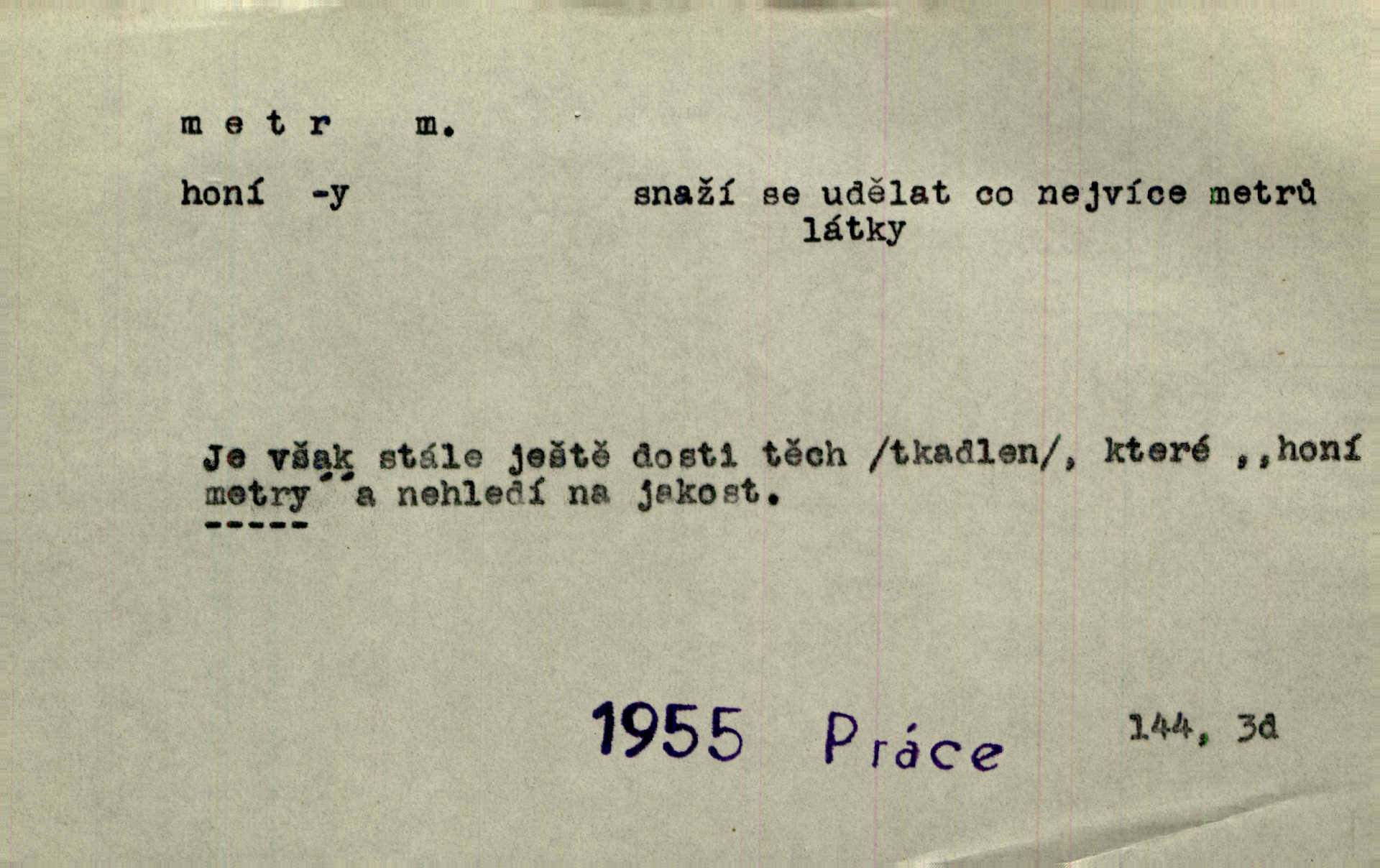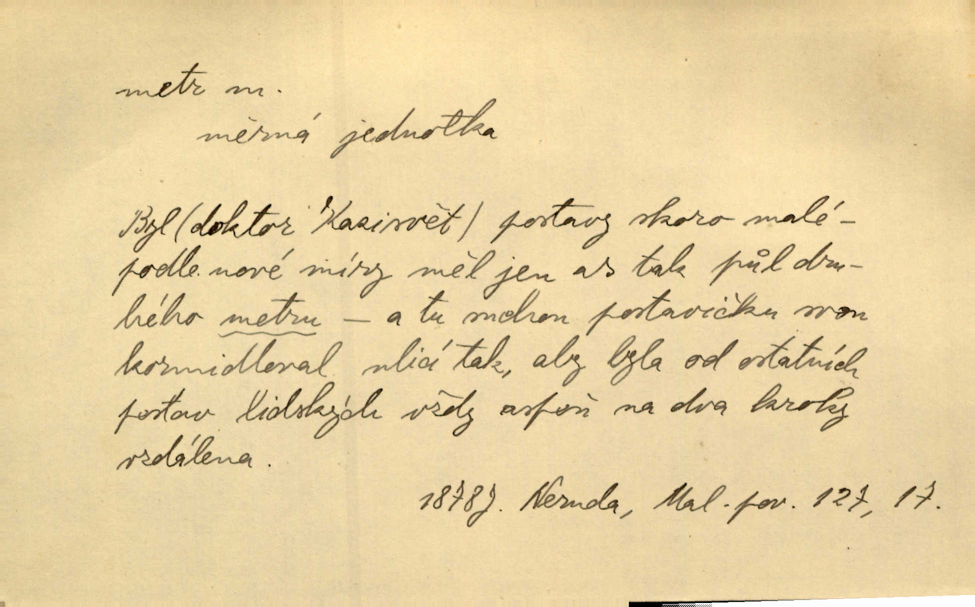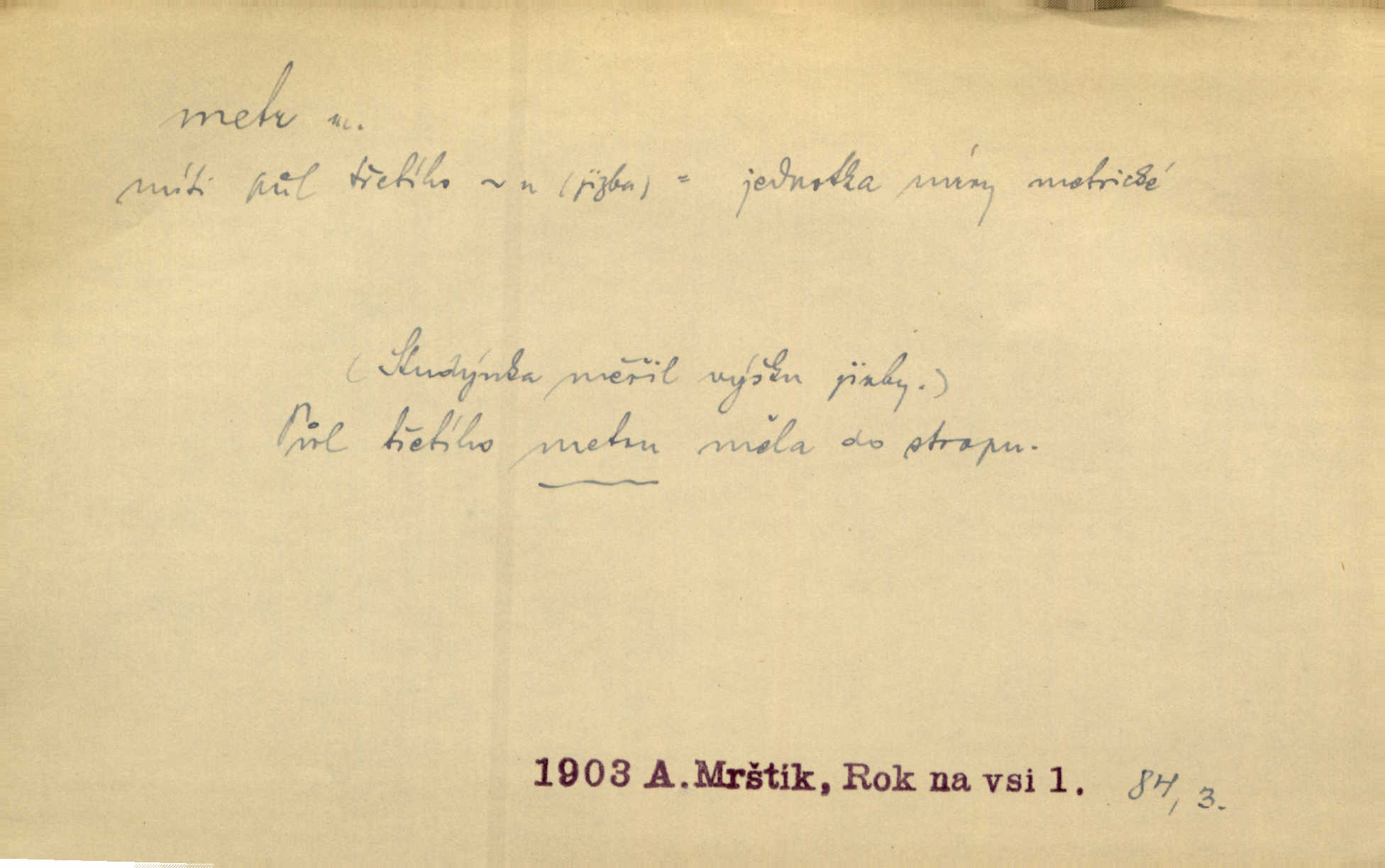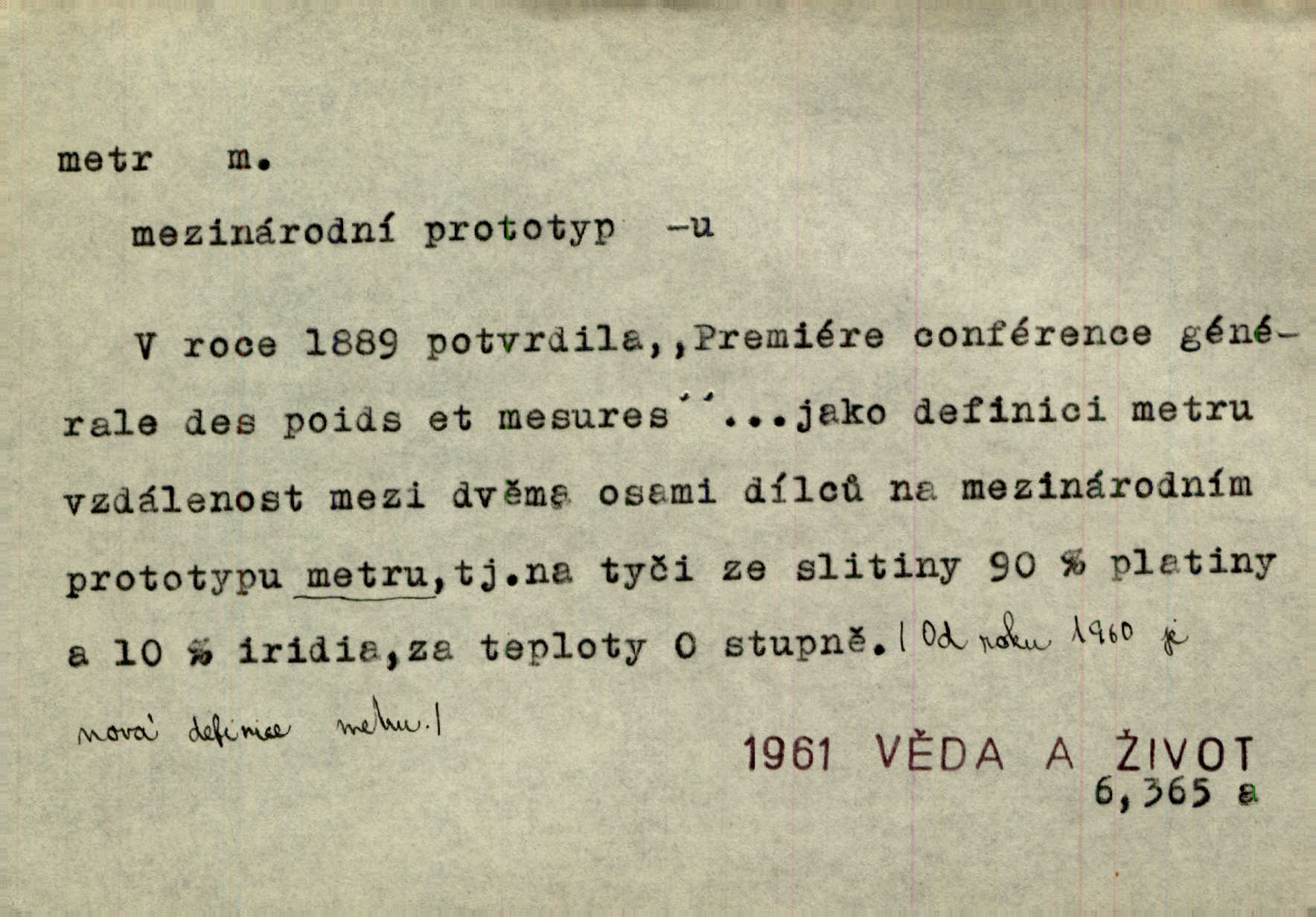 - metr, -u m. základní jednotka délkové míry, přibližně desítimiliontá část čtvrtiny zemského poledníku. Metr délkový, čtvereční, krychlový, pevný, prostorový. D měřítko dlouhé jeden metr. Vzal metr a měřil zas výšku. A. Mrš. Vytáhl z kapsy pláště skládací metr. Těs. Krejčovský metr a j. D vyrovnaná hranice dřeva obsahující 1 krychlový metr. V lese s mužem porážela a do metrů skládala dříví. V. K. Jeř. Dříví v metrech složené se bělalo. Baar. Do neděle to [polena] máme v metrech. Mor. D metr, -a expr. zdatný, energický n. ostrý, přísný člověk. Ta kovářka, to je metr; kdyby té nebylo, už by Viktorka víc nechodila. Něm. Karlíček je dobrý, přičinlivý, bude z něho metr! Krás. Pouštět hrůzu na sedláky, na to on je metr. Havl. Náš táta je na holky metr, žádnou lenoru jim netrpí. Rais. Kojan se zvolna probíral z rozespaní a jasně ji chápal, jakého metra má před sebou. Hol. To jsme na sebe pozvali [do karetní hry] pěkného metra. Herrm. D Argot. měsíc vězení. Stálo to [rvačka] tenkrát pět metrů. Těs.
