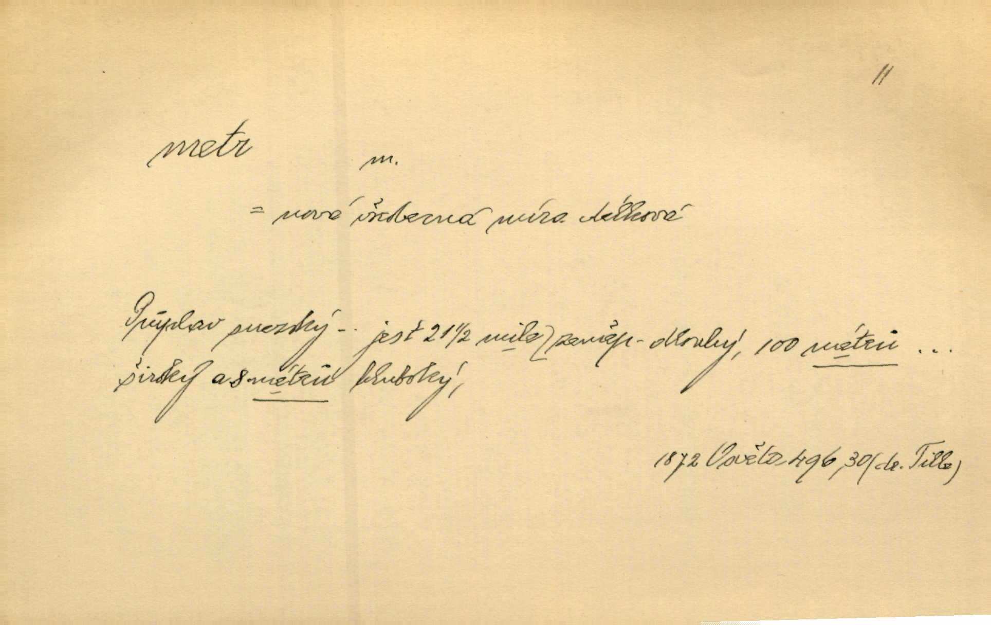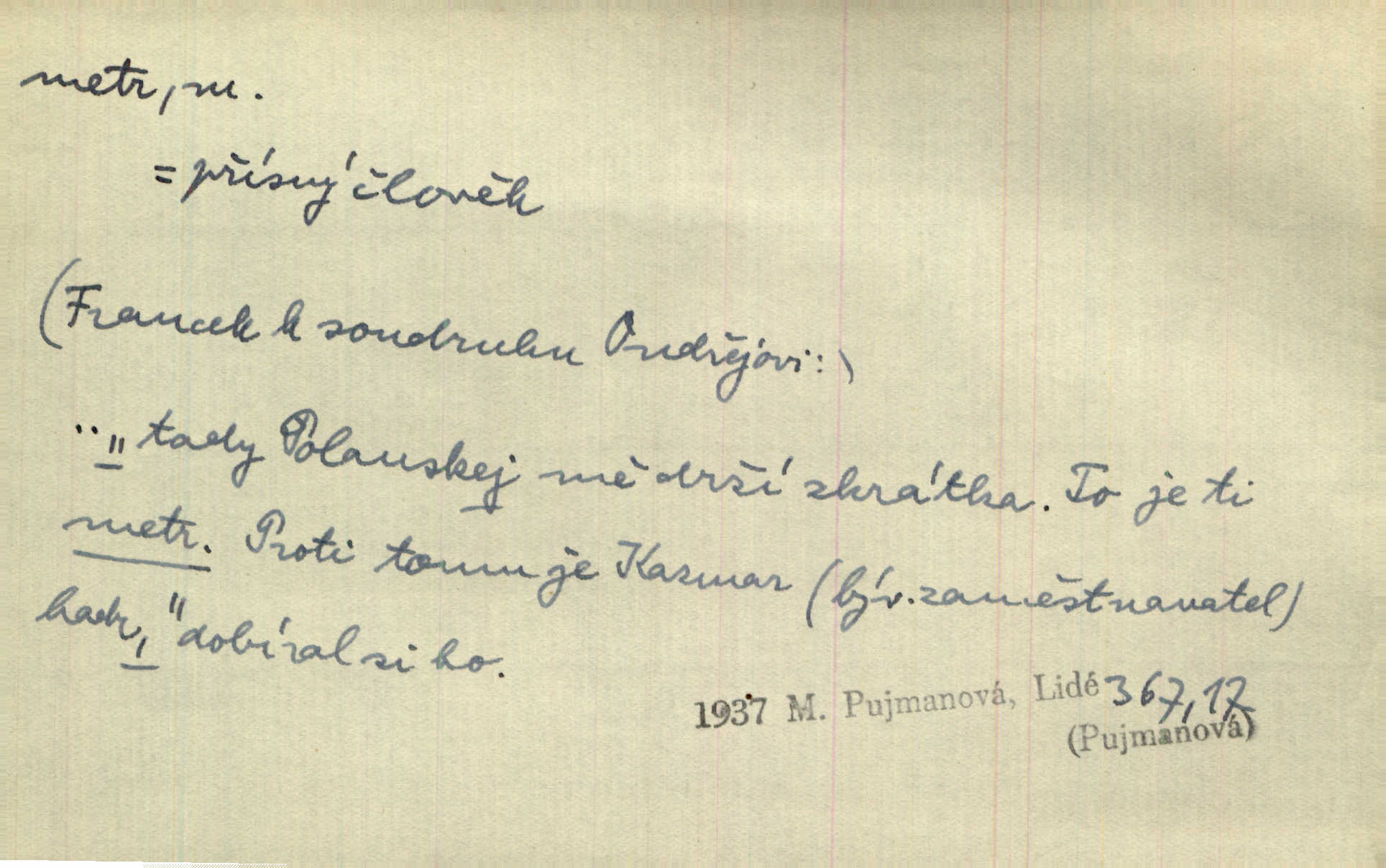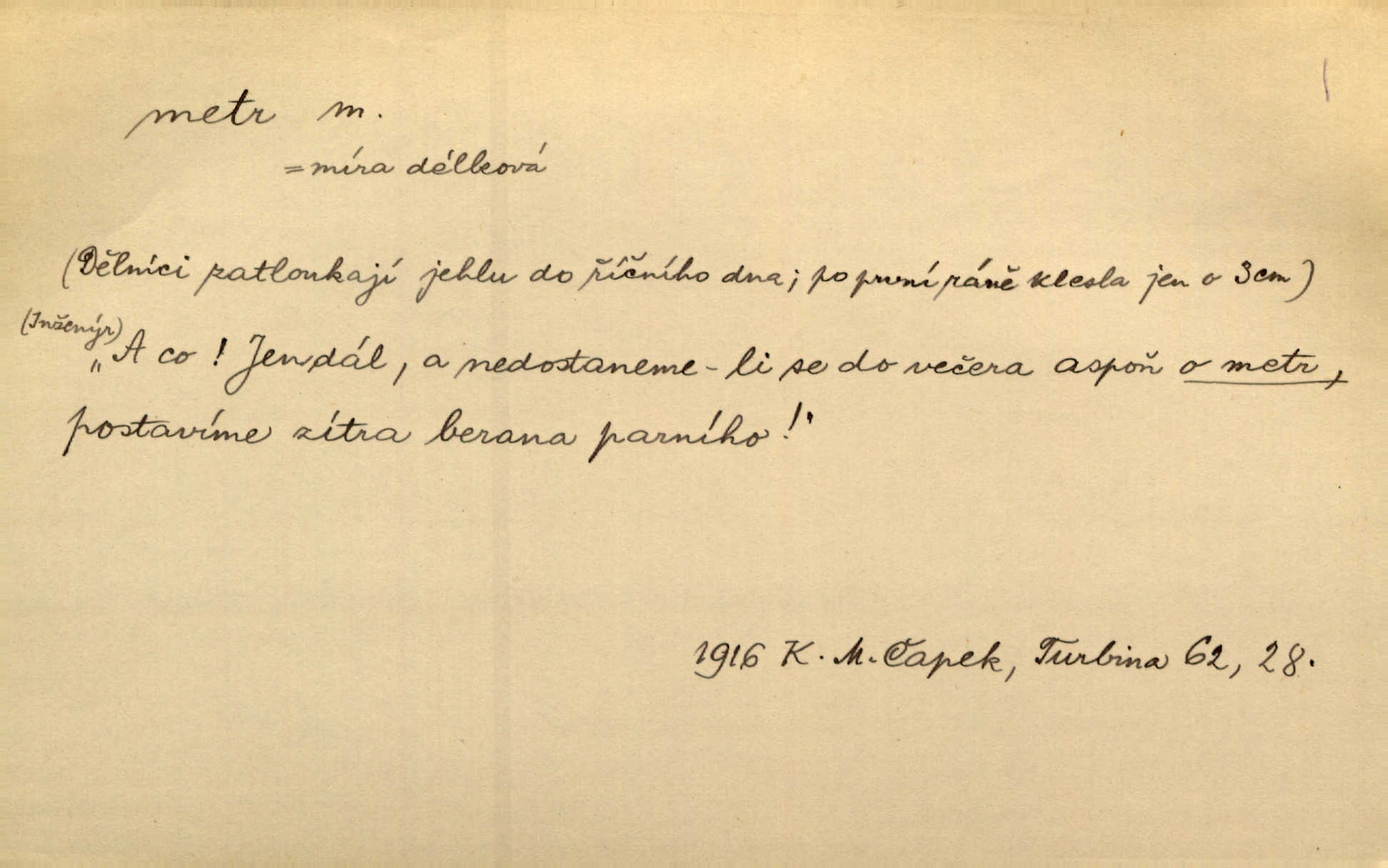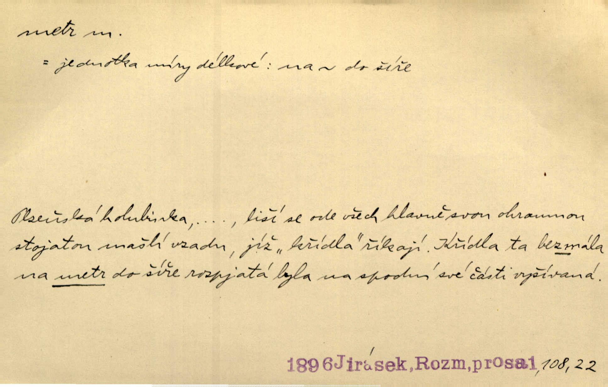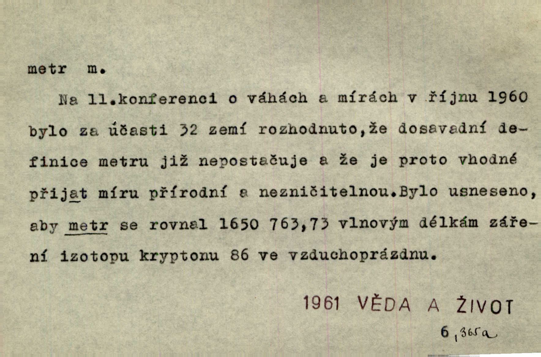- metr, -u m. základní jednotka délkové míry, přibližně desítimiliontá část čtvrtiny zemského poledníku. Metr délkový, čtvereční, krychlový, pevný, prostorový. D měřítko dlouhé jeden metr. Vzal metr a měřil zas výšku. A. Mrš. Vytáhl z kapsy pláště skládací metr. Těs. Krejčovský metr a j. D vyrovnaná hranice dřeva obsahující 1 krychlový metr. V lese s mužem porážela a do metrů skládala dříví. V. K. Jeř. Dříví v metrech složené se bělalo. Baar. Do neděle to [polena] máme v metrech. Mor. D metr, -a expr. zdatný, energický n. ostrý, přísný člověk. Ta kovářka, to je metr; kdyby té nebylo, už by Viktorka víc nechodila. Něm. Karlíček je dobrý, přičinlivý, bude z něho metr! Krás. Pouštět hrůzu na sedláky, na to on je metr. Havl. Náš táta je na holky metr, žádnou lenoru jim netrpí. Rais. Kojan se zvolna probíral z rozespaní a jasně ji chápal, jakého metra má před sebou. Hol. To jsme na sebe pozvali [do karetní hry] pěkného metra. Herrm. D Argot. měsíc vězení. Stálo to [rvačka] tenkrát pět metrů. Těs.