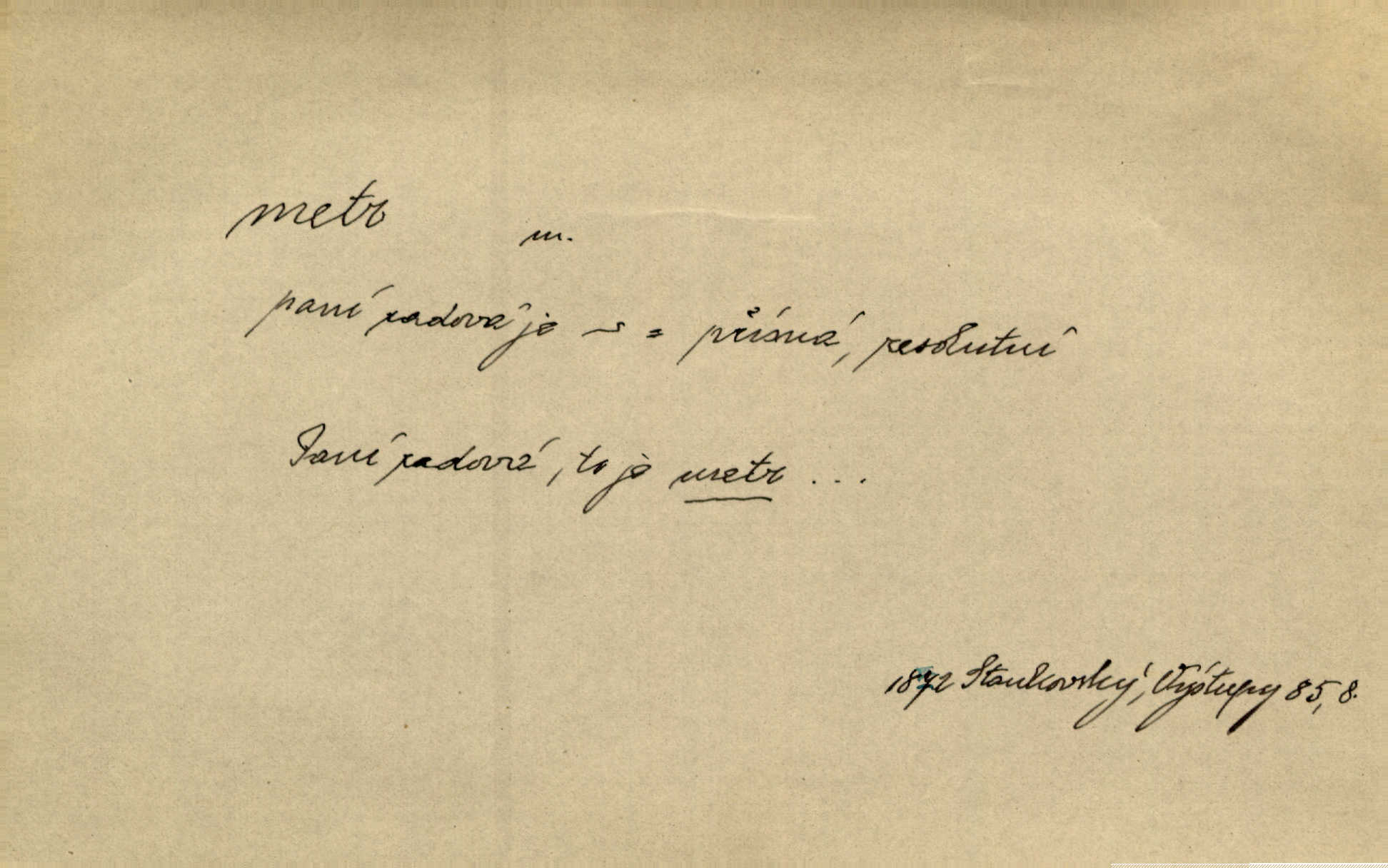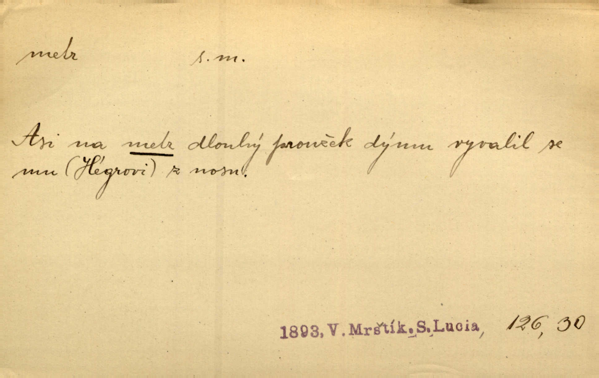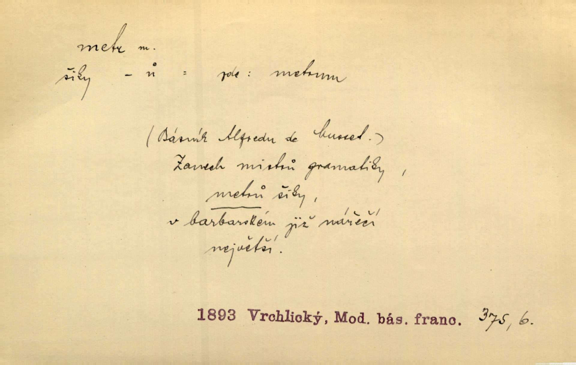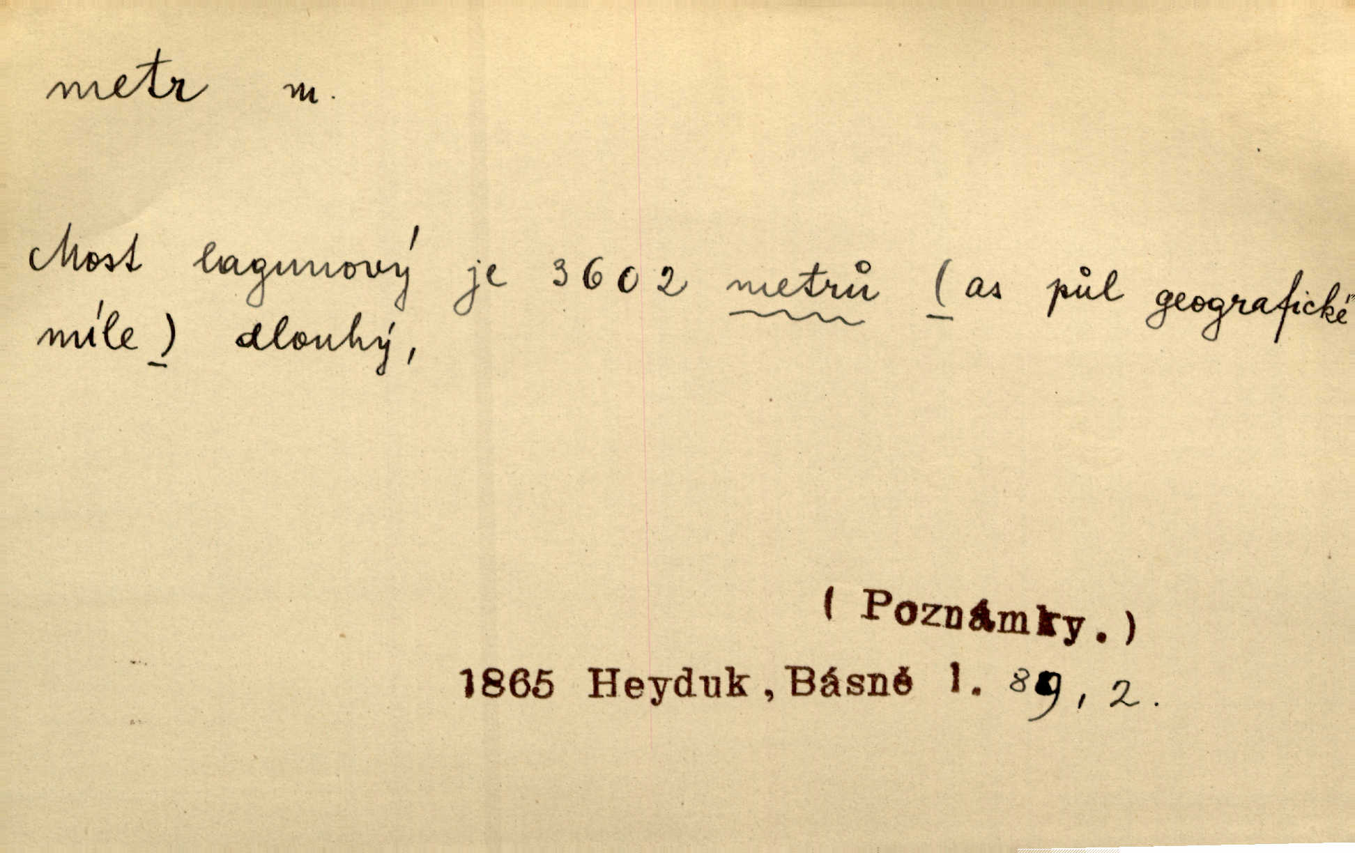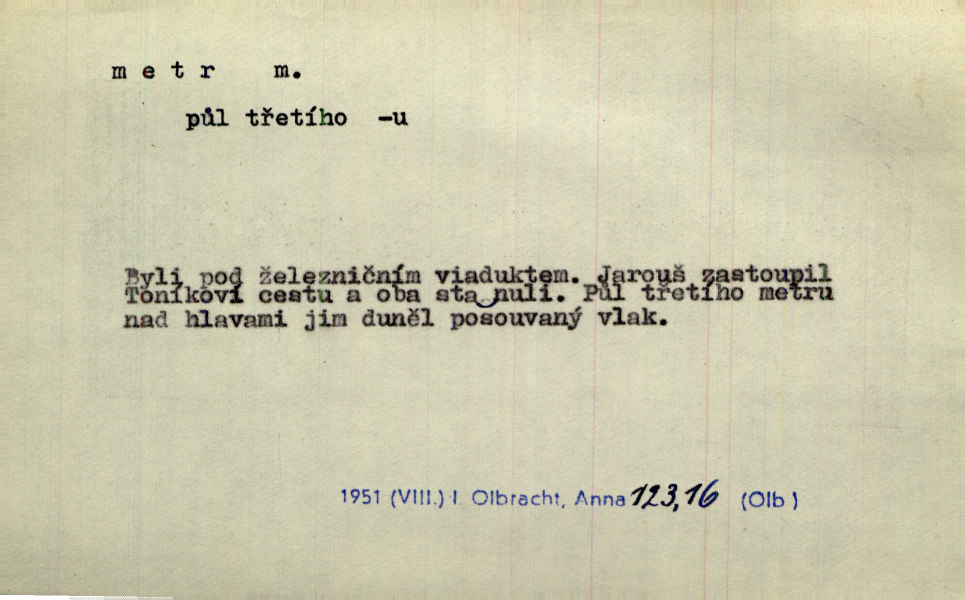 - metr, -u m. základní jednotka délkové míry, přibližně desítimiliontá část čtvrtiny zemského poledníku. Metr délkový, čtvereční, krychlový, pevný, prostorový. D měřítko dlouhé jeden metr. Vzal metr a měřil zas výšku. A. Mrš. Vytáhl z kapsy pláště skládací metr. Těs. Krejčovský metr a j. D vyrovnaná hranice dřeva obsahující 1 krychlový metr. V lese s mužem porážela a do metrů skládala dříví. V. K. Jeř. Dříví v metrech složené se bělalo. Baar. Do neděle to [polena] máme v metrech. Mor. D metr, -a expr. zdatný, energický n. ostrý, přísný člověk. Ta kovářka, to je metr; kdyby té nebylo, už by Viktorka víc nechodila. Něm. Karlíček je dobrý, přičinlivý, bude z něho metr! Krás. Pouštět hrůzu na sedláky, na to on je metr. Havl. Náš táta je na holky metr, žádnou lenoru jim netrpí. Rais. Kojan se zvolna probíral z rozespaní a jasně ji chápal, jakého metra má před sebou. Hol. To jsme na sebe pozvali [do karetní hry] pěkného metra. Herrm. D Argot. měsíc vězení. Stálo to [rvačka] tenkrát pět metrů. Těs.