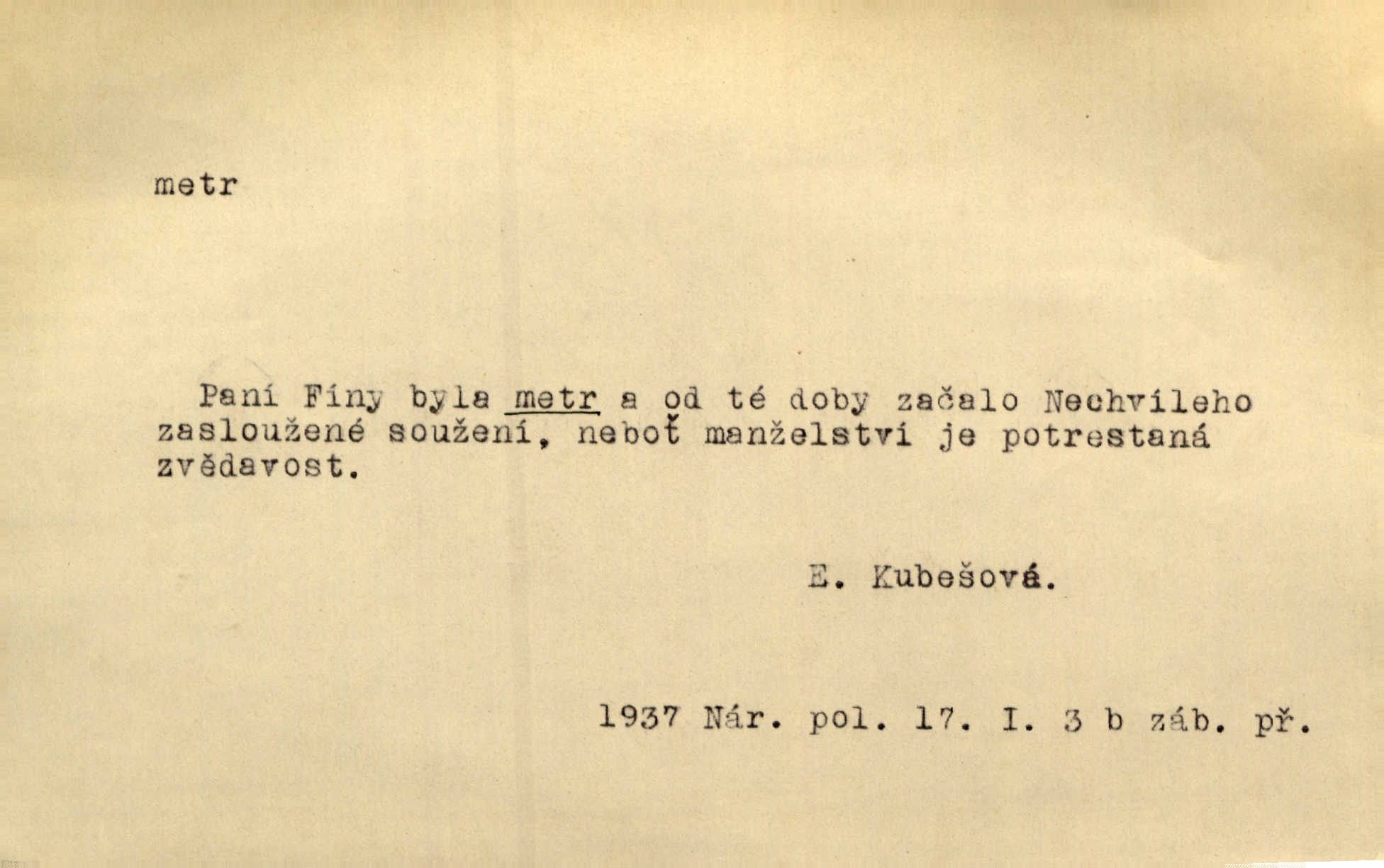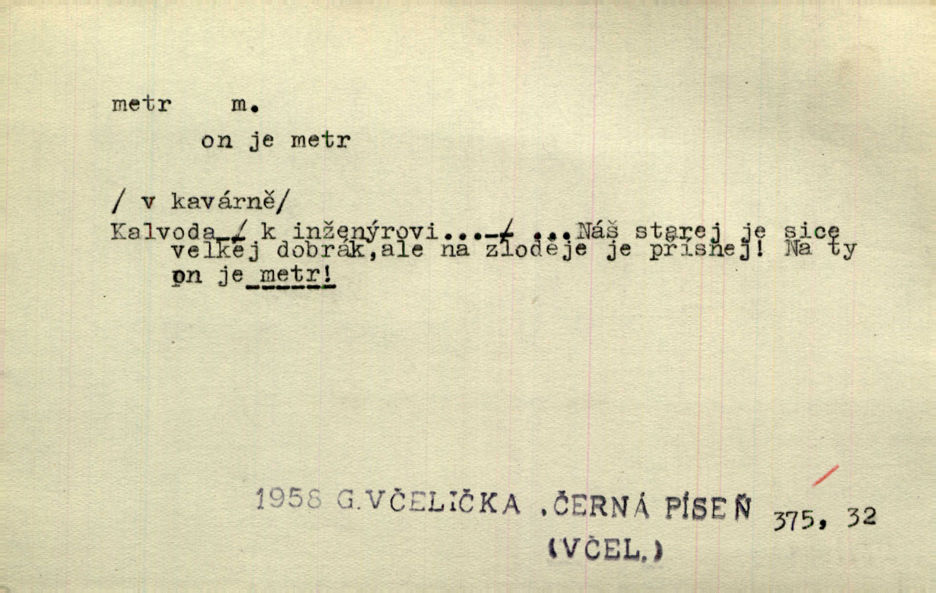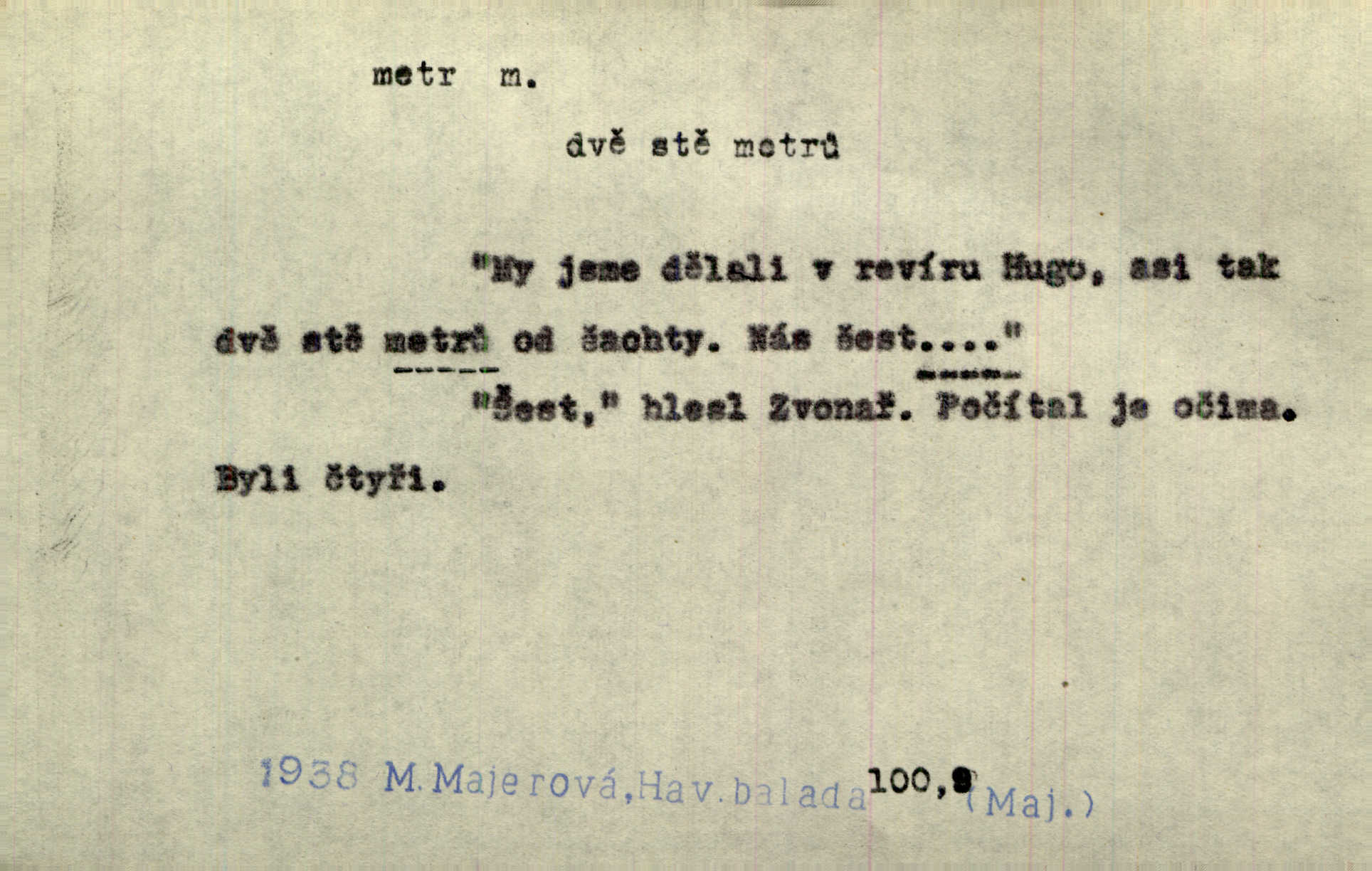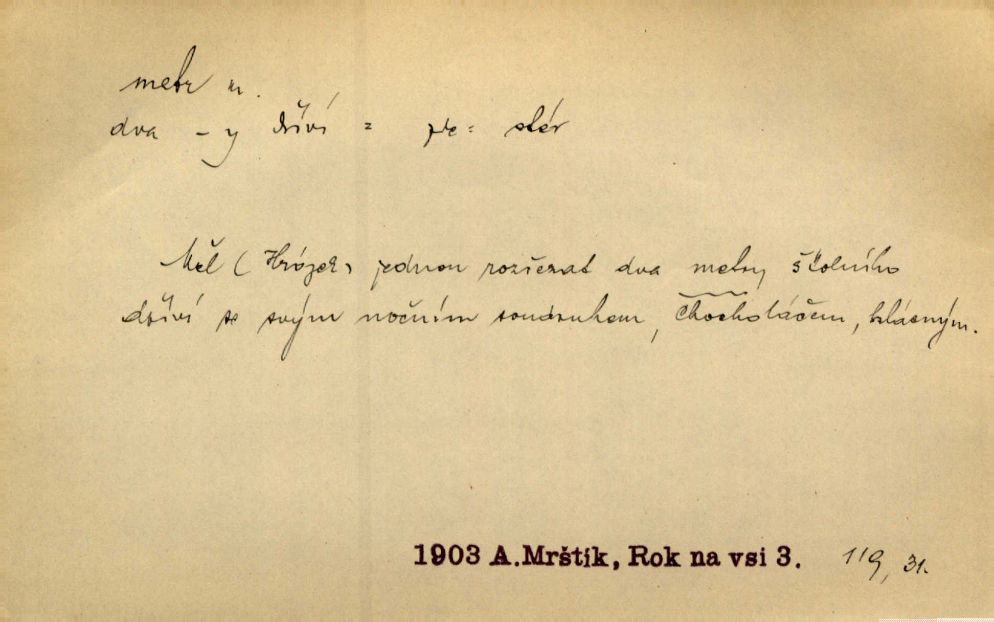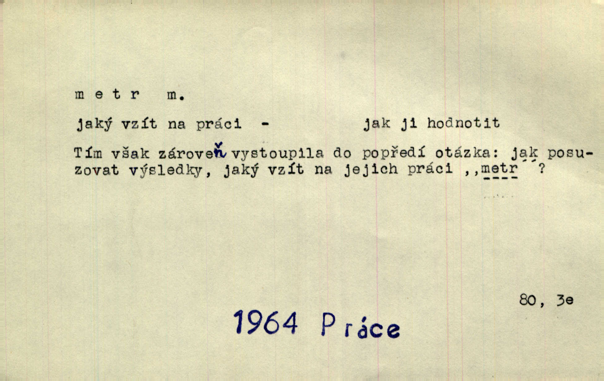 - metr, -u m. základní jednotka délkové míry, přibližně desítimiliontá část čtvrtiny zemského poledníku. Metr délkový, čtvereční, krychlový, pevný, prostorový. D měřítko dlouhé jeden metr. Vzal metr a měřil zas výšku. A. Mrš. Vytáhl z kapsy pláště skládací metr. Těs. Krejčovský metr a j. D vyrovnaná hranice dřeva obsahující 1 krychlový metr. V lese s mužem porážela a do metrů skládala dříví. V. K. Jeř. Dříví v metrech složené se bělalo. Baar. Do neděle to [polena] máme v metrech. Mor. D metr, -a expr. zdatný, energický n. ostrý, přísný člověk. Ta kovářka, to je metr; kdyby té nebylo, už by Viktorka víc nechodila. Něm. Karlíček je dobrý, přičinlivý, bude z něho metr! Krás. Pouštět hrůzu na sedláky, na to on je metr. Havl. Náš táta je na holky metr, žádnou lenoru jim netrpí. Rais. Kojan se zvolna probíral z rozespaní a jasně ji chápal, jakého metra má před sebou. Hol. To jsme na sebe pozvali [do karetní hry] pěkného metra. Herrm. D Argot. měsíc vězení. Stálo to [rvačka] tenkrát pět metrů. Těs.