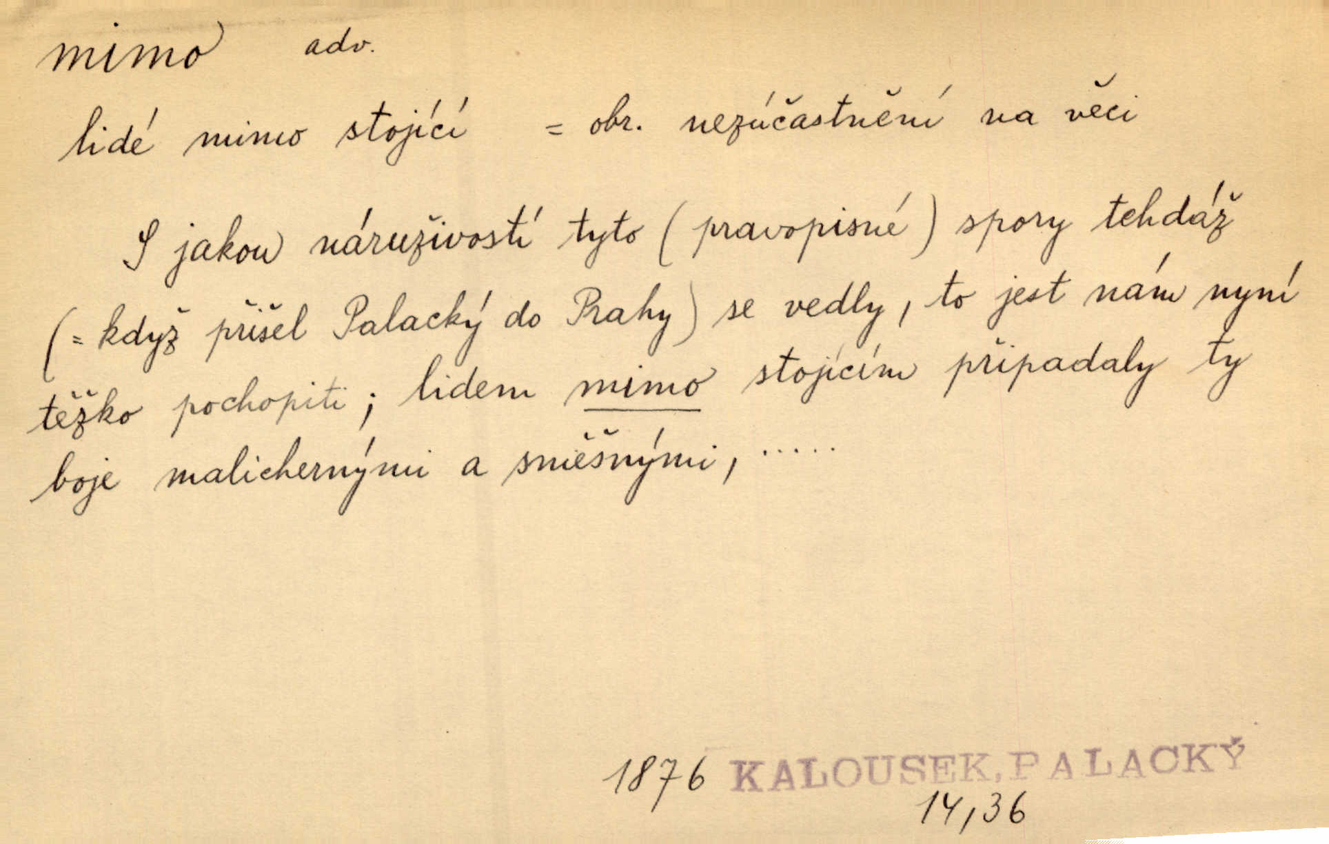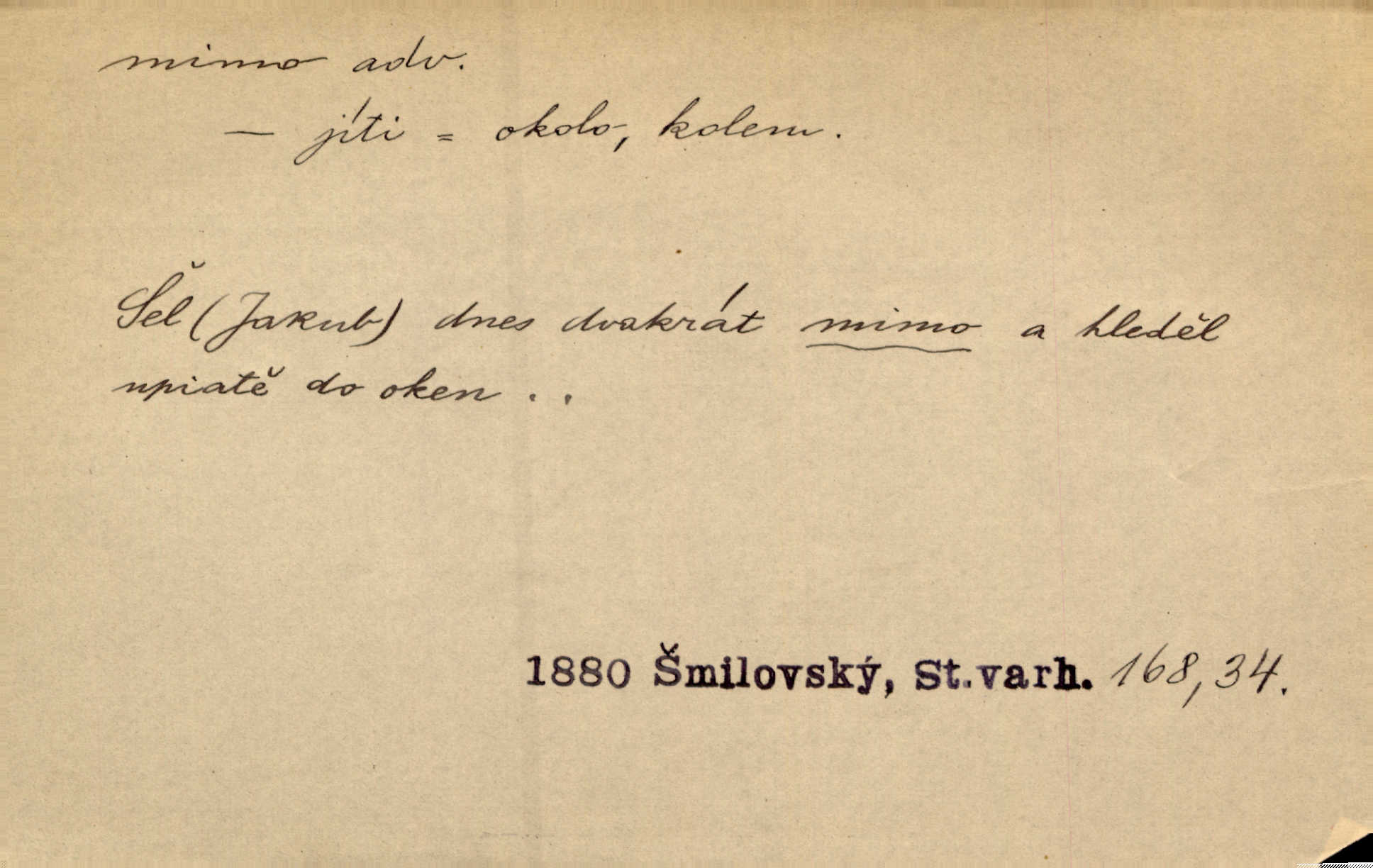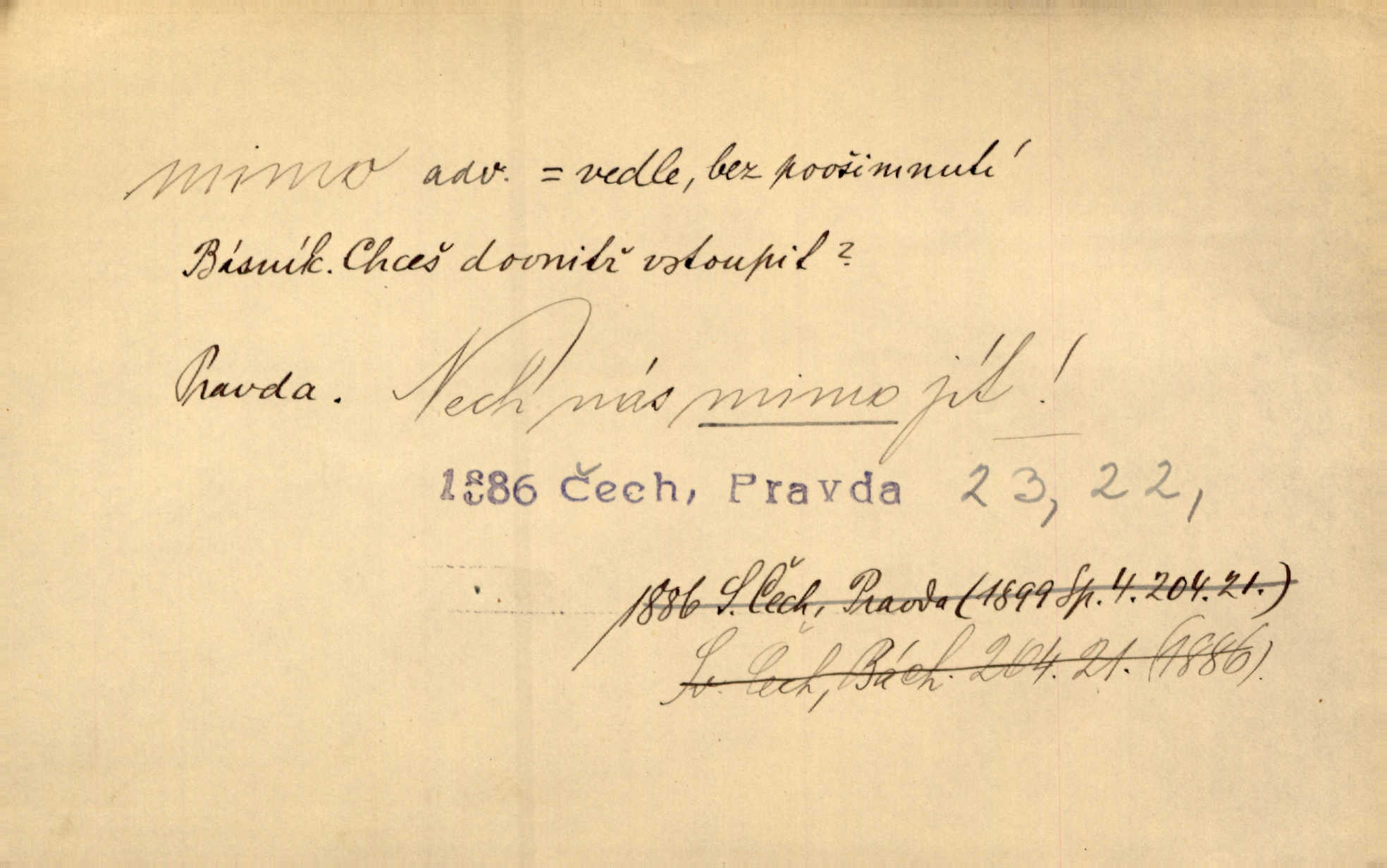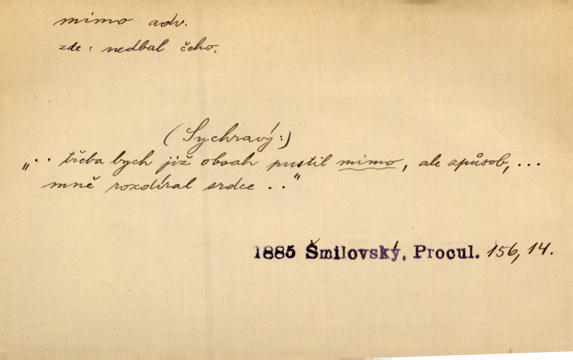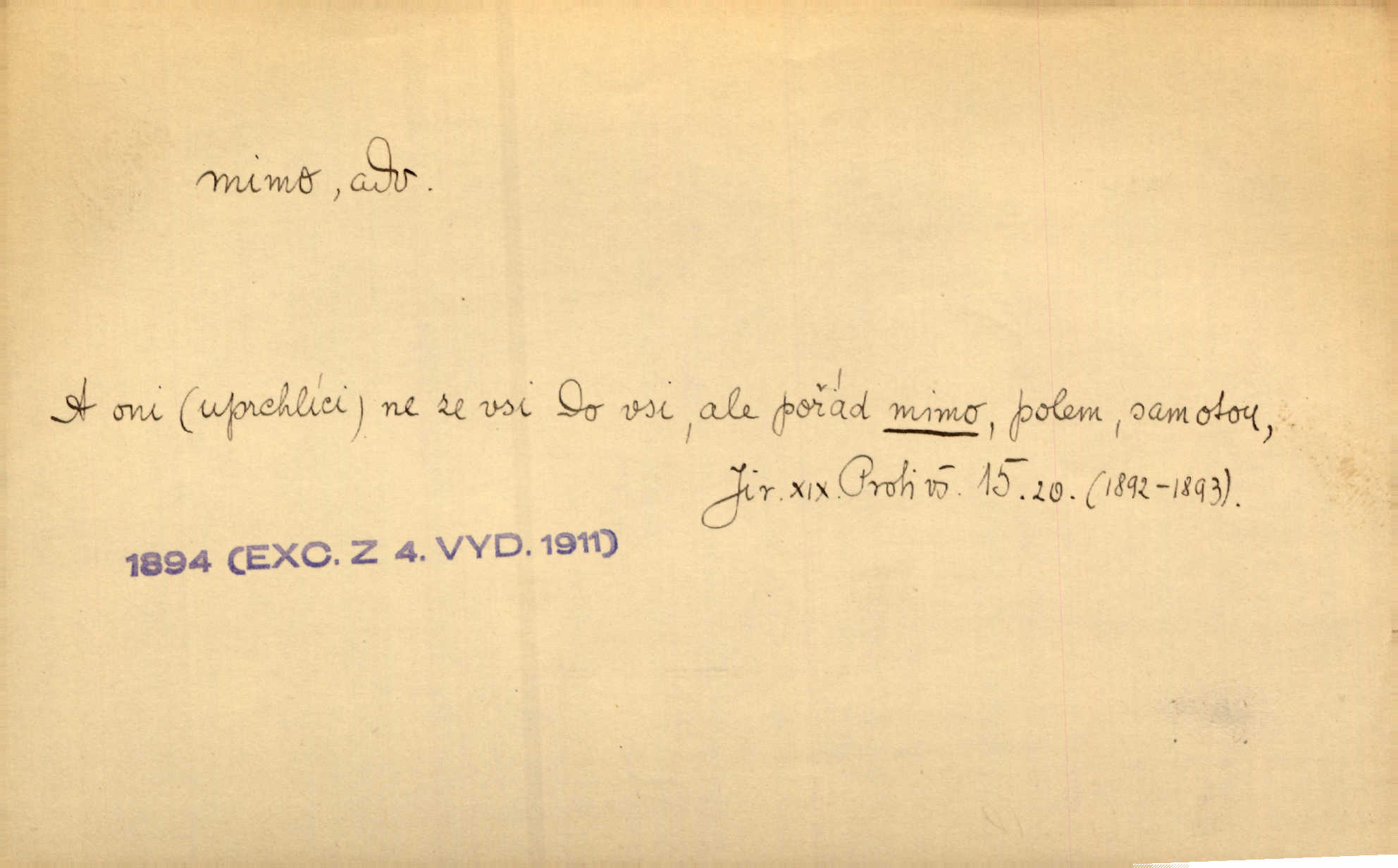 - mimo adv. stranou, vedle. Pátou [ránu] pustil [střelec] mimo. Ehrenb. Škoda každé rány, která jde mimo. Přísl. Když jsem se hnal přes prkno, skočil jsem mimo, do té louže. Jir. Usmál se lhostejně a hledě mimo poznamenal. Maria. On zvyklý počítati věcnými faktory; věci nehotové leží mu jaksi mimo. Šmil. D podle, kolem, okolo. Nechť, kdo mimo jdou, se pokřižují. Heyd. Lidé spěchali kvapným krokem mimo. Mach. D vyjma, kromě, leda. Mimo v řezbách okrasních vidíme plody výtvarného umění také na japonském bronzu. Ner. Žid mimo sobě a komoře královské stěží komu jinému býval za užitele. Win. Aniž si byl kdo, že nový host do světnice přibyl, povšimnul; mimo hospodský, který častěji se byl po dvéřích ohlížel. Tyl. D mimochodem. Úžasných věcí nám při tom [čtení Caesara] nabíjeli do hlavy: strategii, taktiku, ale všecko suše, bez map, obrazů, jen tak mimo jako vedlejší věc. Mach.