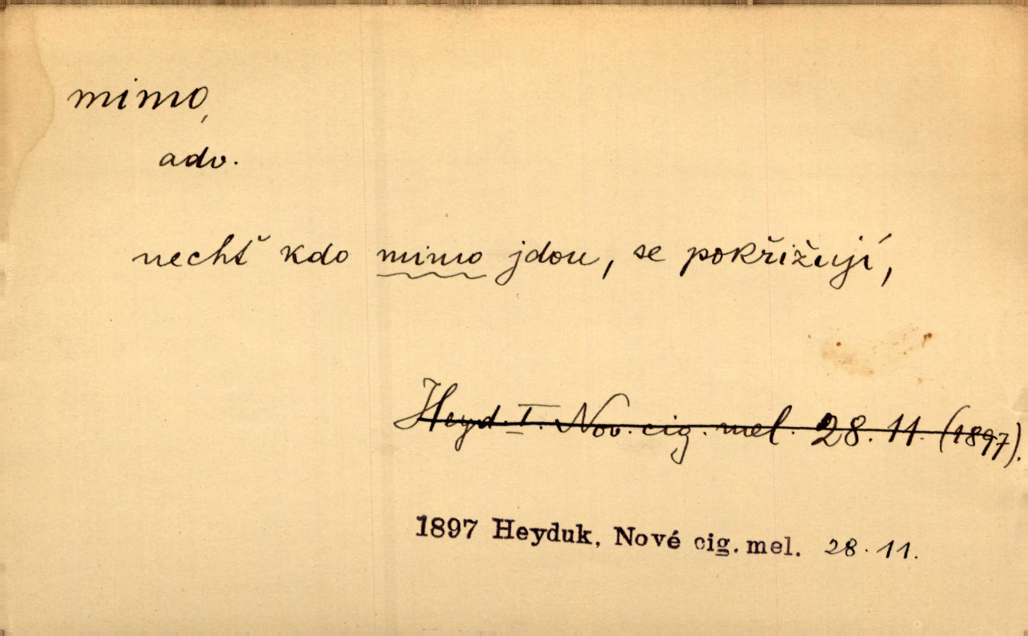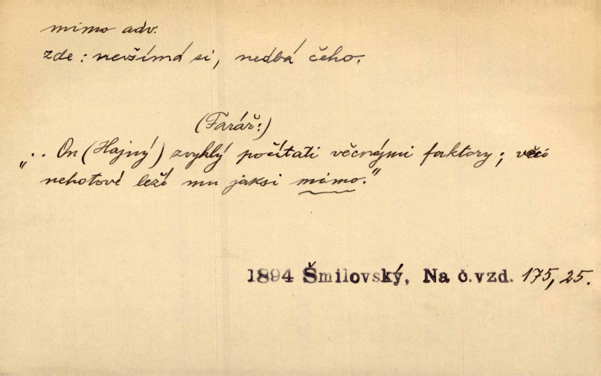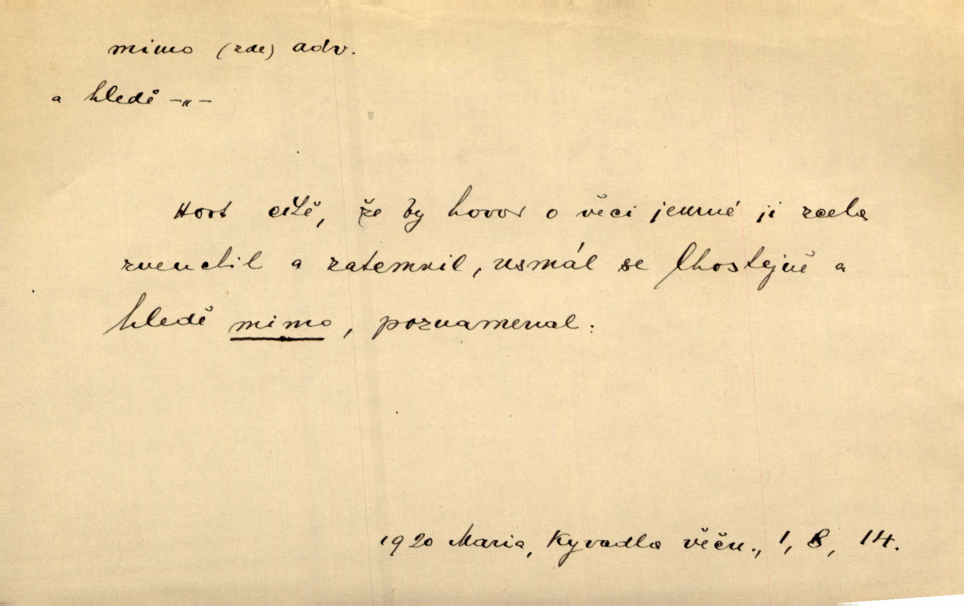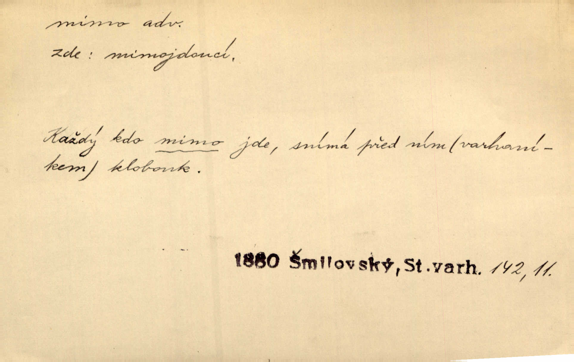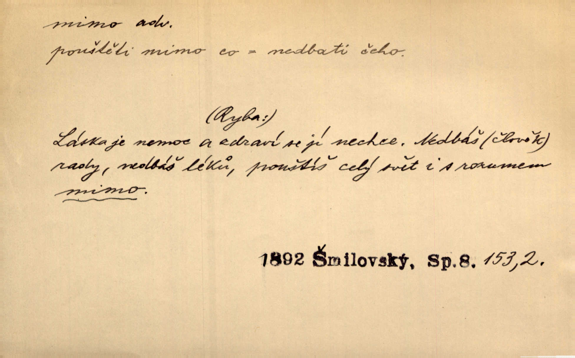 - mimo adv. stranou, vedle. Pátou [ránu] pustil [střelec] mimo. Ehrenb. Škoda každé rány, která jde mimo. Přísl. Když jsem se hnal přes prkno, skočil jsem mimo, do té louže. Jir. Usmál se lhostejně a hledě mimo poznamenal. Maria. On zvyklý počítati věcnými faktory; věci nehotové leží mu jaksi mimo. Šmil. D podle, kolem, okolo. Nechť, kdo mimo jdou, se pokřižují. Heyd. Lidé spěchali kvapným krokem mimo. Mach. D vyjma, kromě, leda. Mimo v řezbách okrasních vidíme plody výtvarného umění také na japonském bronzu. Ner. Žid mimo sobě a komoře královské stěží komu jinému býval za užitele. Win. Aniž si byl kdo, že nový host do světnice přibyl, povšimnul; mimo hospodský, který častěji se byl po dvéřích ohlížel. Tyl. D mimochodem. Úžasných věcí nám při tom [čtení Caesara] nabíjeli do hlavy: strategii, taktiku, ale všecko suše, bez map, obrazů, jen tak mimo jako vedlejší věc. Mach.
