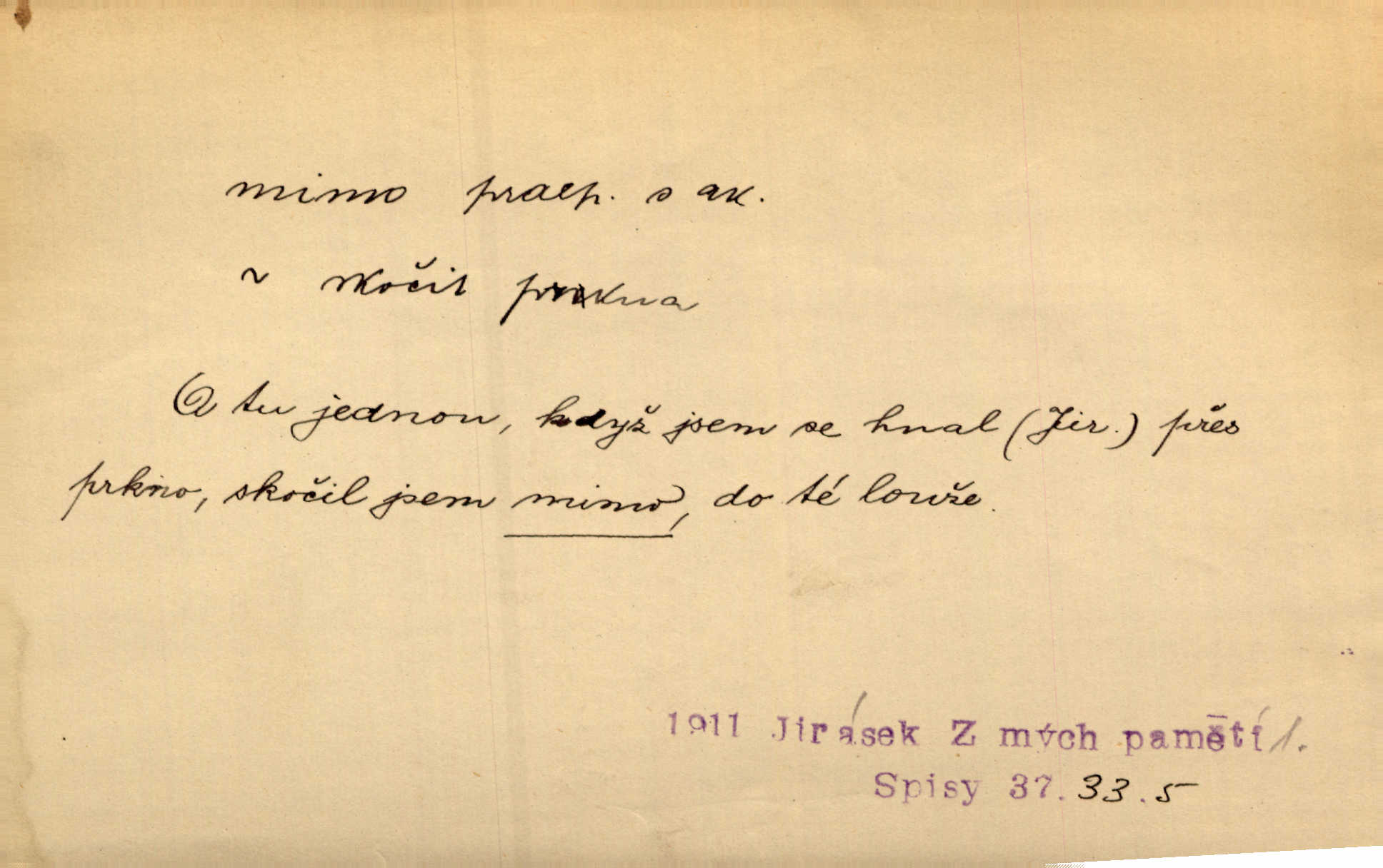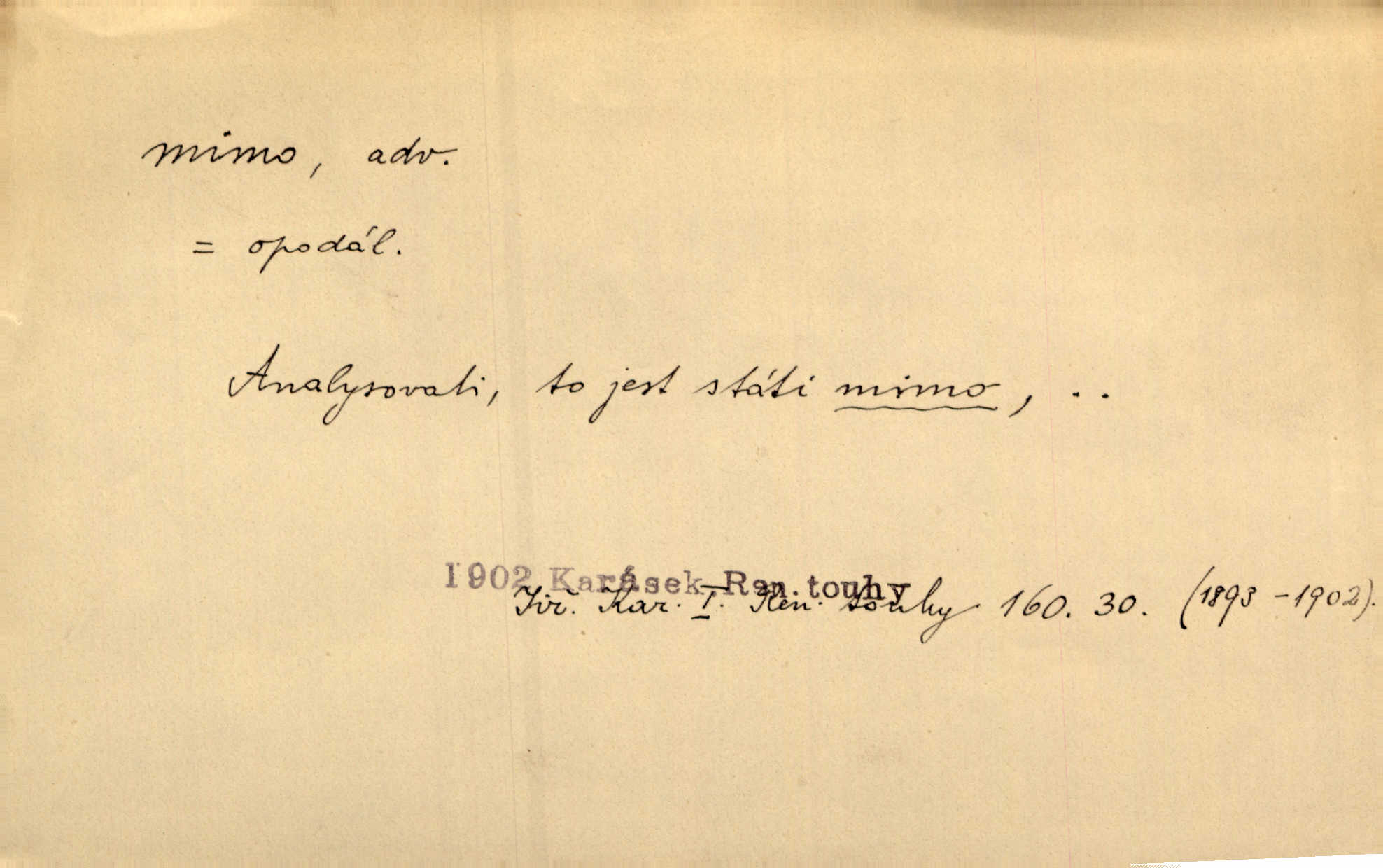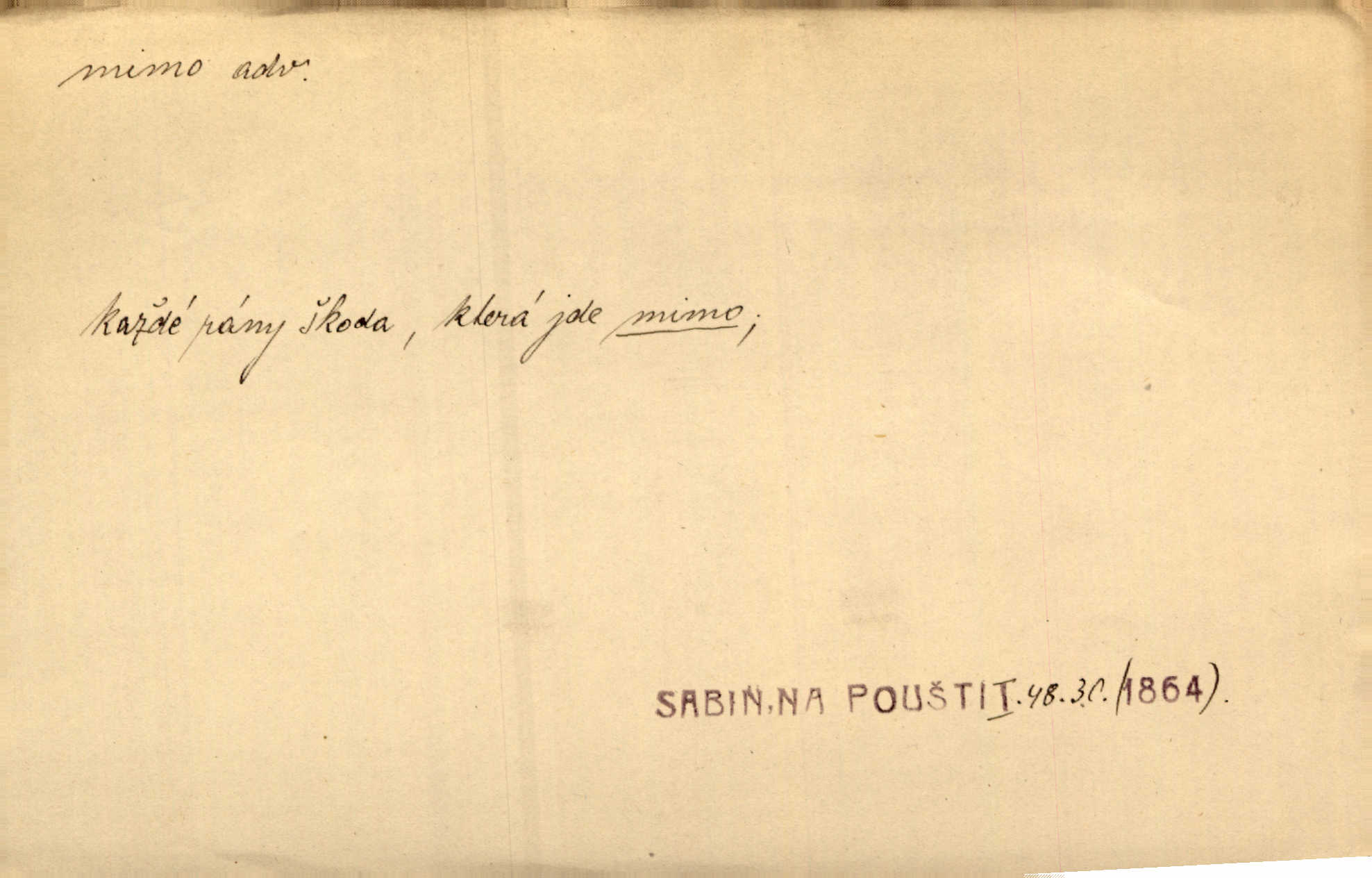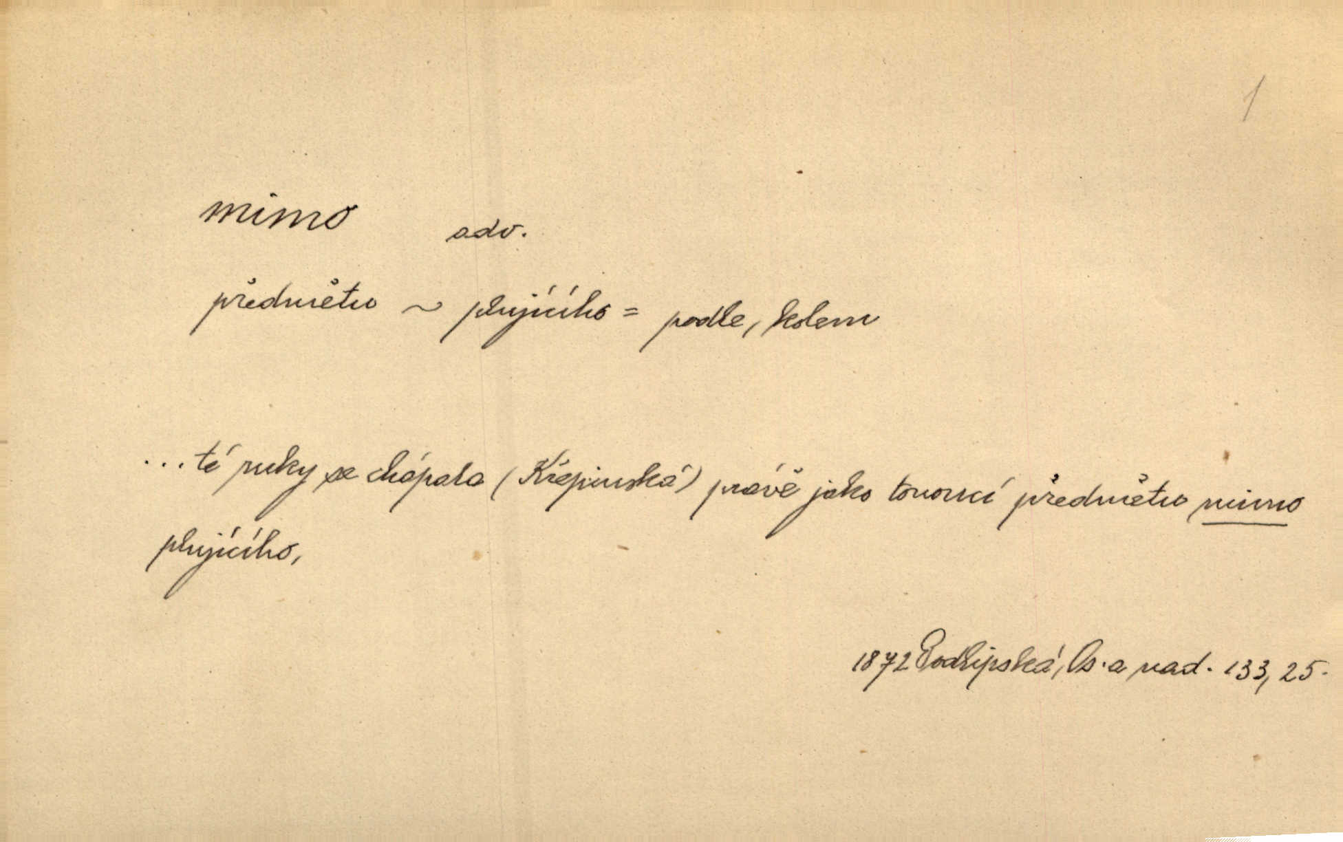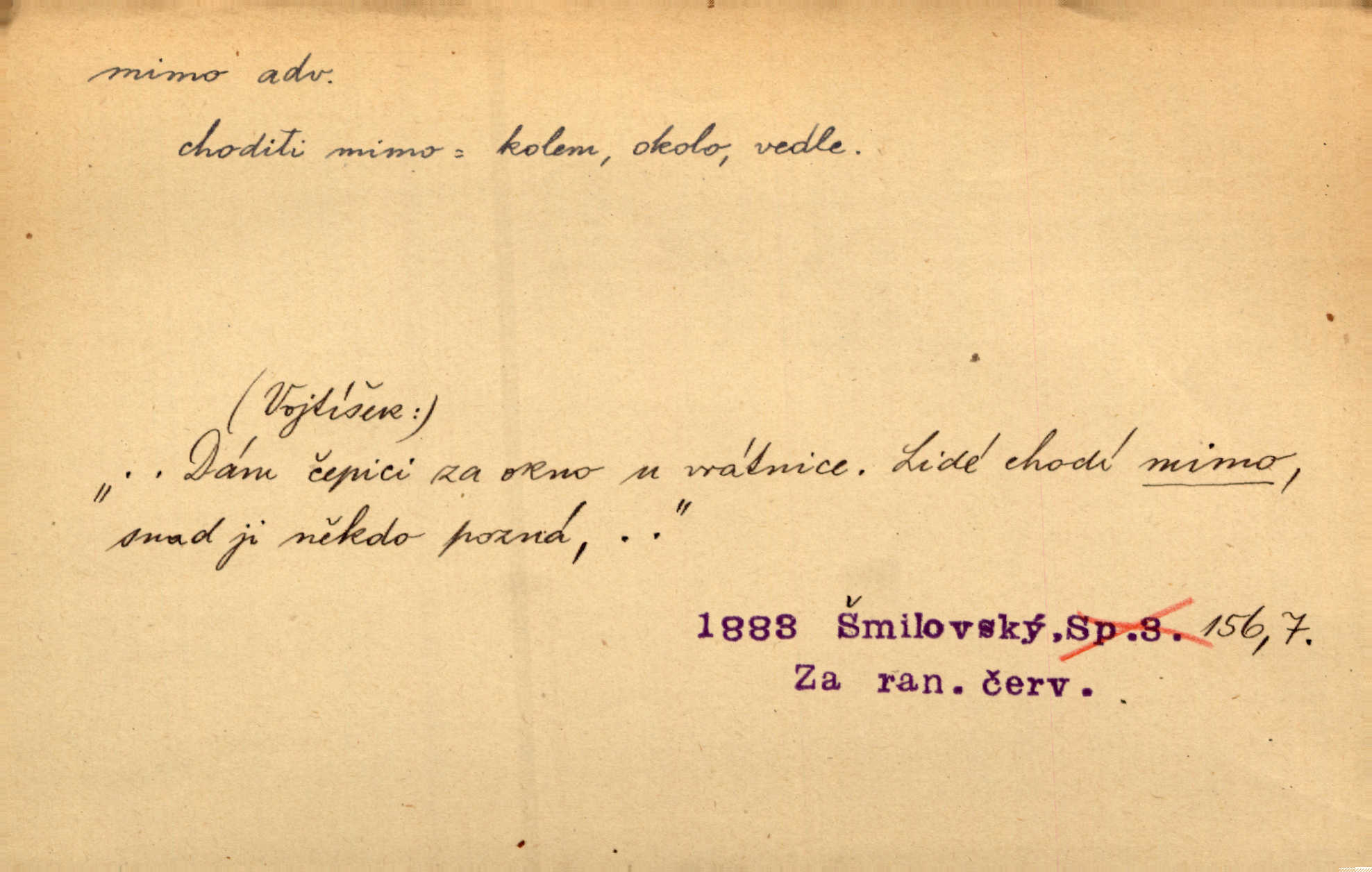- mimo adv. stranou, vedle. Pátou [ránu] pustil [střelec] mimo. Ehrenb. Škoda každé rány, která jde mimo. Přísl. Když jsem se hnal přes prkno, skočil jsem mimo, do té louže. Jir. Usmál se lhostejně a hledě mimo poznamenal. Maria. On zvyklý počítati věcnými faktory; věci nehotové leží mu jaksi mimo. Šmil. D podle, kolem, okolo. Nechť, kdo mimo jdou, se pokřižují. Heyd. Lidé spěchali kvapným krokem mimo. Mach. D vyjma, kromě, leda. Mimo v řezbách okrasních vidíme plody výtvarného umění také na japonském bronzu. Ner. Žid mimo sobě a komoře královské stěží komu jinému býval za užitele. Win. Aniž si byl kdo, že nový host do světnice přibyl, povšimnul; mimo hospodský, který častěji se byl po dvéřích ohlížel. Tyl. D mimochodem. Úžasných věcí nám při tom [čtení Caesara] nabíjeli do hlavy: strategii, taktiku, ale všecko suše, bez map, obrazů, jen tak mimo jako vedlejší věc. Mach.